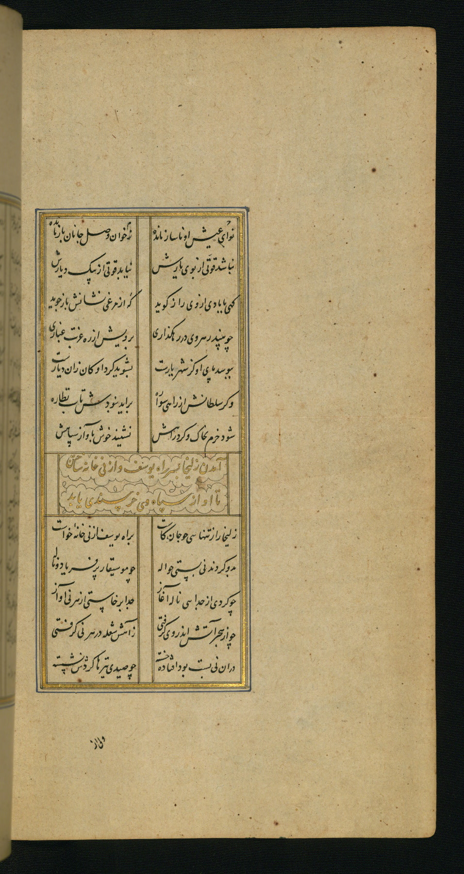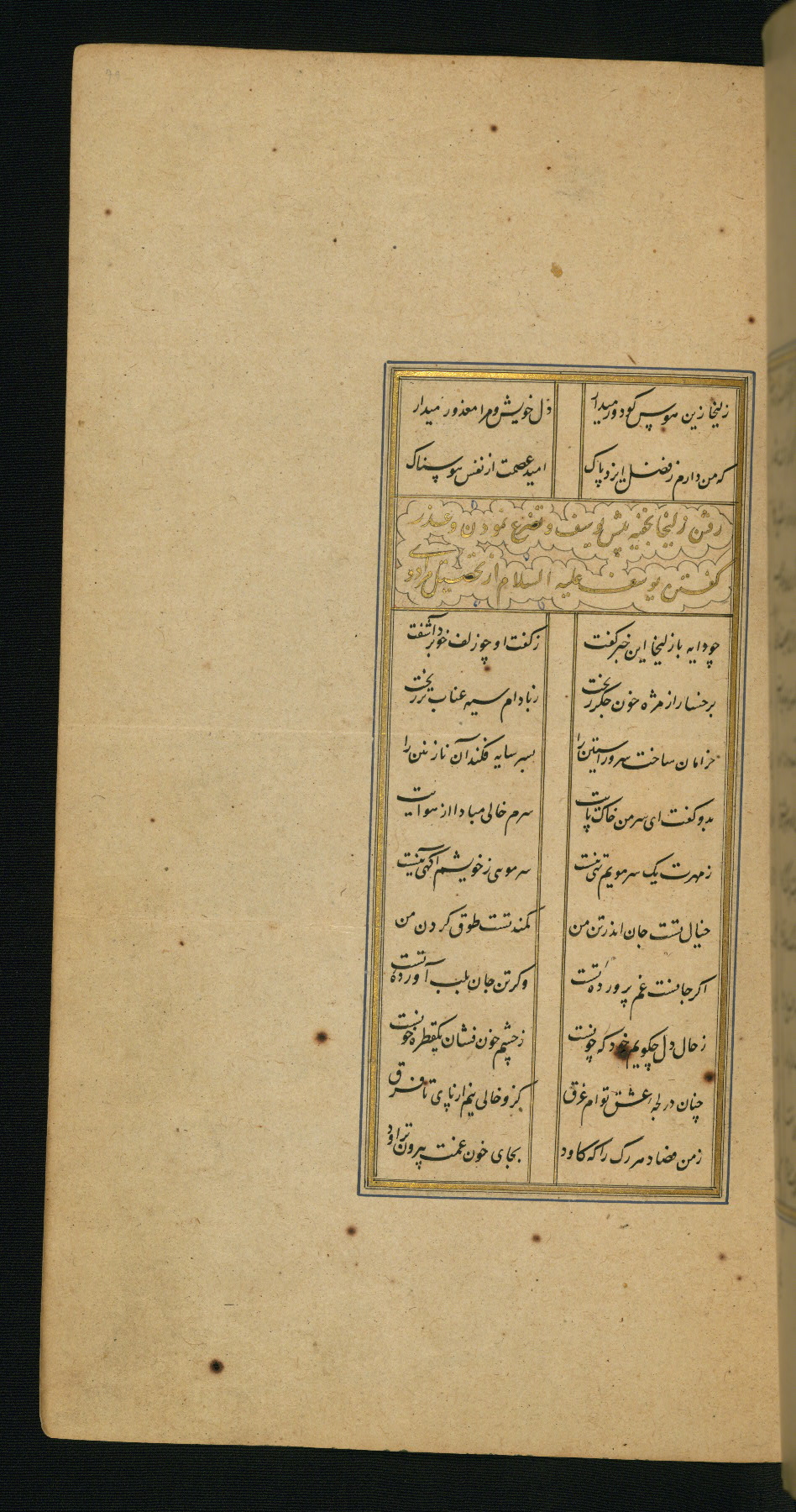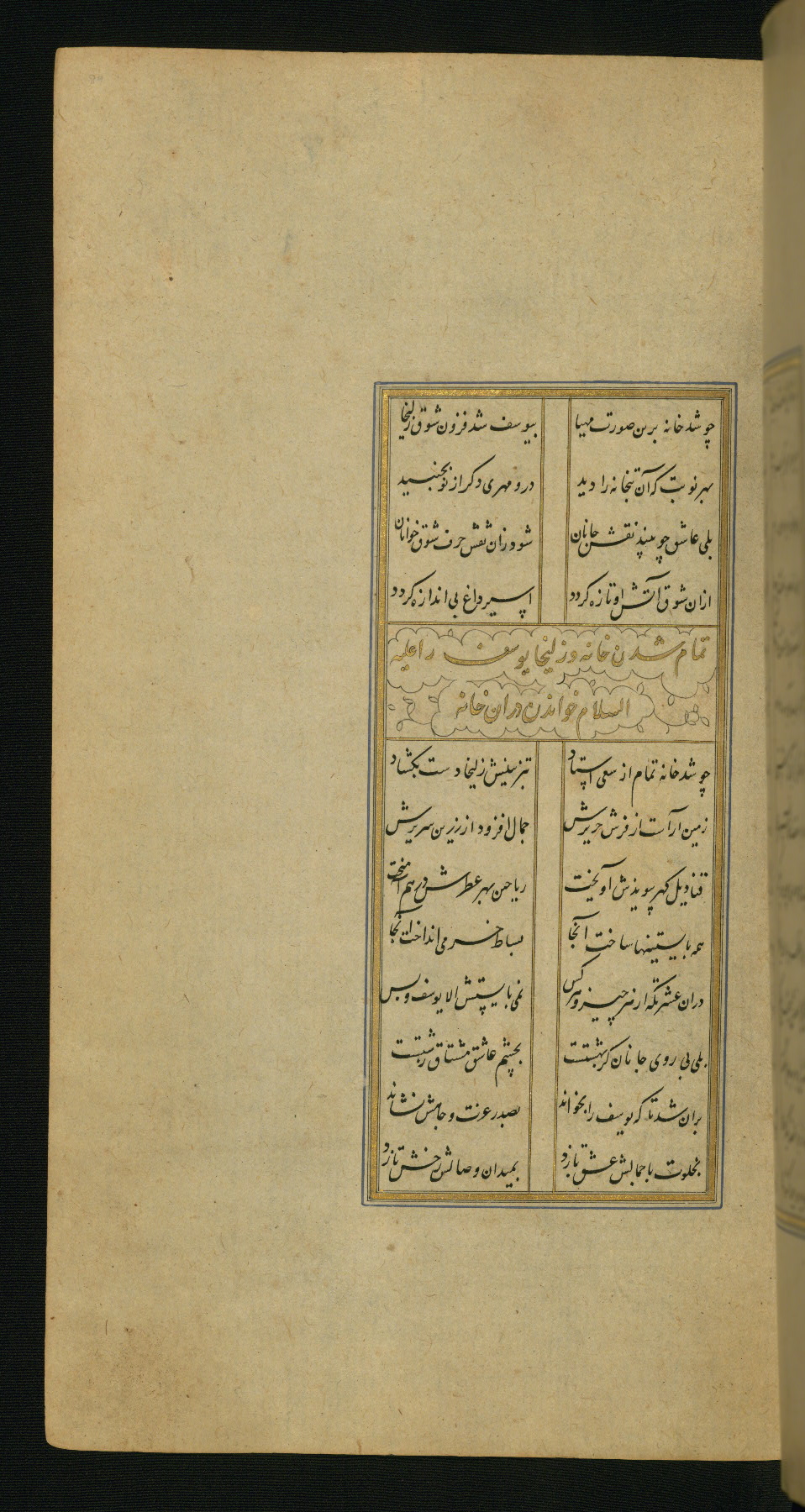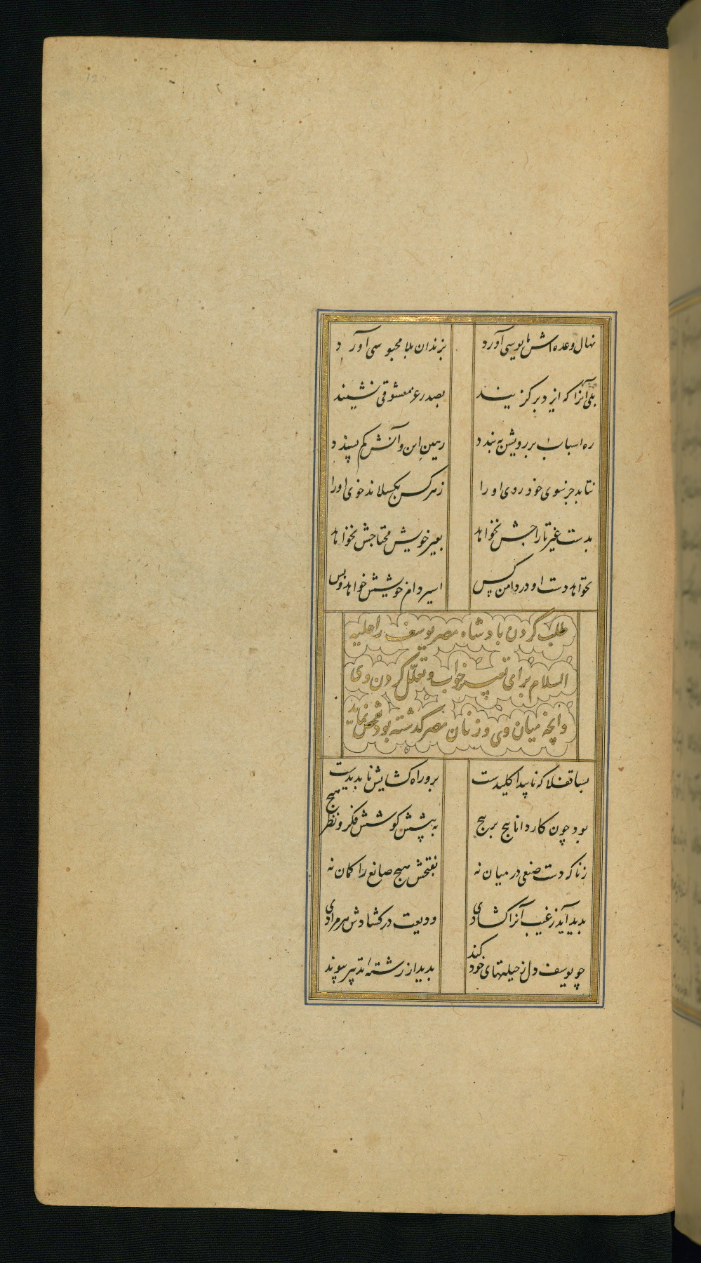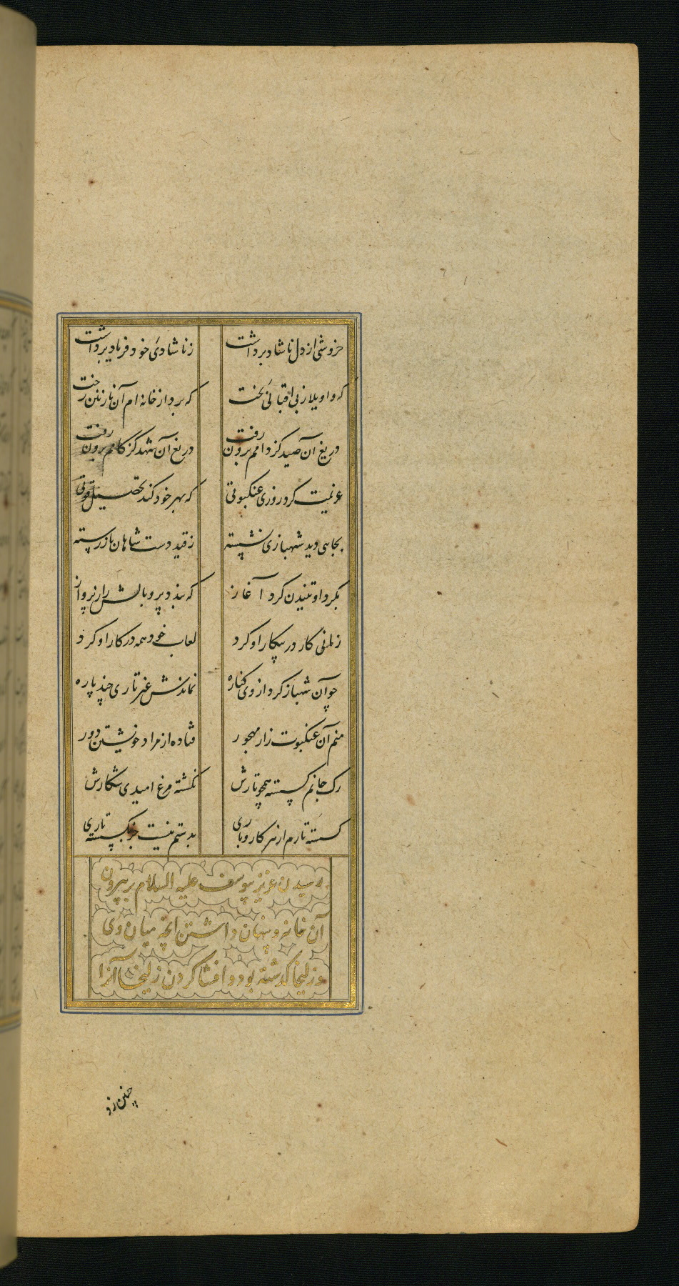 This is an illustrated and illuminated Safavid copy of Joseph (Yūsuf) and Zulaykhā by Nūr al-Dīn Jāmī (d. 898 AH / 1492 CE), executed in Iran in the early tenth century AH / sixteenth CE. The codex opens with a double-page illuminated incipit (fols. 1b-2a) containing the first verses of the work, the title, and the author's name. There are eight paintings illustrating the text. The binding is slightly later than the manuscript.
