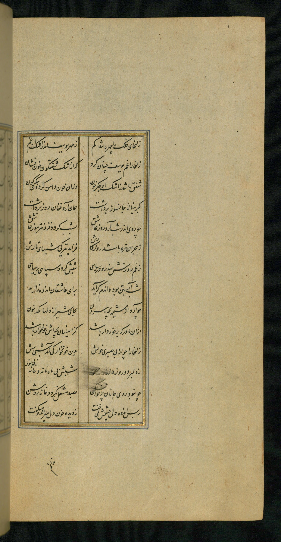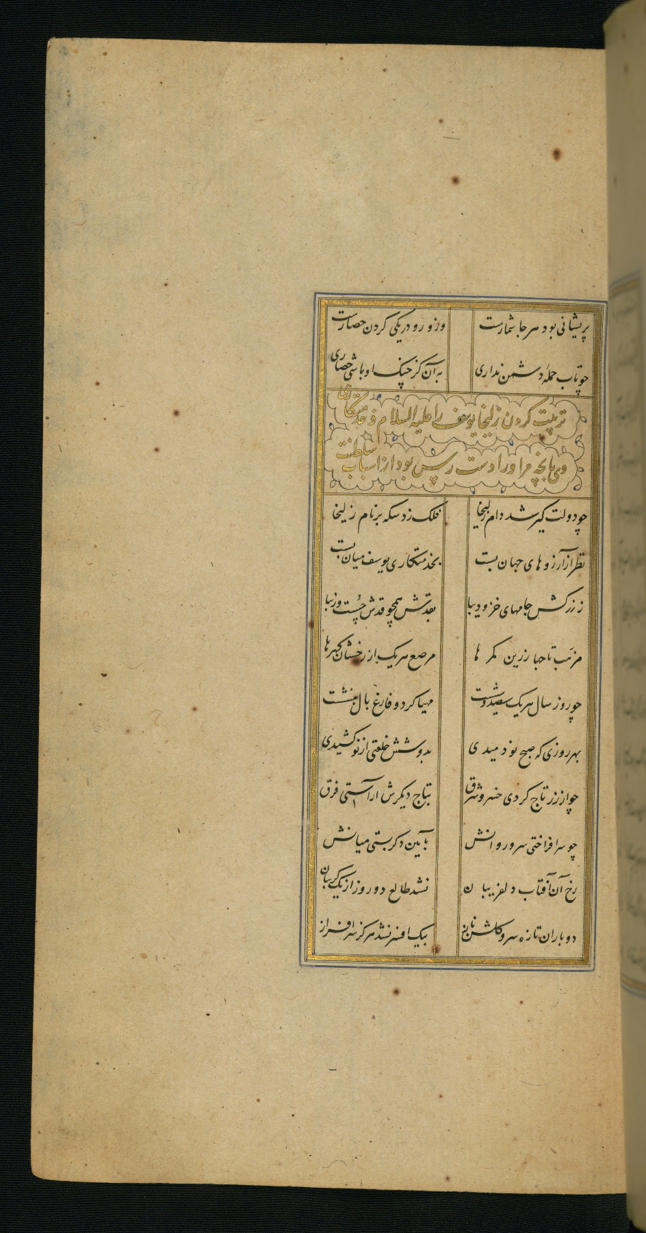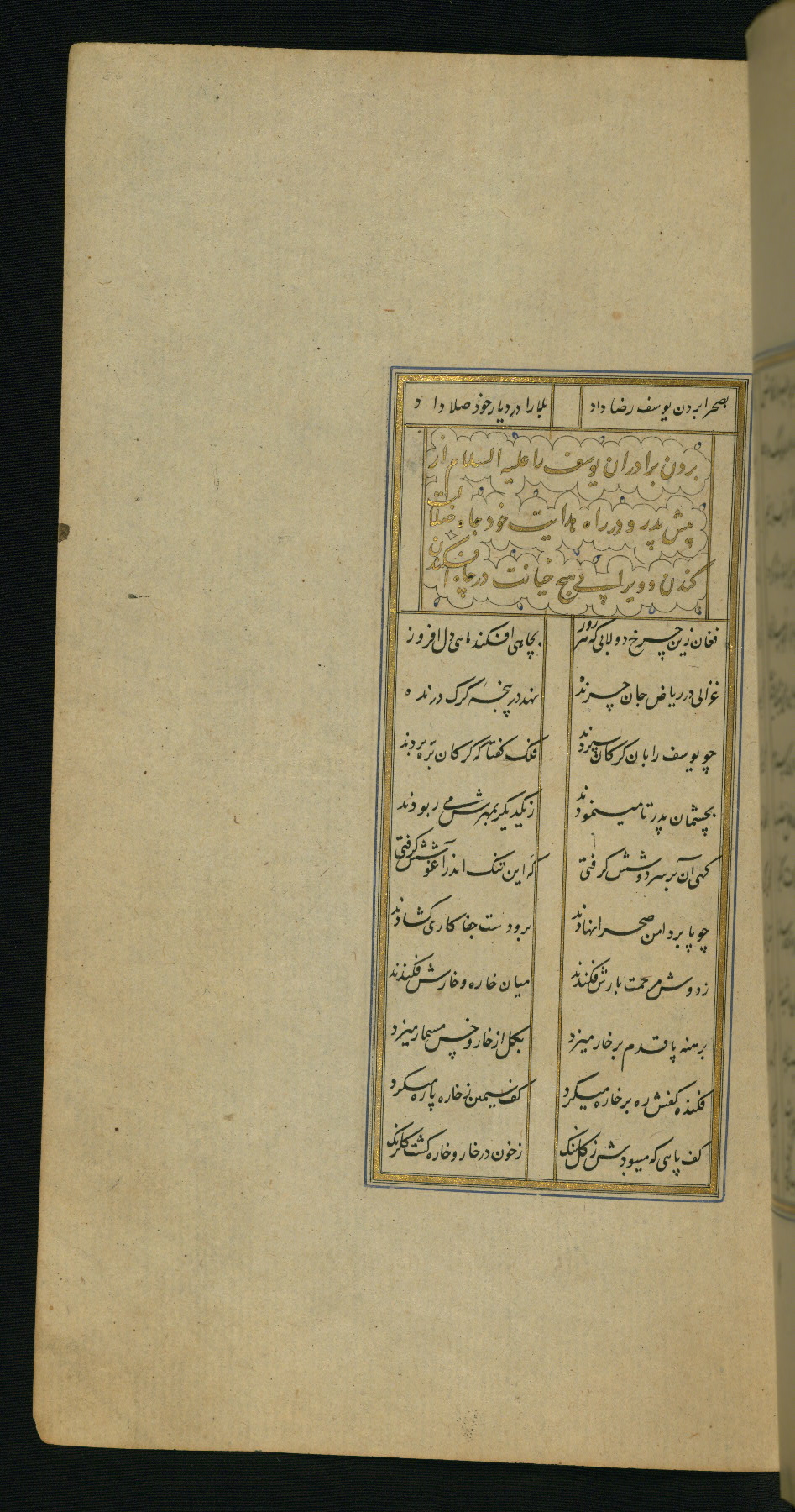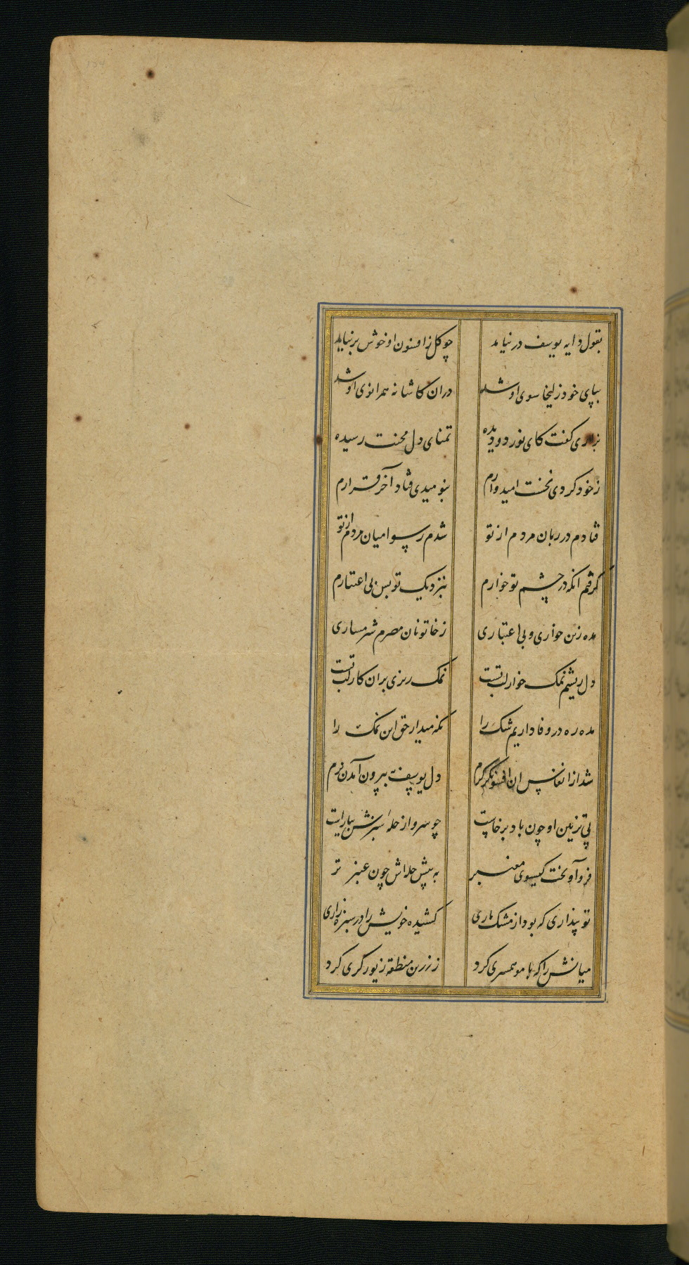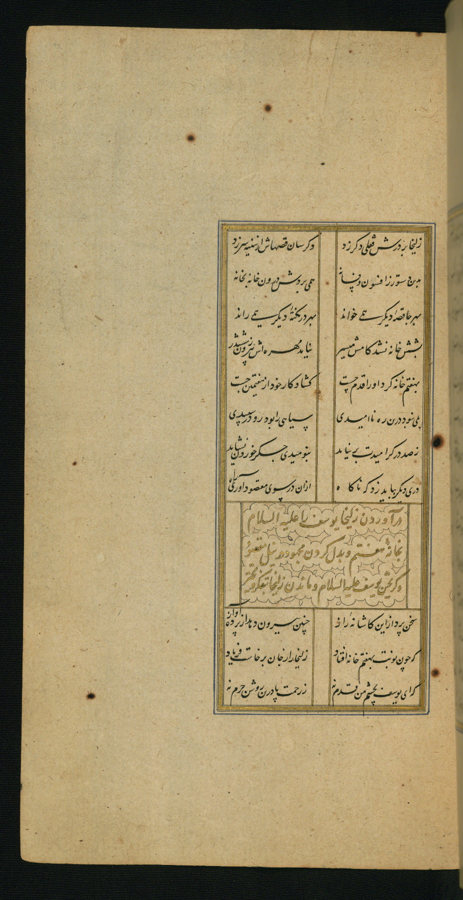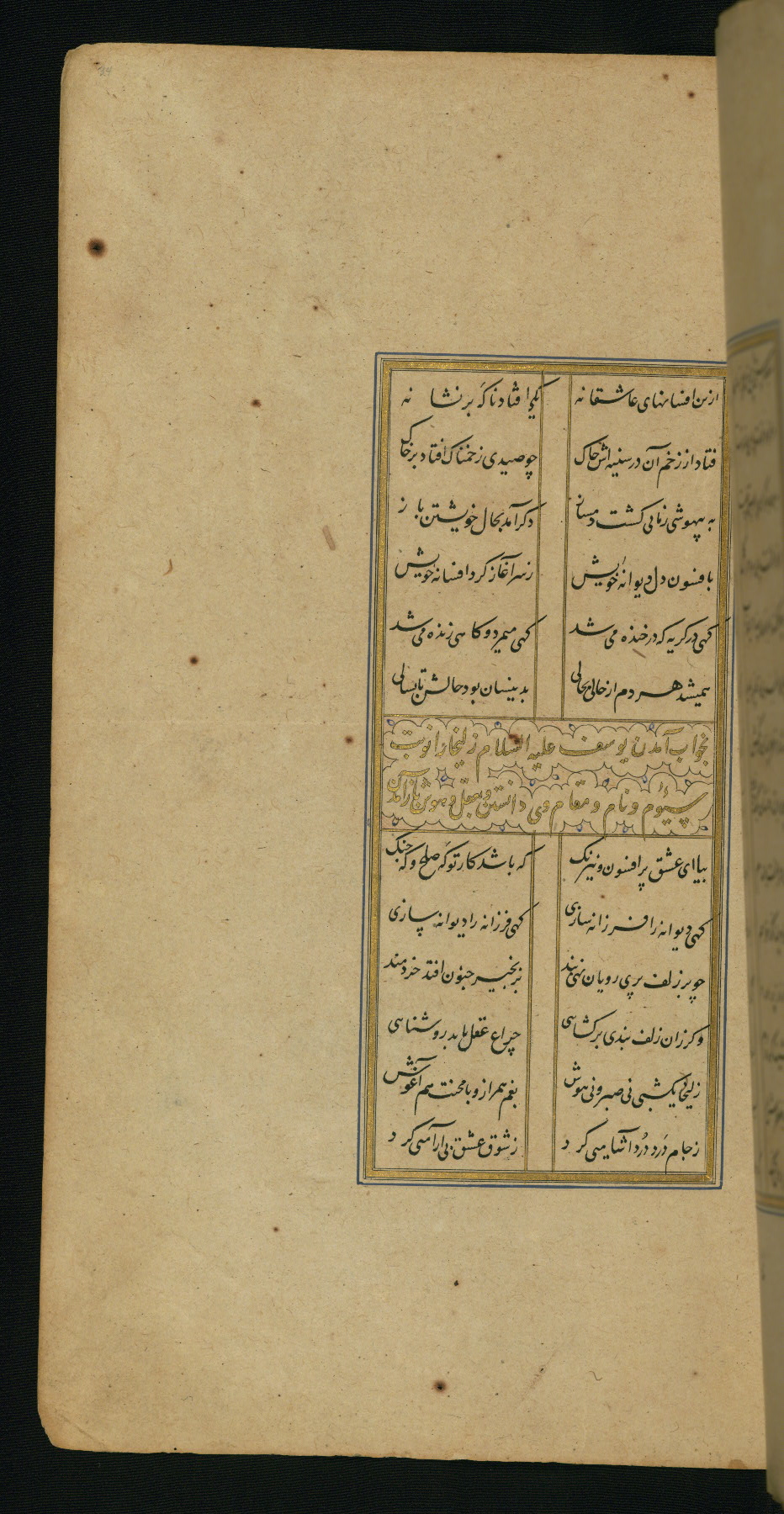 This is an illustrated and illuminated Safavid copy of Joseph (Yūsuf) and Zulaykhā by Nūr al-Dīn Jāmī (d. 898 AH / 1492 CE), executed in Iran in the early tenth century AH / sixteenth CE. The codex opens with a double-page illuminated incipit (fols. 1b-2a) containing the first verses of the work, the title, and the author's name. There are eight paintings illustrating the text. The binding is slightly later than the manuscript.