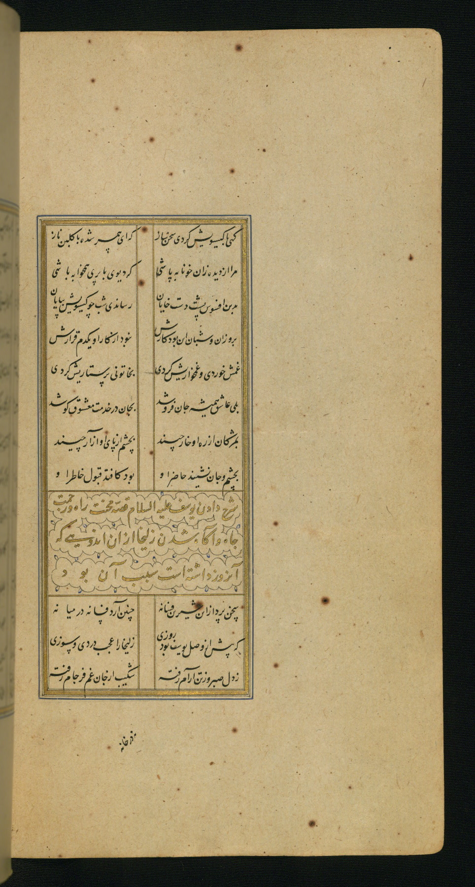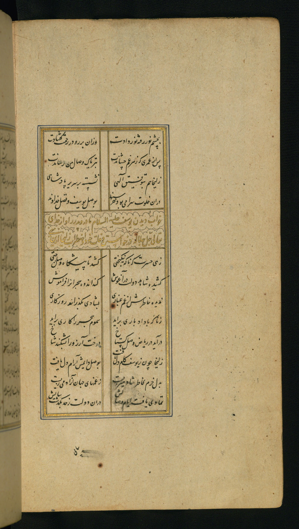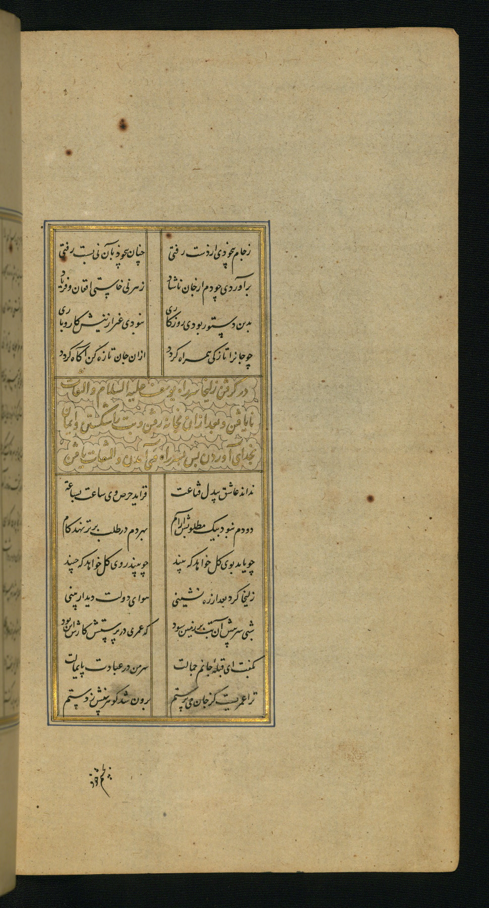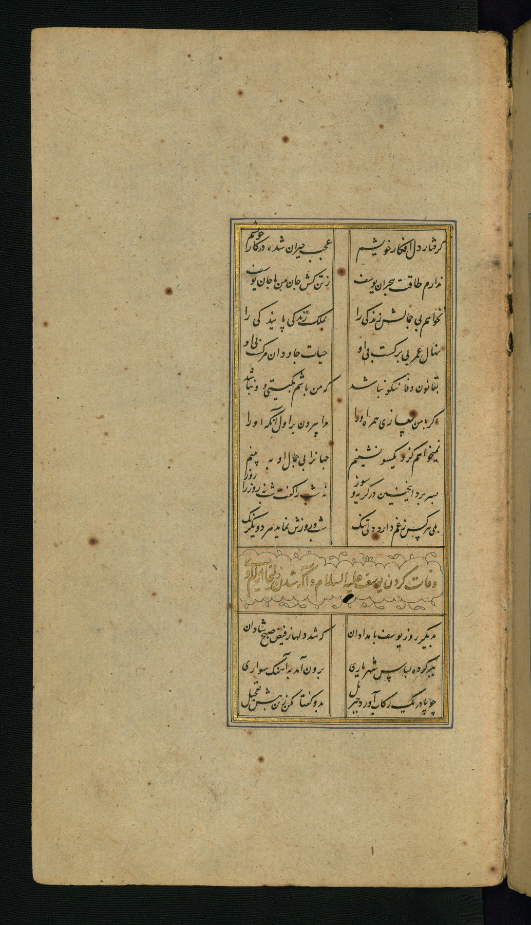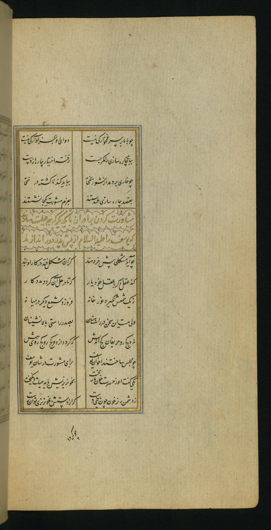 This is an illustrated and illuminated Safavid copy of Joseph (Yūsuf) and Zulaykhā by Nūr al-Dīn Jāmī (d. 898 AH / 1492 CE), executed in Iran in the early tenth century AH / sixteenth CE. The codex opens with a double-page illuminated incipit (fols. 1b-2a) containing the first verses of the work, the title, and the author's name. There are eight paintings illustrating the text. The binding is slightly later than the manuscript.