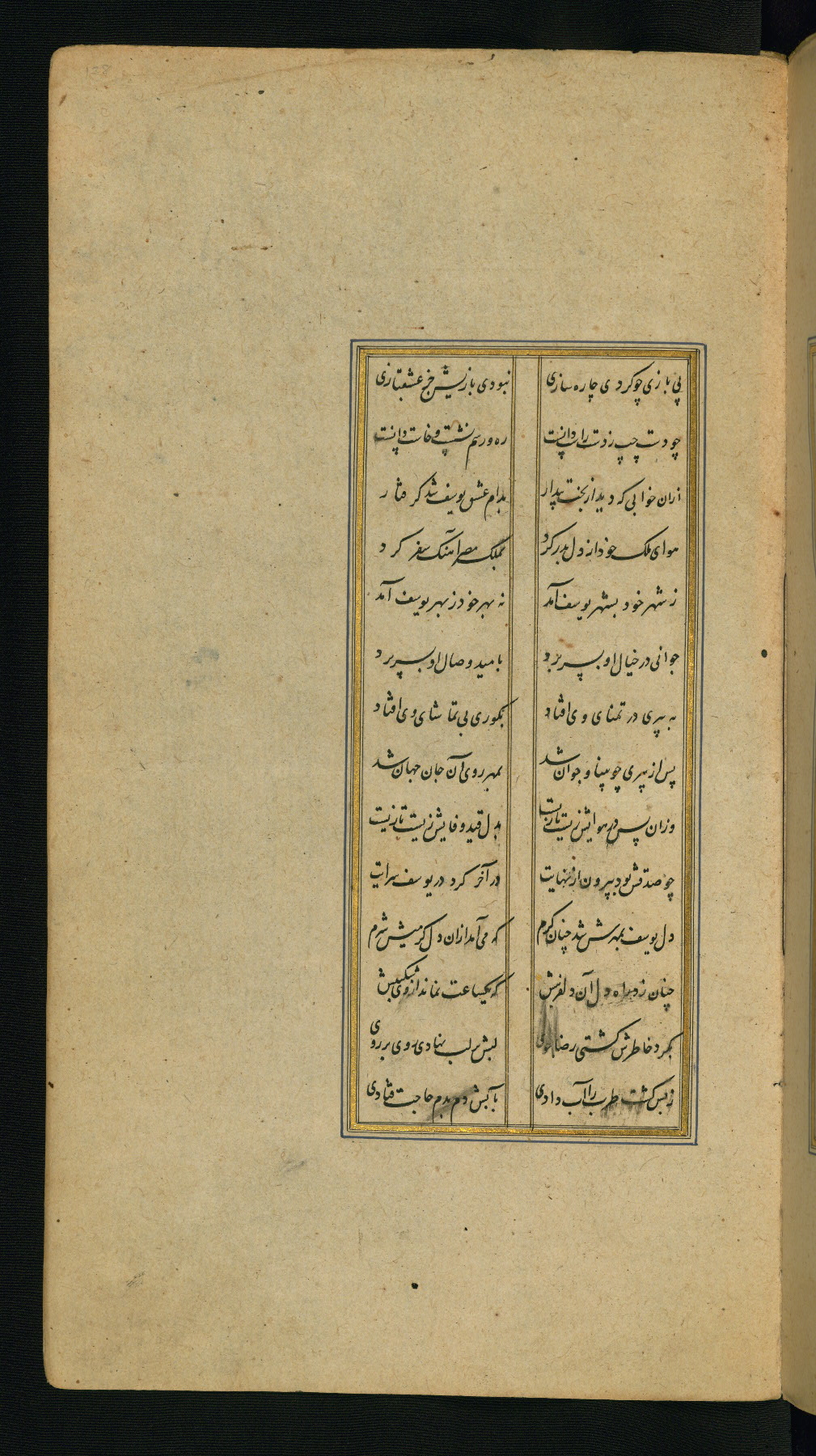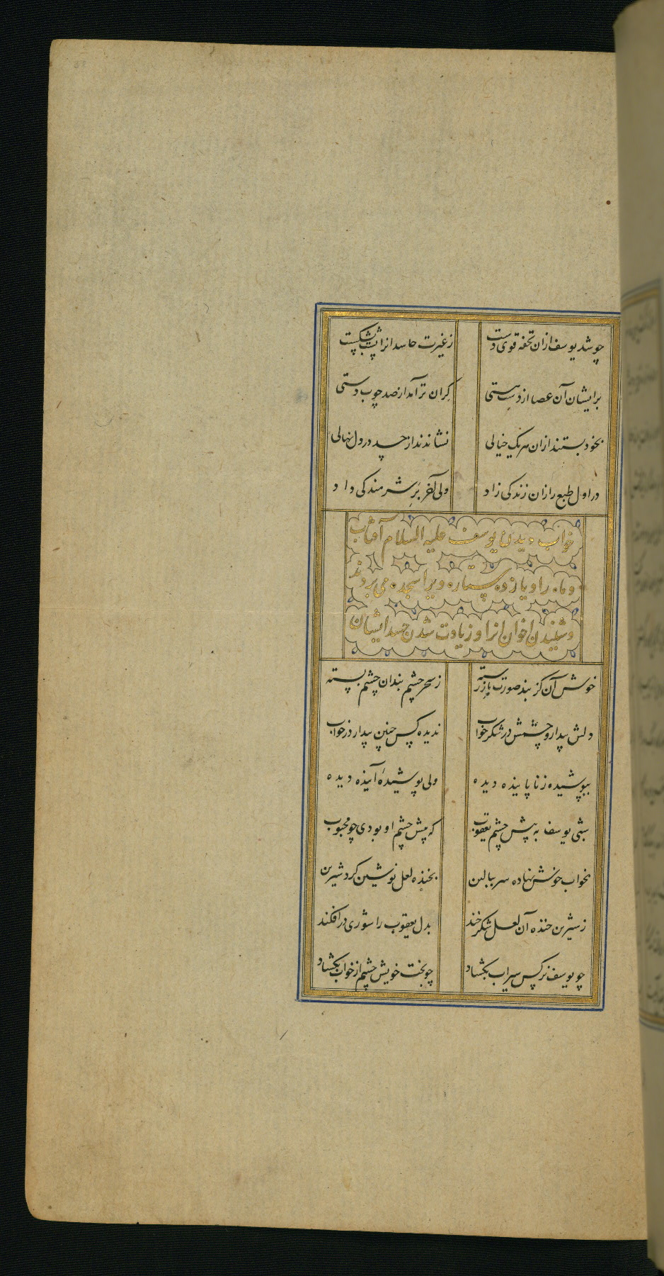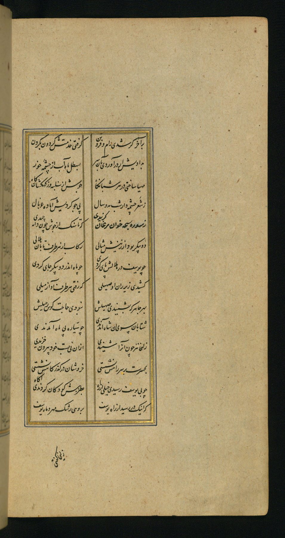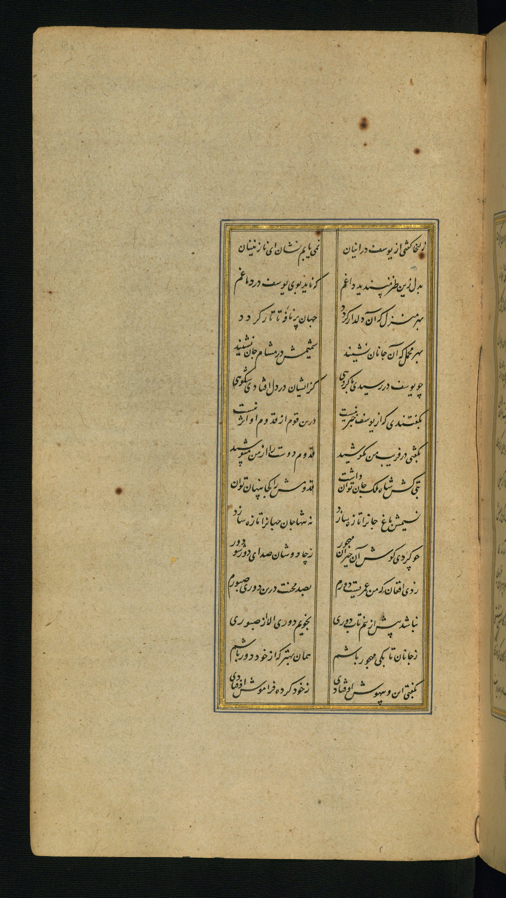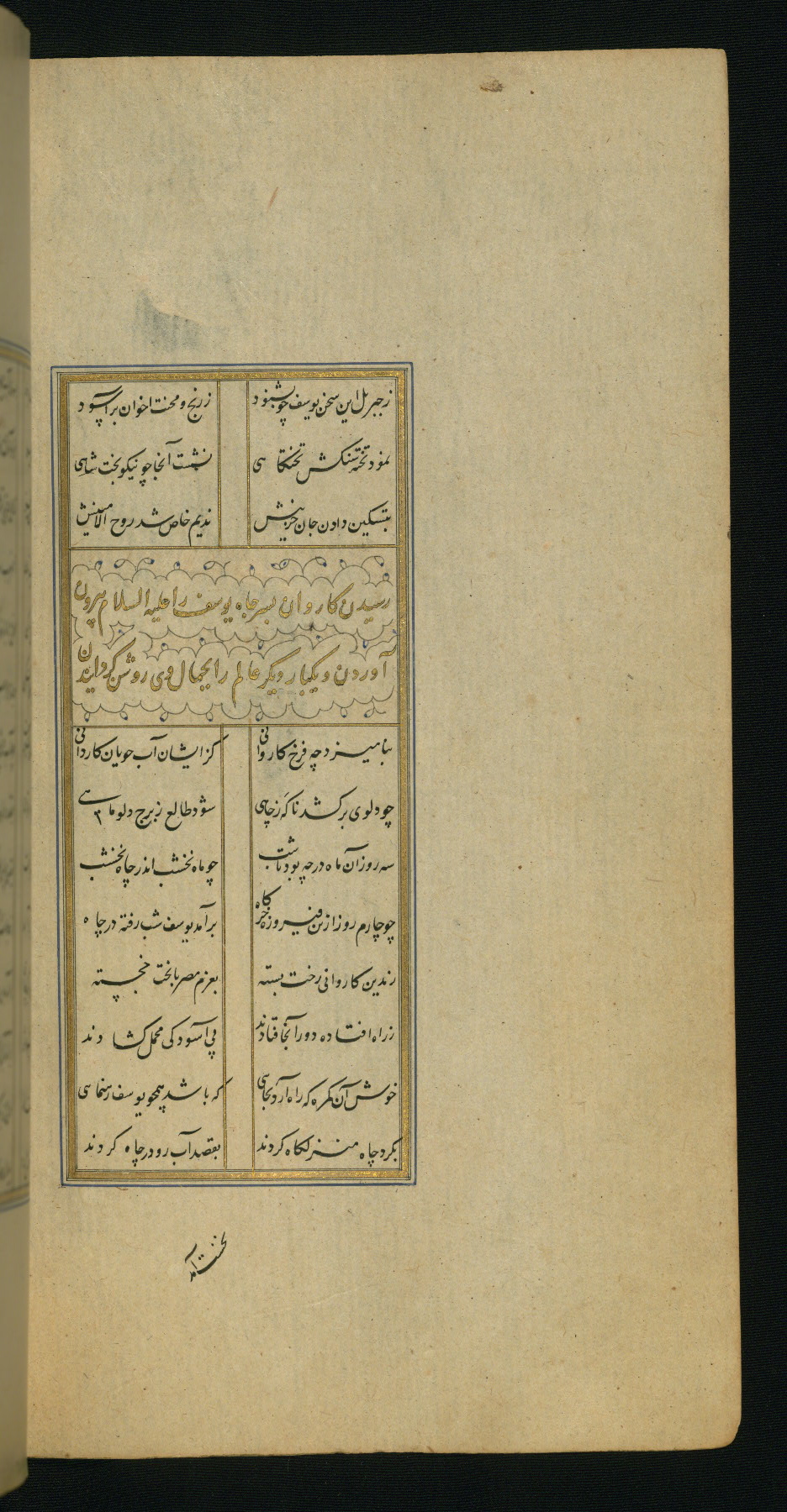 This is an illustrated and illuminated Safavid copy of Joseph (Yūsuf) and Zulaykhā by Nūr al-Dīn Jāmī (d. 898 AH / 1492 CE), executed in Iran in the early tenth century AH / sixteenth CE. The codex opens with a double-page illuminated incipit (fols. 1b-2a) containing the first verses of the work, the title, and the author's name. There are eight paintings illustrating the text. The binding is slightly later than the manuscript.