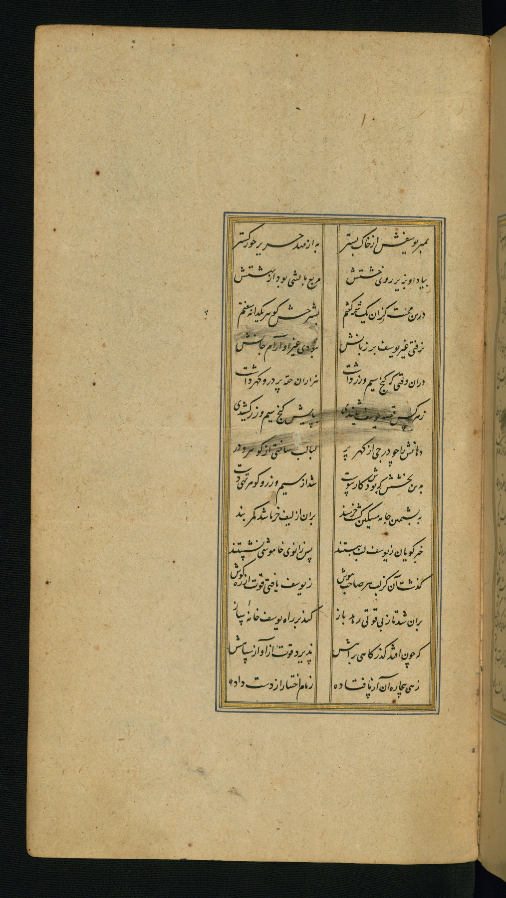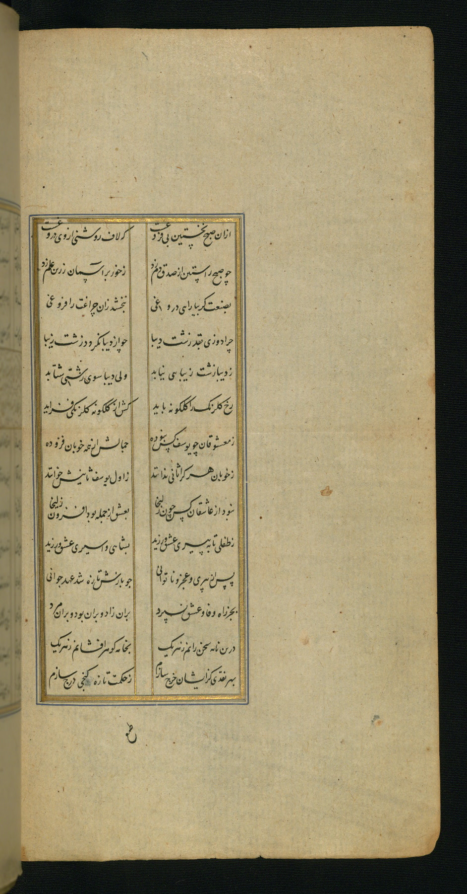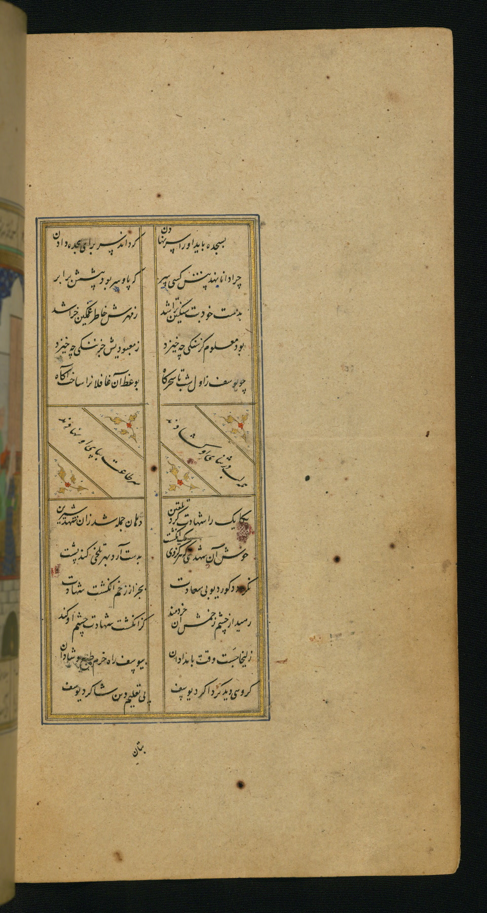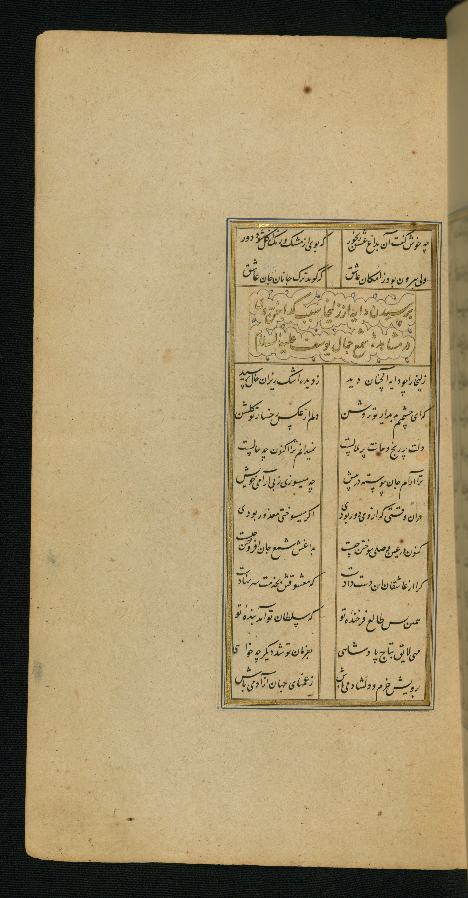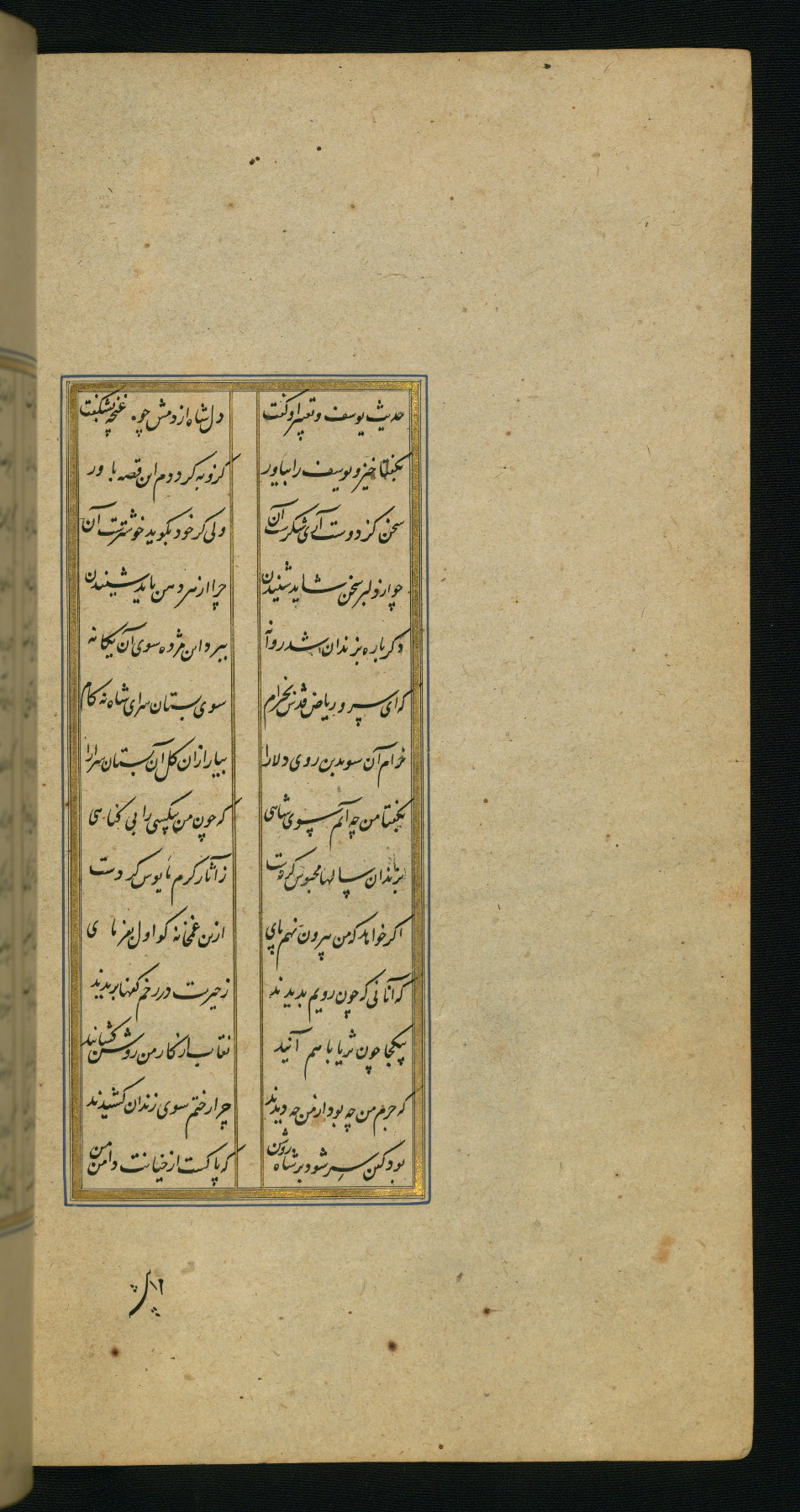 This is an illustrated and illuminated Safavid copy of Joseph (Yūsuf) and Zulaykhā by Nūr al-Dīn Jāmī (d. 898 AH / 1492 CE), executed in Iran in the early tenth century AH / sixteenth CE. The codex opens with a double-page illuminated incipit (fols. 1b-2a) containing the first verses of the work, the title, and the author's name. There are eight paintings illustrating the text. The binding is slightly later than the manuscript.