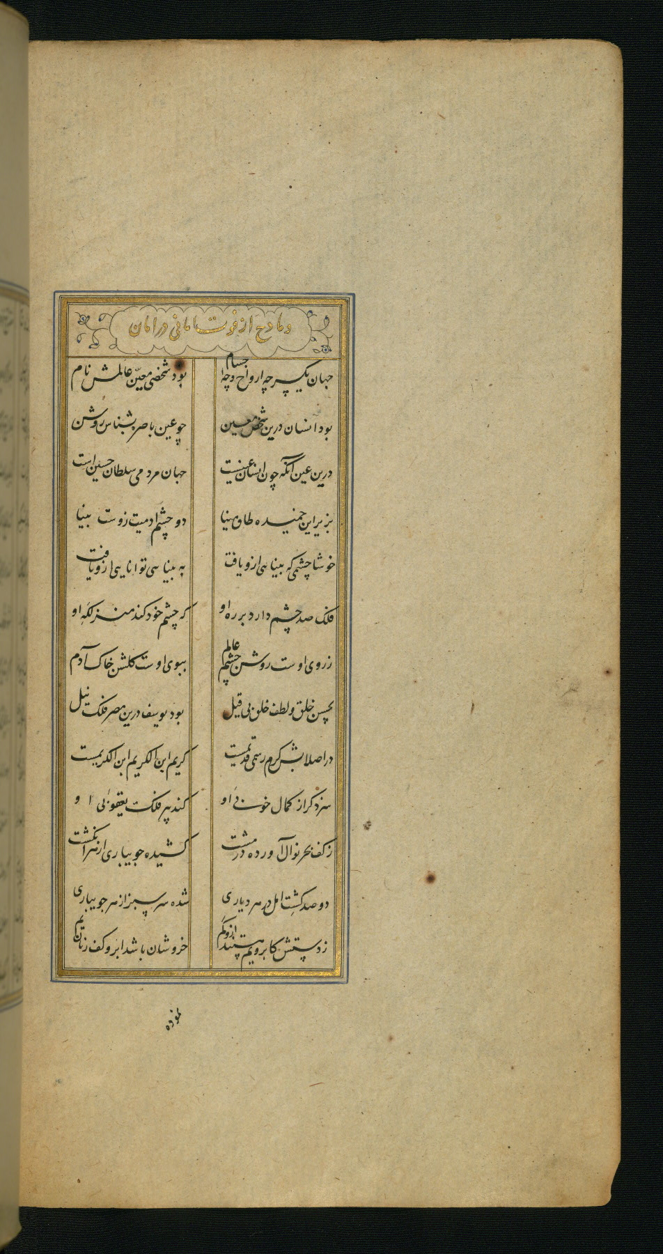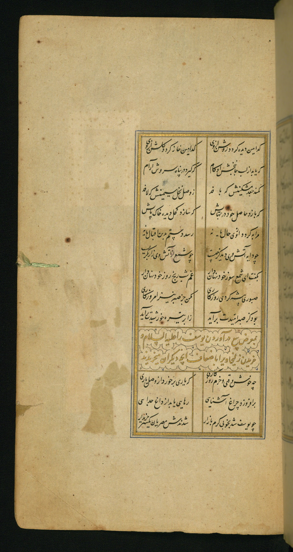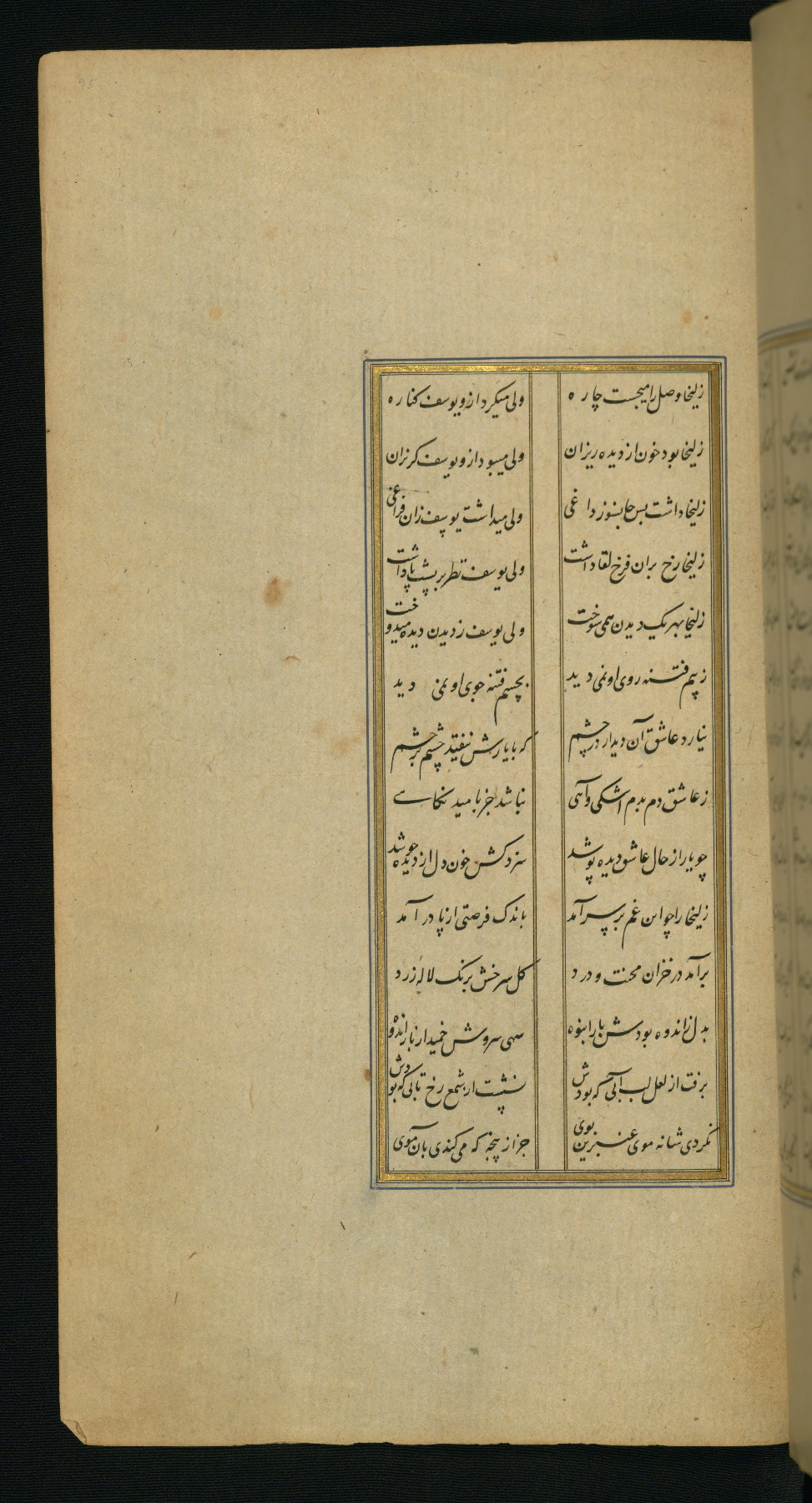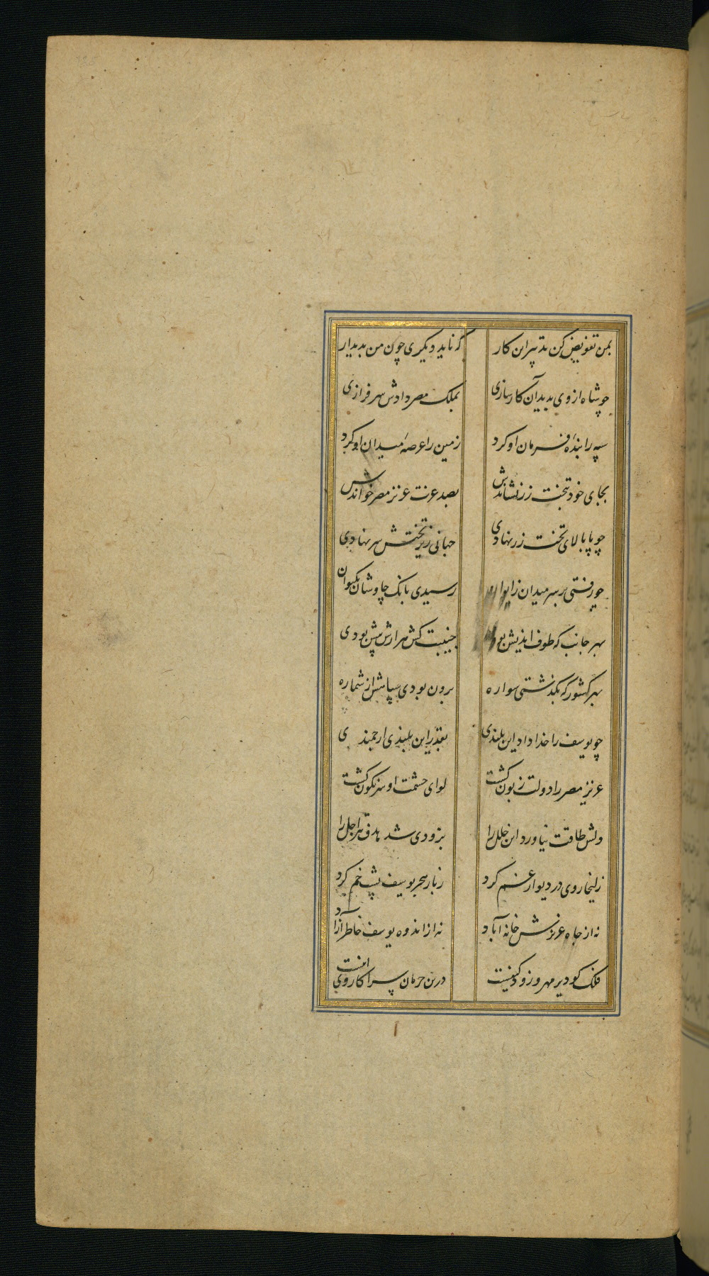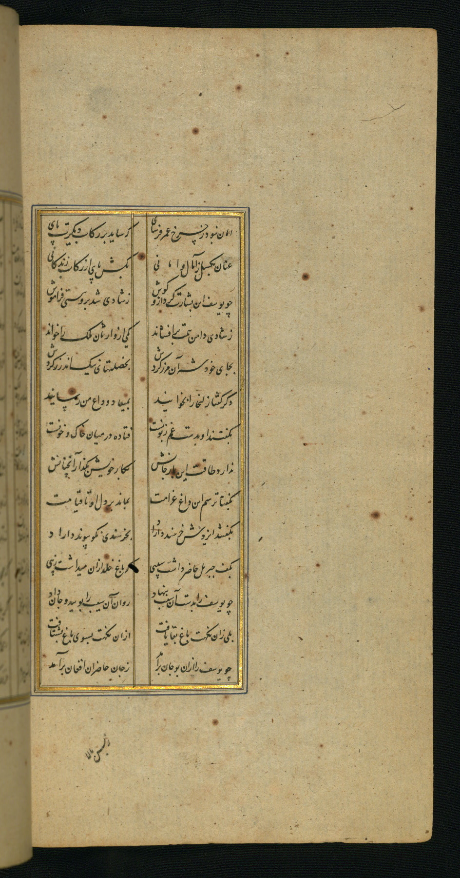 This is an illustrated and illuminated Safavid copy of Joseph (Yūsuf) and Zulaykhā by Nūr al-Dīn Jāmī (d. 898 AH / 1492 CE), executed in Iran in the early tenth century AH / sixteenth CE. The codex opens with a double-page illuminated incipit (fols. 1b-2a) containing the first verses of the work, the title, and the author's name. There are eight paintings illustrating the text. The binding is slightly later than the manuscript.