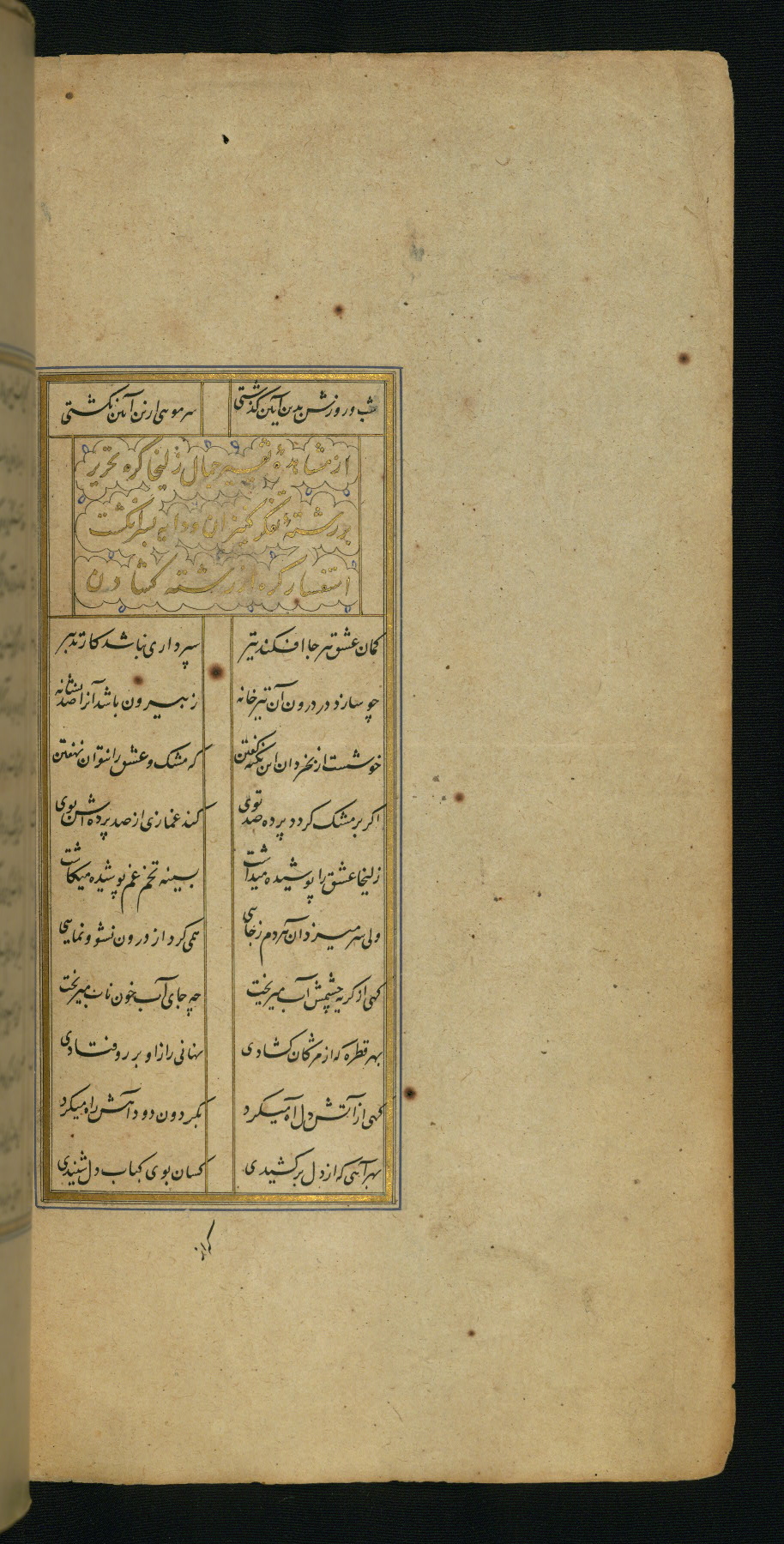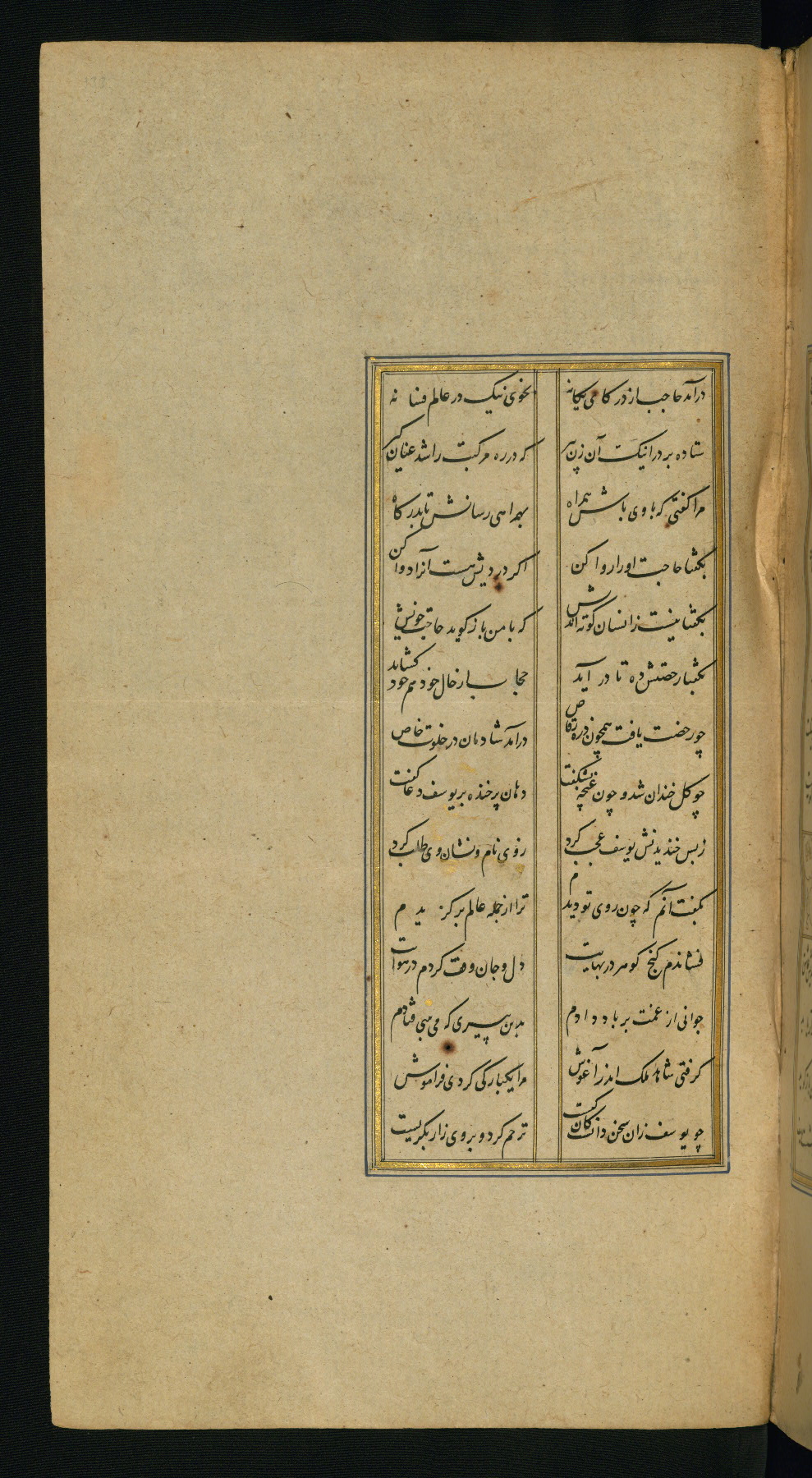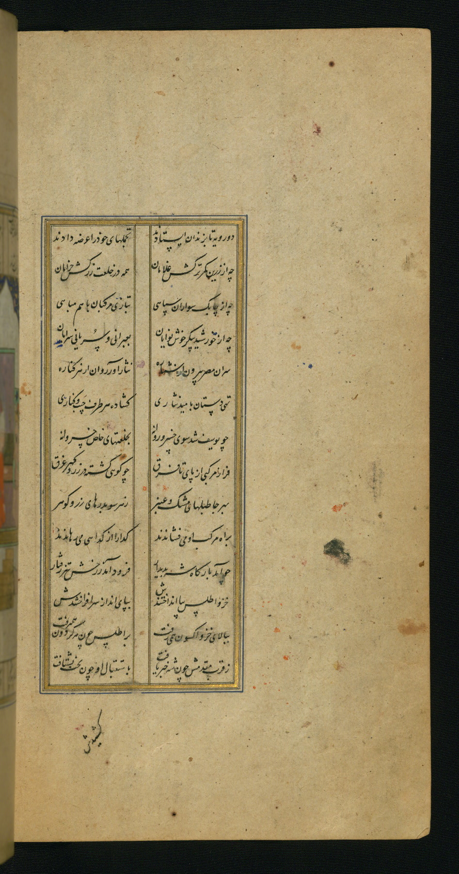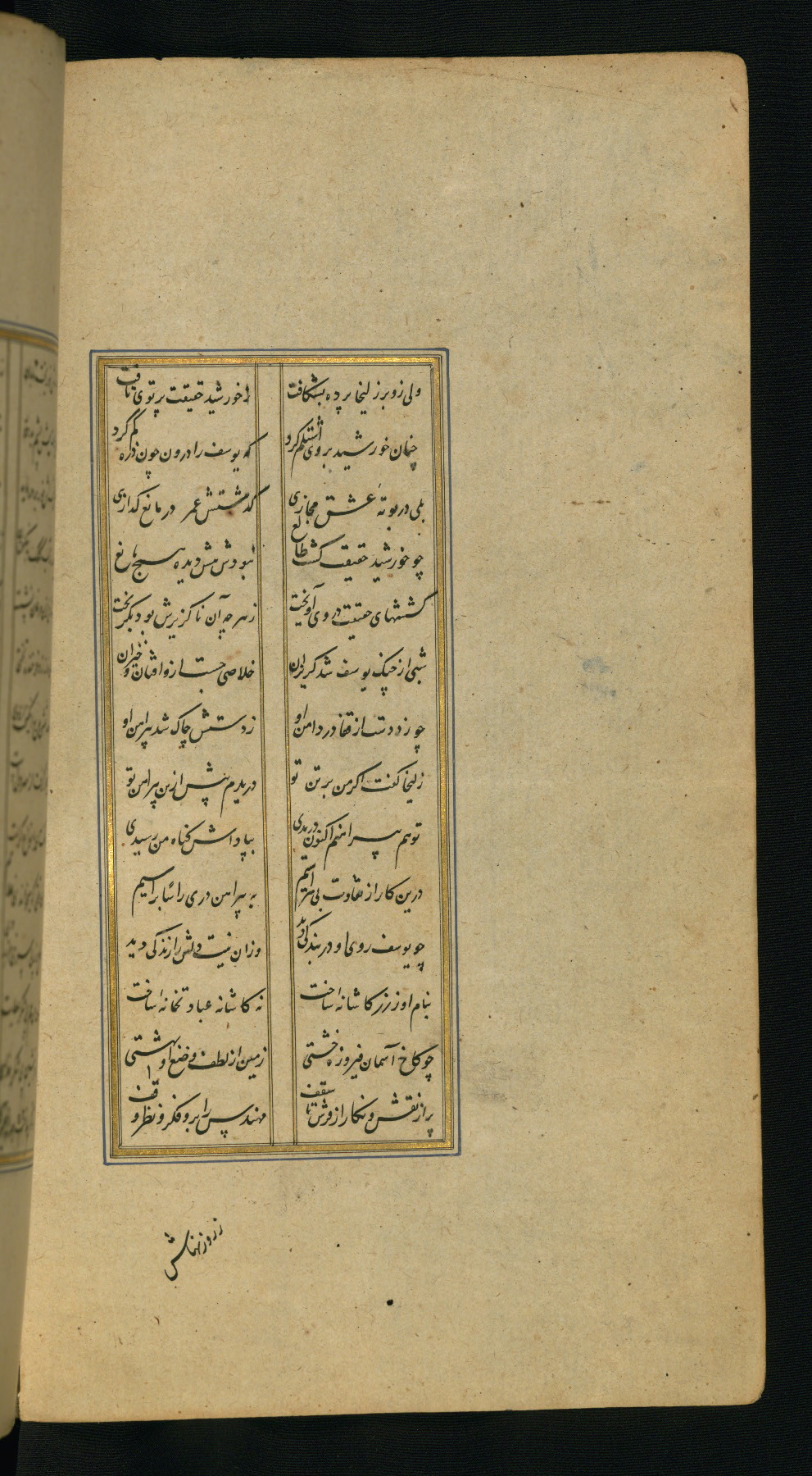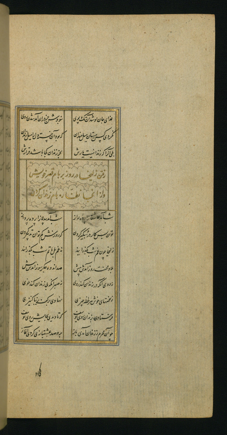 This is an illustrated and illuminated Safavid copy of Joseph (Yūsuf) and Zulaykhā by Nūr al-Dīn Jāmī (d. 898 AH / 1492 CE), executed in Iran in the early tenth century AH / sixteenth CE. The codex opens with a double-page illuminated incipit (fols. 1b-2a) containing the first verses of the work, the title, and the author's name. There are eight paintings illustrating the text. The binding is slightly later than the manuscript.