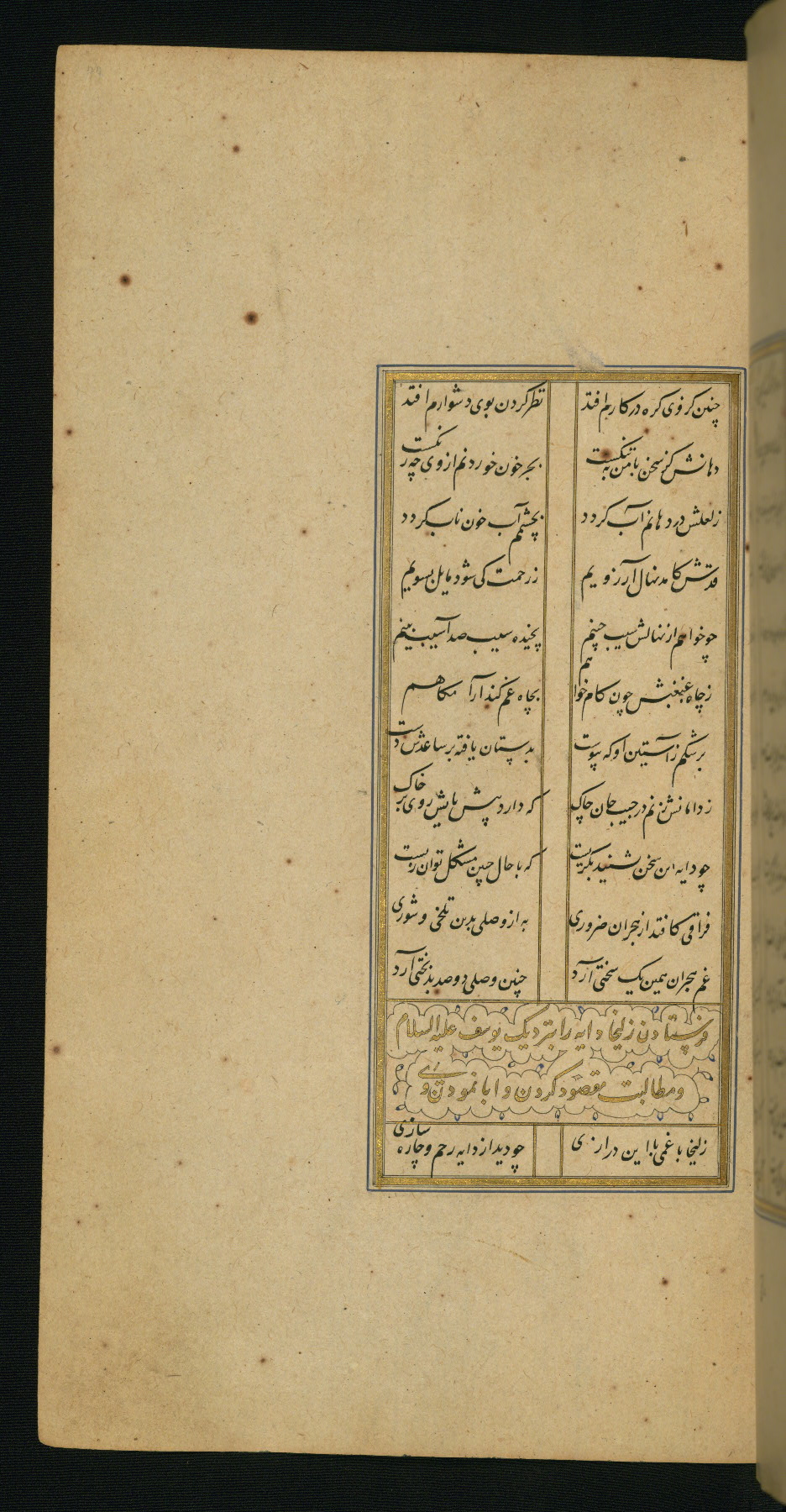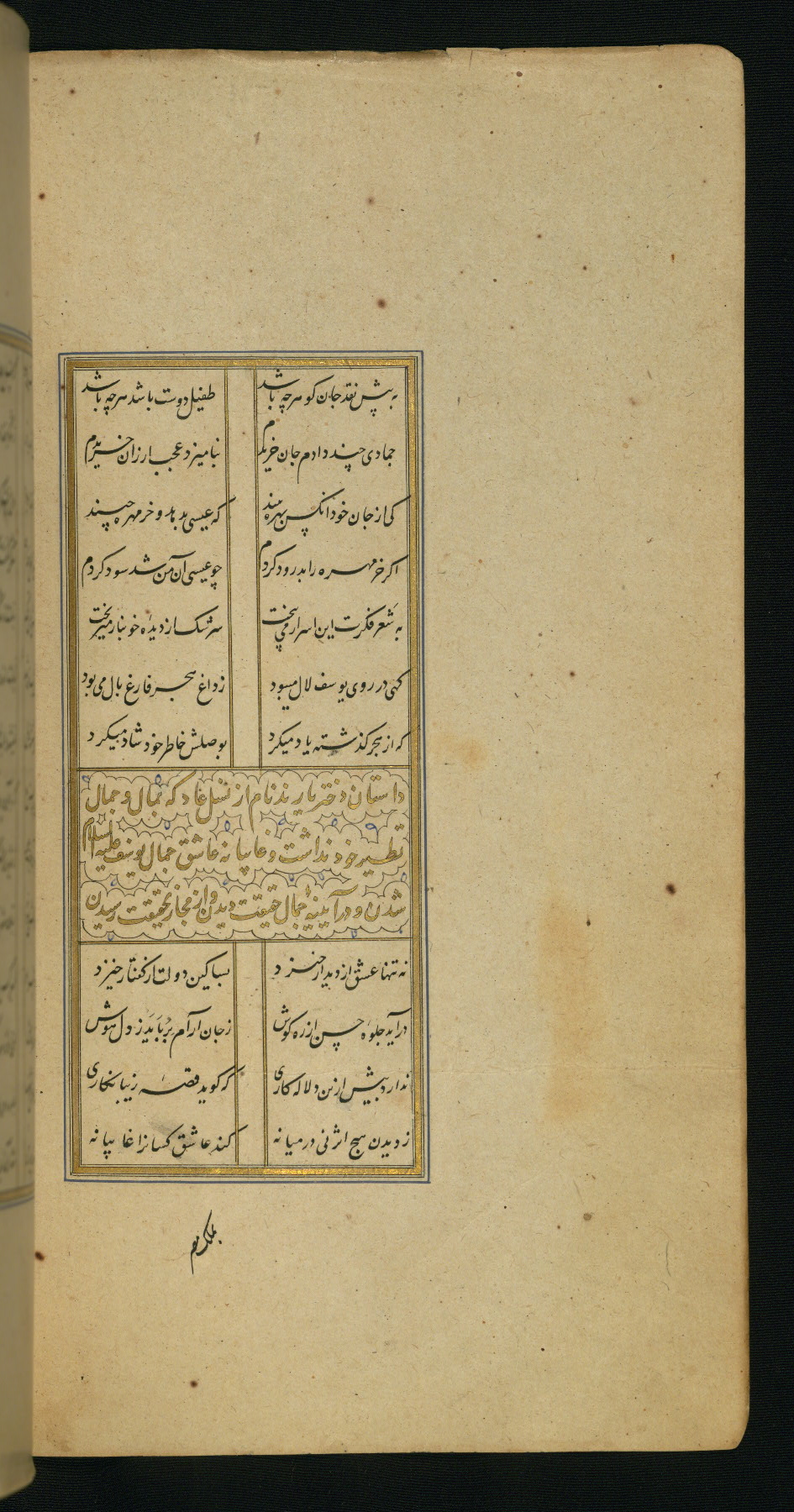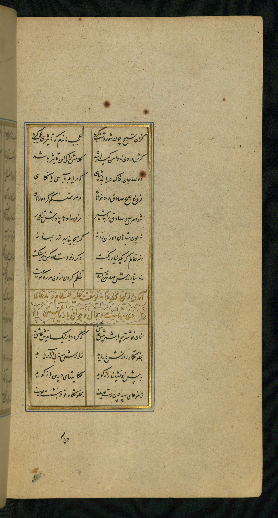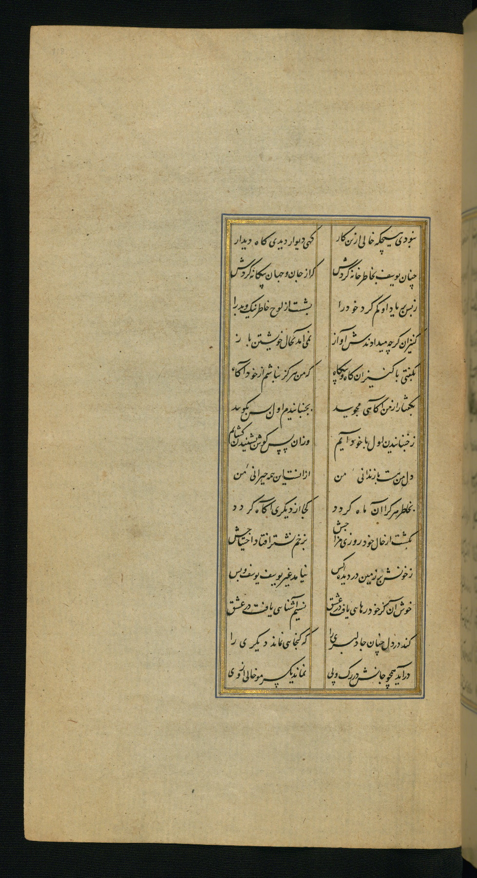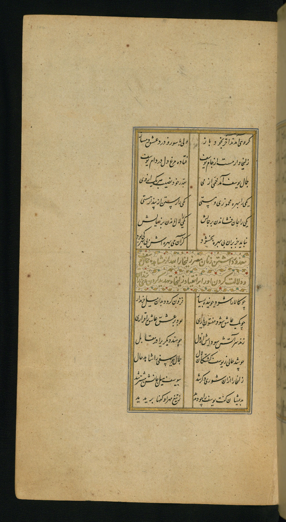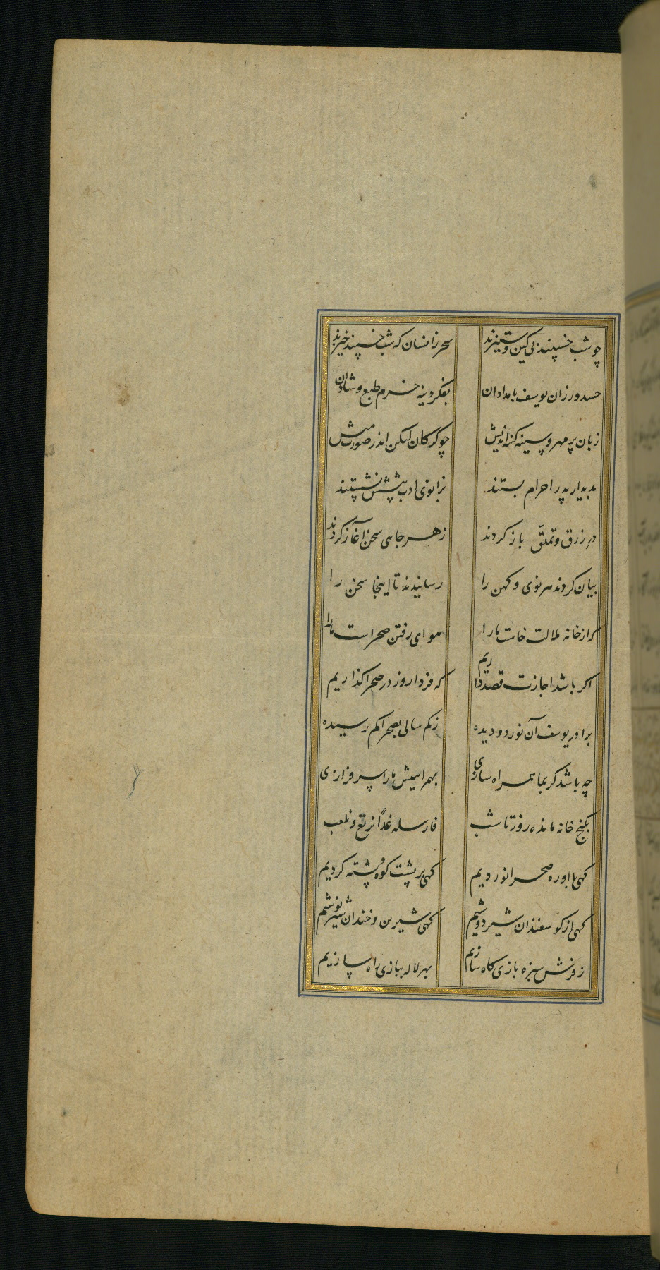 This is an illustrated and illuminated Safavid copy of Joseph (Yūsuf) and Zulaykhā by Nūr al-Dīn Jāmī (d. 898 AH / 1492 CE), executed in Iran in the early tenth century AH / sixteenth CE. The codex opens with a double-page illuminated incipit (fols. 1b-2a) containing the first verses of the work, the title, and the author's name. There are eight paintings illustrating the text. The binding is slightly later than the manuscript.