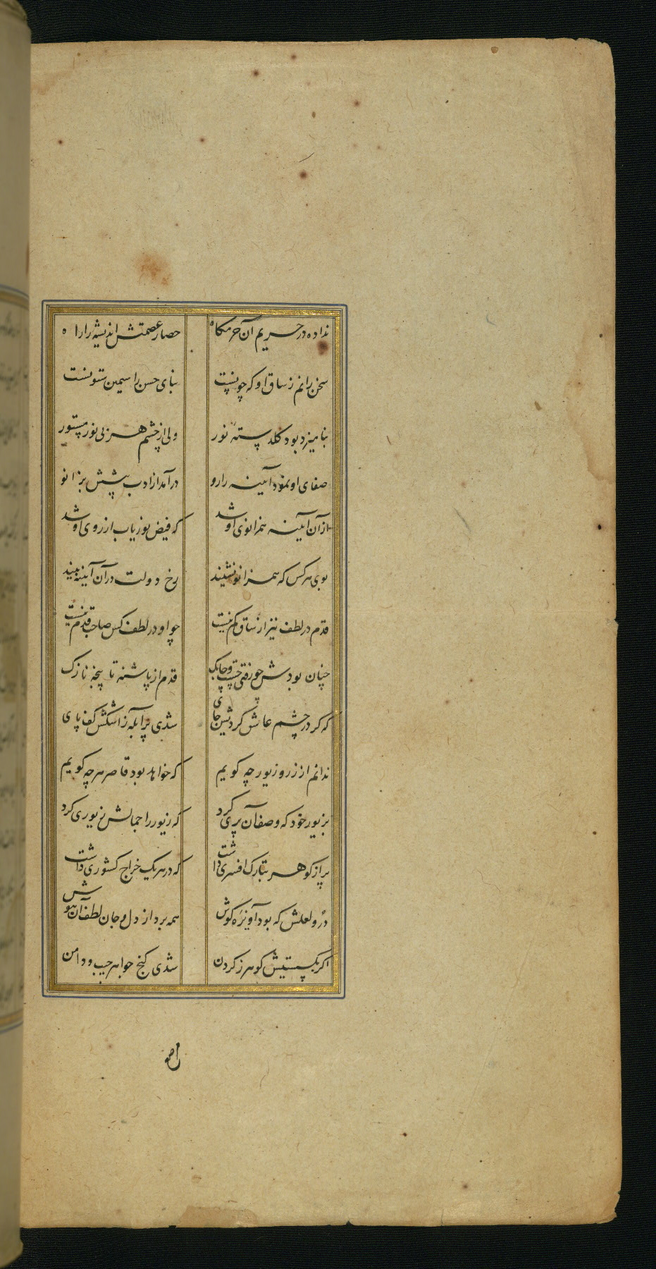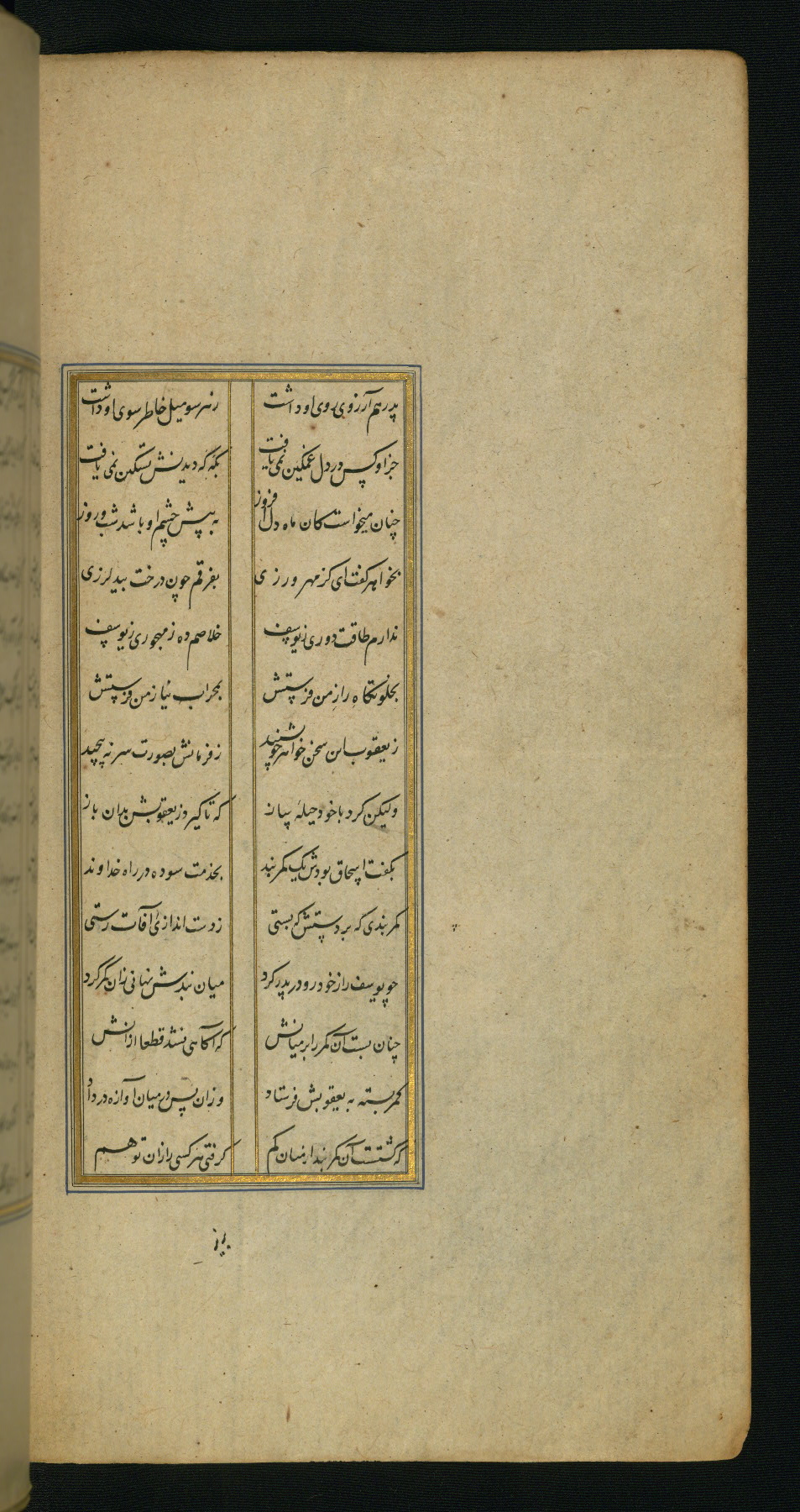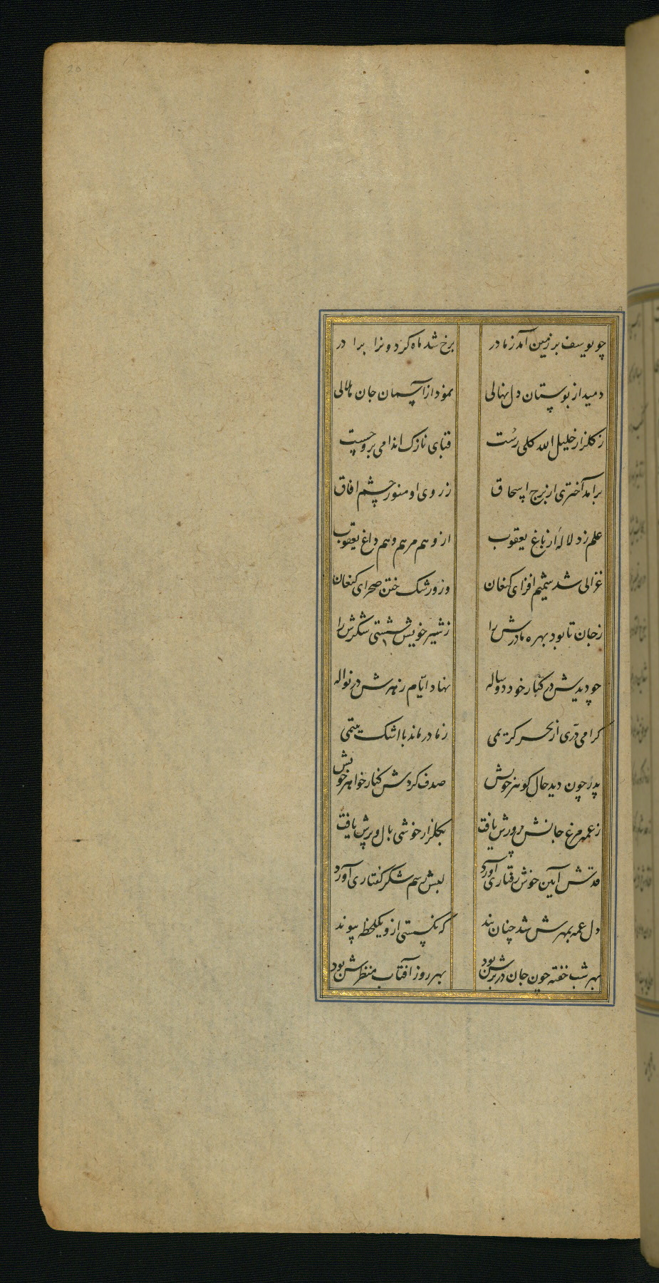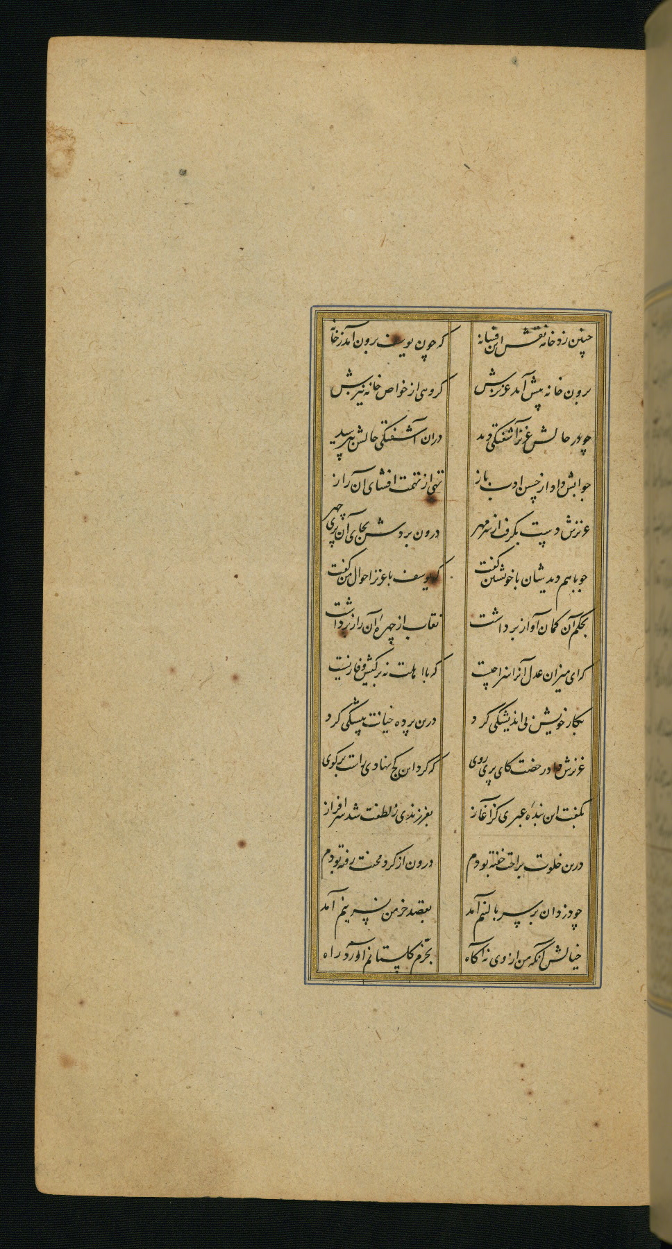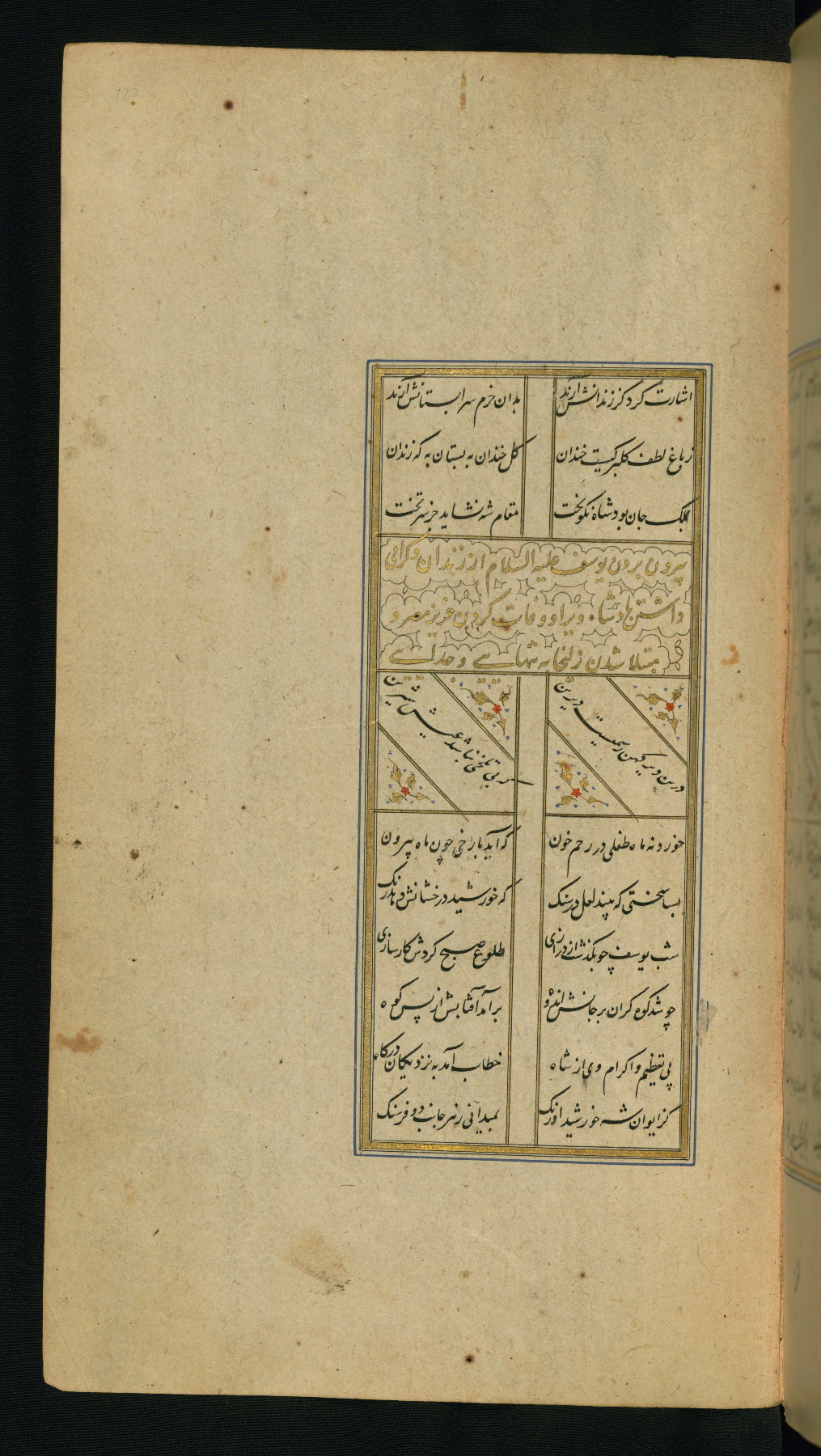 This is an illustrated and illuminated Safavid copy of Joseph (Yūsuf) and Zulaykhā by Nūr al-Dīn Jāmī (d. 898 AH / 1492 CE), executed in Iran in the early tenth century AH / sixteenth CE. The codex opens with a double-page illuminated incipit (fols. 1b-2a) containing the first verses of the work, the title, and the author's name. There are eight paintings illustrating the text. The binding is slightly later than the manuscript.