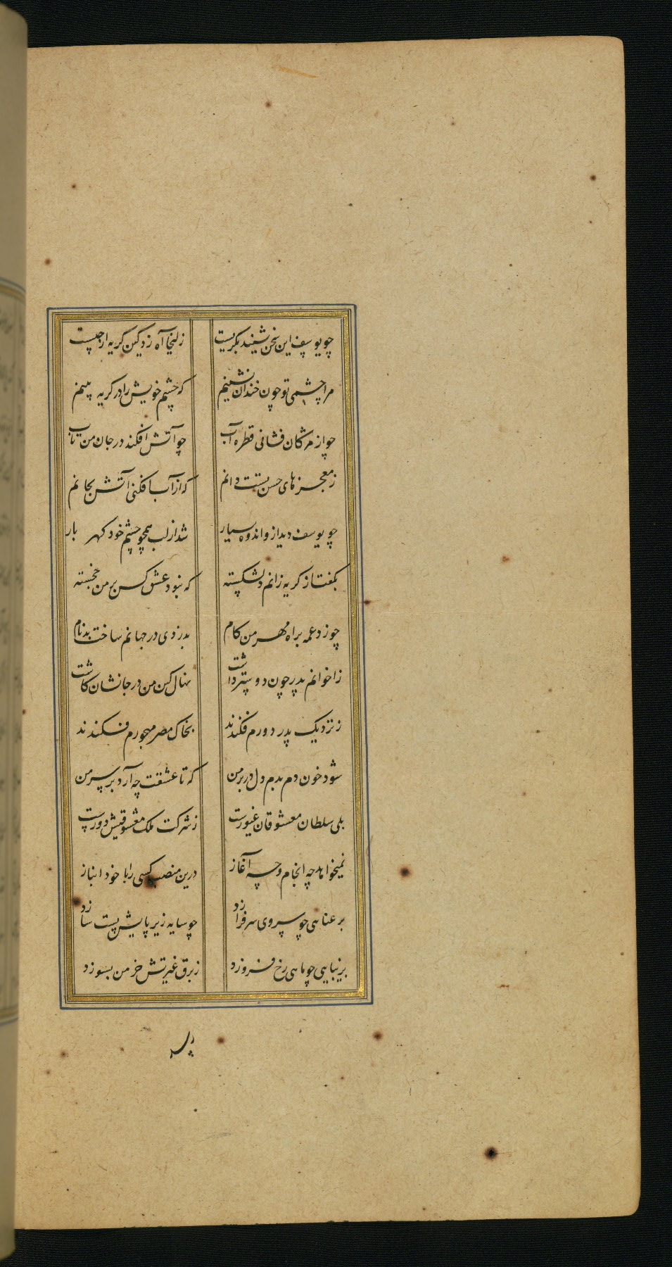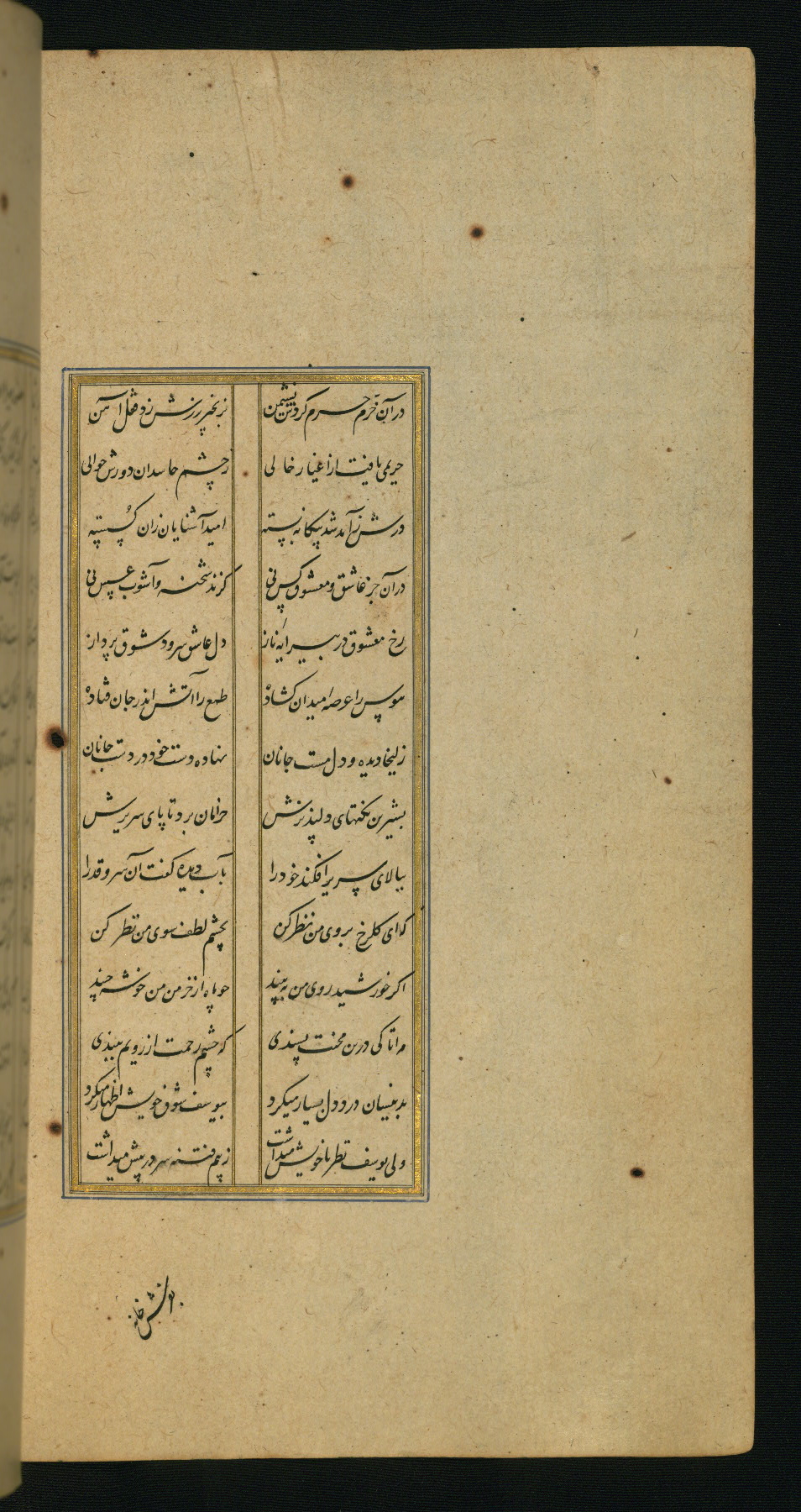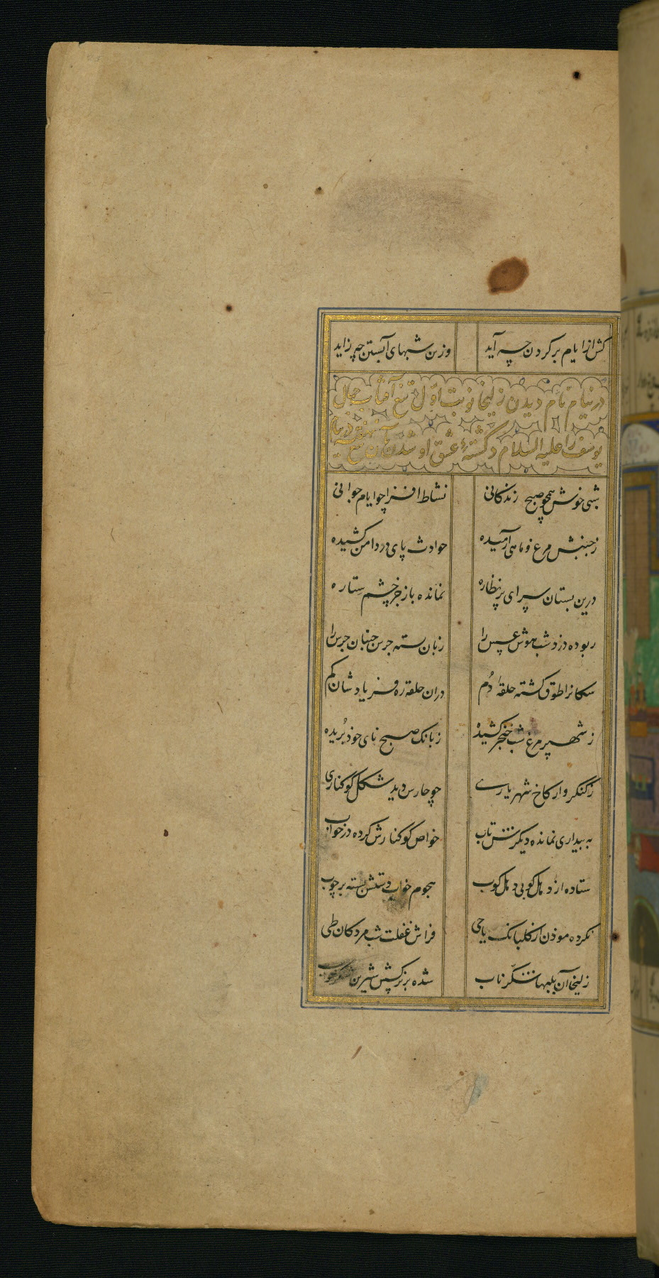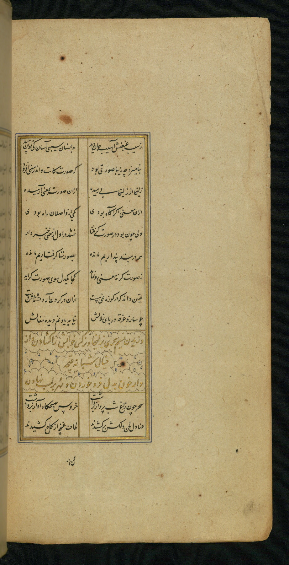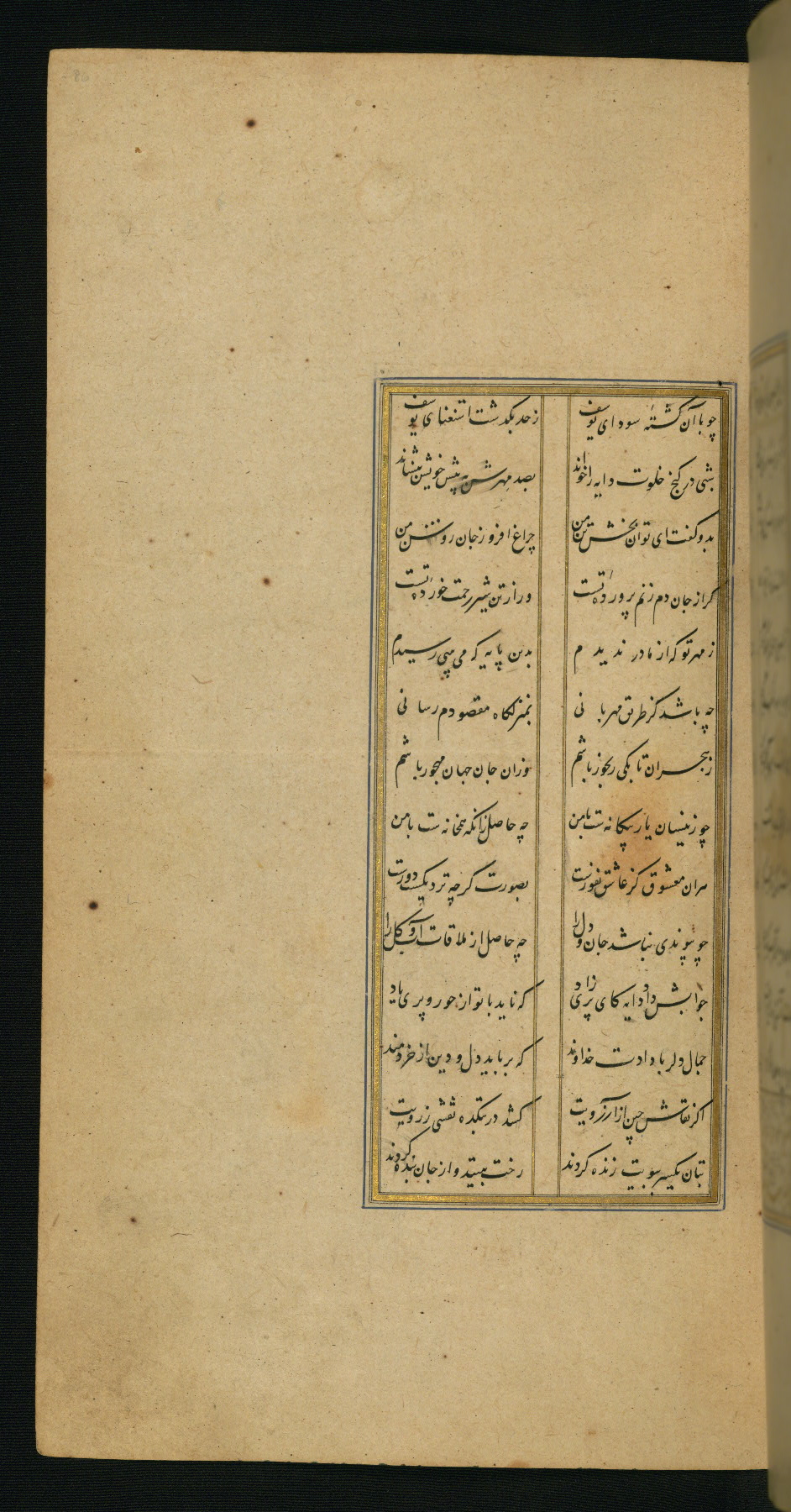 This is an illustrated and illuminated Safavid copy of Joseph (Yūsuf) and Zulaykhā by Nūr al-Dīn Jāmī (d. 898 AH / 1492 CE), executed in Iran in the early tenth century AH / sixteenth CE. The codex opens with a double-page illuminated incipit (fols. 1b-2a) containing the first verses of the work, the title, and the author's name. There are eight paintings illustrating the text. The binding is slightly later than the manuscript.