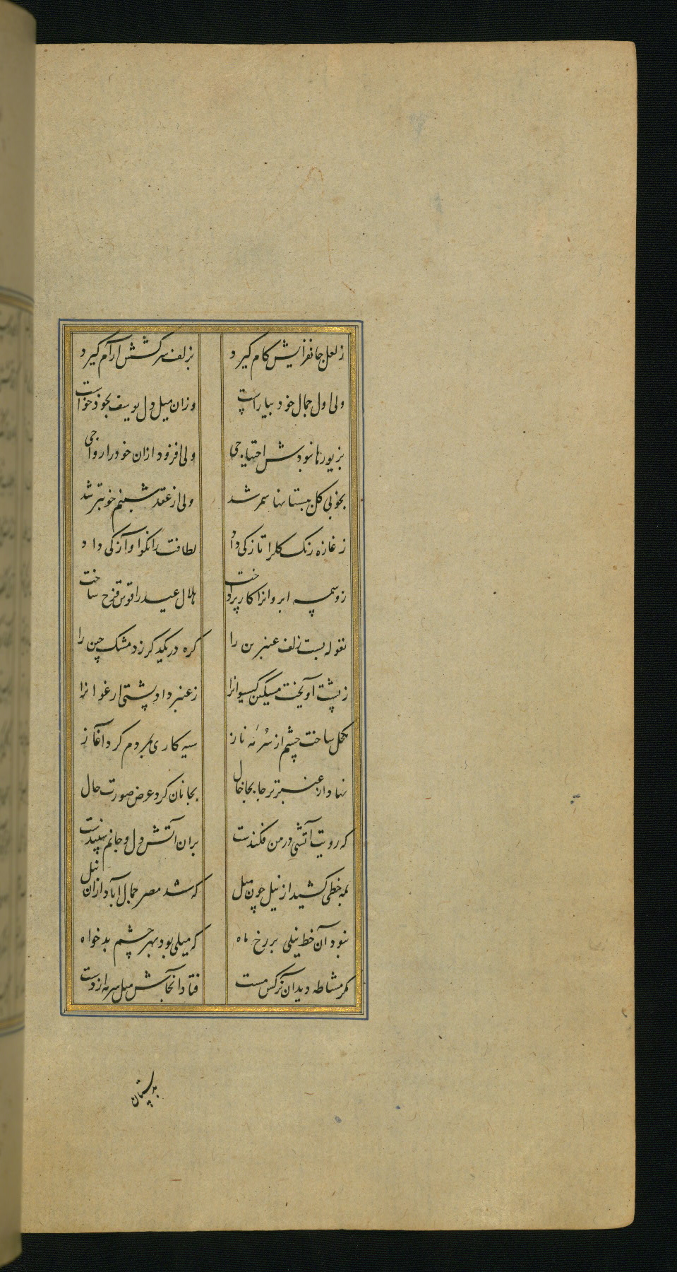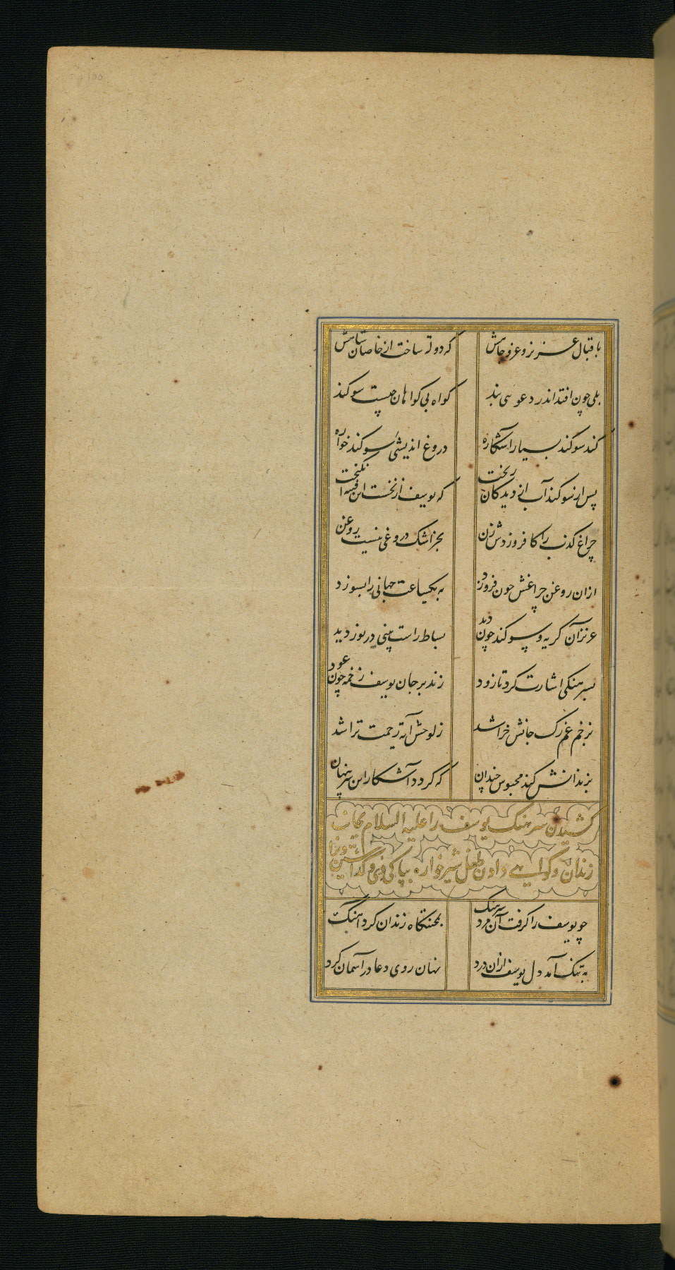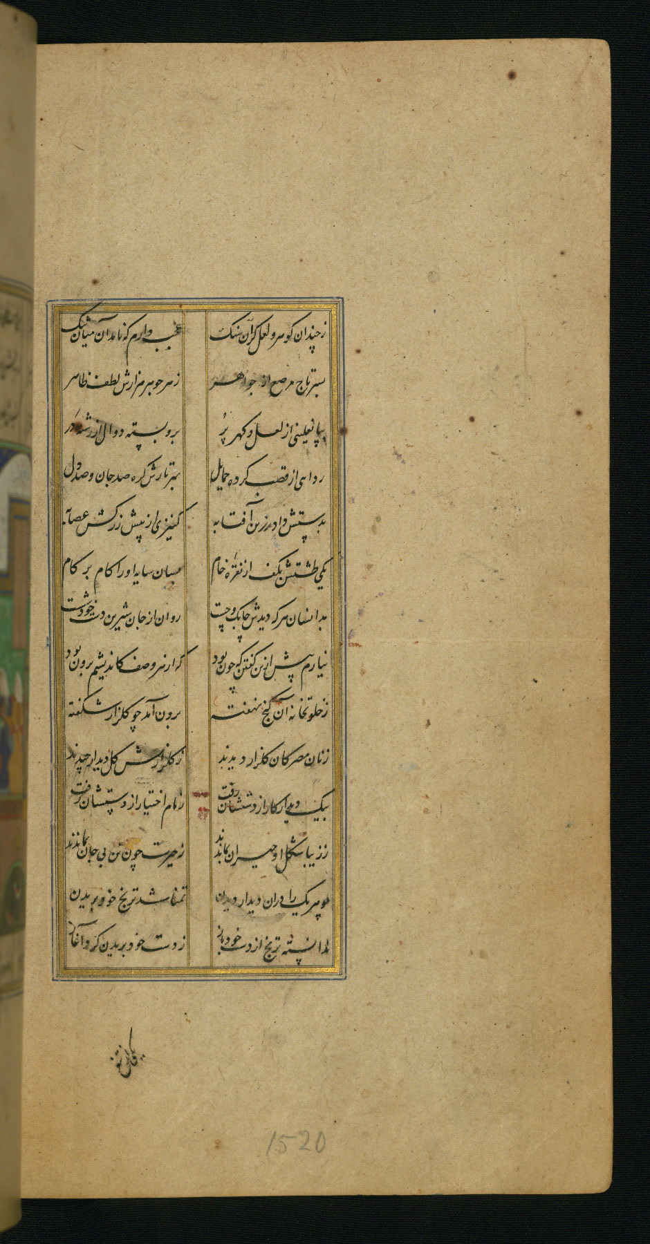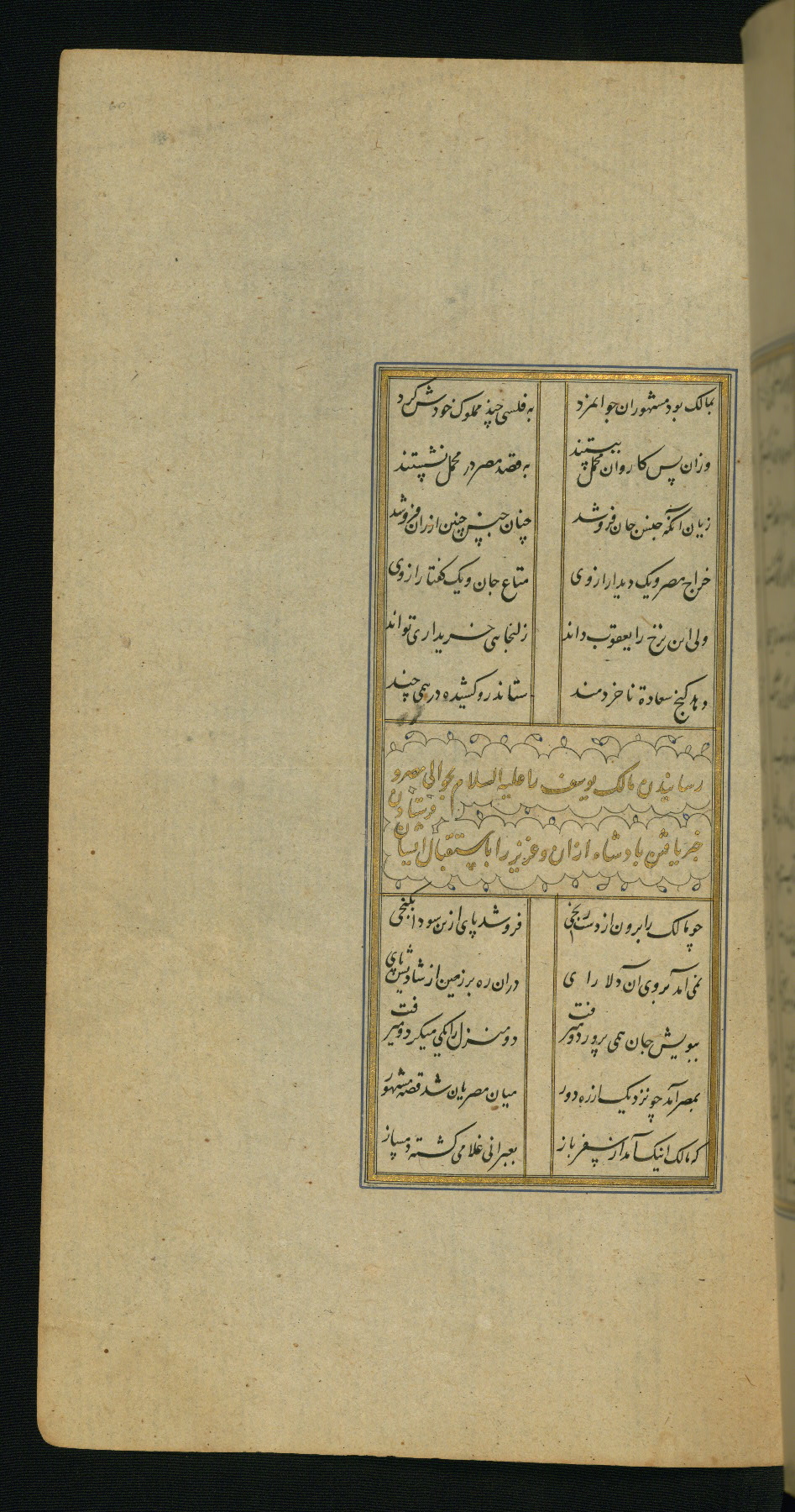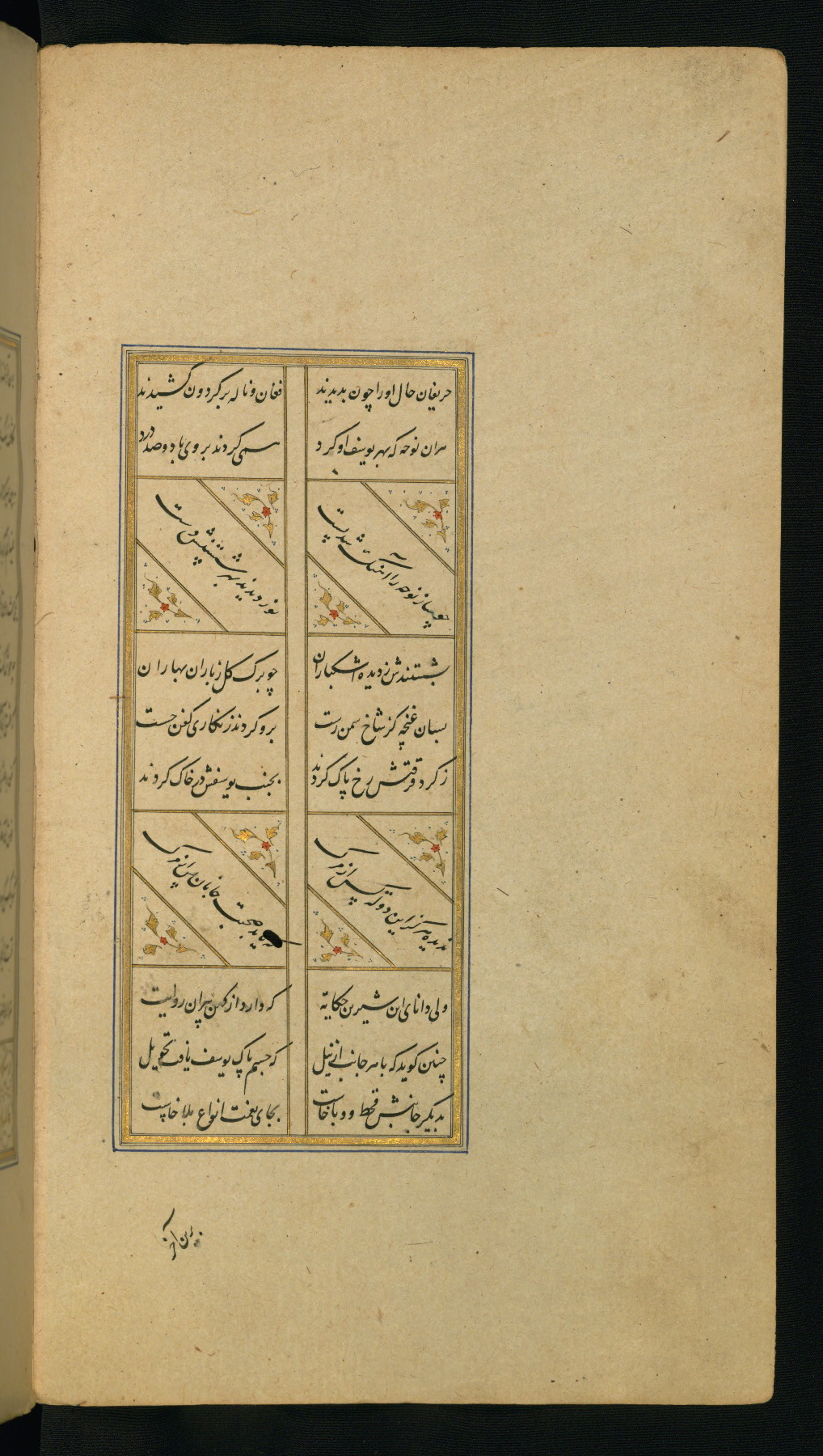 This is an illustrated and illuminated Safavid copy of Joseph (Yūsuf) and Zulaykhā by Nūr al-Dīn Jāmī (d. 898 AH / 1492 CE), executed in Iran in the early tenth century AH / sixteenth CE. The codex opens with a double-page illuminated incipit (fols. 1b-2a) containing the first verses of the work, the title, and the author's name. There are eight paintings illustrating the text. The binding is slightly later than the manuscript.