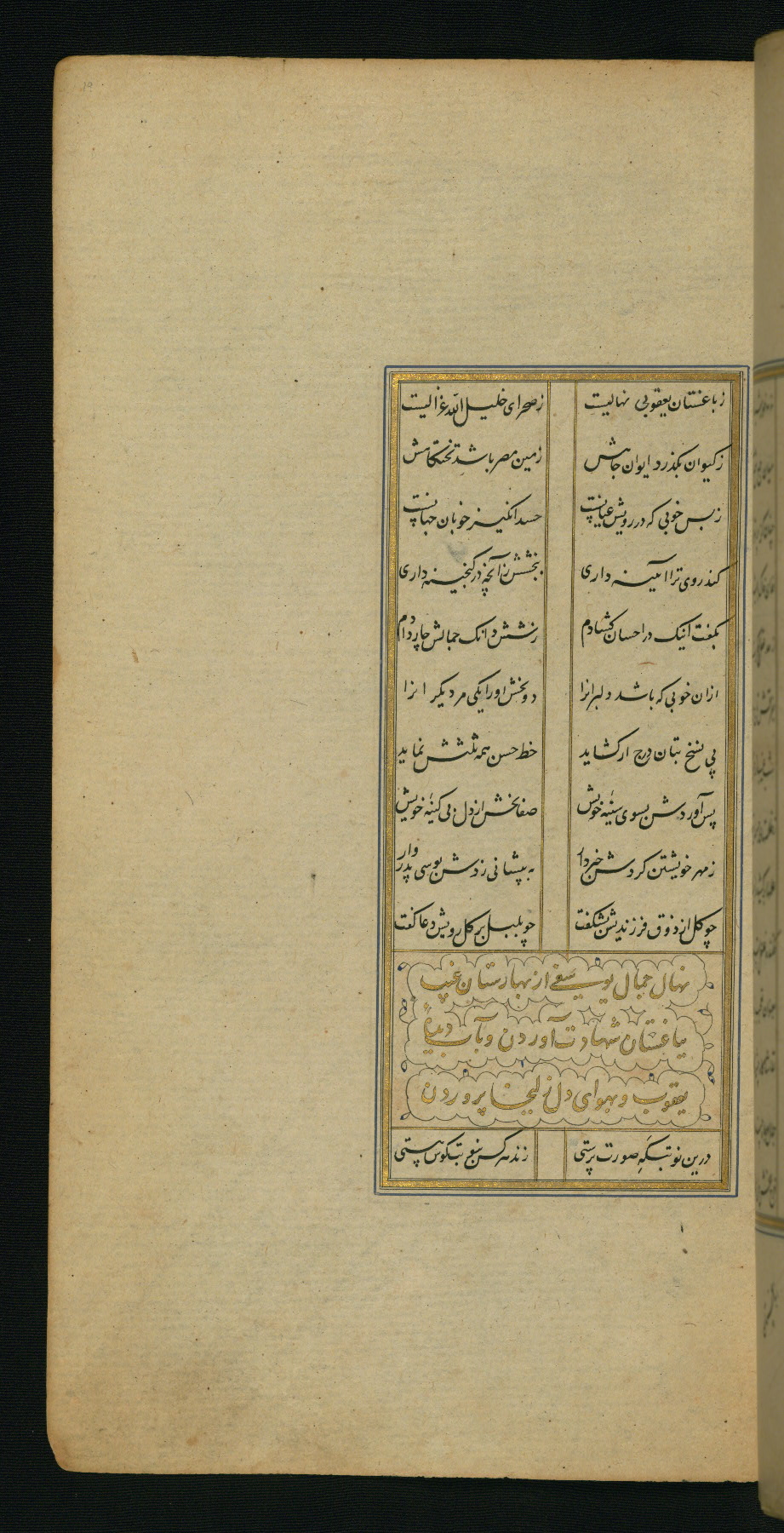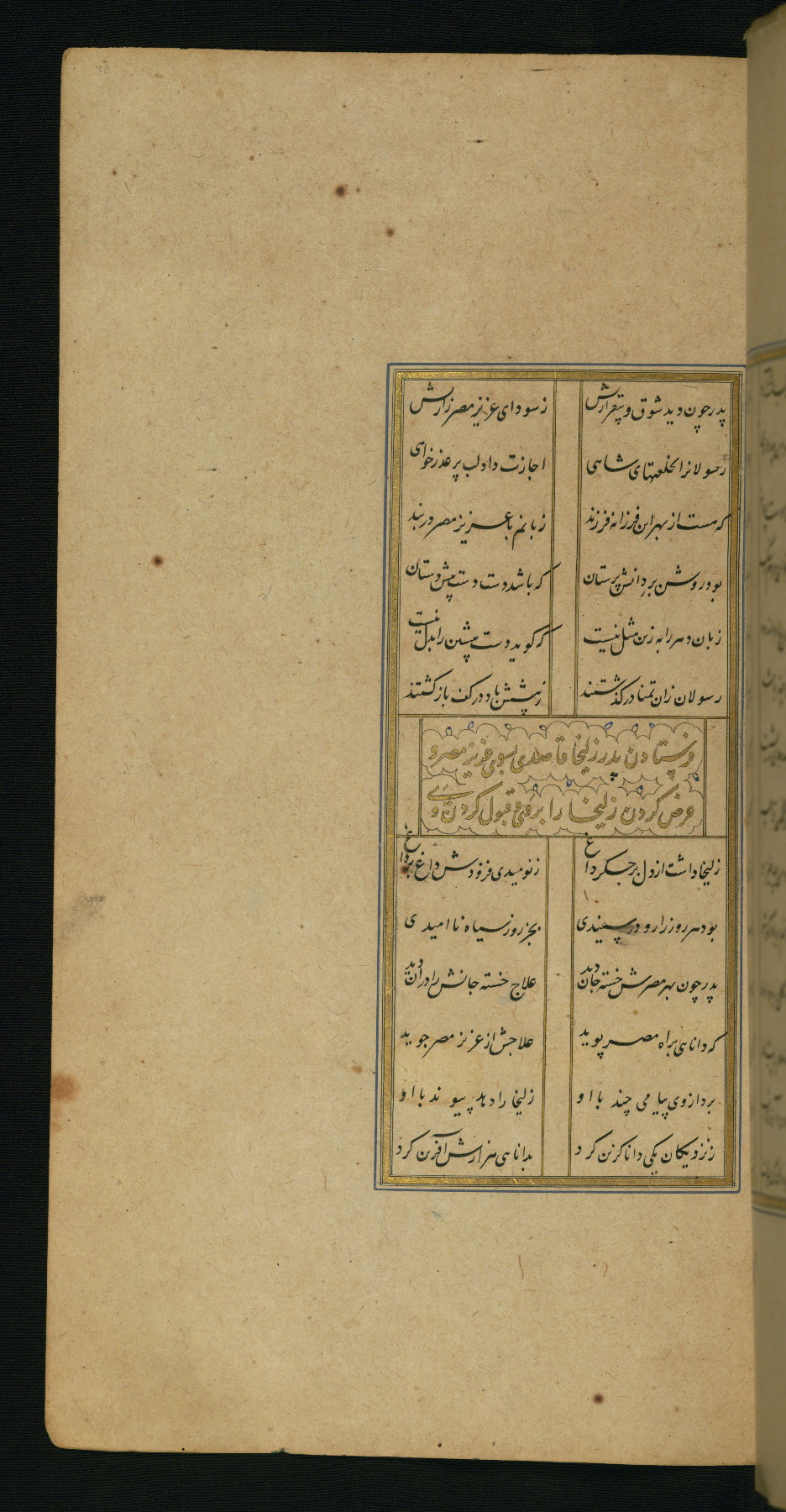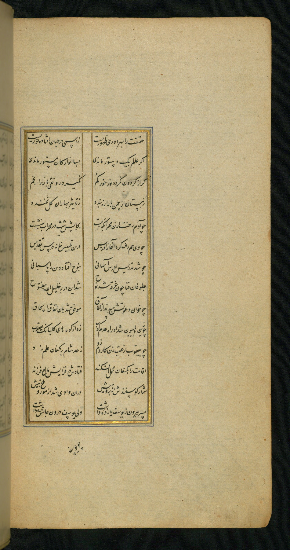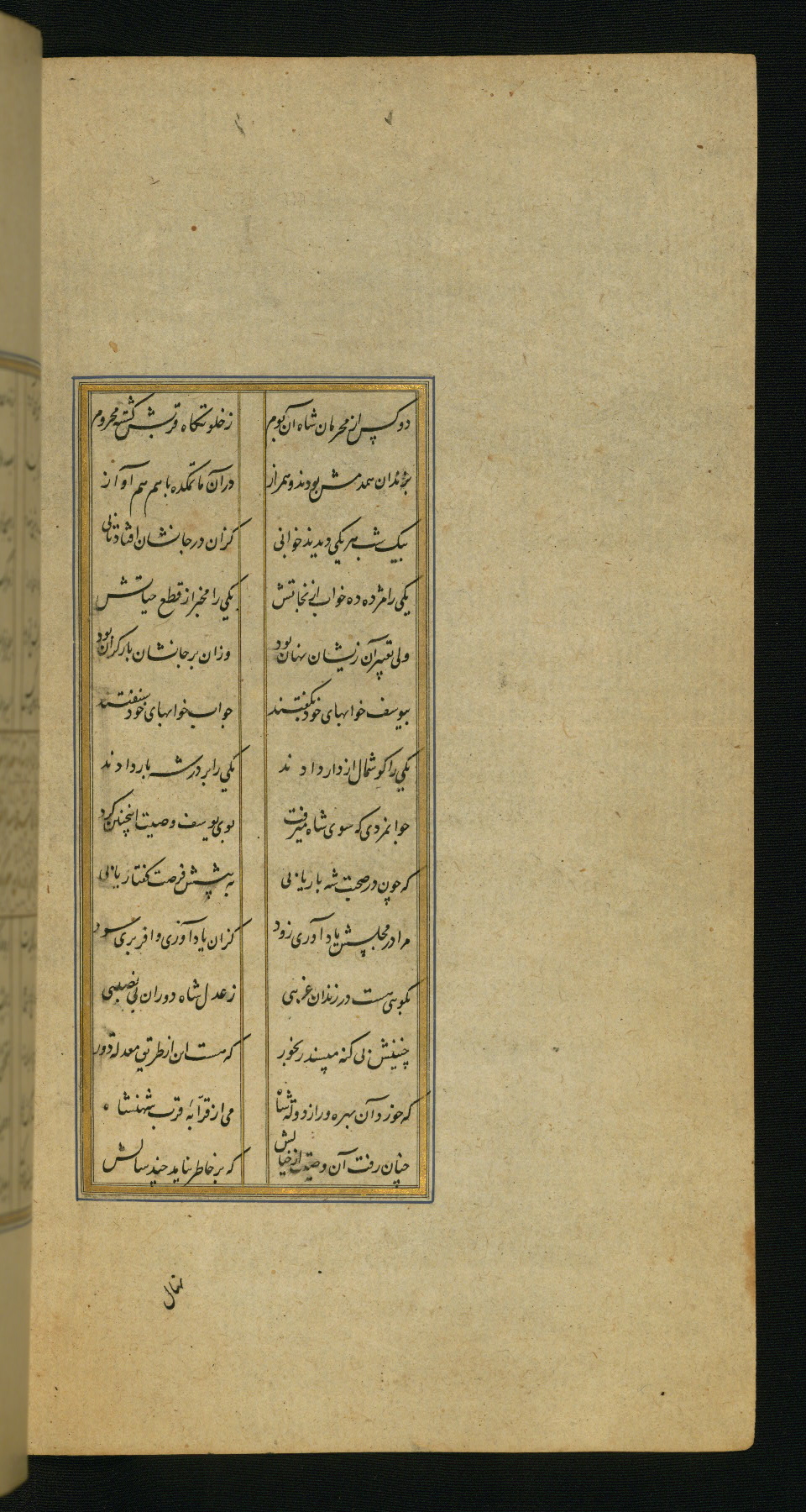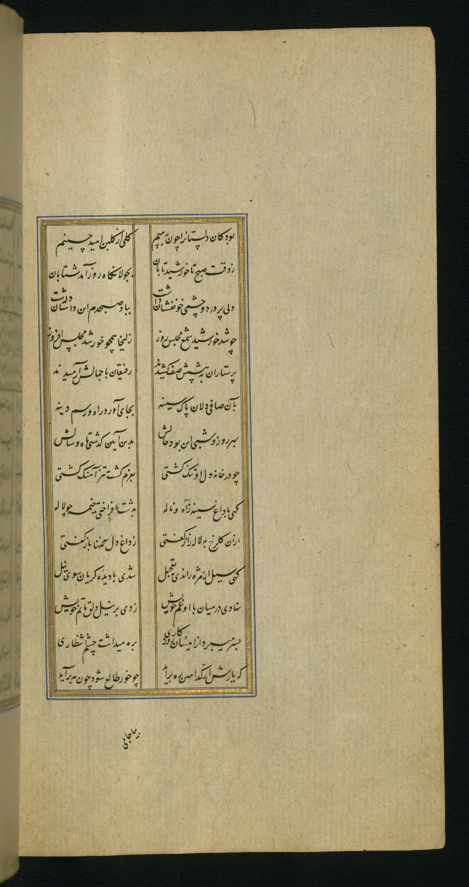 This is an illustrated and illuminated Safavid copy of Joseph (Yūsuf) and Zulaykhā by Nūr al-Dīn Jāmī (d. 898 AH / 1492 CE), executed in Iran in the early tenth century AH / sixteenth CE. The codex opens with a double-page illuminated incipit (fols. 1b-2a) containing the first verses of the work, the title, and the author's name. There are eight paintings illustrating the text. The binding is slightly later than the manuscript.
