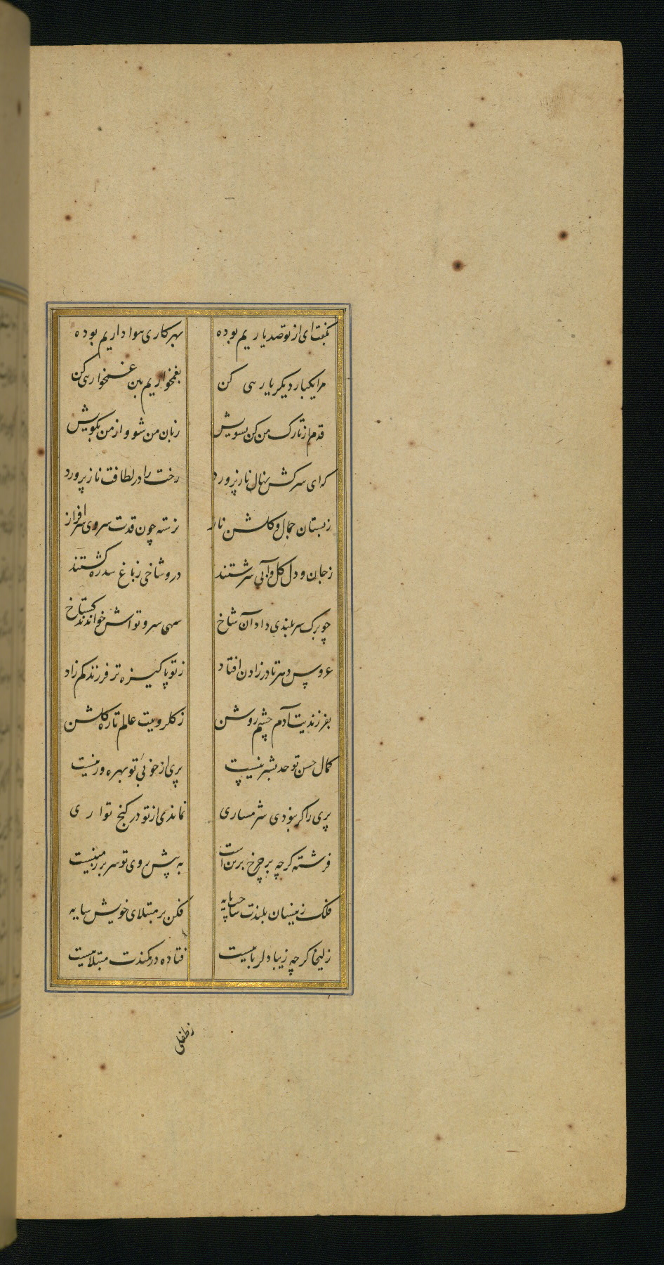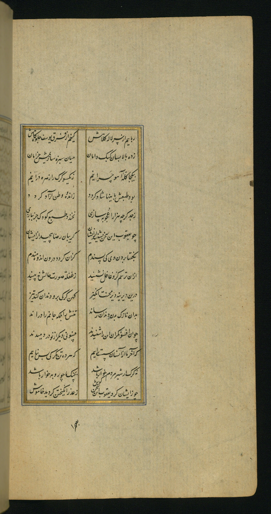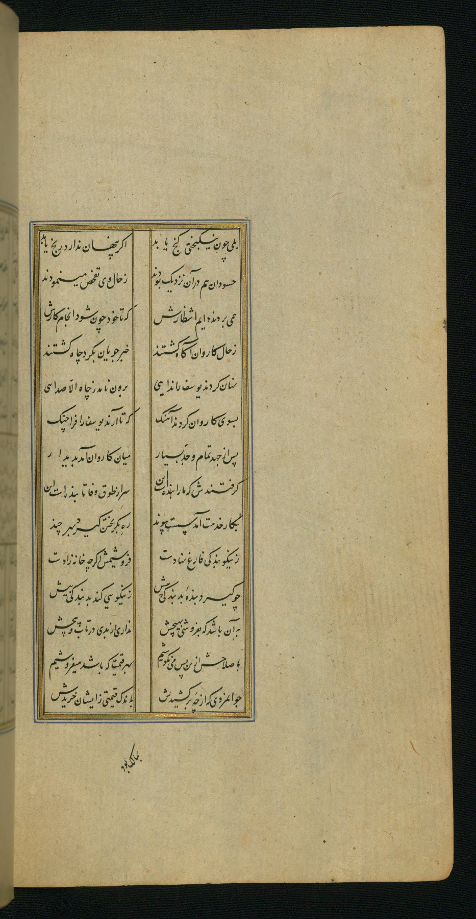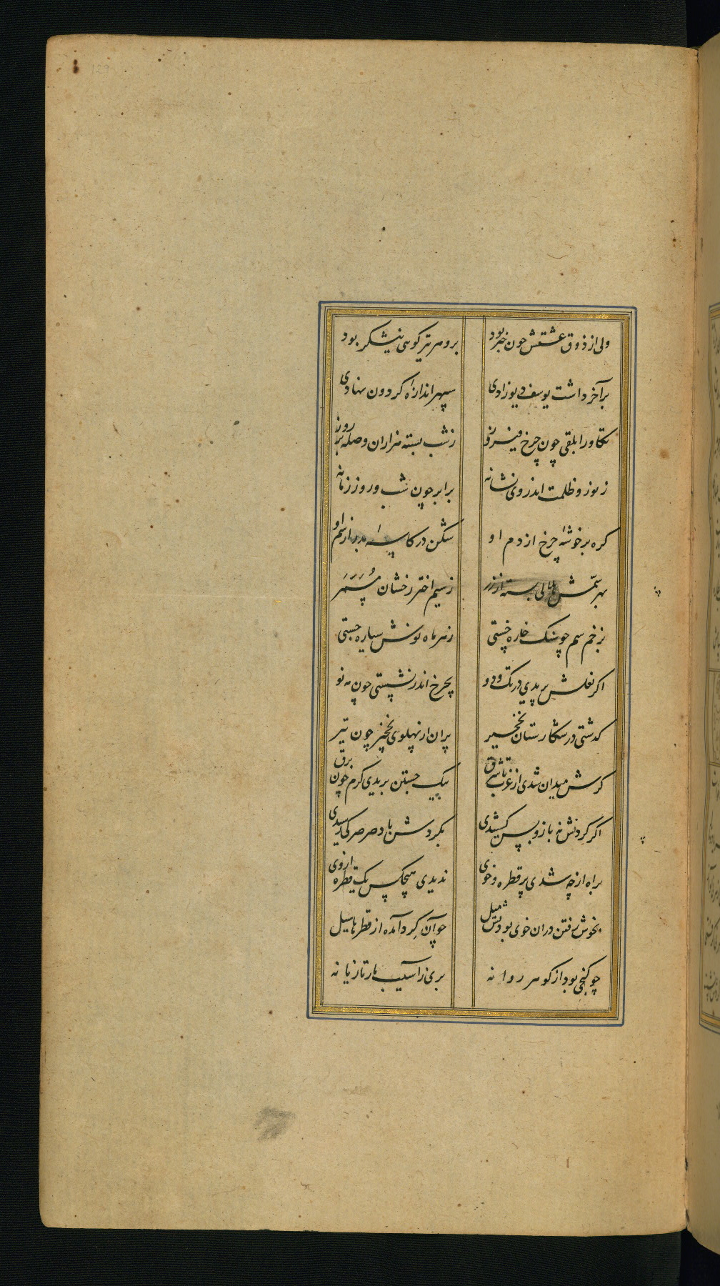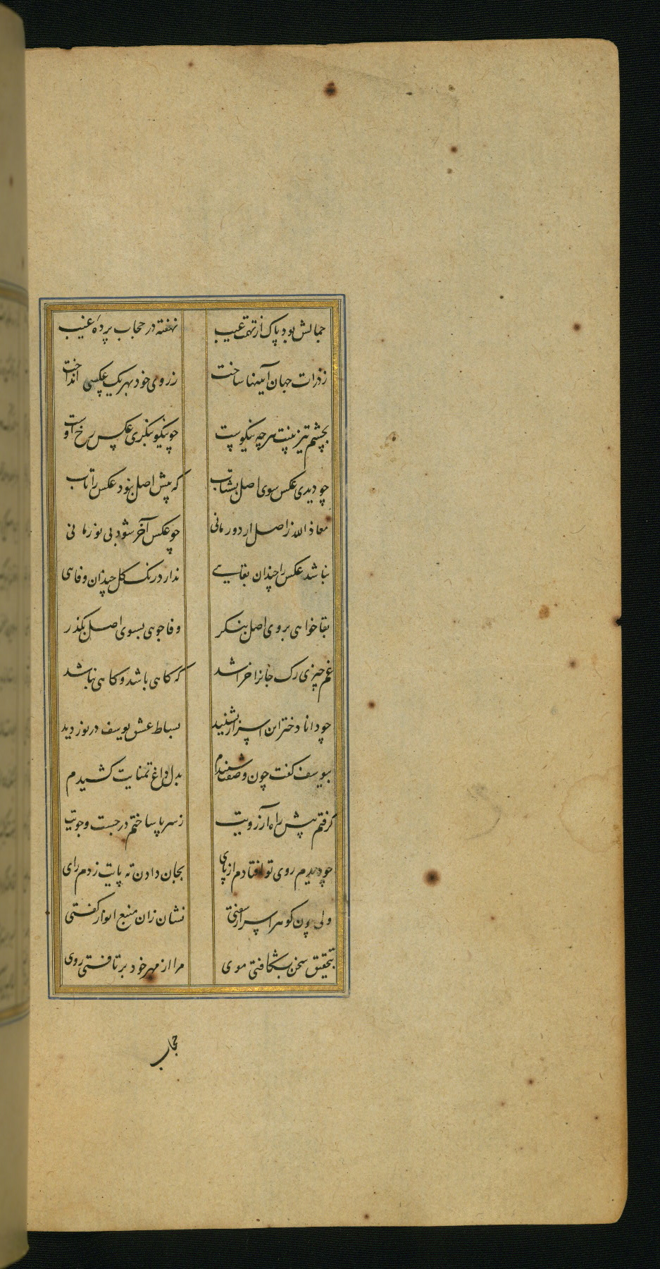 This is an illustrated and illuminated Safavid copy of Joseph (Yūsuf) and Zulaykhā by Nūr al-Dīn Jāmī (d. 898 AH / 1492 CE), executed in Iran in the early tenth century AH / sixteenth CE. The codex opens with a double-page illuminated incipit (fols. 1b-2a) containing the first verses of the work, the title, and the author's name. There are eight paintings illustrating the text. The binding is slightly later than the manuscript.