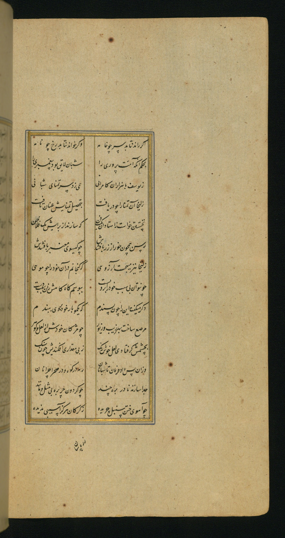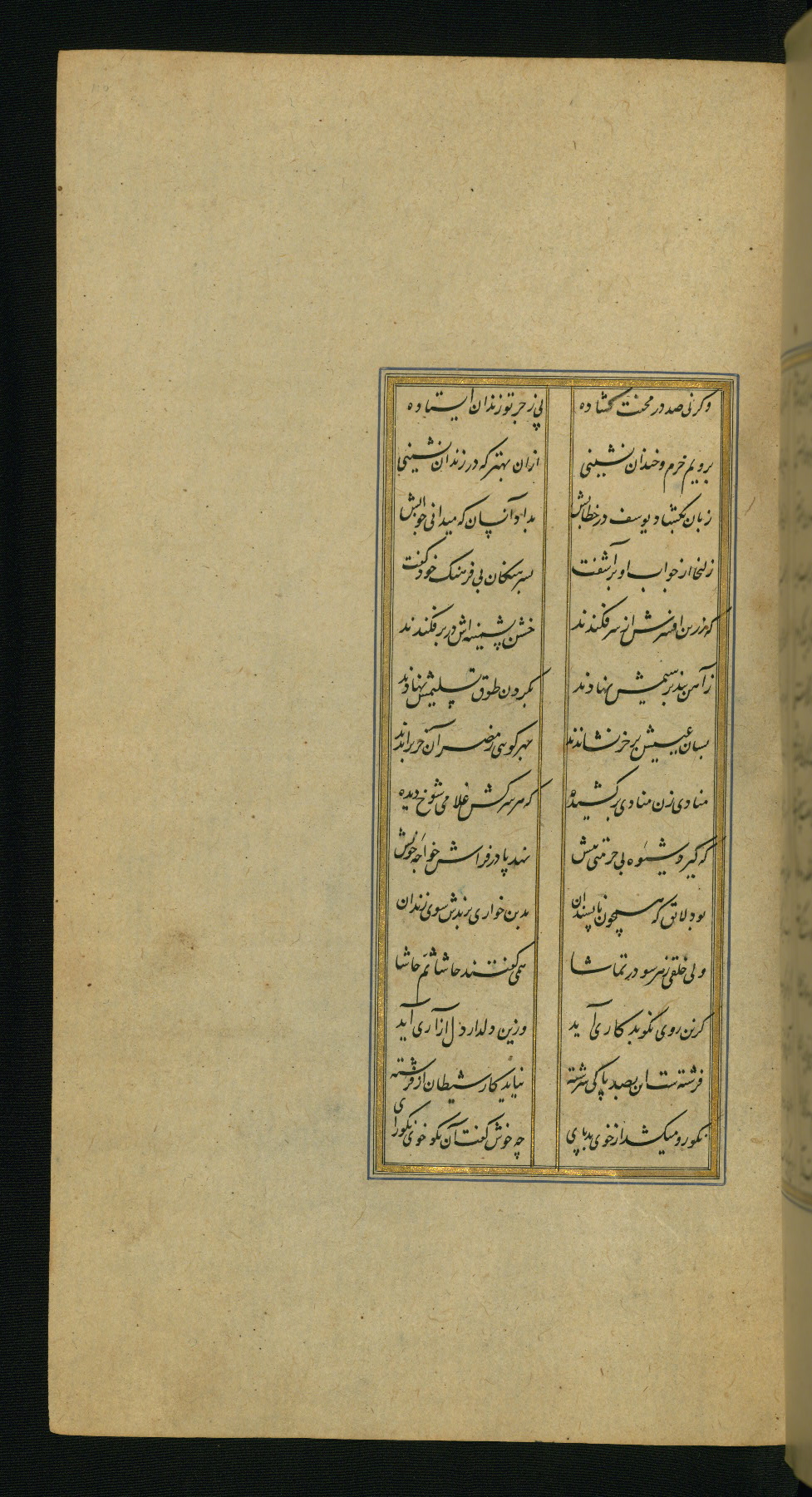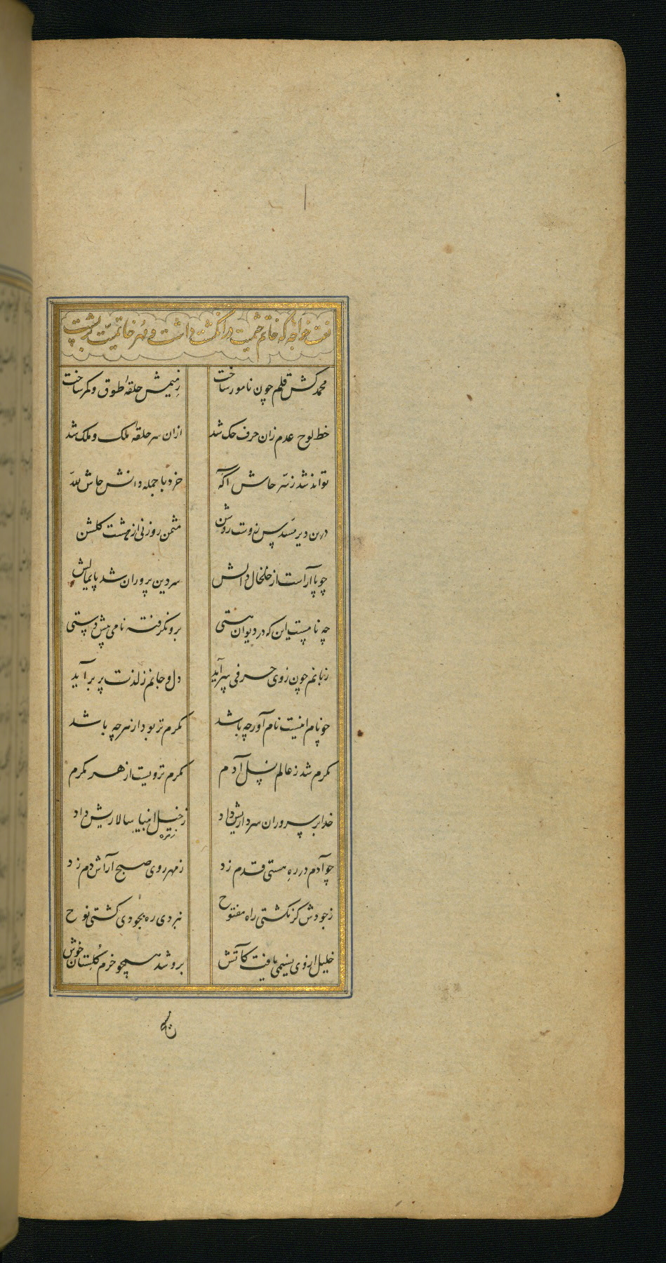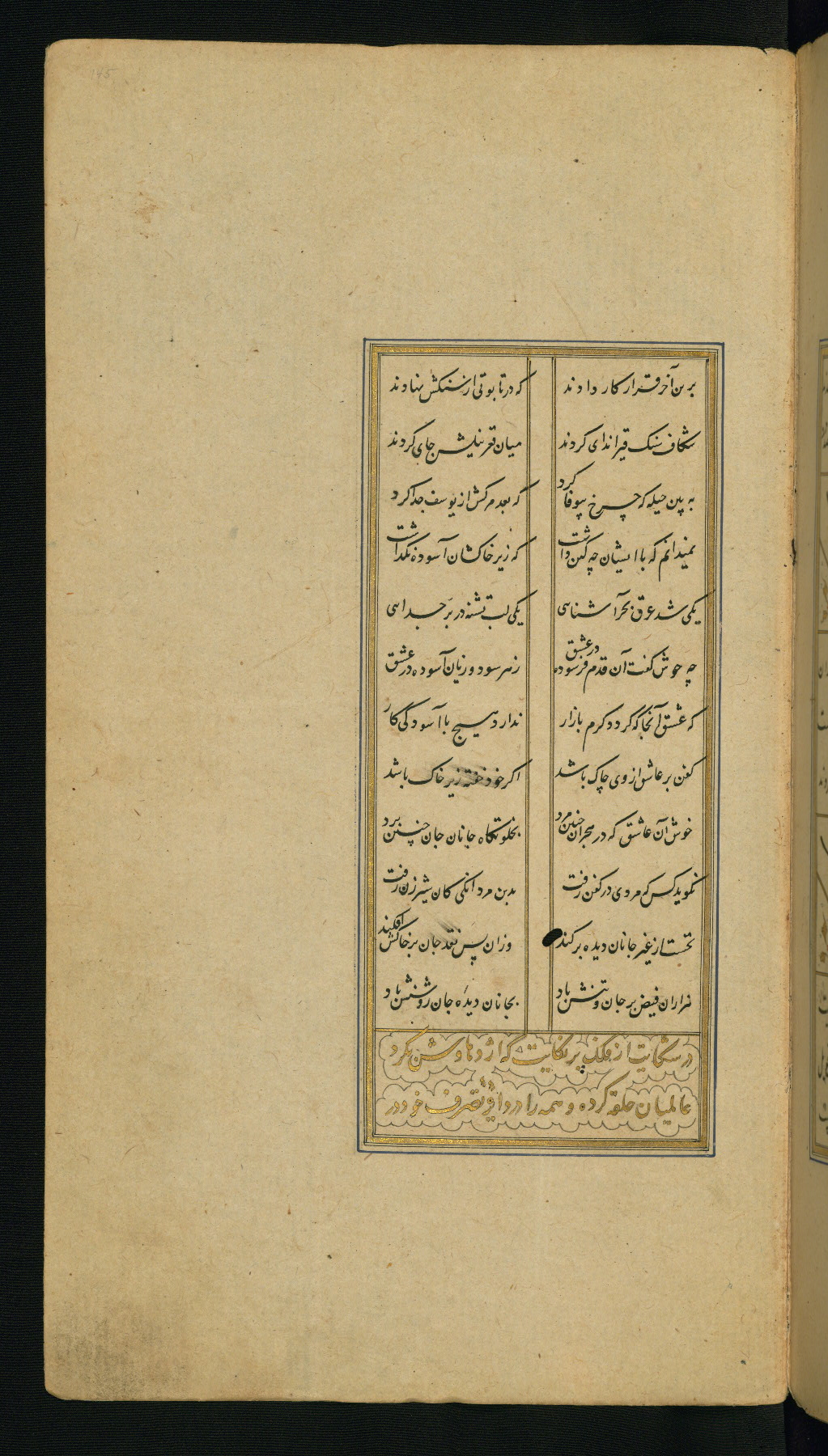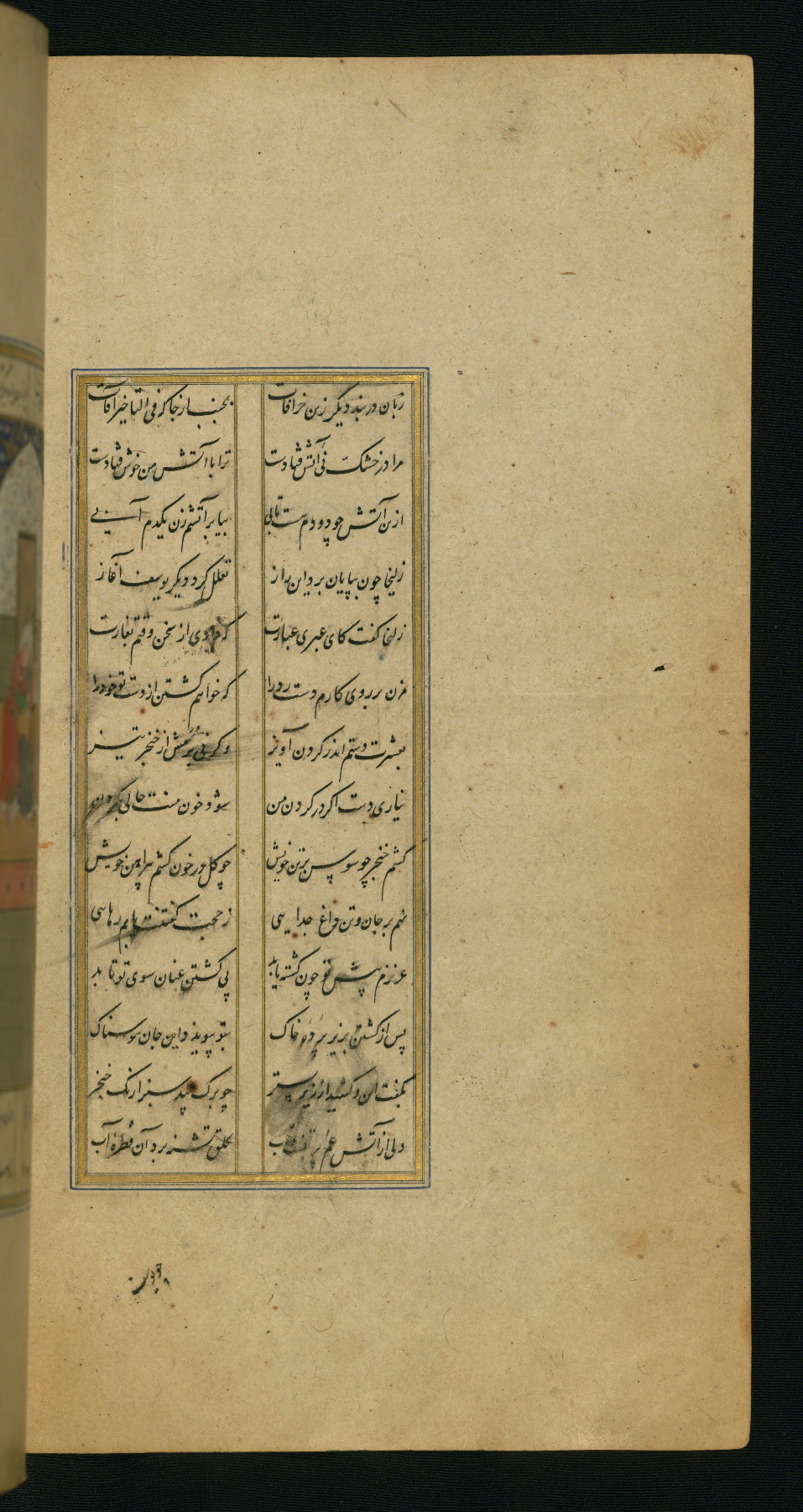 This is an illustrated and illuminated Safavid copy of Joseph (Yūsuf) and Zulaykhā by Nūr al-Dīn Jāmī (d. 898 AH / 1492 CE), executed in Iran in the early tenth century AH / sixteenth CE. The codex opens with a double-page illuminated incipit (fols. 1b-2a) containing the first verses of the work, the title, and the author's name. There are eight paintings illustrating the text. The binding is slightly later than the manuscript.