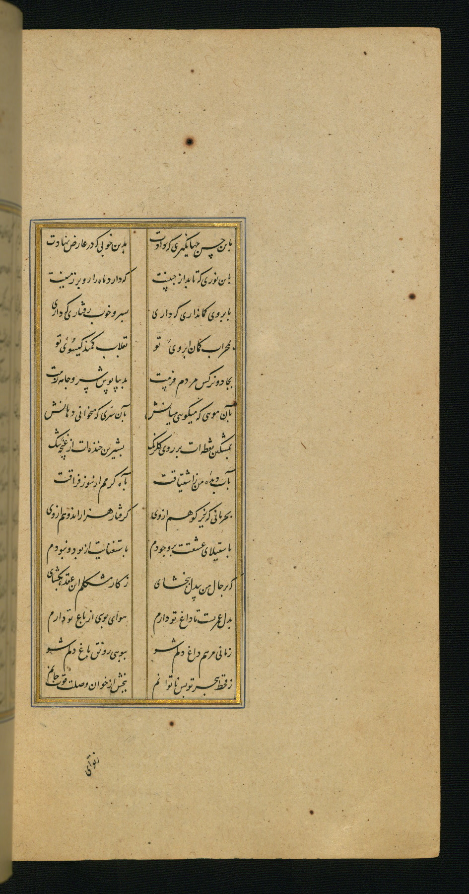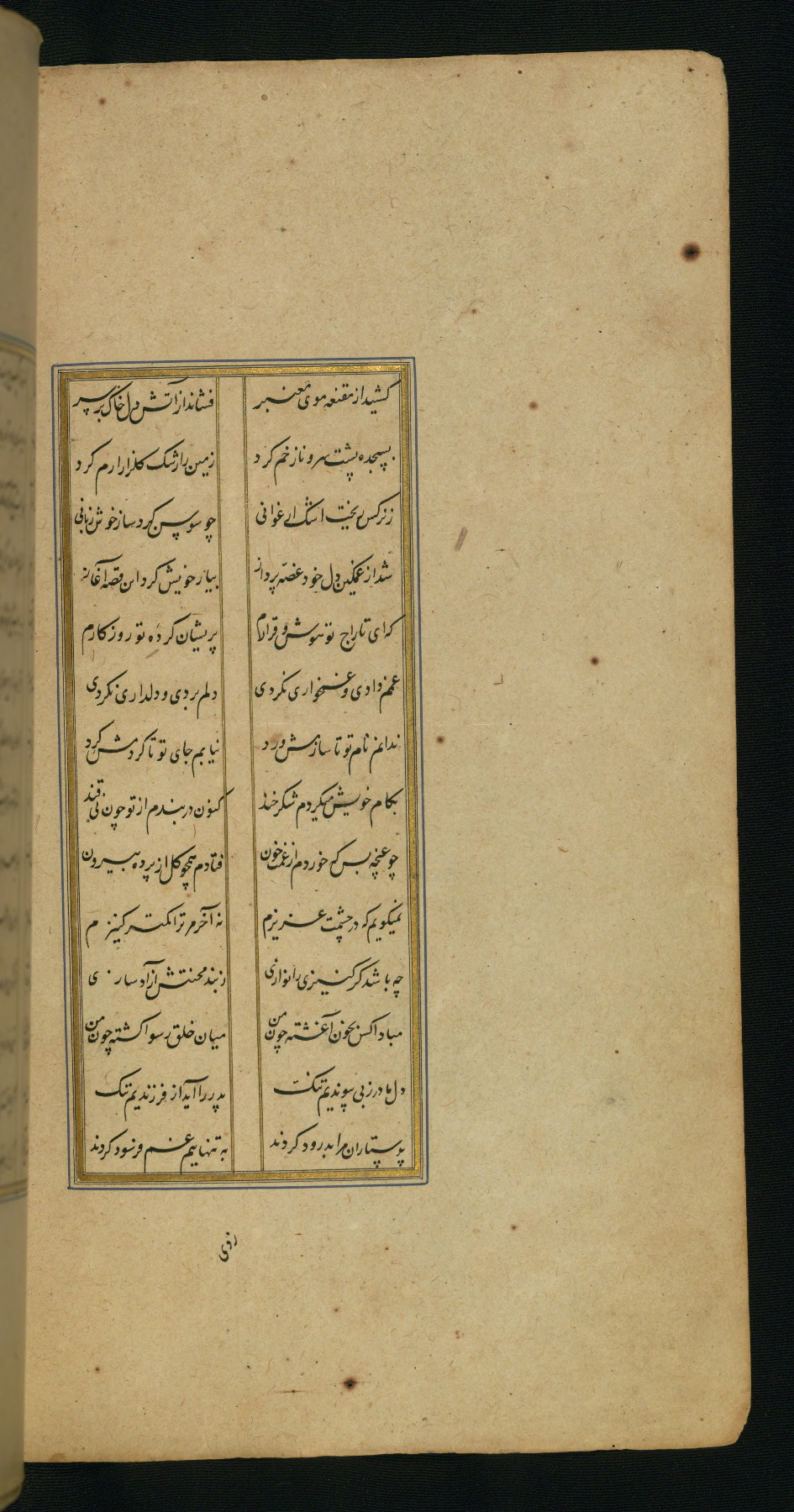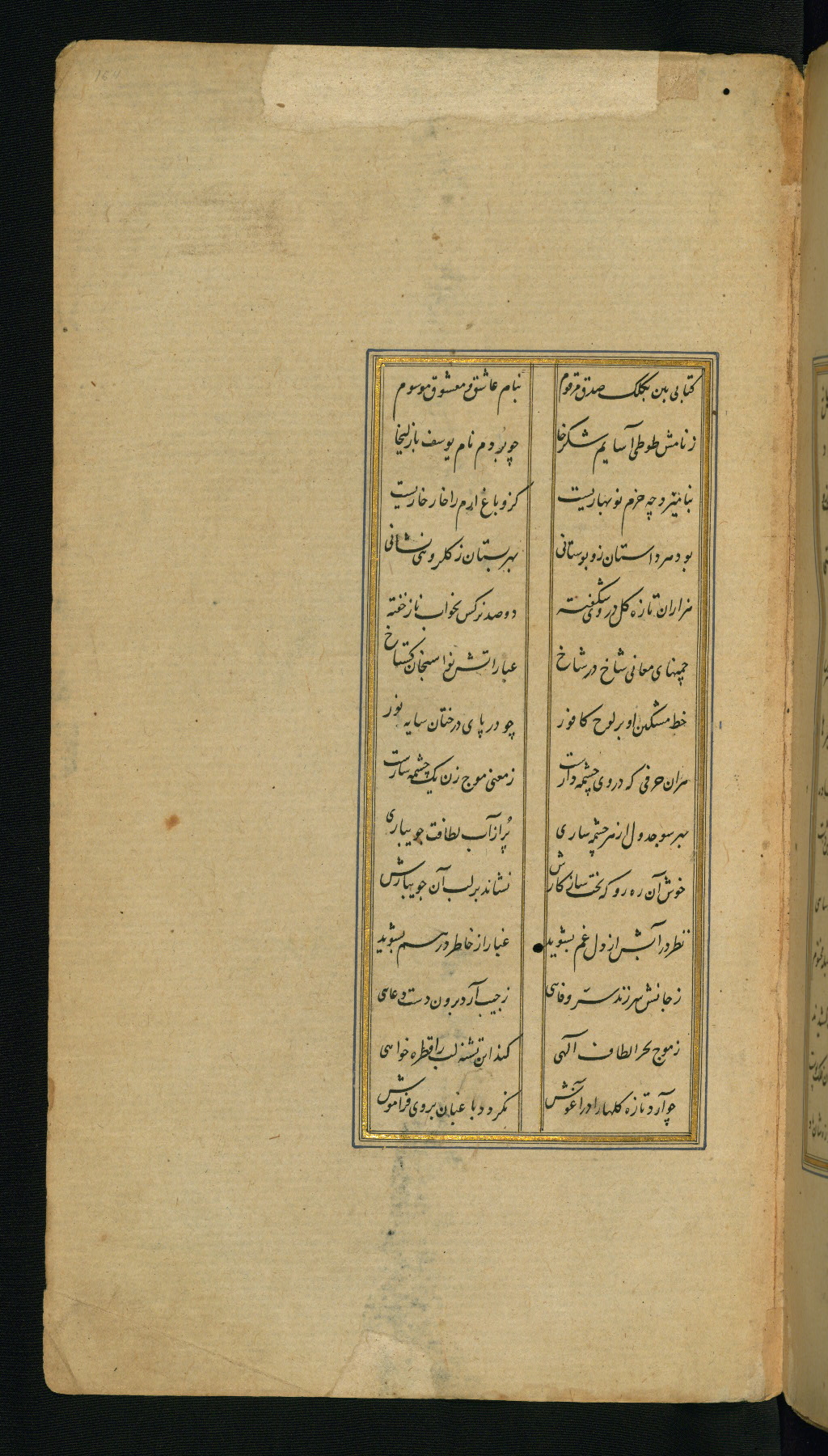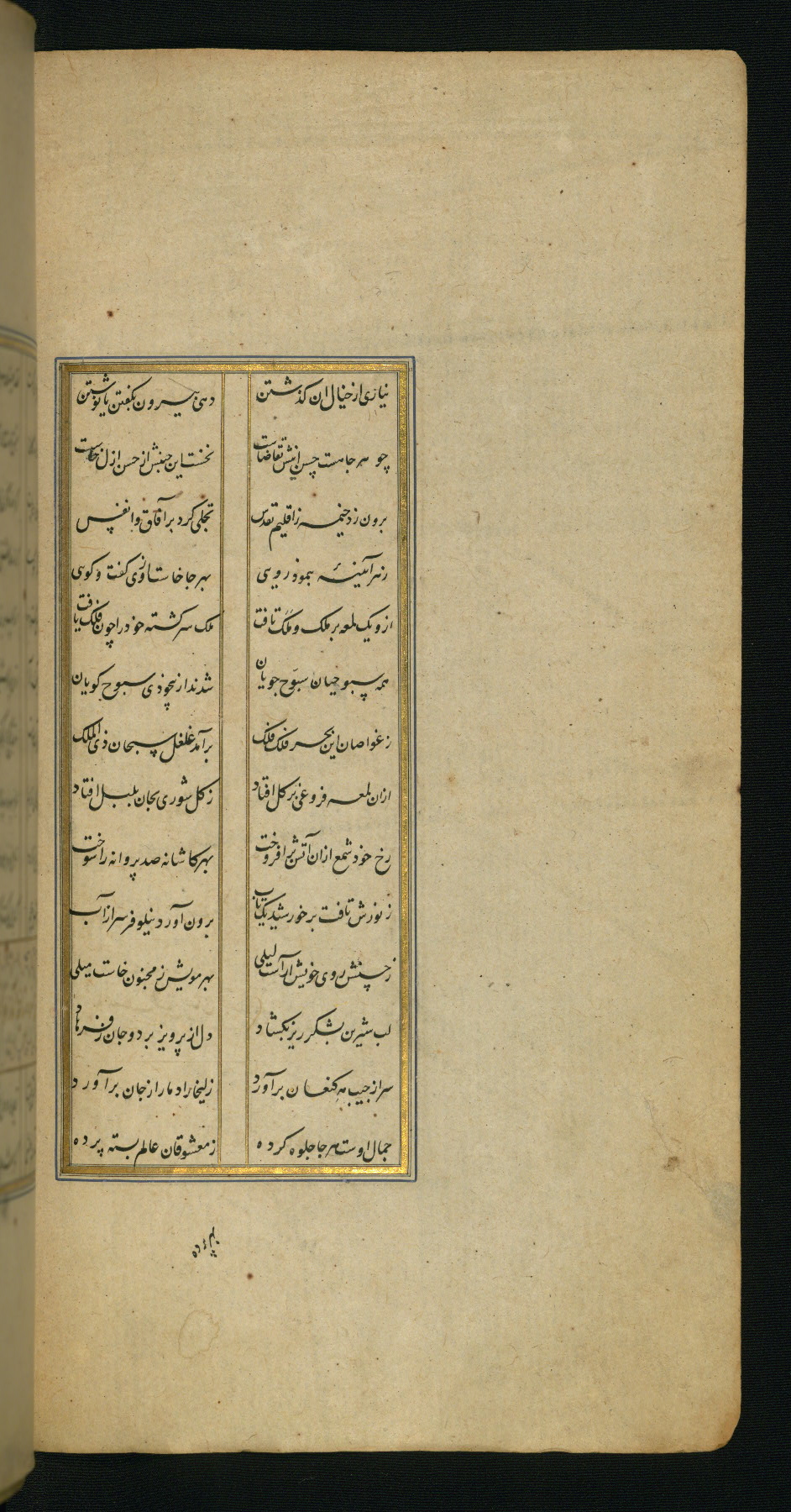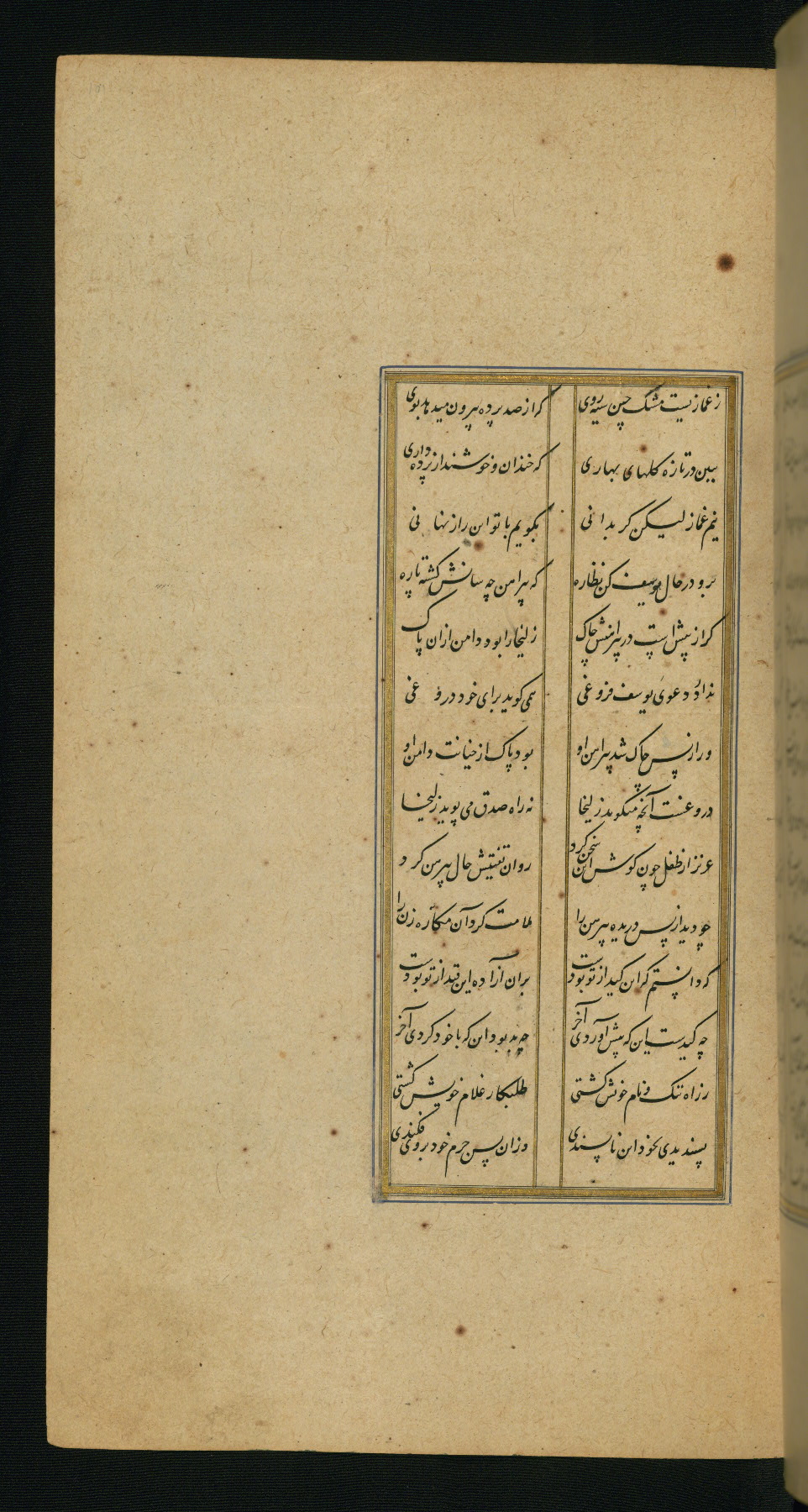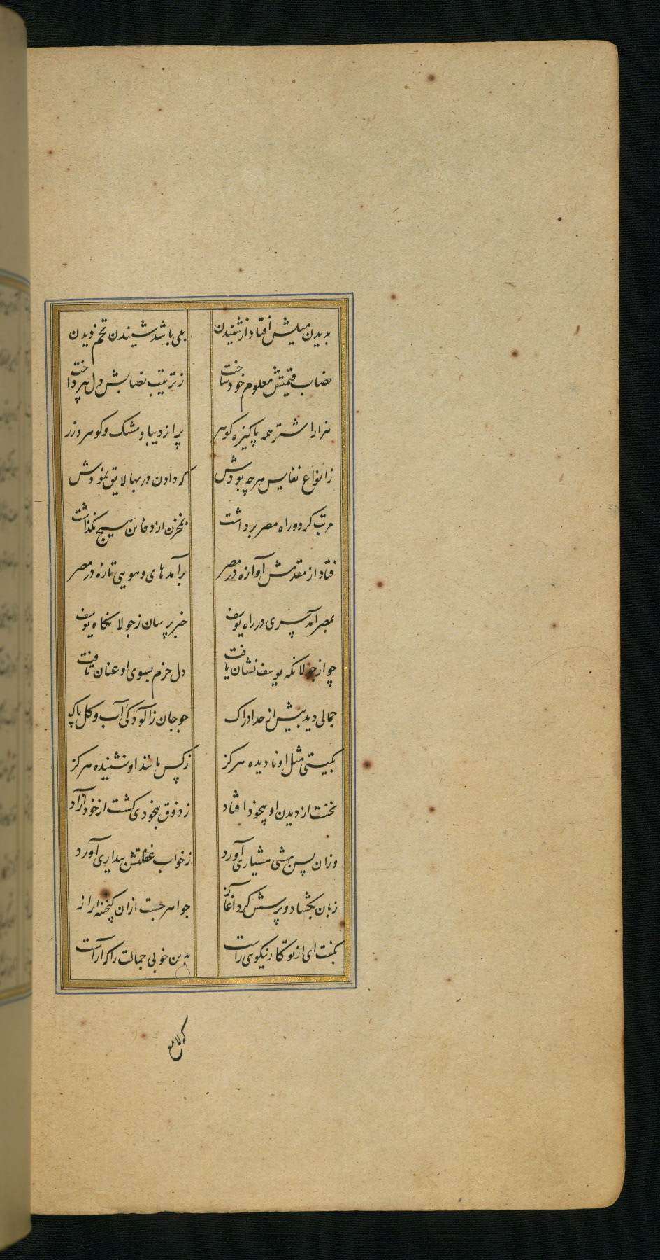 This is an illustrated and illuminated Safavid copy of Joseph (Yūsuf) and Zulaykhā by Nūr al-Dīn Jāmī (d. 898 AH / 1492 CE), executed in Iran in the early tenth century AH / sixteenth CE. The codex opens with a double-page illuminated incipit (fols. 1b-2a) containing the first verses of the work, the title, and the author's name. There are eight paintings illustrating the text. The binding is slightly later than the manuscript.