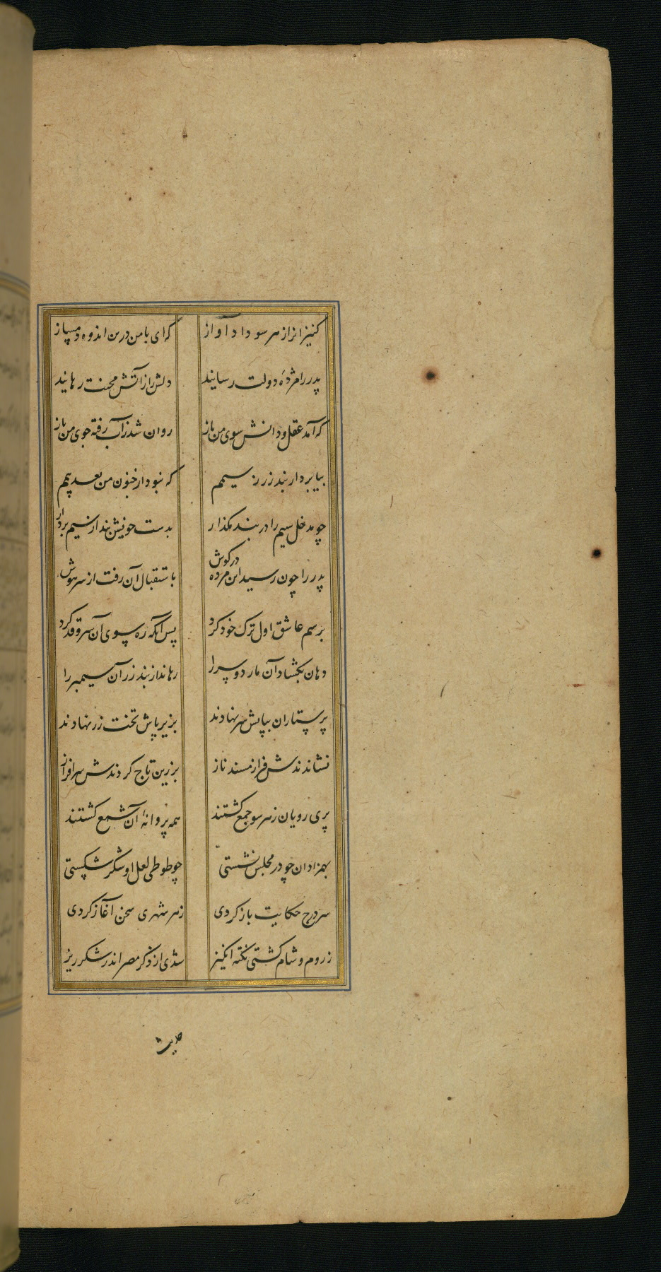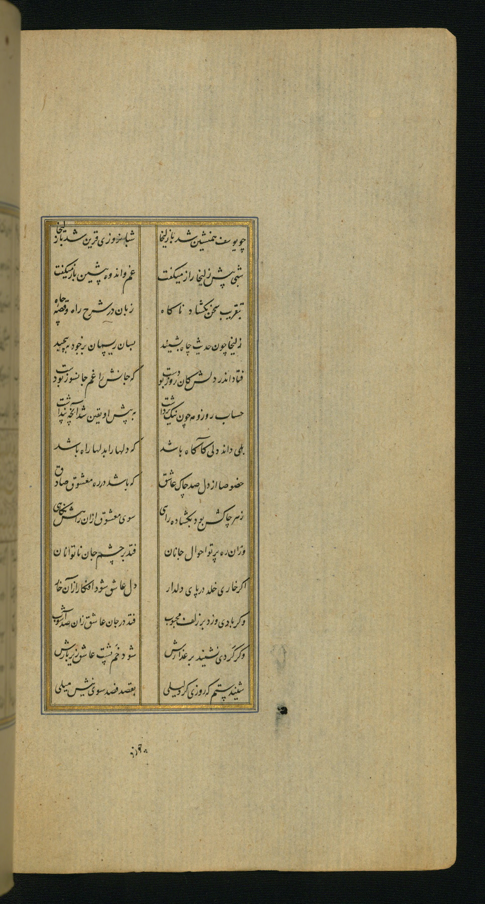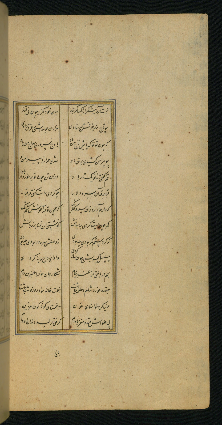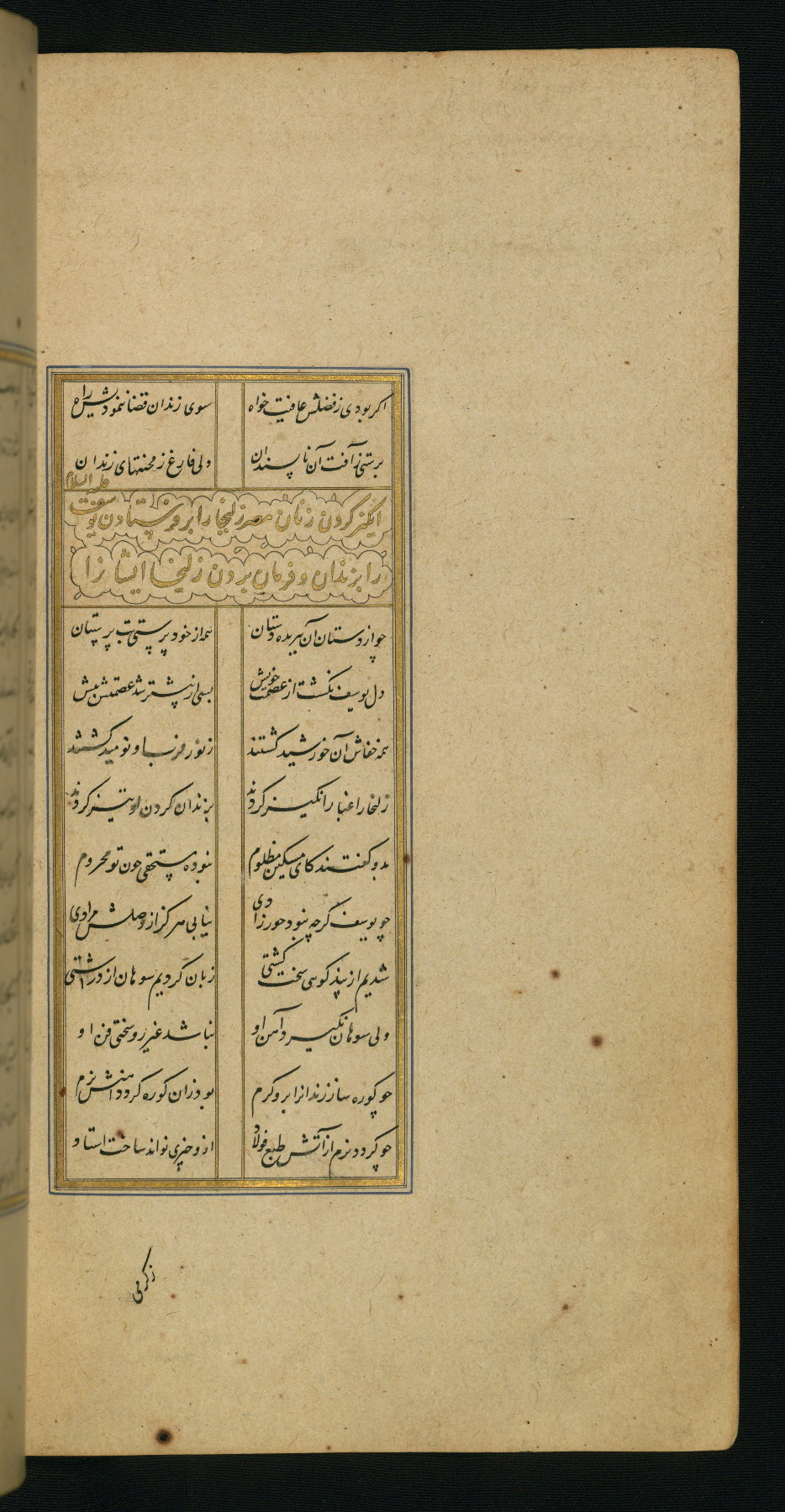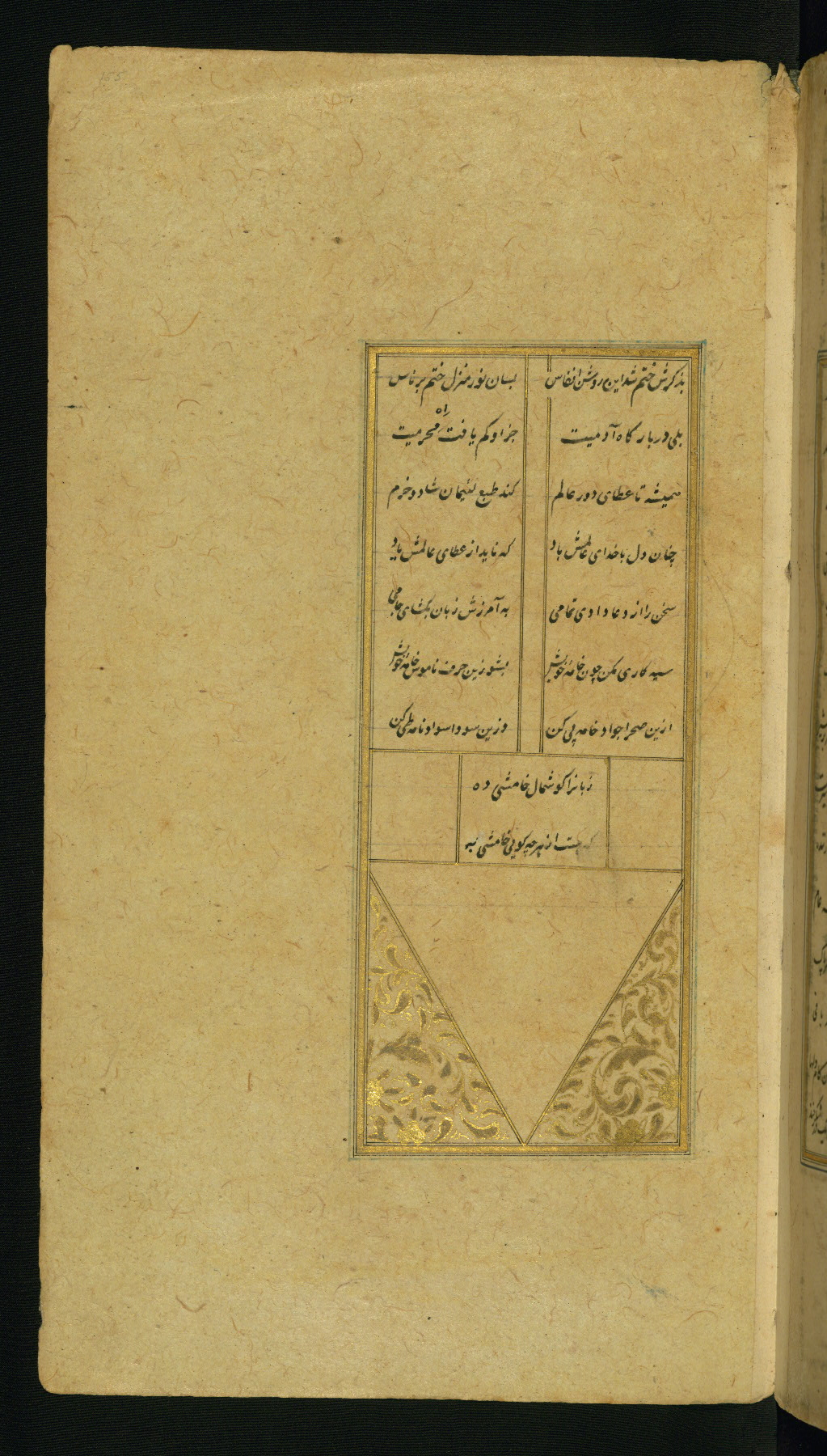 This is an illustrated and illuminated Safavid copy of Joseph (Yūsuf) and Zulaykhā by Nūr al-Dīn Jāmī (d. 898 AH / 1492 CE), executed in Iran in the early tenth century AH / sixteenth CE. The codex opens with a double-page illuminated incipit (fols. 1b-2a) containing the first verses of the work, the title, and the author's name. There are eight paintings illustrating the text. The binding is slightly later than the manuscript.