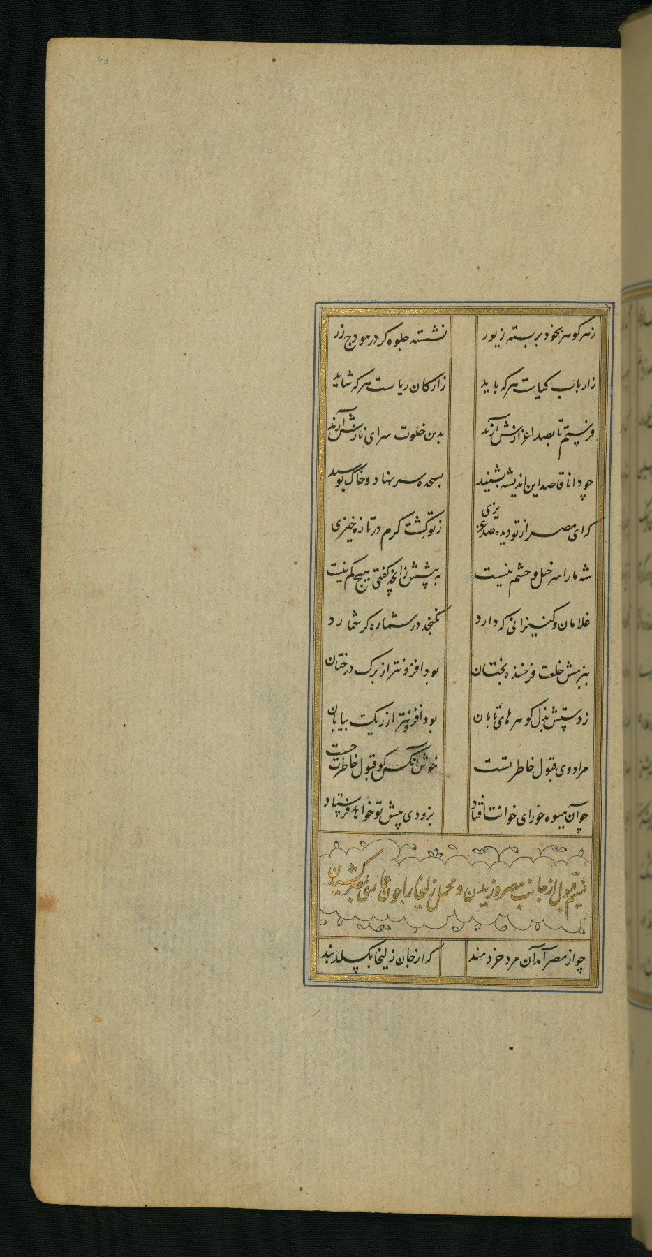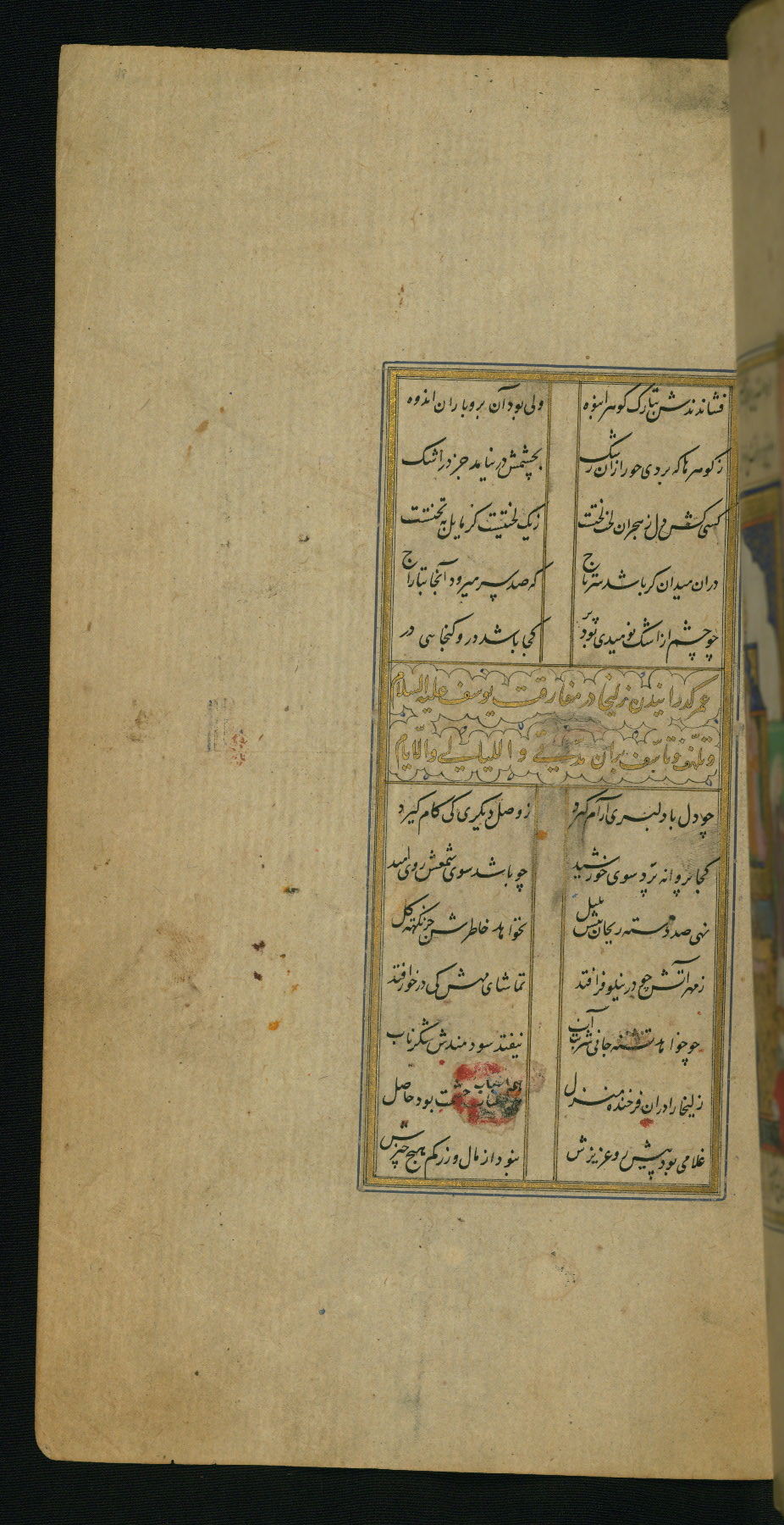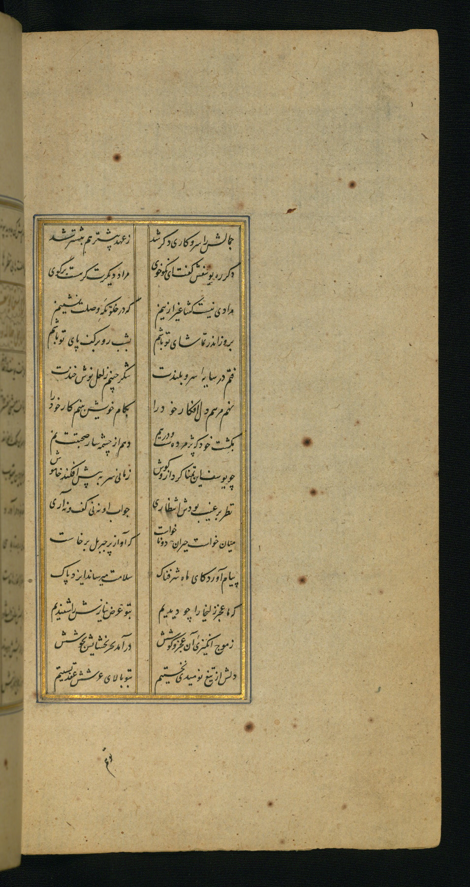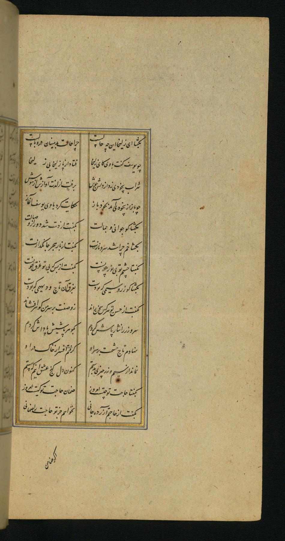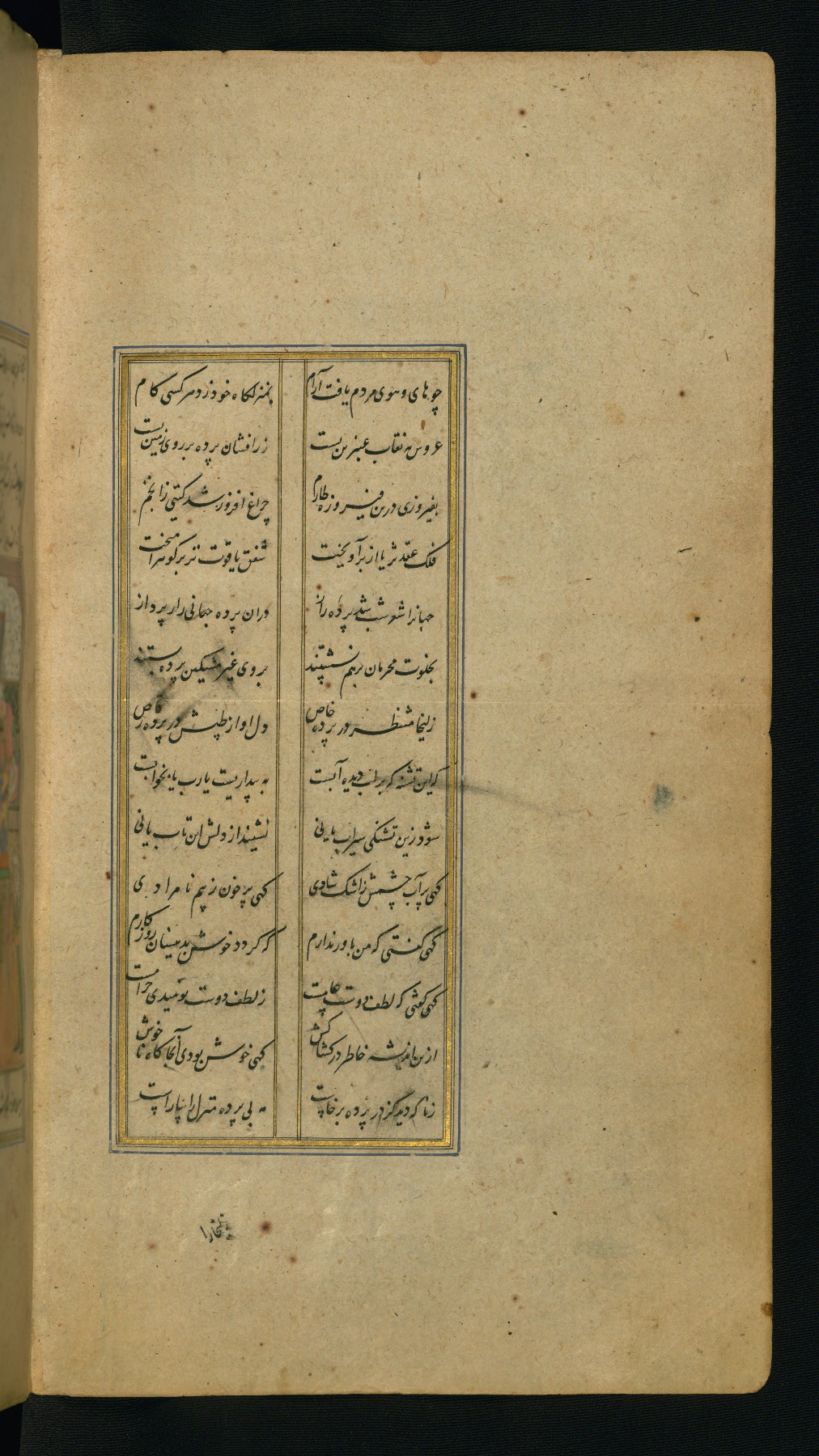 This is an illustrated and illuminated Safavid copy of Joseph (Yūsuf) and Zulaykhā by Nūr al-Dīn Jāmī (d. 898 AH / 1492 CE), executed in Iran in the early tenth century AH / sixteenth CE. The codex opens with a double-page illuminated incipit (fols. 1b-2a) containing the first verses of the work, the title, and the author's name. There are eight paintings illustrating the text. The binding is slightly later than the manuscript.