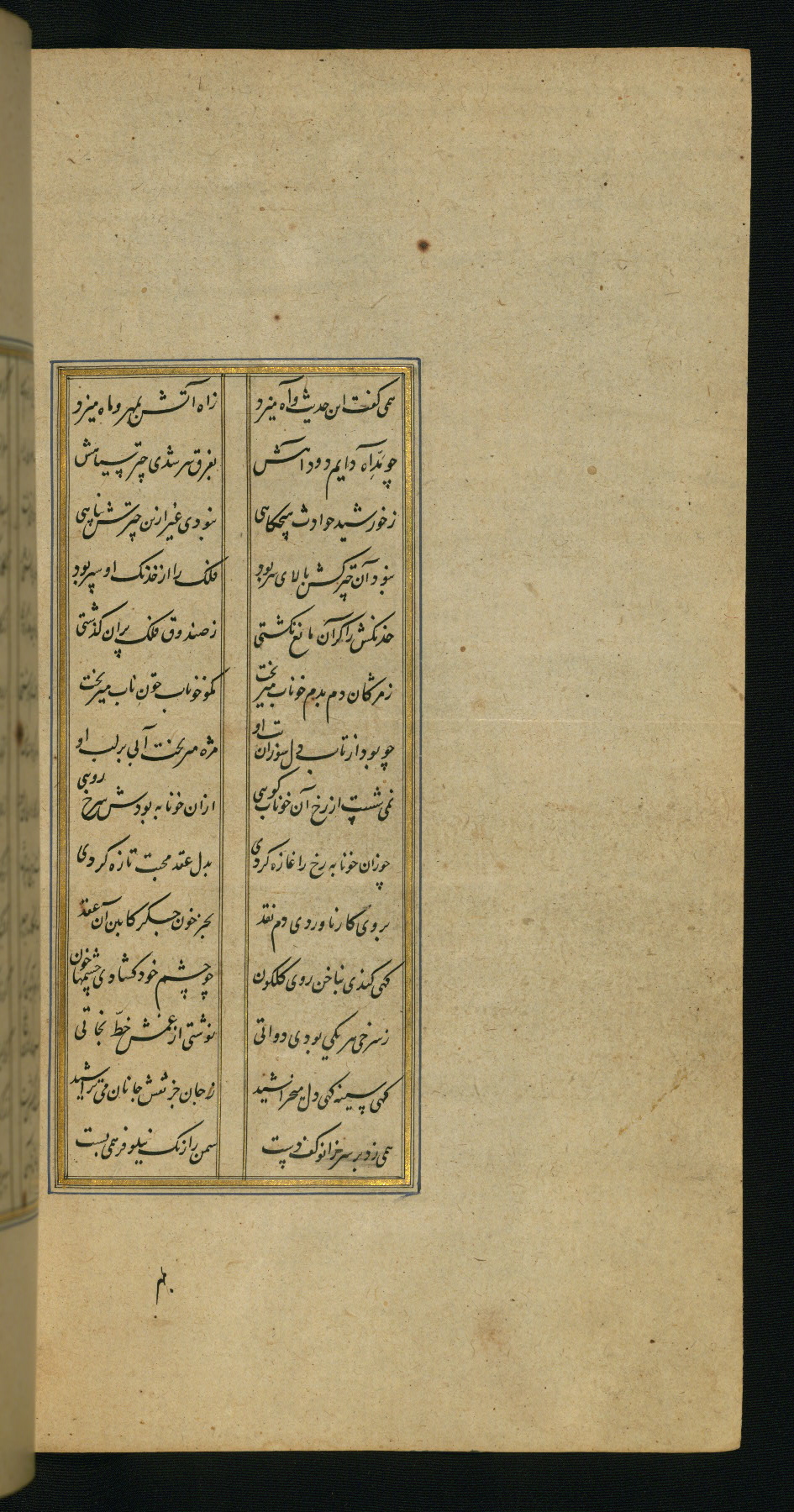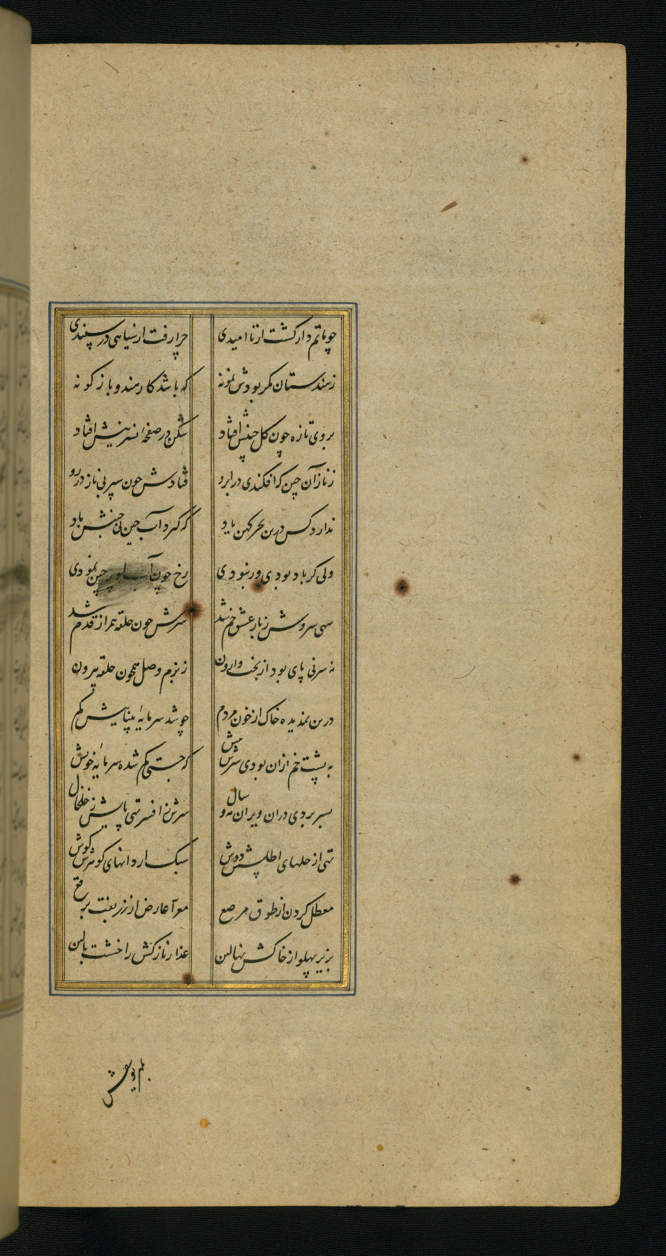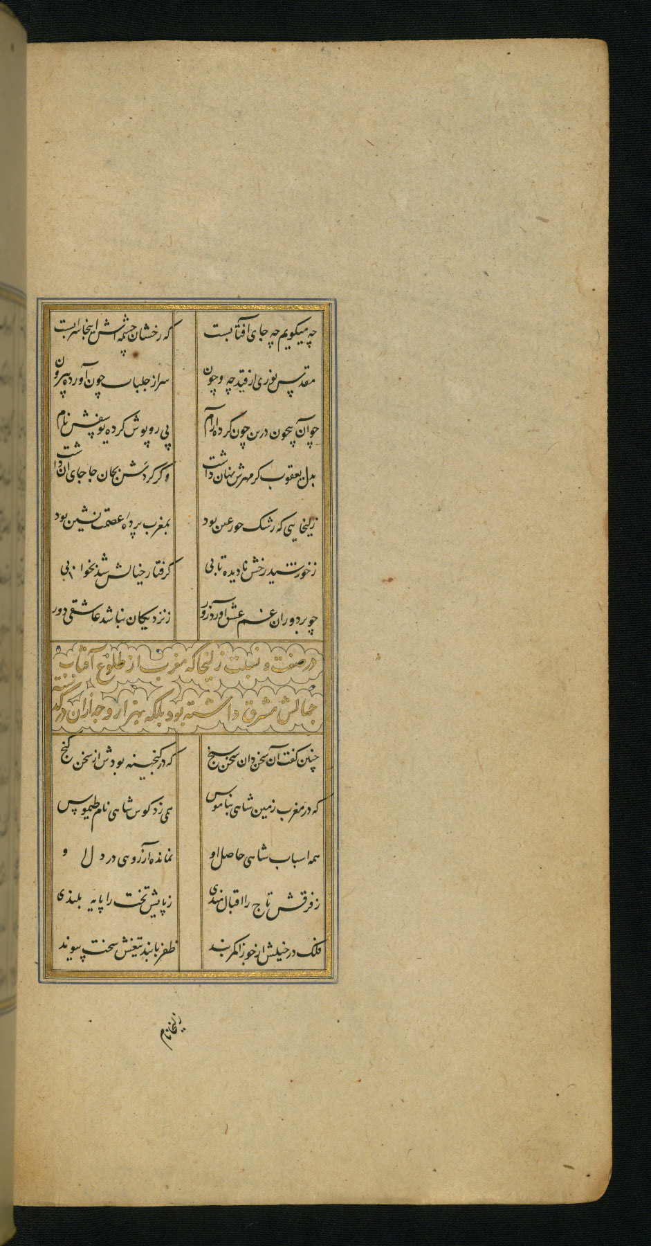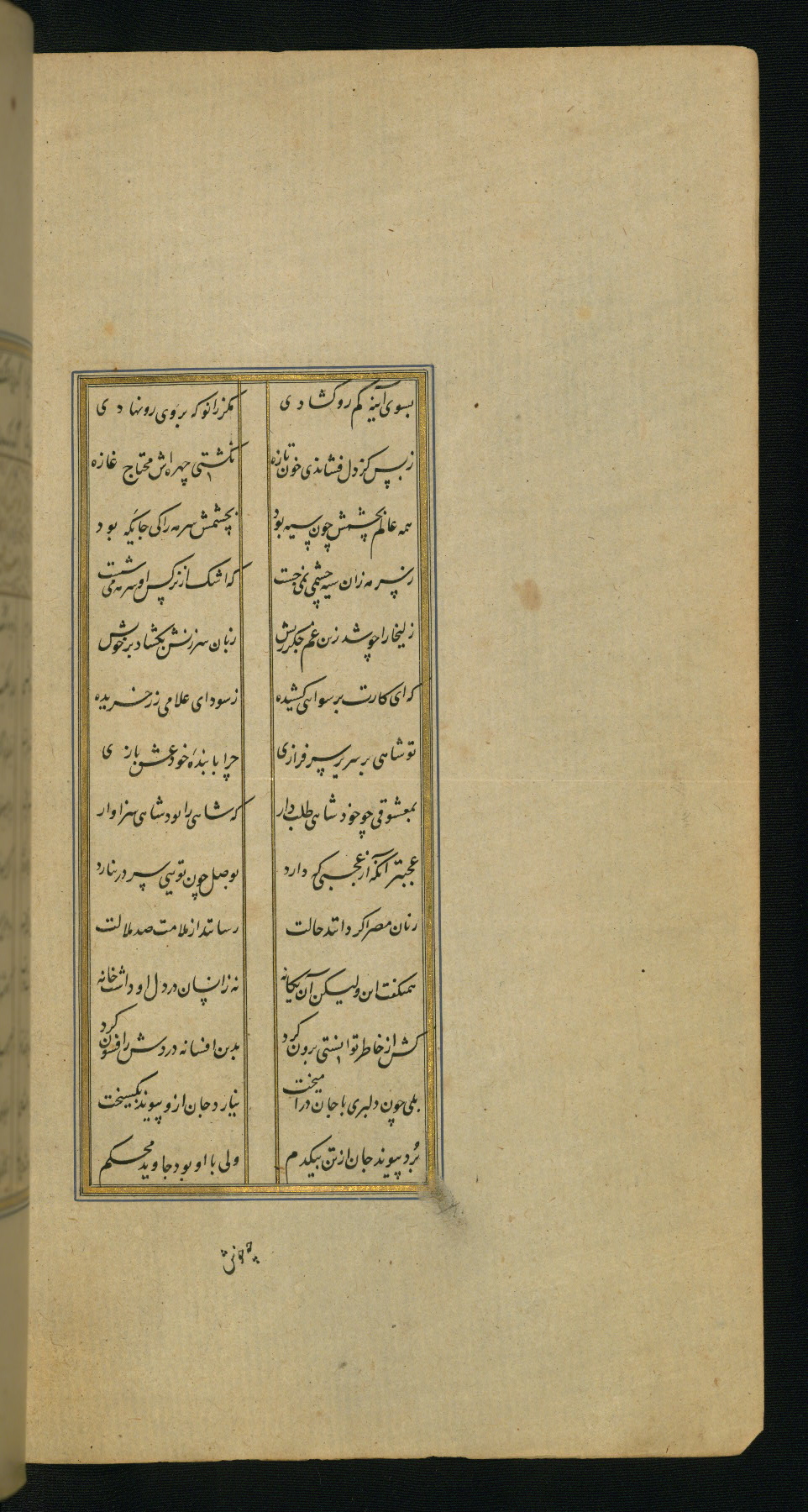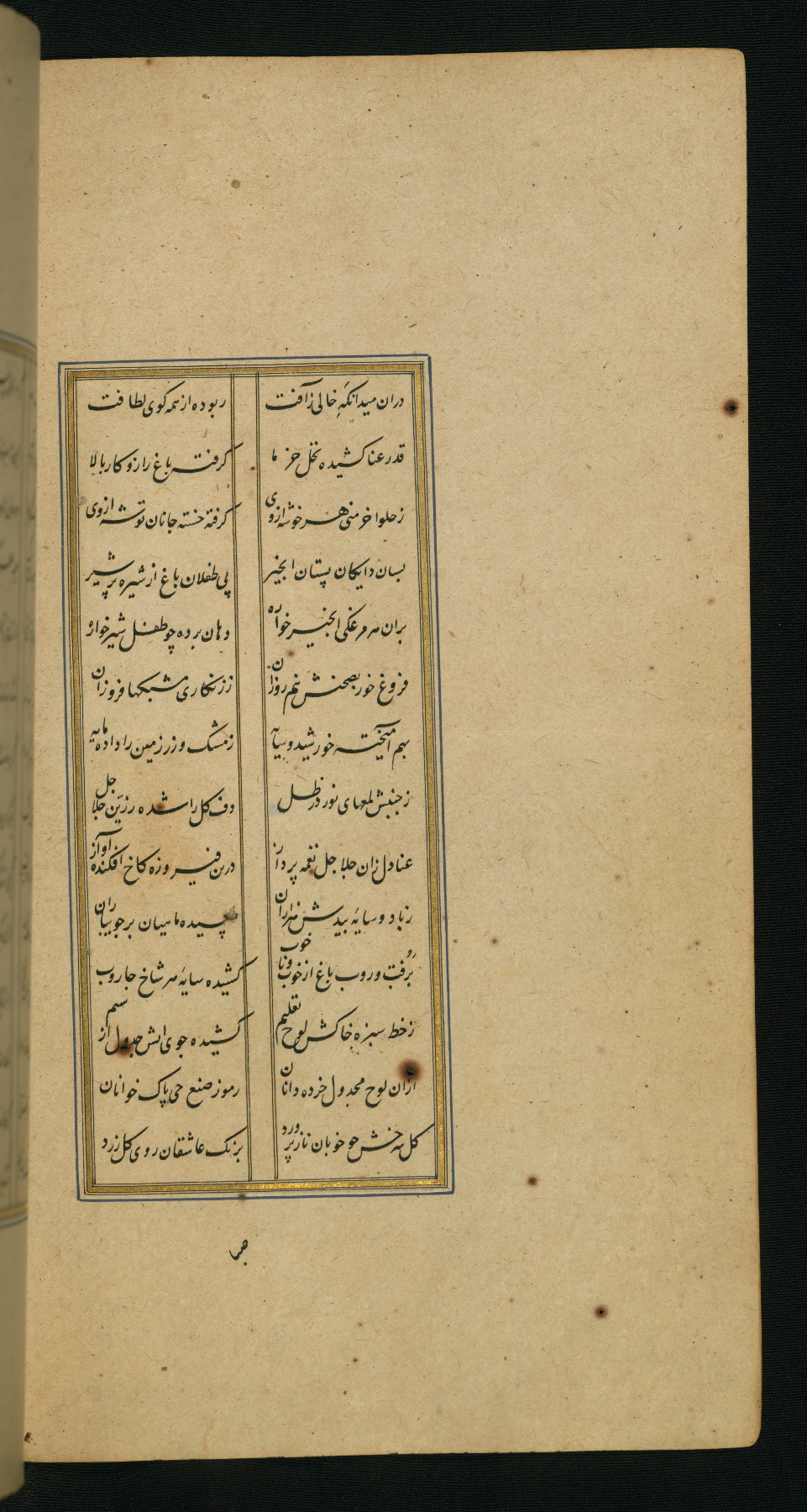 This is an illustrated and illuminated Safavid copy of Joseph (Yūsuf) and Zulaykhā by Nūr al-Dīn Jāmī (d. 898 AH / 1492 CE), executed in Iran in the early tenth century AH / sixteenth CE. The codex opens with a double-page illuminated incipit (fols. 1b-2a) containing the first verses of the work, the title, and the author's name. There are eight paintings illustrating the text. The binding is slightly later than the manuscript.