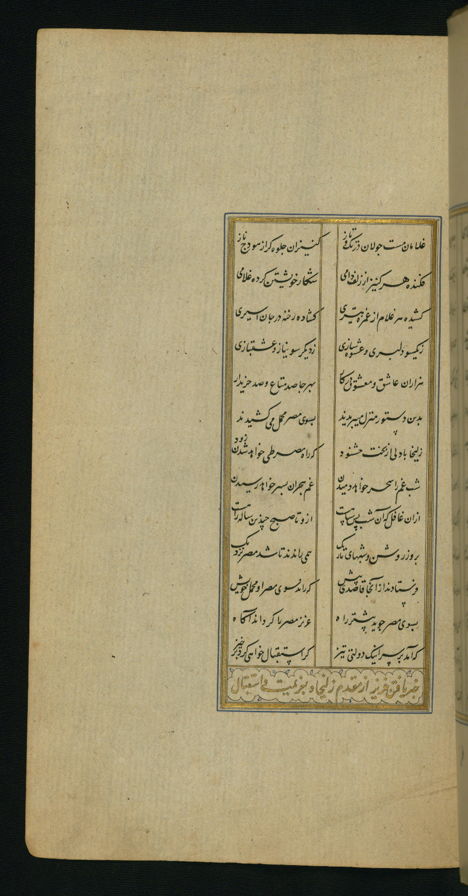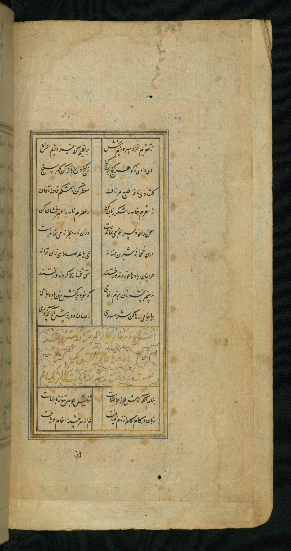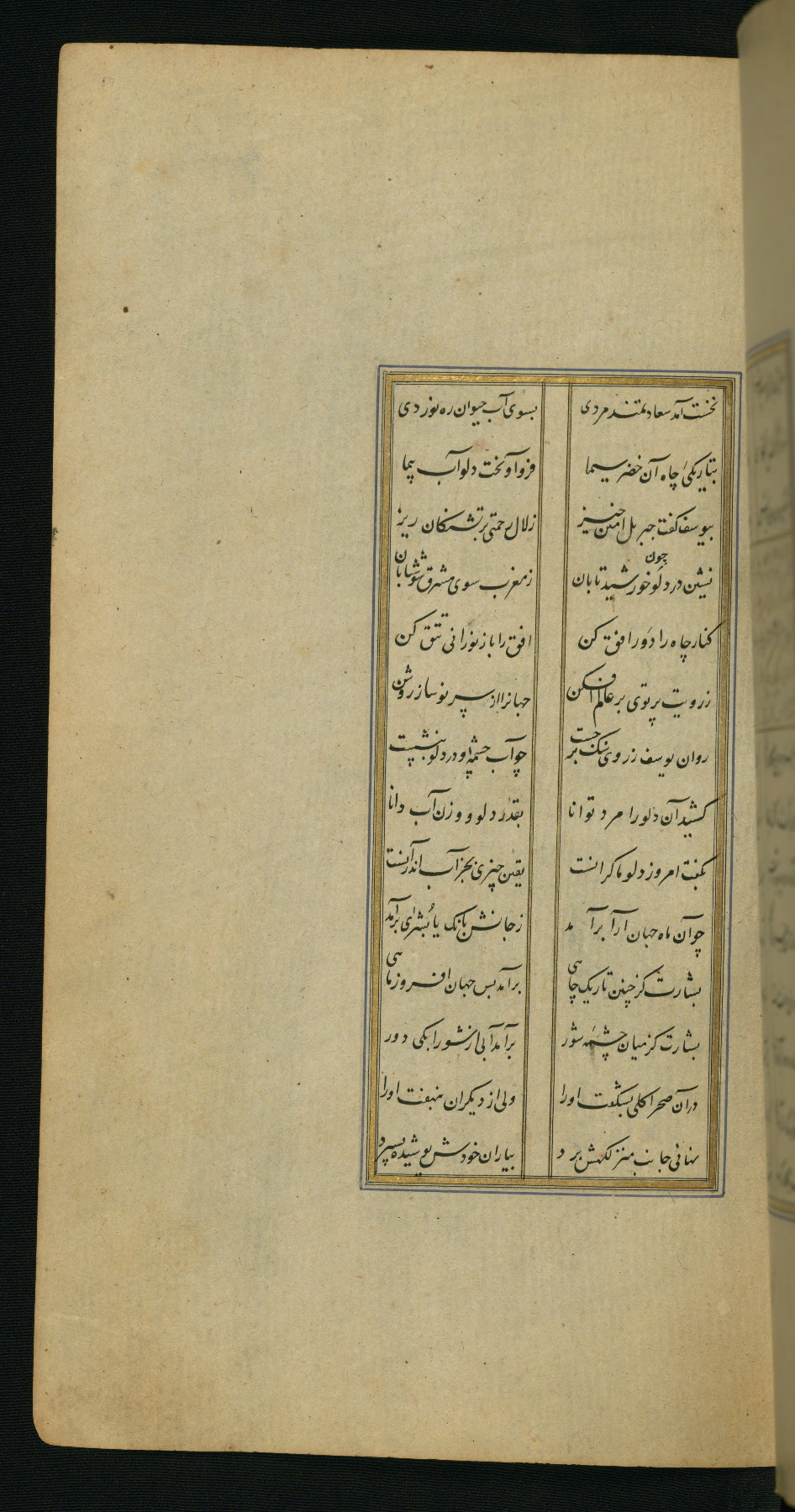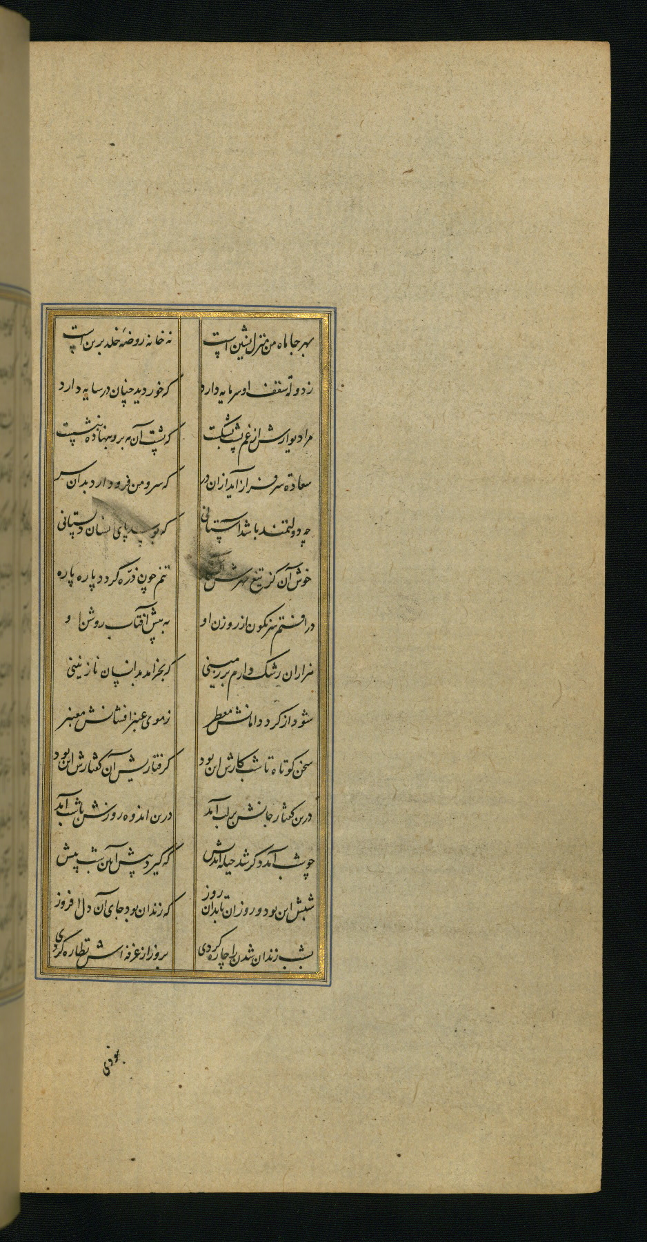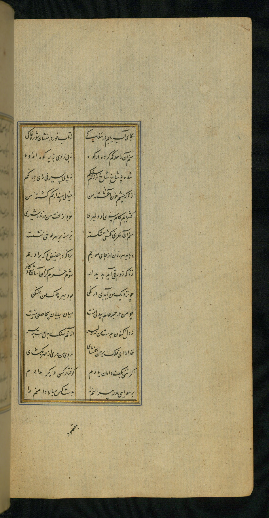 This is an illustrated and illuminated Safavid copy of Joseph (Yūsuf) and Zulaykhā by Nūr al-Dīn Jāmī (d. 898 AH / 1492 CE), executed in Iran in the early tenth century AH / sixteenth CE. The codex opens with a double-page illuminated incipit (fols. 1b-2a) containing the first verses of the work, the title, and the author's name. There are eight paintings illustrating the text. The binding is slightly later than the manuscript.