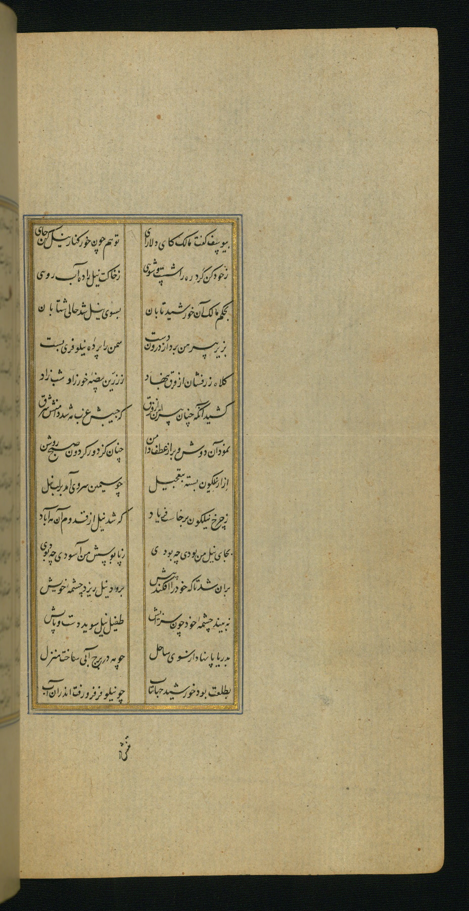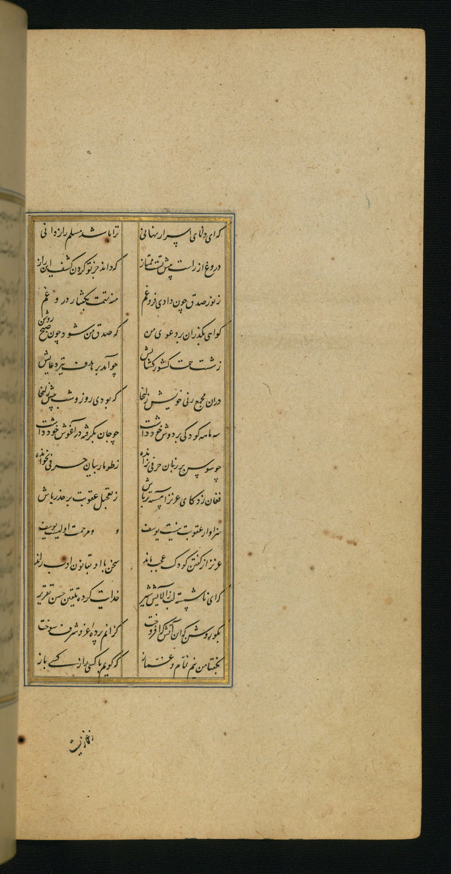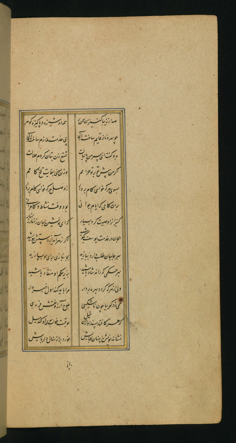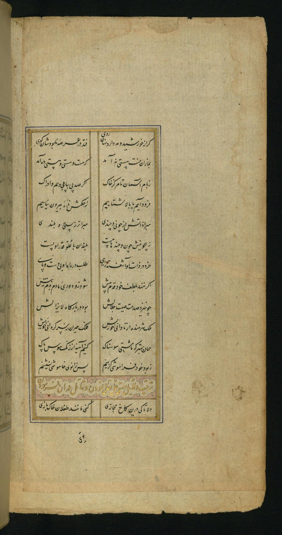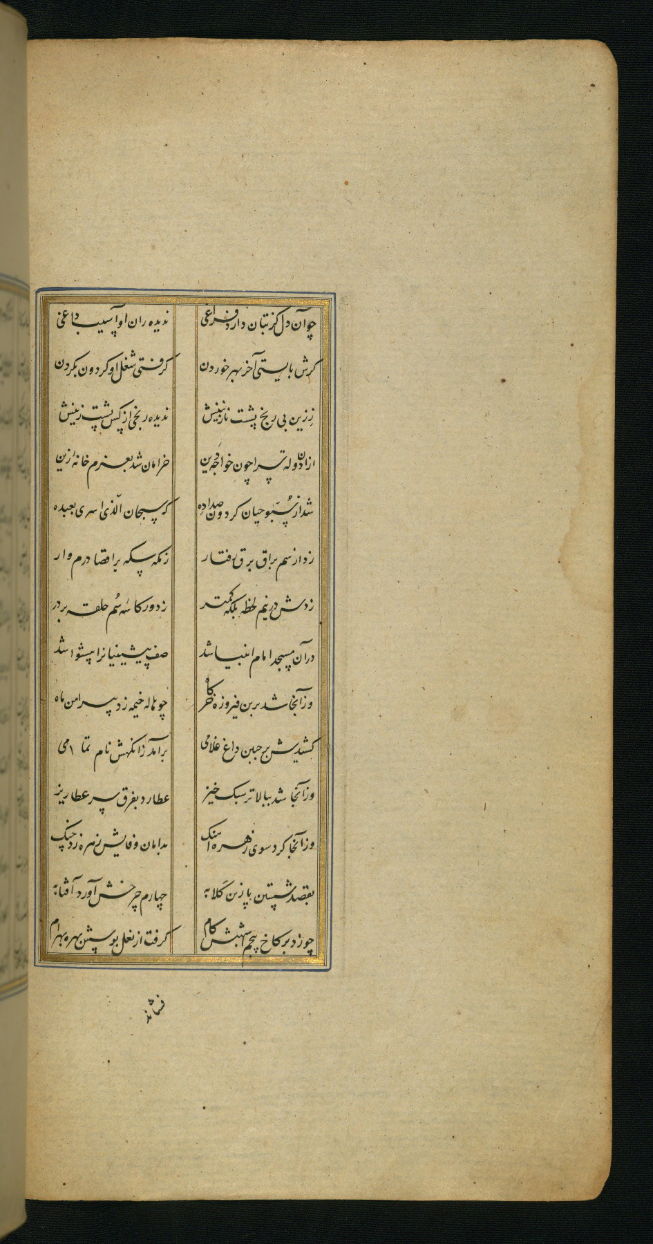 This is an illustrated and illuminated Safavid copy of Joseph (Yūsuf) and Zulaykhā by Nūr al-Dīn Jāmī (d. 898 AH / 1492 CE), executed in Iran in the early tenth century AH / sixteenth CE. The codex opens with a double-page illuminated incipit (fols. 1b-2a) containing the first verses of the work, the title, and the author's name. There are eight paintings illustrating the text. The binding is slightly later than the manuscript.