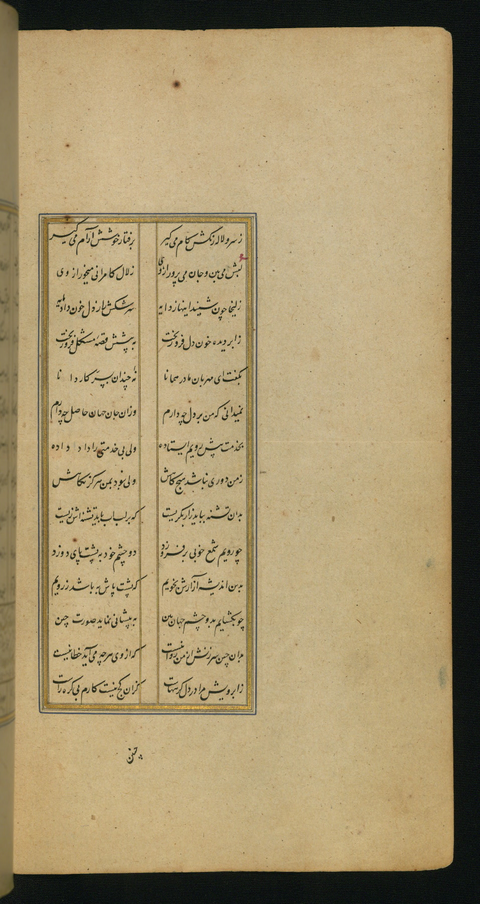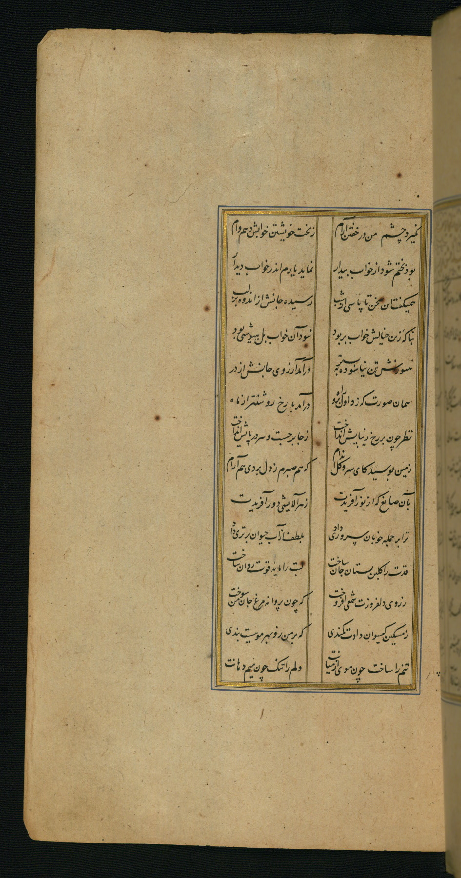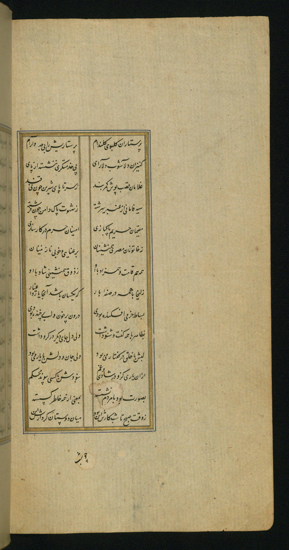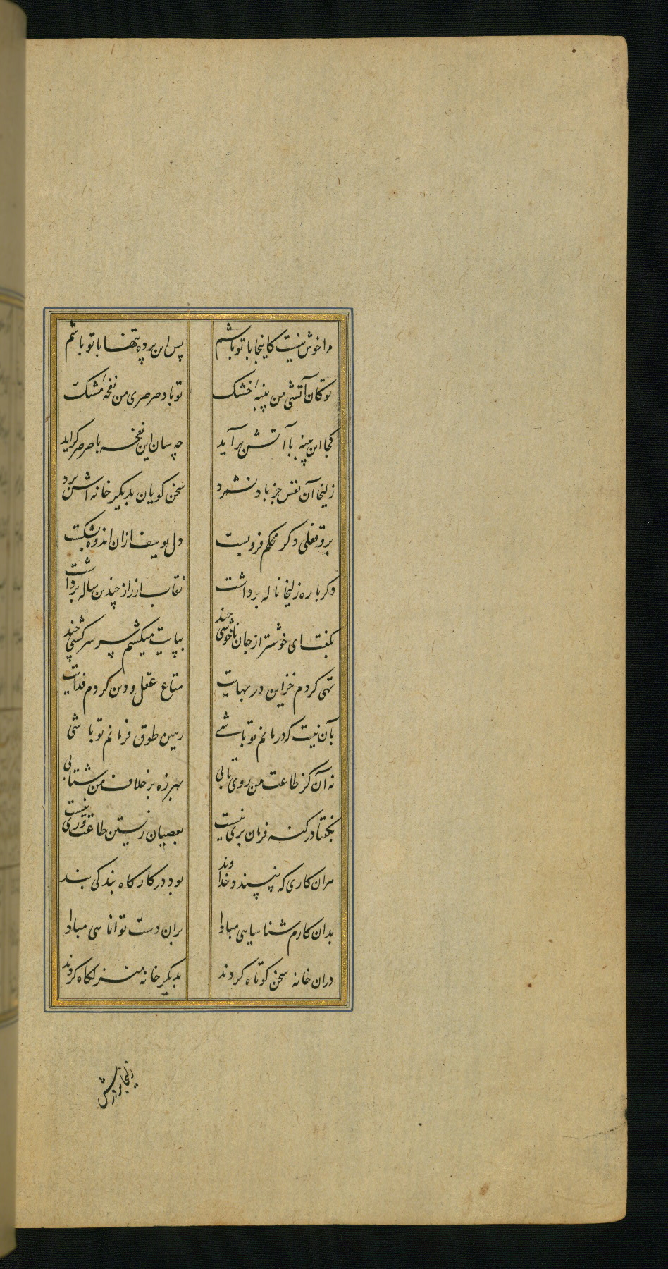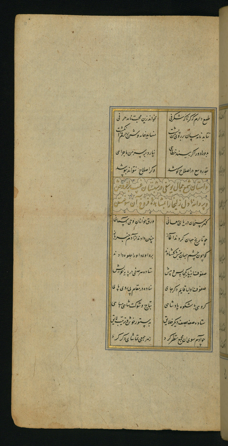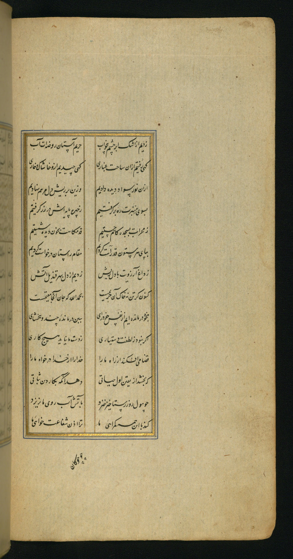 This is an illustrated and illuminated Safavid copy of Joseph (Yūsuf) and Zulaykhā by Nūr al-Dīn Jāmī (d. 898 AH / 1492 CE), executed in Iran in the early tenth century AH / sixteenth CE. The codex opens with a double-page illuminated incipit (fols. 1b-2a) containing the first verses of the work, the title, and the author's name. There are eight paintings illustrating the text. The binding is slightly later than the manuscript.