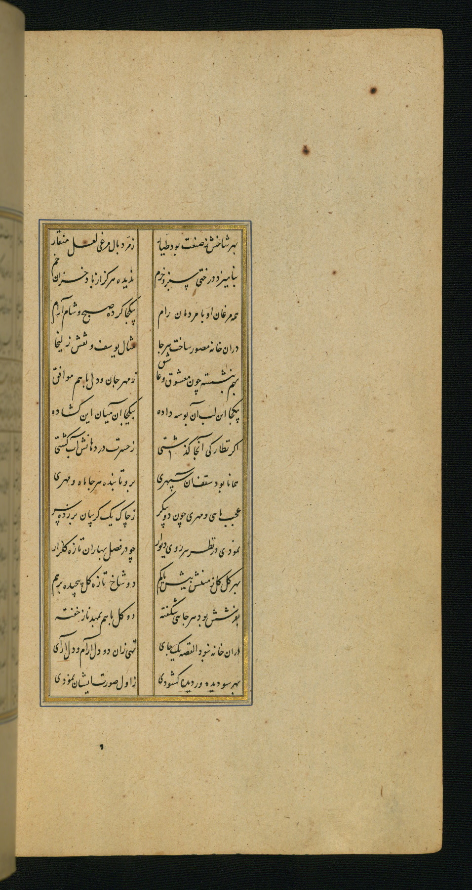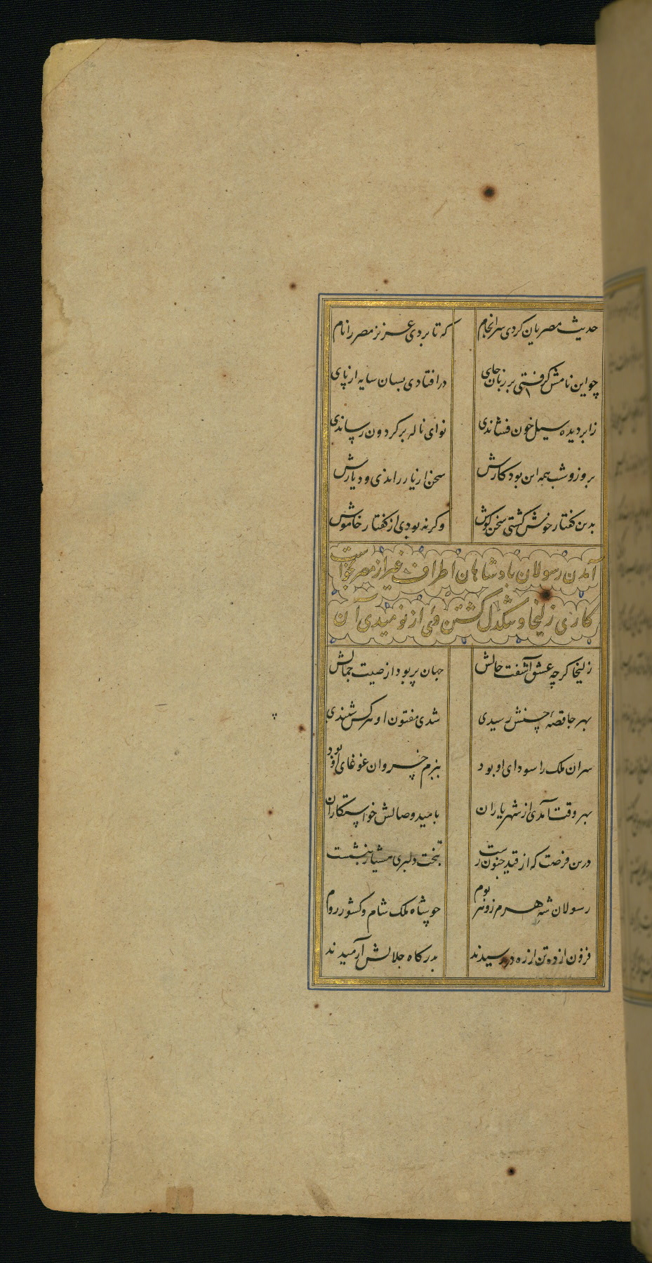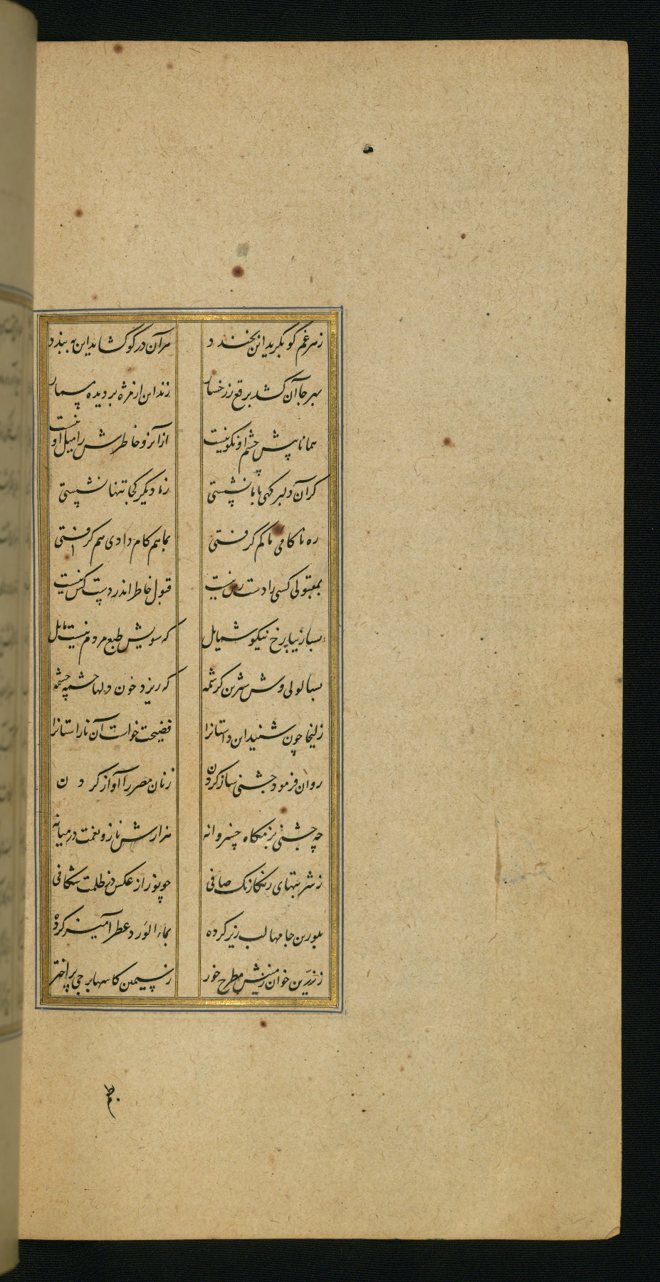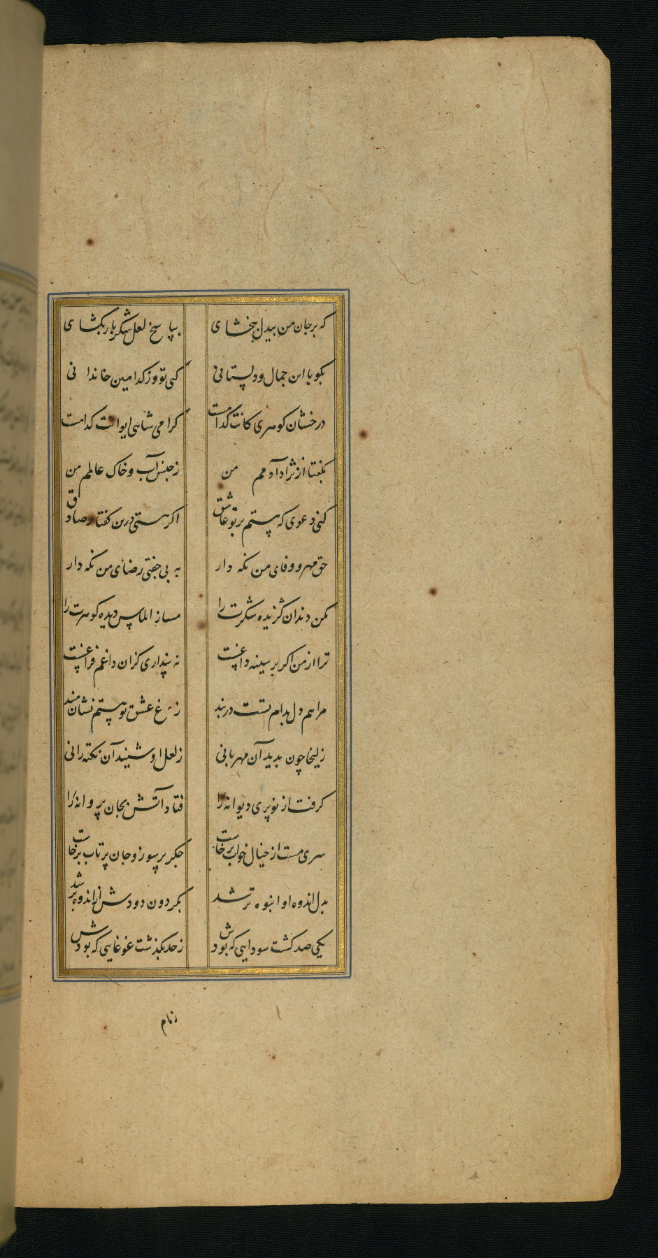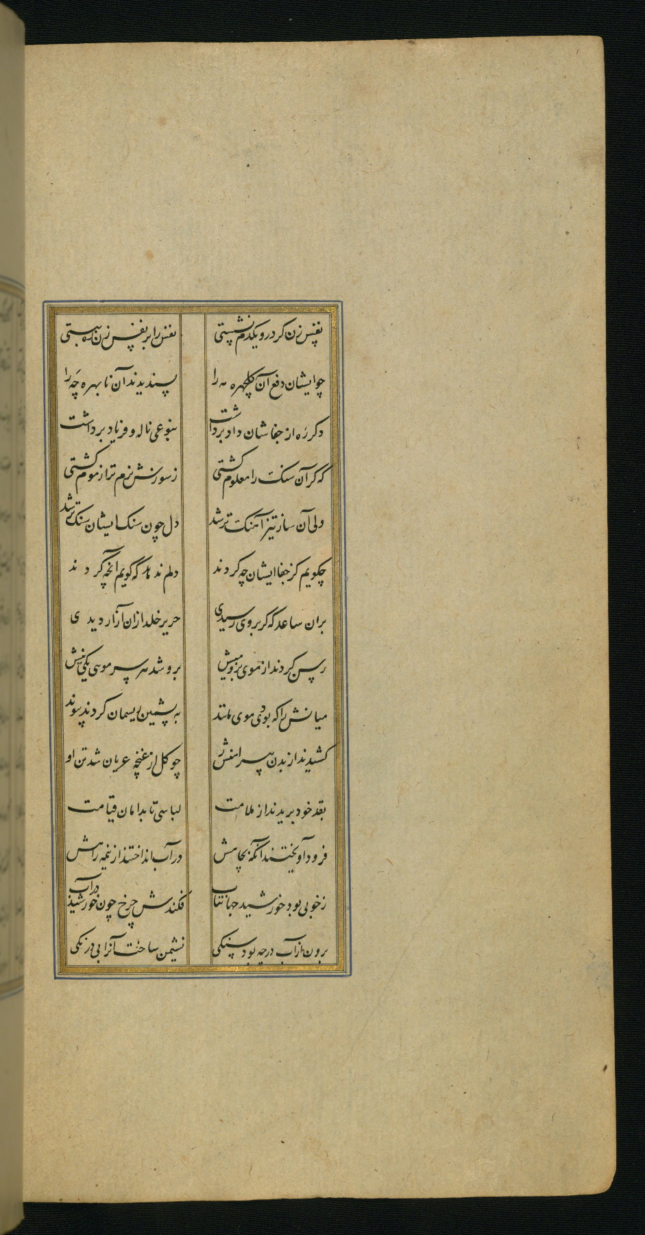 This is an illustrated and illuminated Safavid copy of Joseph (Yūsuf) and Zulaykhā by Nūr al-Dīn Jāmī (d. 898 AH / 1492 CE), executed in Iran in the early tenth century AH / sixteenth CE. The codex opens with a double-page illuminated incipit (fols. 1b-2a) containing the first verses of the work, the title, and the author's name. There are eight paintings illustrating the text. The binding is slightly later than the manuscript.