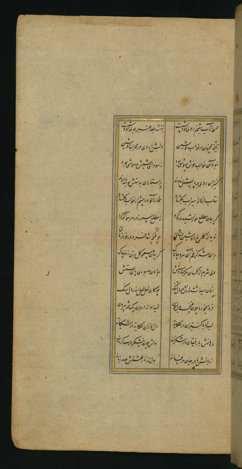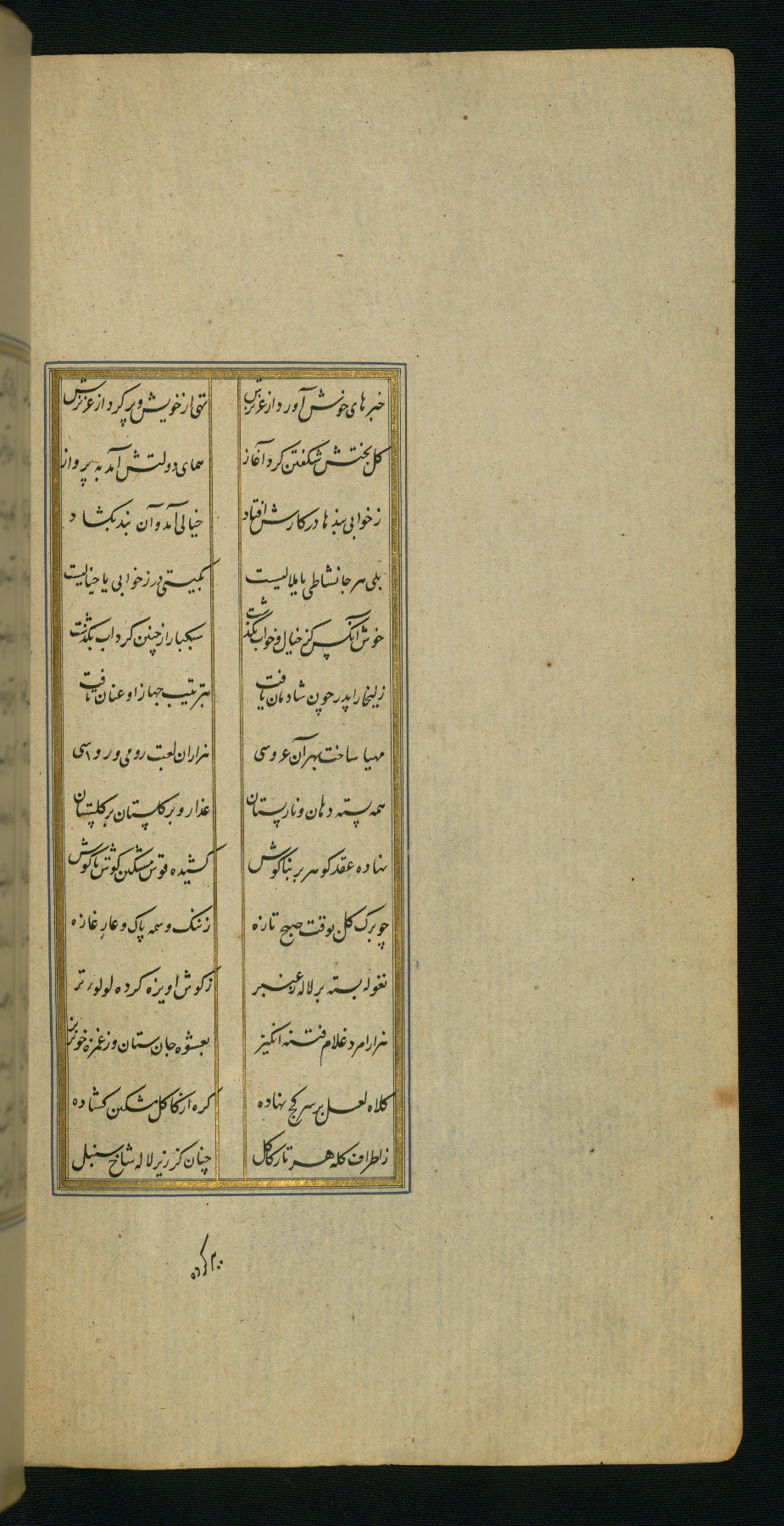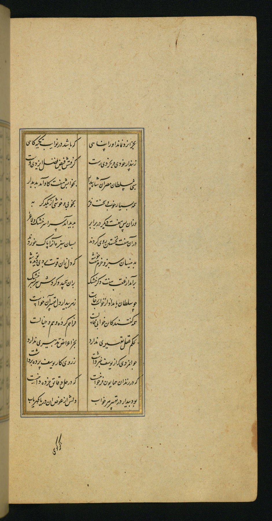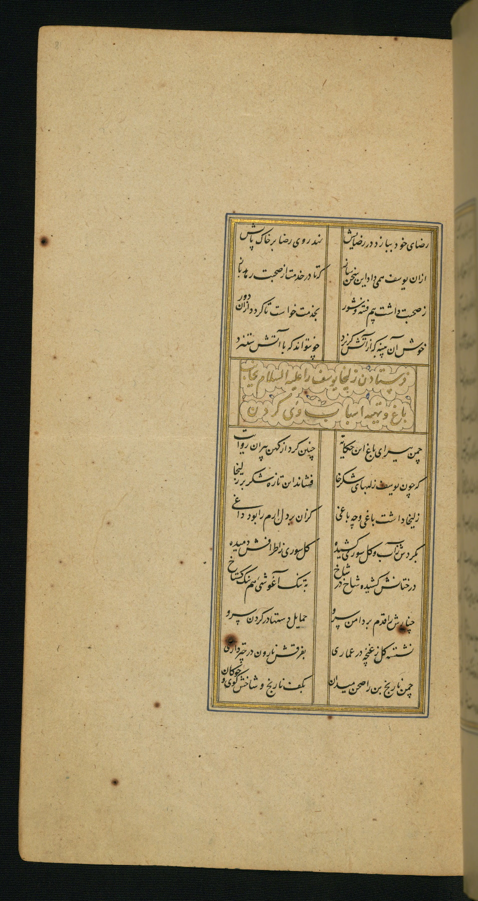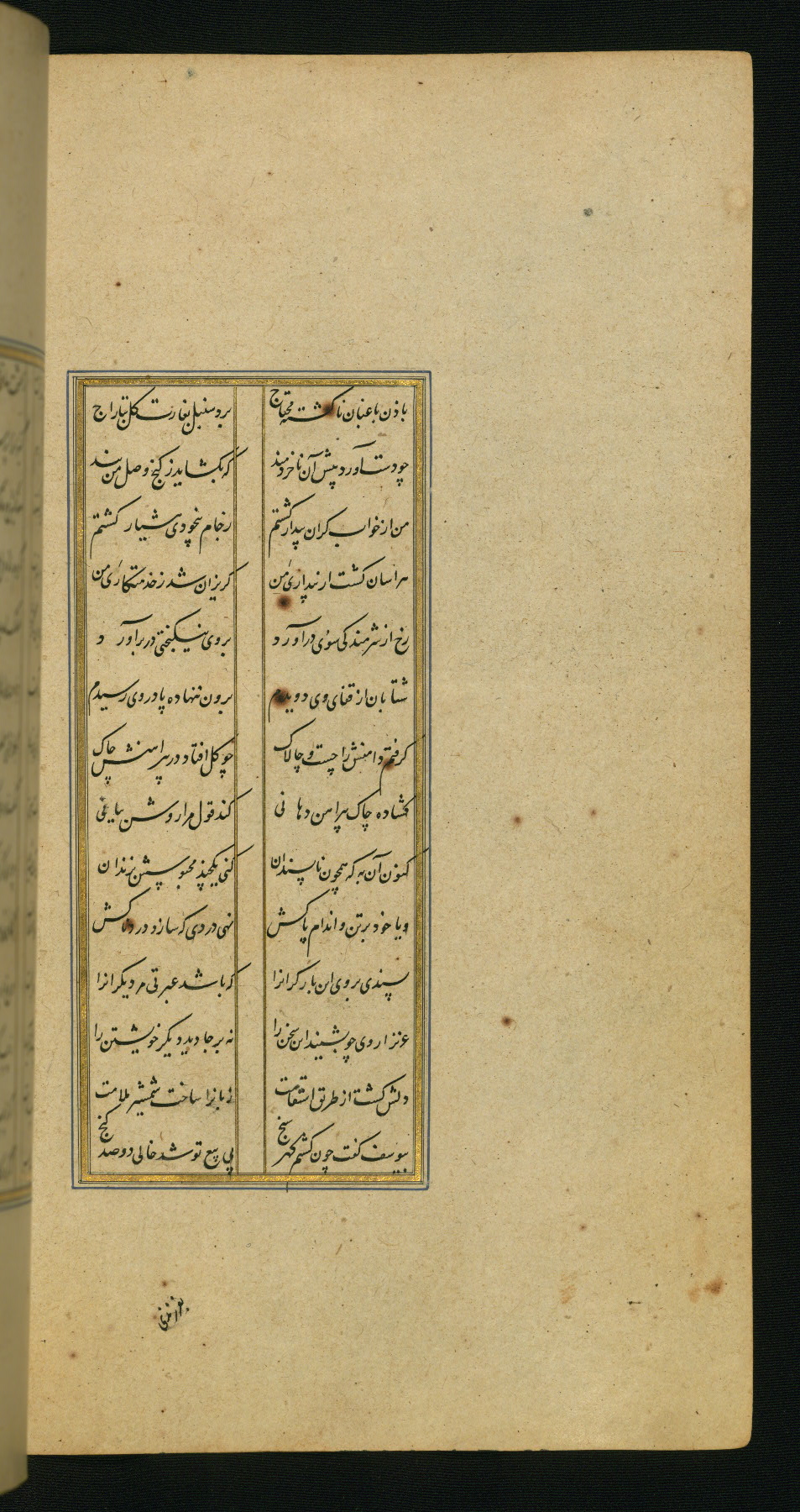 This is an illustrated and illuminated Safavid copy of Joseph (Yūsuf) and Zulaykhā by Nūr al-Dīn Jāmī (d. 898 AH / 1492 CE), executed in Iran in the early tenth century AH / sixteenth CE. The codex opens with a double-page illuminated incipit (fols. 1b-2a) containing the first verses of the work, the title, and the author's name. There are eight paintings illustrating the text. The binding is slightly later than the manuscript.