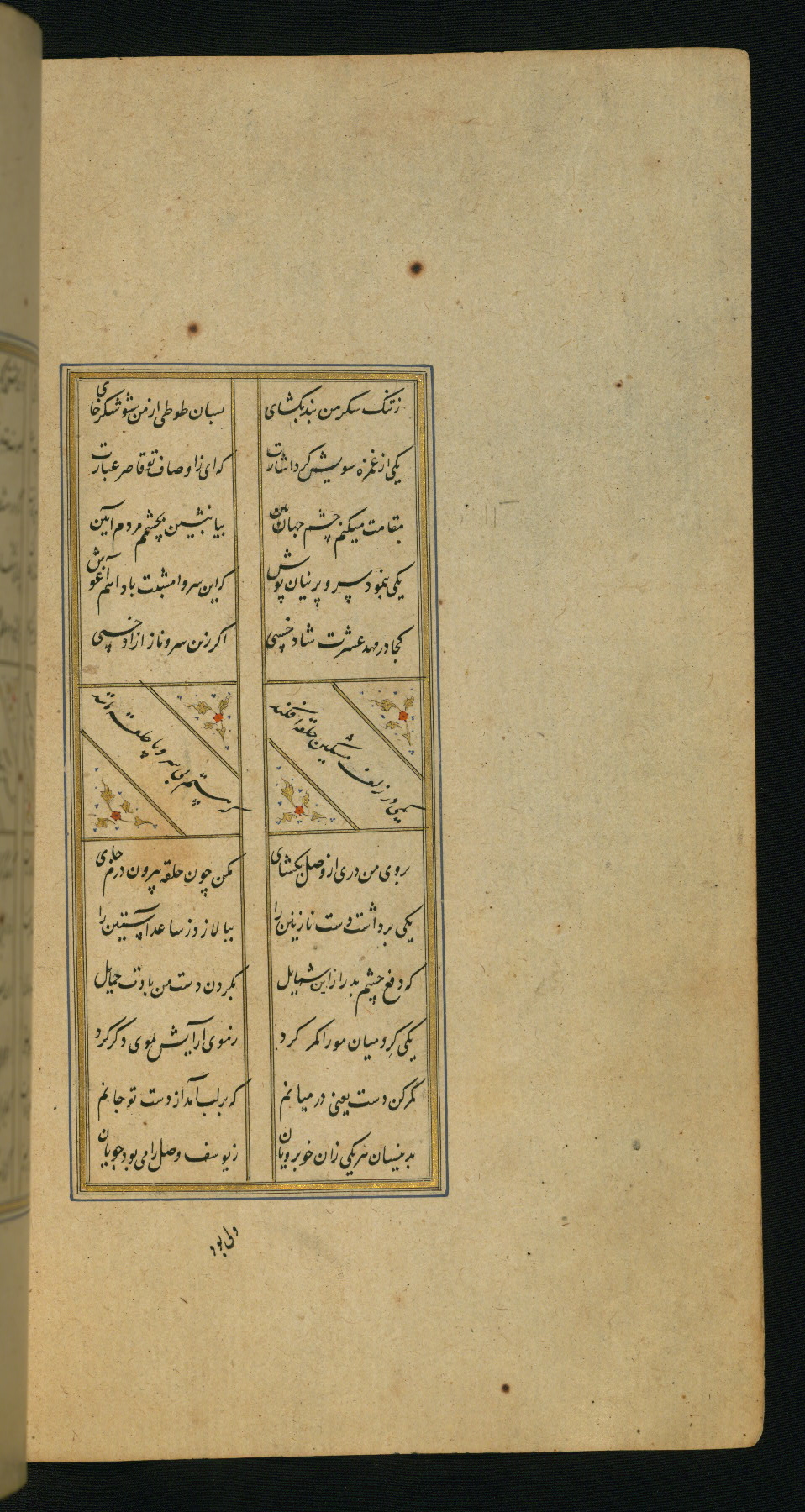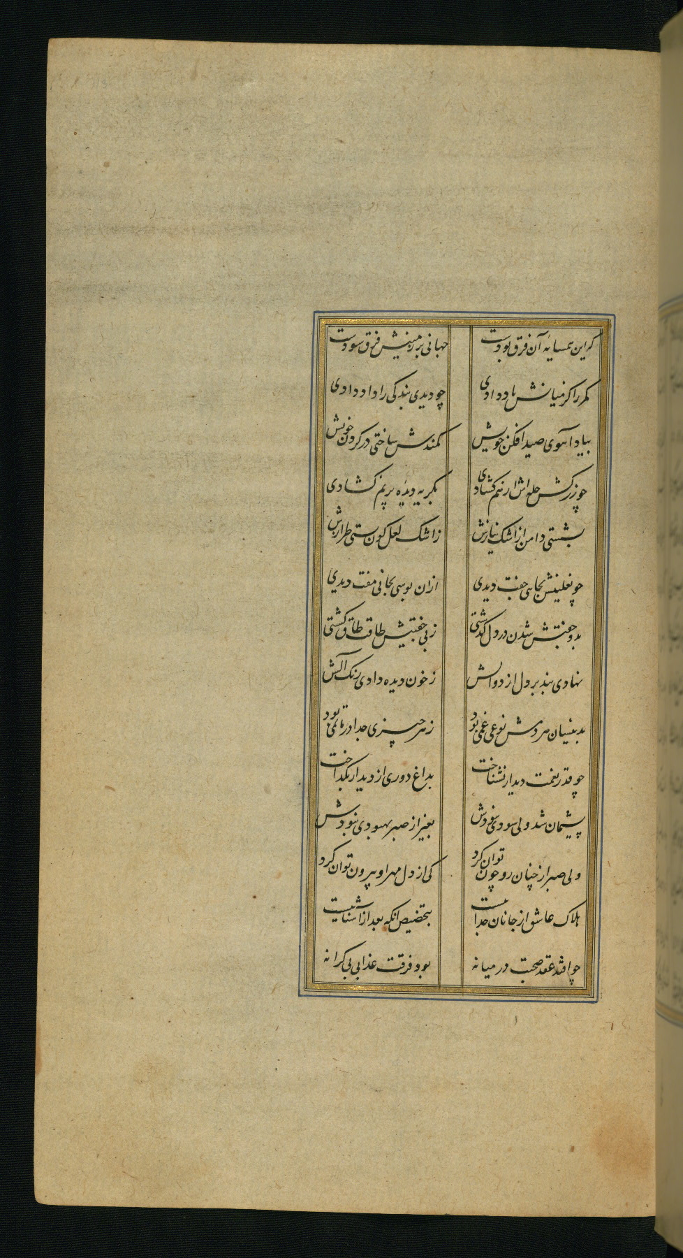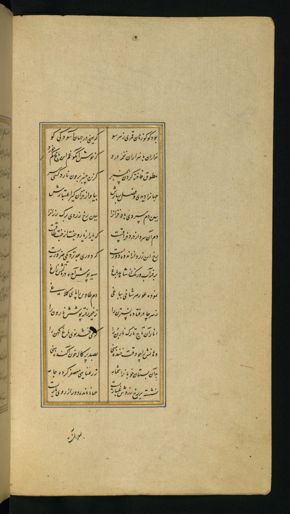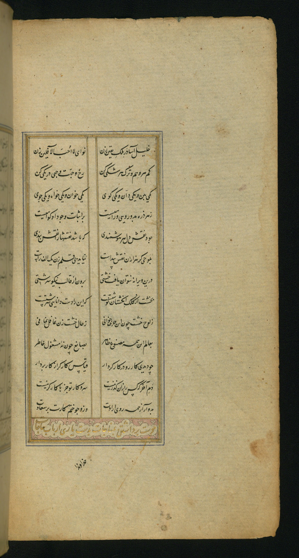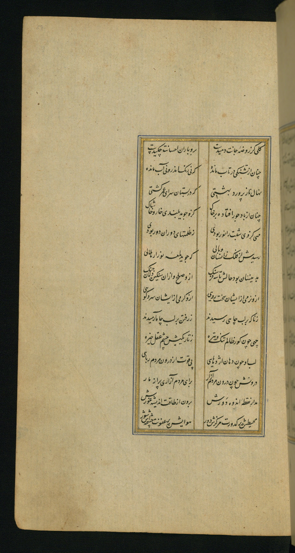 This is an illustrated and illuminated Safavid copy of Joseph (Yūsuf) and Zulaykhā by Nūr al-Dīn Jāmī (d. 898 AH / 1492 CE), executed in Iran in the early tenth century AH / sixteenth CE. The codex opens with a double-page illuminated incipit (fols. 1b-2a) containing the first verses of the work, the title, and the author's name. There are eight paintings illustrating the text. The binding is slightly later than the manuscript.