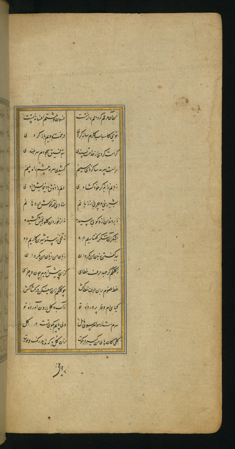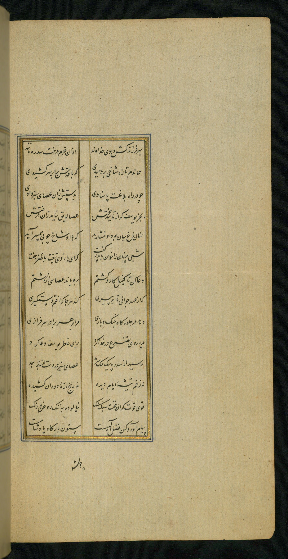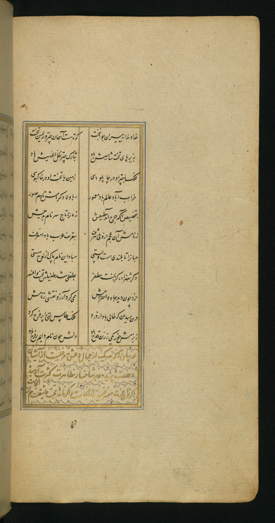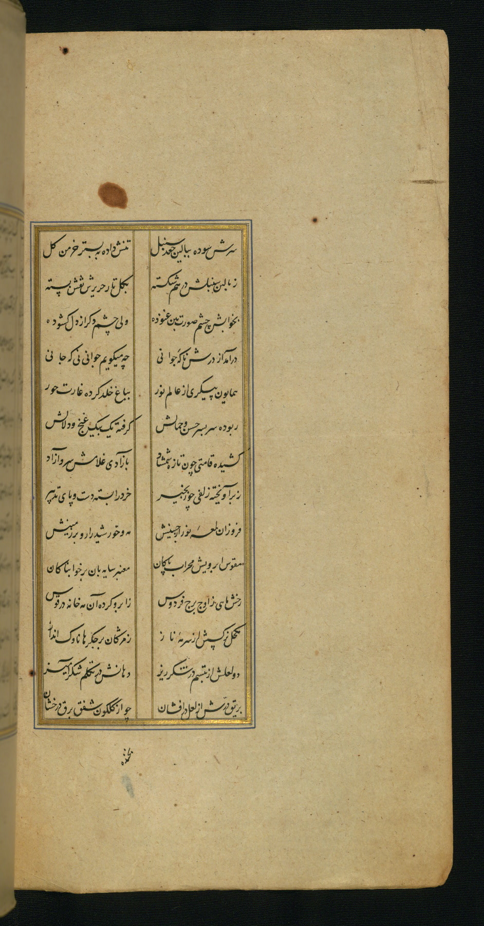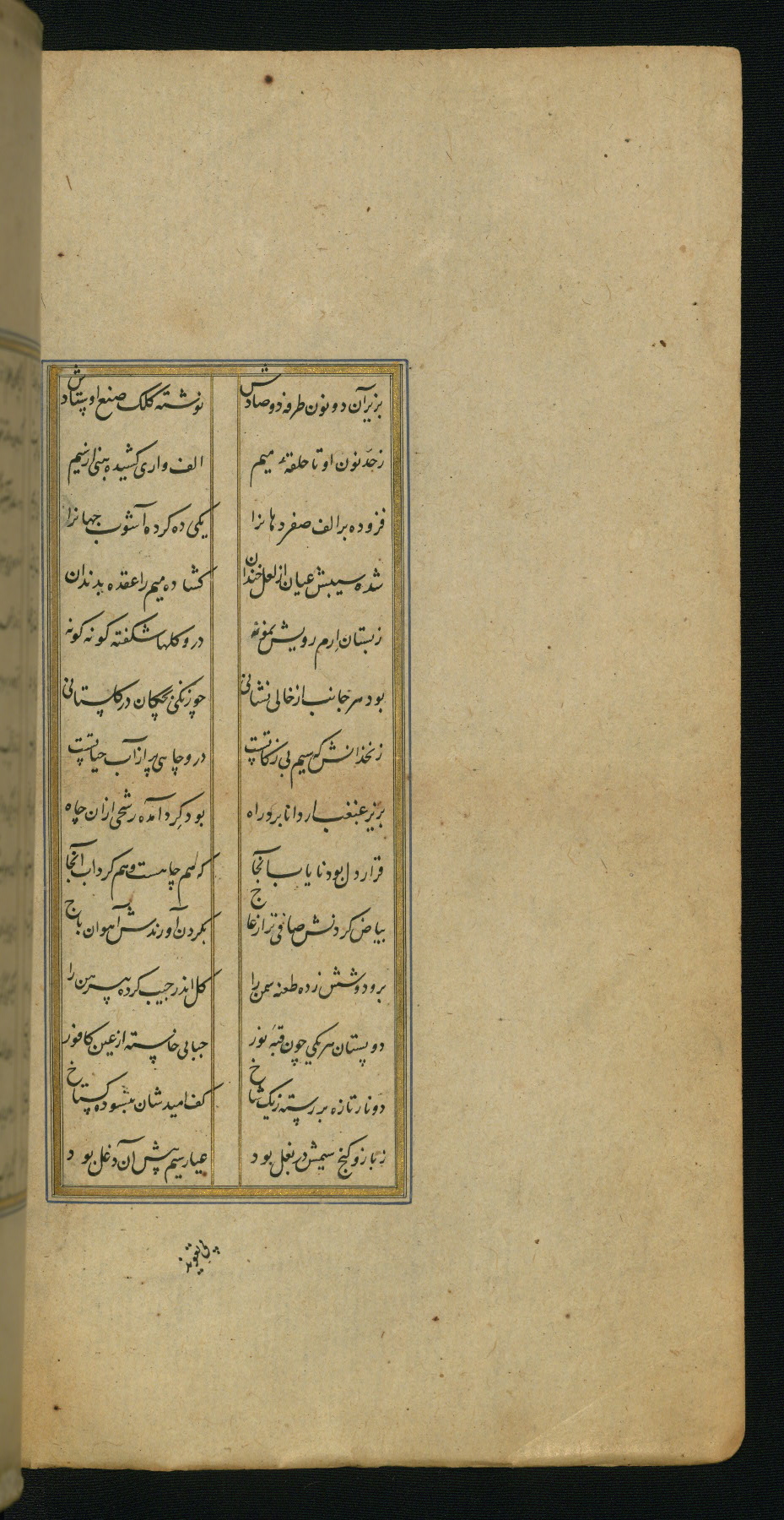 This is an illustrated and illuminated Safavid copy of Joseph (Yūsuf) and Zulaykhā by Nūr al-Dīn Jāmī (d. 898 AH / 1492 CE), executed in Iran in the early tenth century AH / sixteenth CE. The codex opens with a double-page illuminated incipit (fols. 1b-2a) containing the first verses of the work, the title, and the author's name. There are eight paintings illustrating the text. The binding is slightly later than the manuscript.