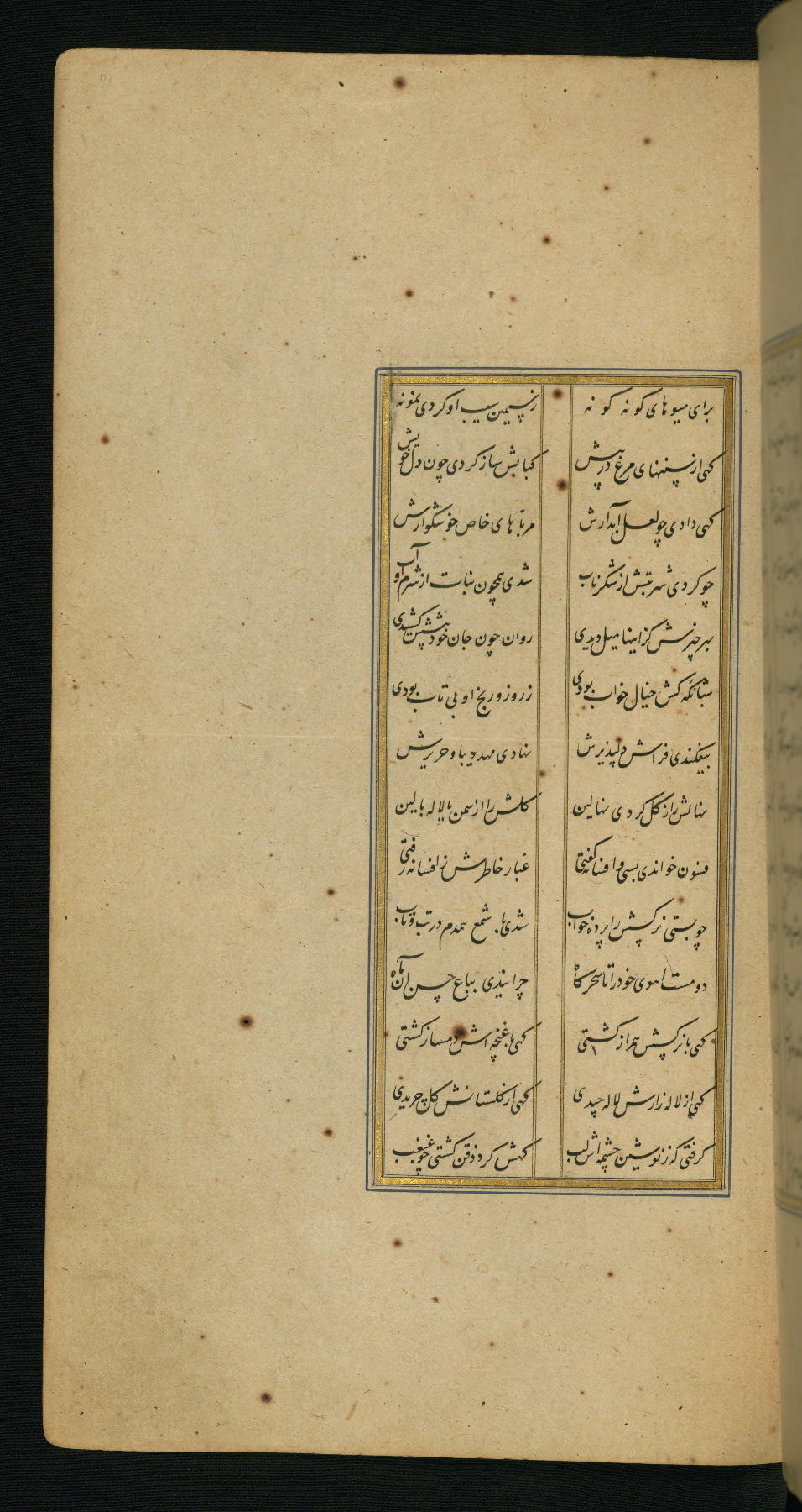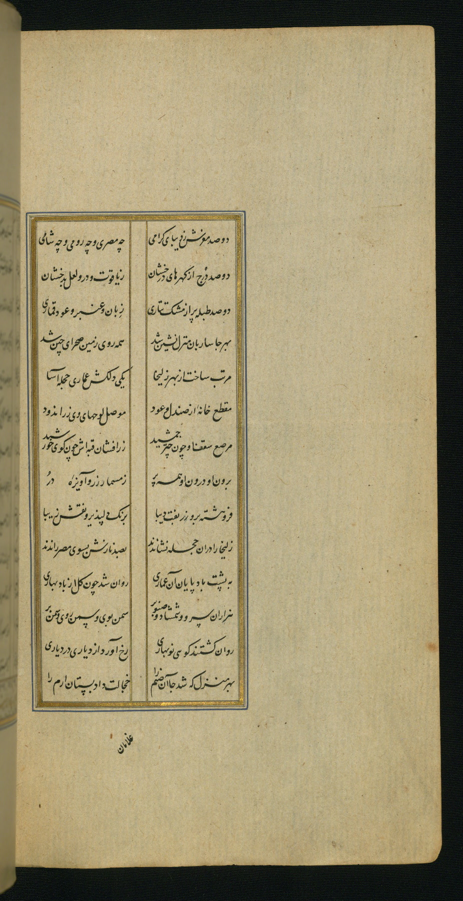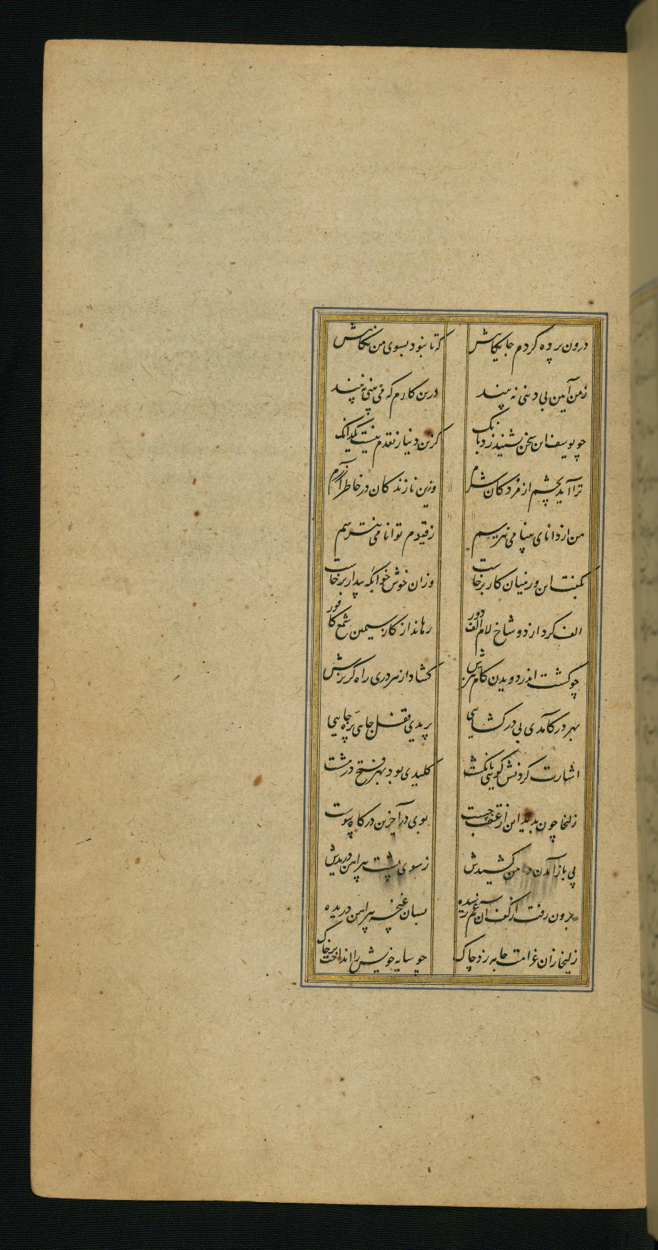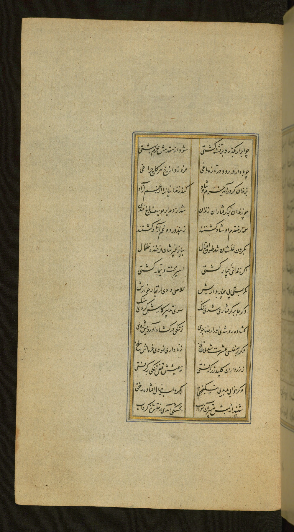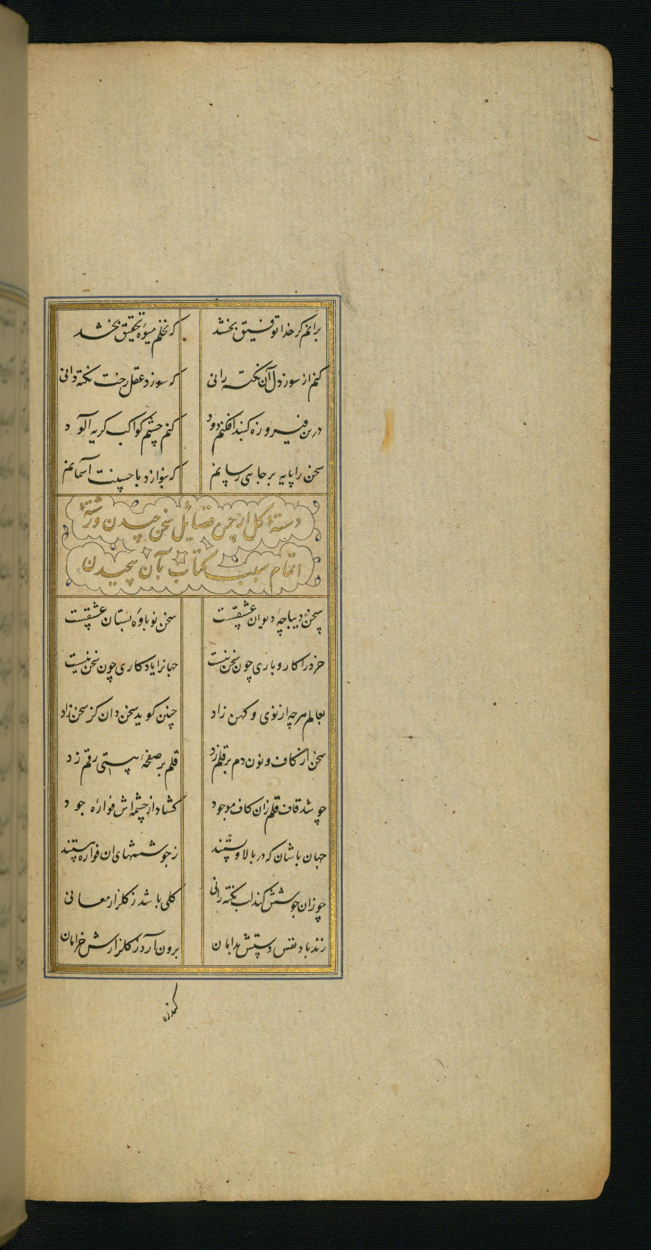 This is an illustrated and illuminated Safavid copy of Joseph (Yūsuf) and Zulaykhā by Nūr al-Dīn Jāmī (d. 898 AH / 1492 CE), executed in Iran in the early tenth century AH / sixteenth CE. The codex opens with a double-page illuminated incipit (fols. 1b-2a) containing the first verses of the work, the title, and the author's name. There are eight paintings illustrating the text. The binding is slightly later than the manuscript.