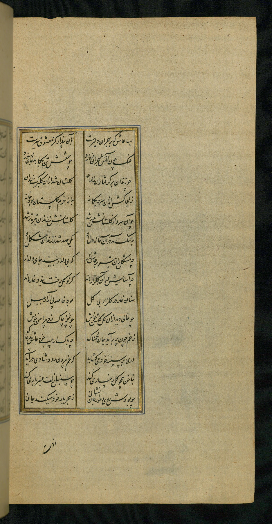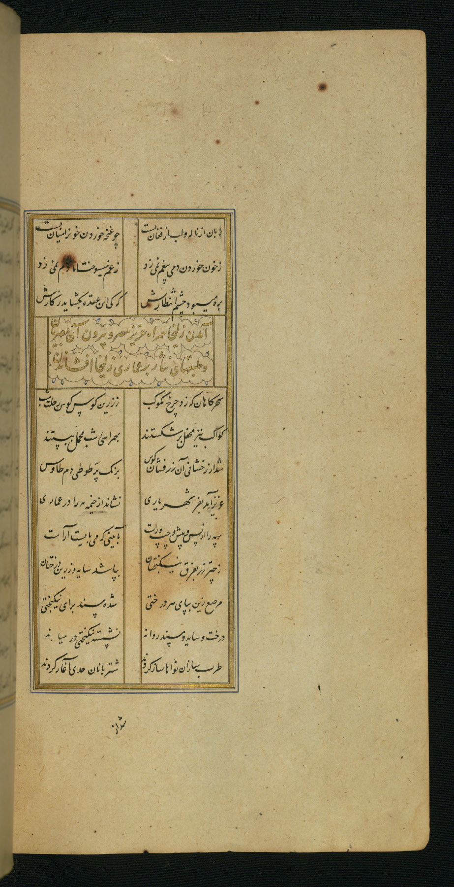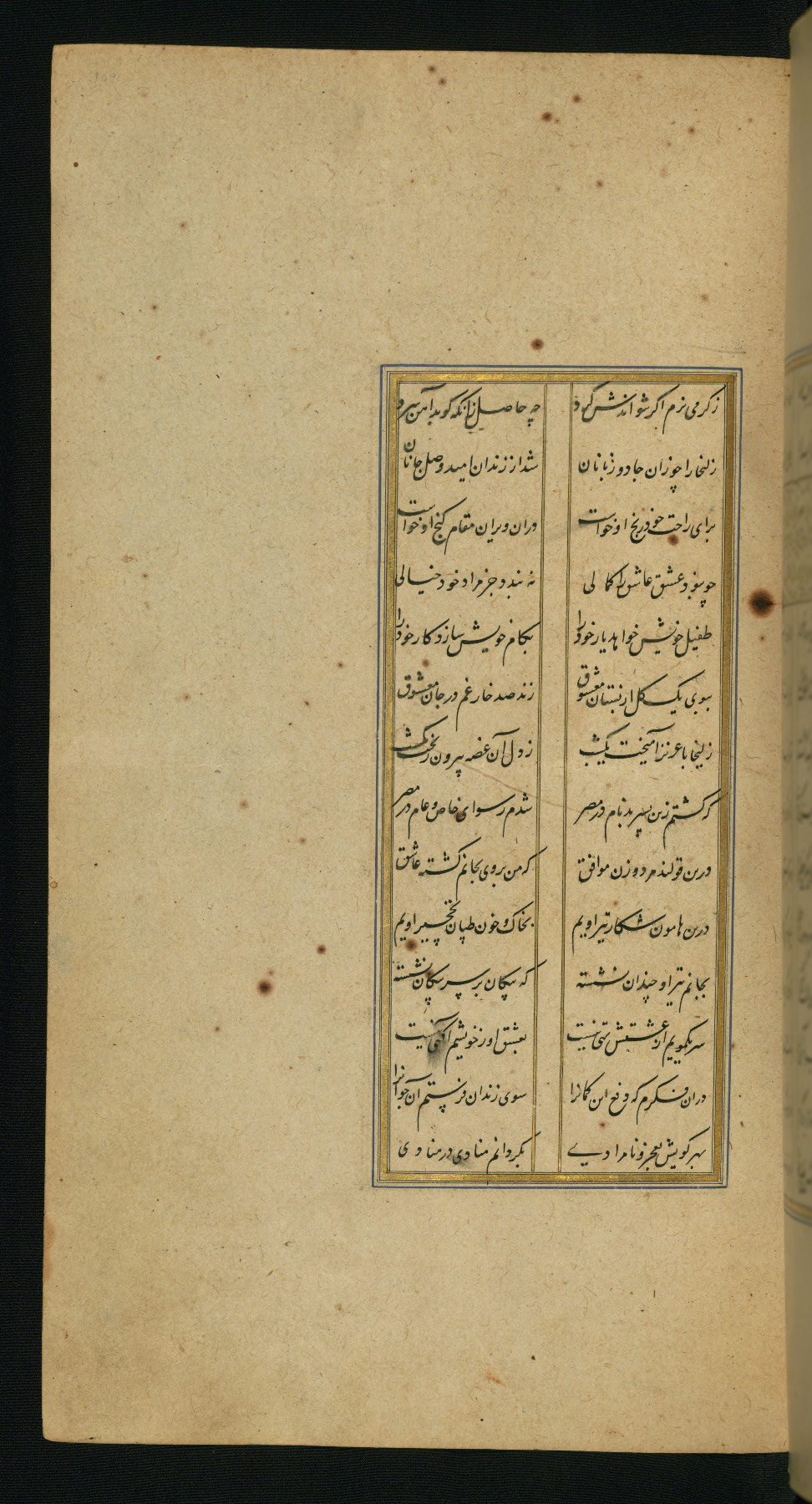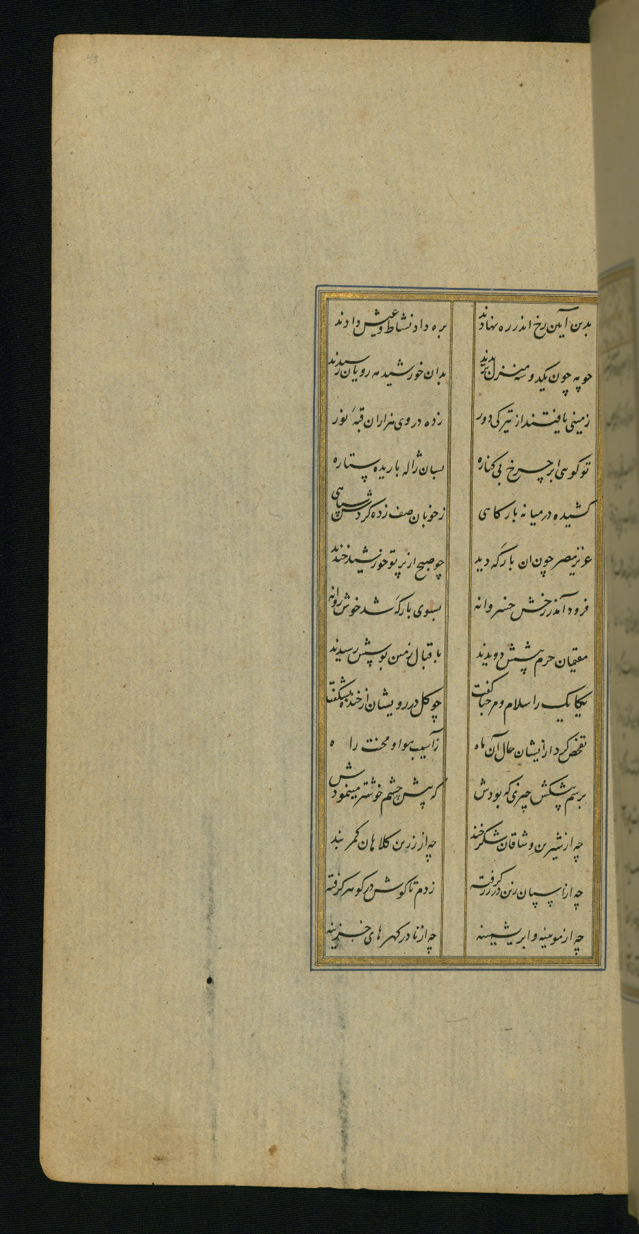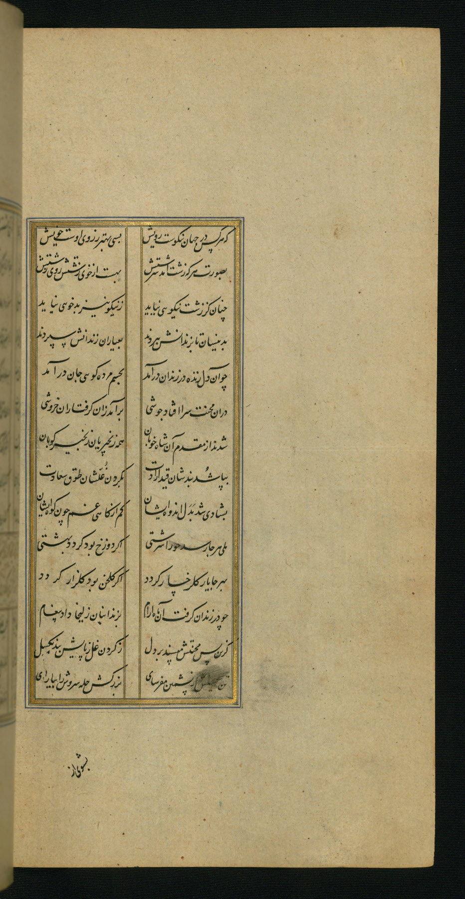 This is an illustrated and illuminated Safavid copy of Joseph (Yūsuf) and Zulaykhā by Nūr al-Dīn Jāmī (d. 898 AH / 1492 CE), executed in Iran in the early tenth century AH / sixteenth CE. The codex opens with a double-page illuminated incipit (fols. 1b-2a) containing the first verses of the work, the title, and the author's name. There are eight paintings illustrating the text. The binding is slightly later than the manuscript.