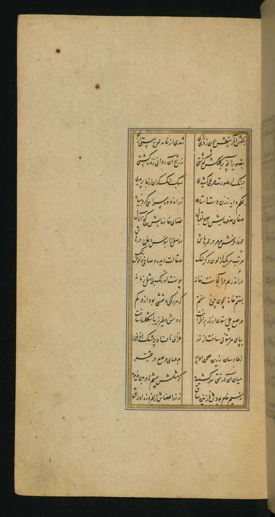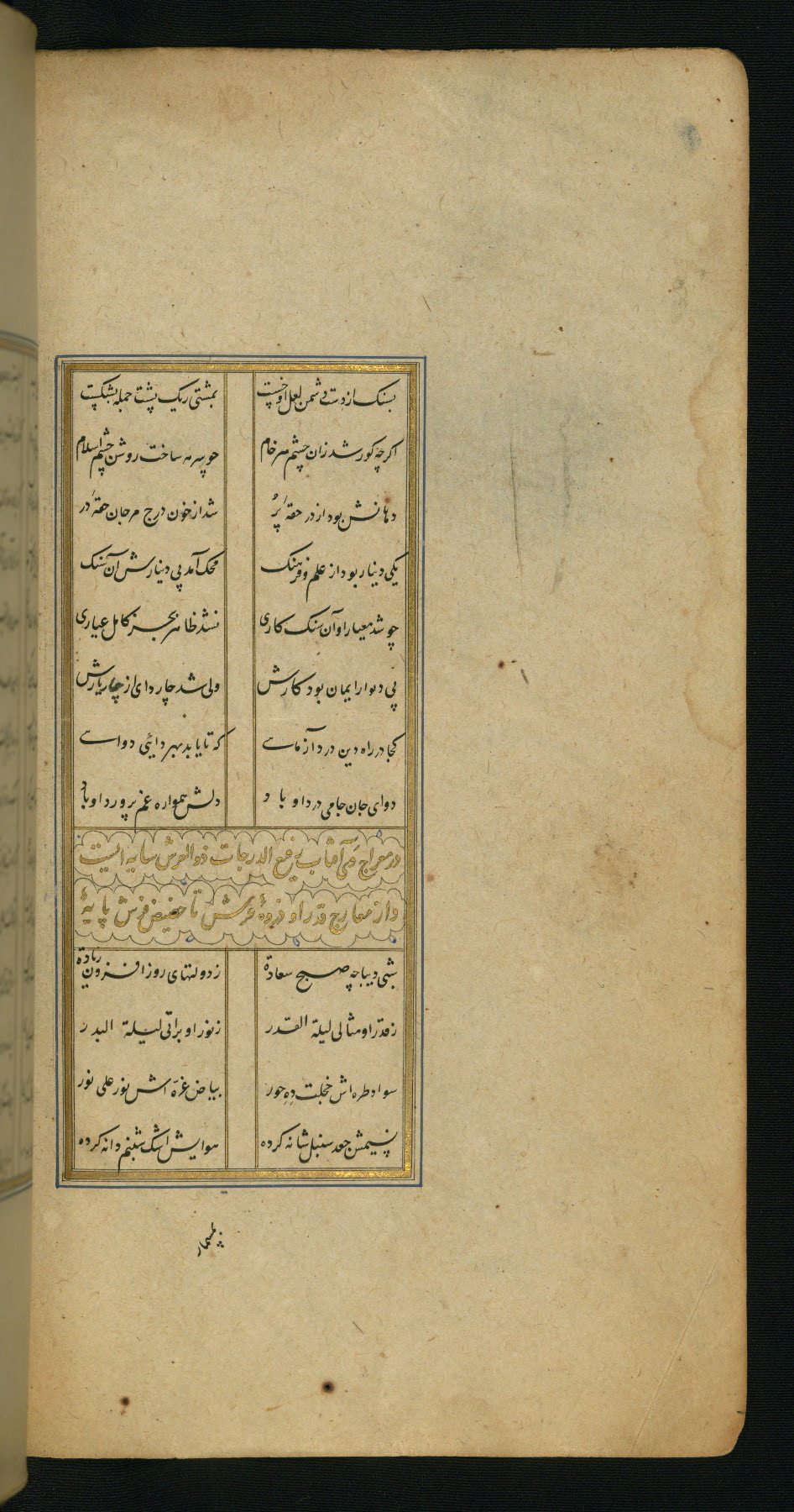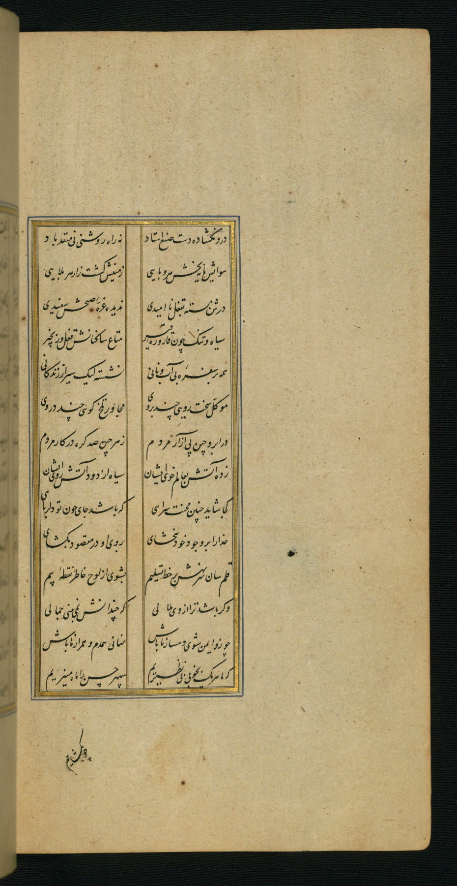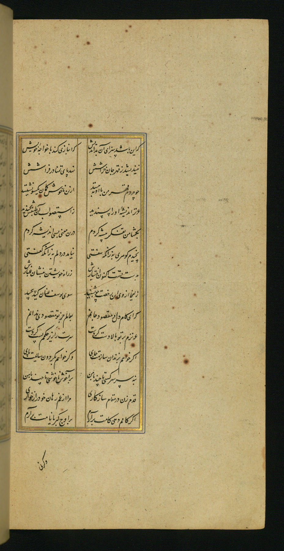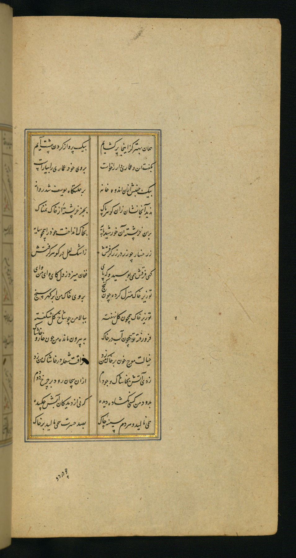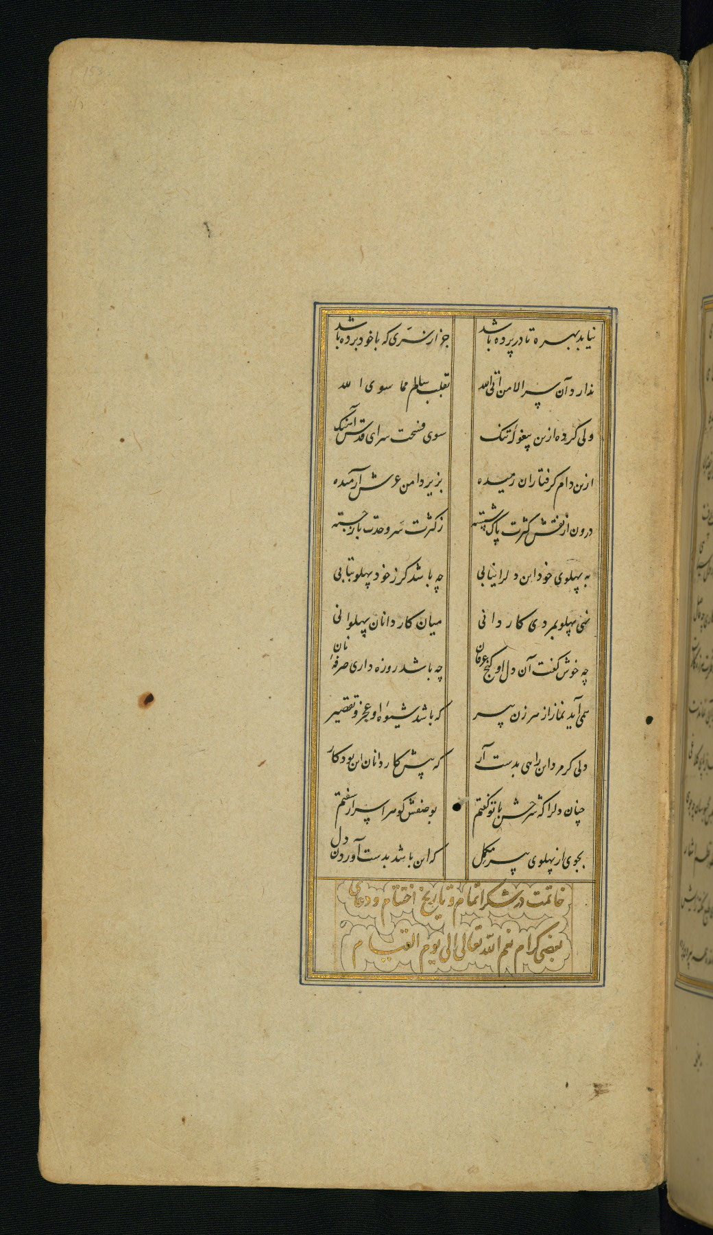 This is an illustrated and illuminated Safavid copy of Joseph (Yūsuf) and Zulaykhā by Nūr al-Dīn Jāmī (d. 898 AH / 1492 CE), executed in Iran in the early tenth century AH / sixteenth CE. The codex opens with a double-page illuminated incipit (fols. 1b-2a) containing the first verses of the work, the title, and the author's name. There are eight paintings illustrating the text. The binding is slightly later than the manuscript.