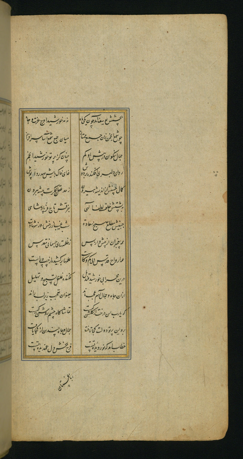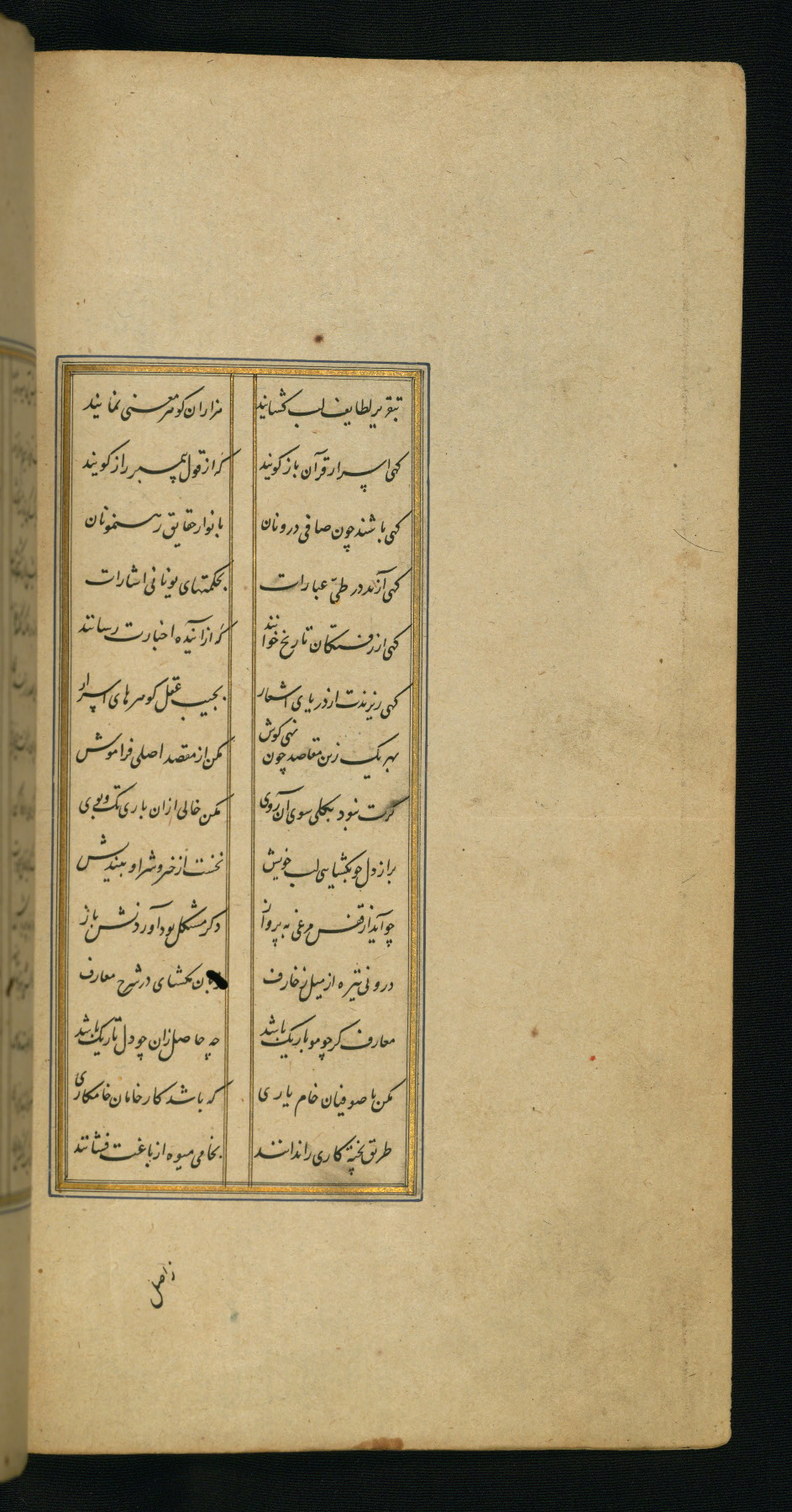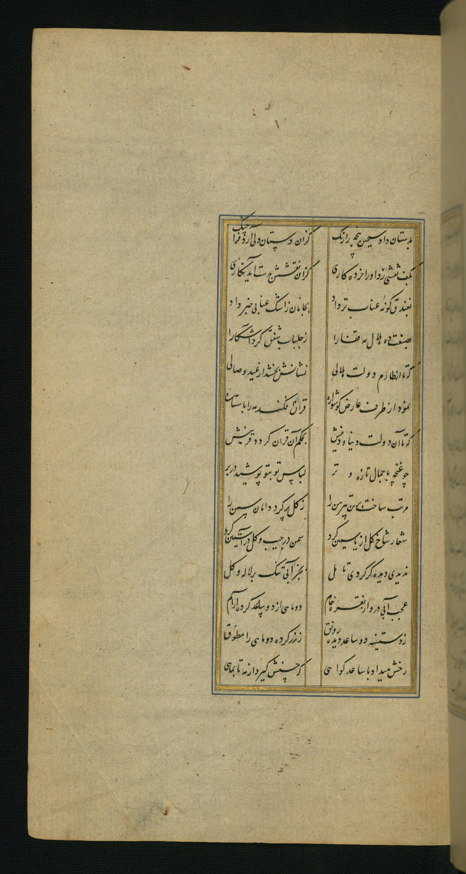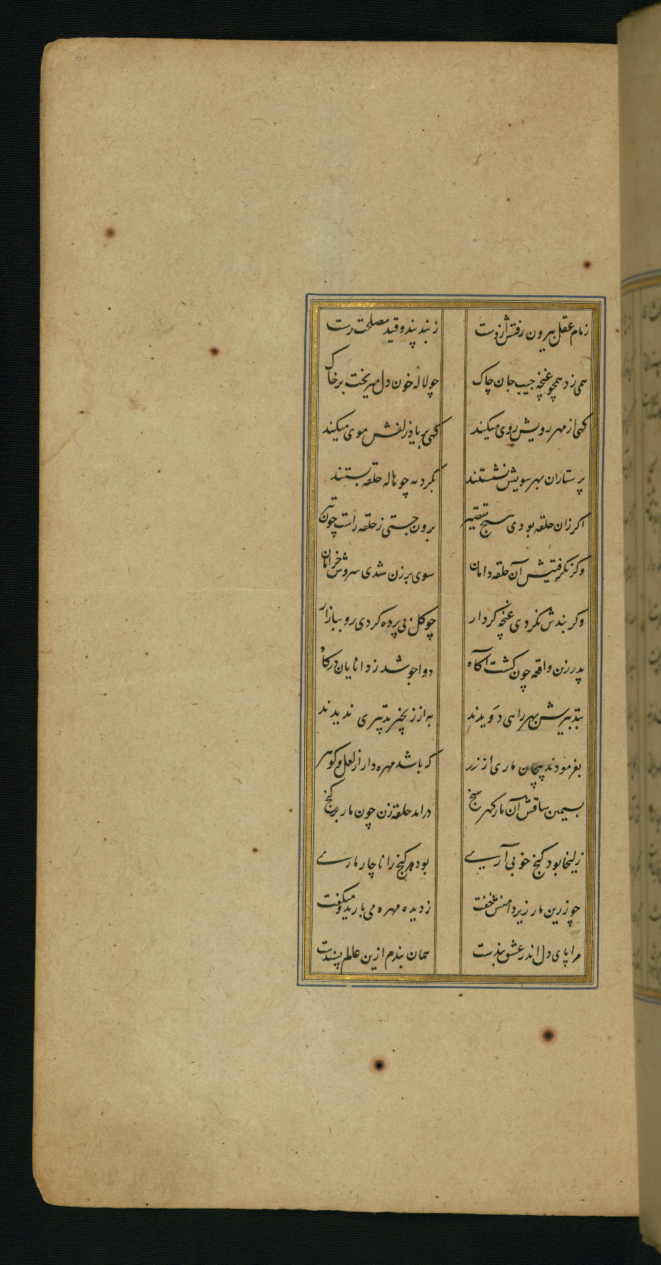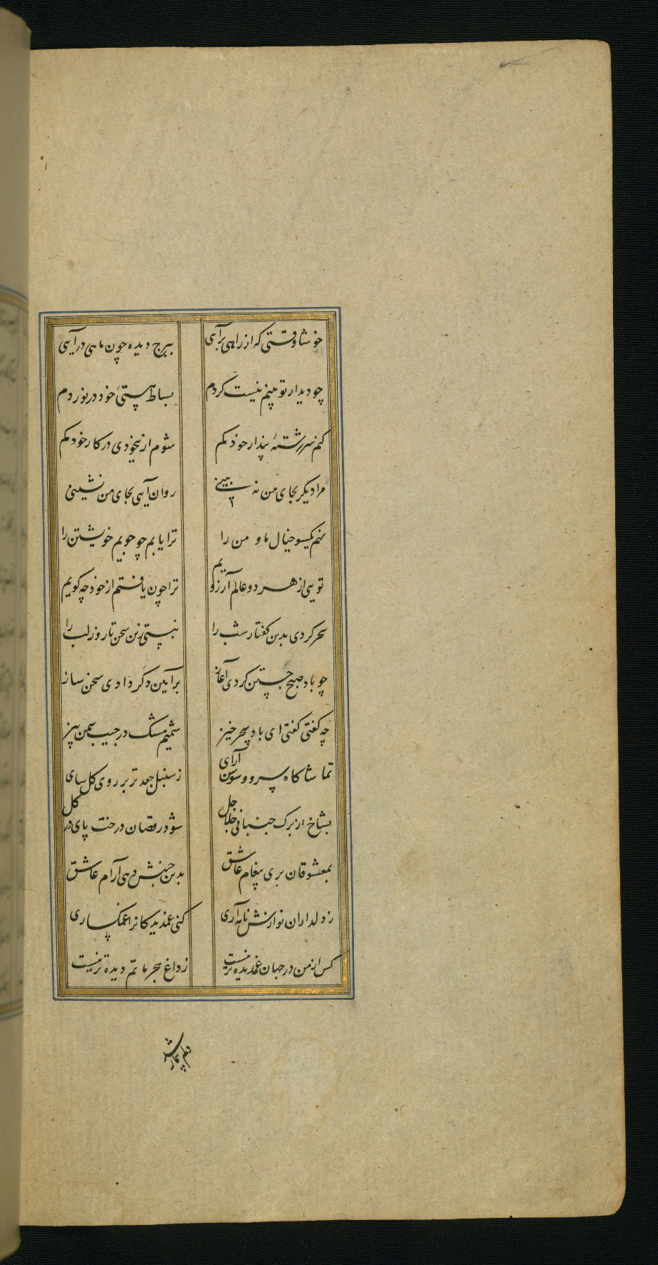 This is an illustrated and illuminated Safavid copy of Joseph (Yūsuf) and Zulaykhā by Nūr al-Dīn Jāmī (d. 898 AH / 1492 CE), executed in Iran in the early tenth century AH / sixteenth CE. The codex opens with a double-page illuminated incipit (fols. 1b-2a) containing the first verses of the work, the title, and the author's name. There are eight paintings illustrating the text. The binding is slightly later than the manuscript.