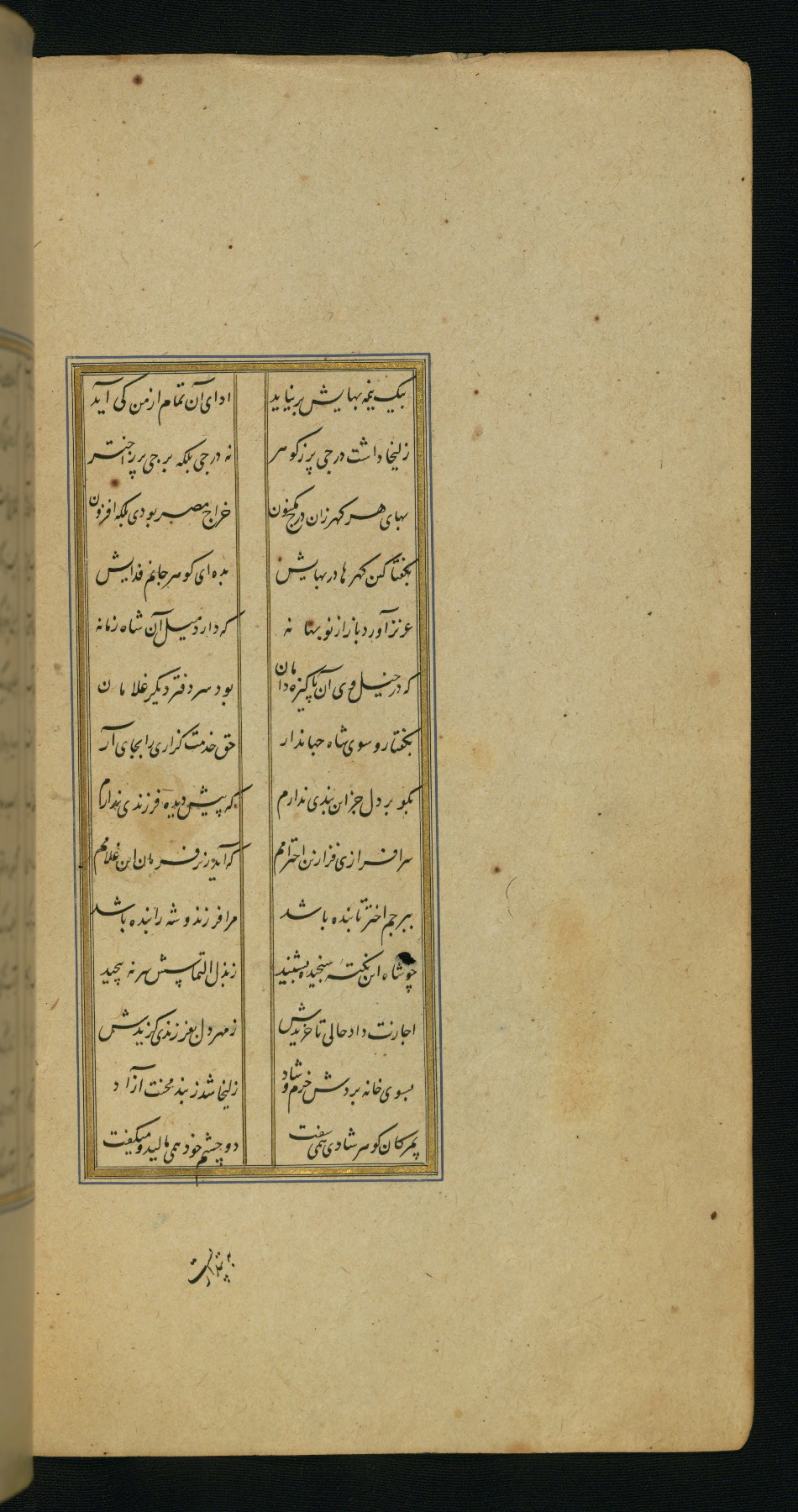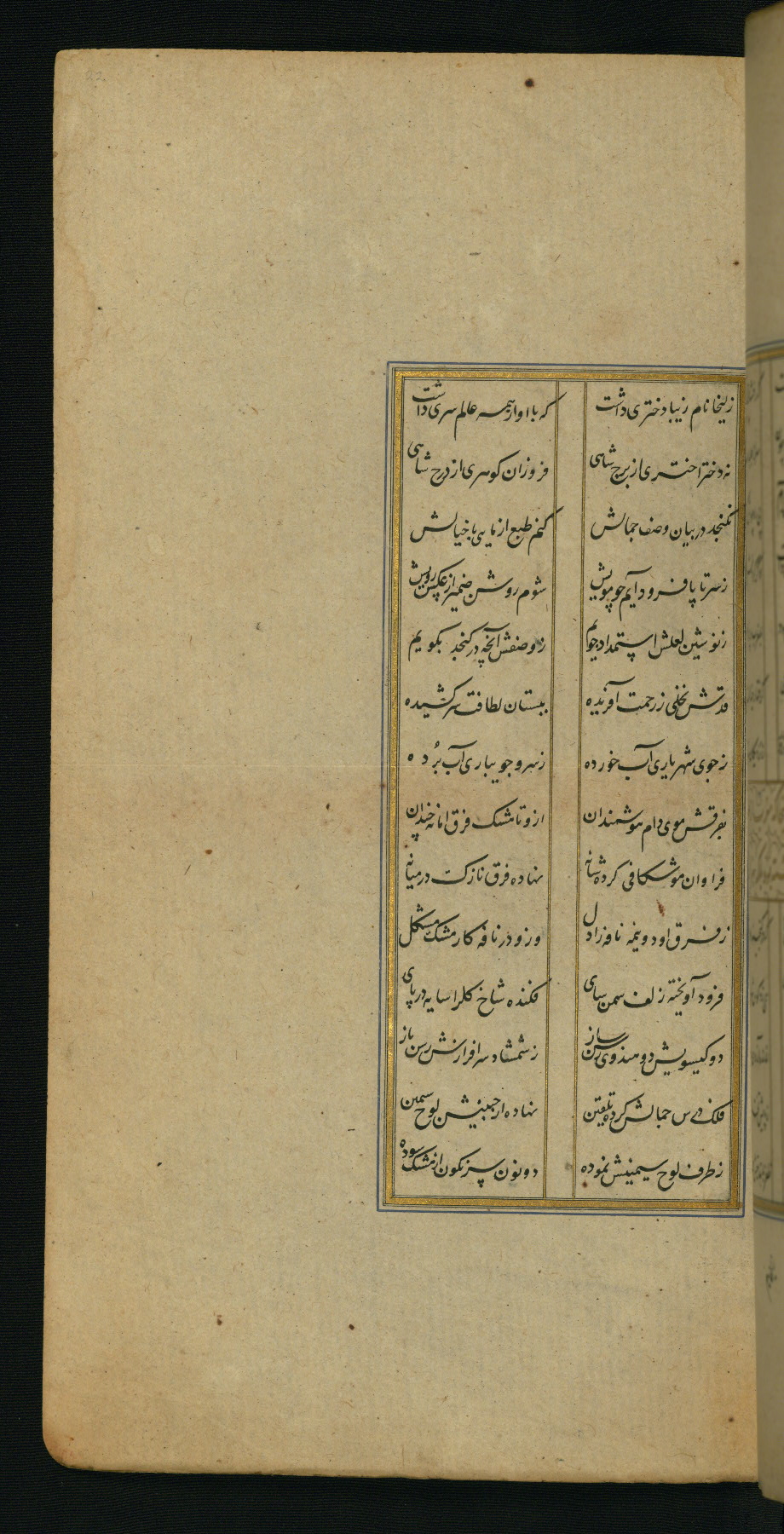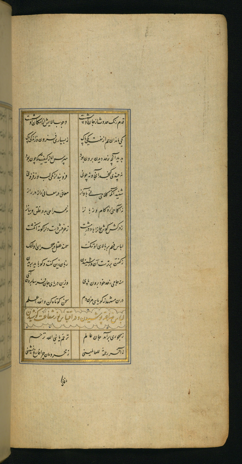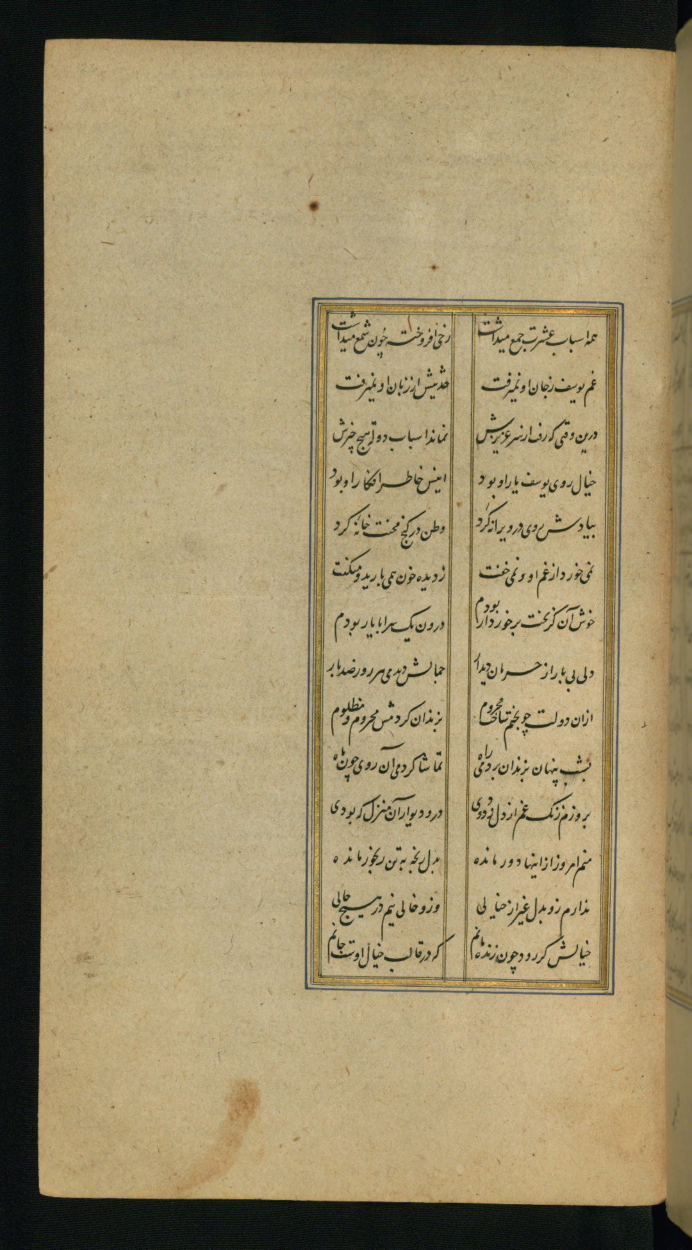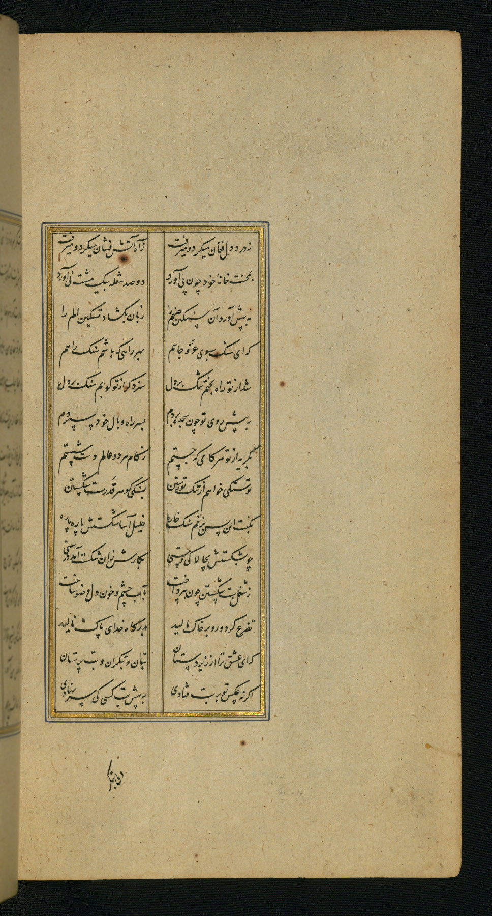This is an illustrated and illuminated Safavid copy of Joseph (Yūsuf) and Zulaykhā by Nūr al-Dīn Jāmī (d. 898 AH / 1492 CE), executed in Iran in the early tenth century AH / sixteenth CE. The codex opens with a double-page illuminated incipit (fols. 1b-2a) containing the first verses of the work, the title, and the author's name. There are eight paintings illustrating the text. The binding is slightly later than the manuscript.