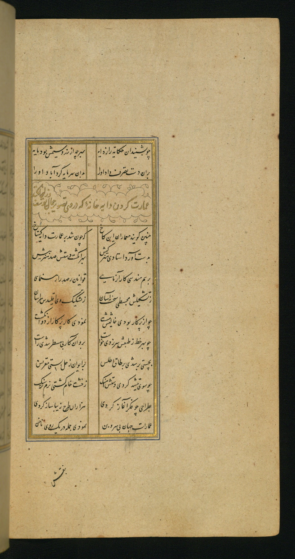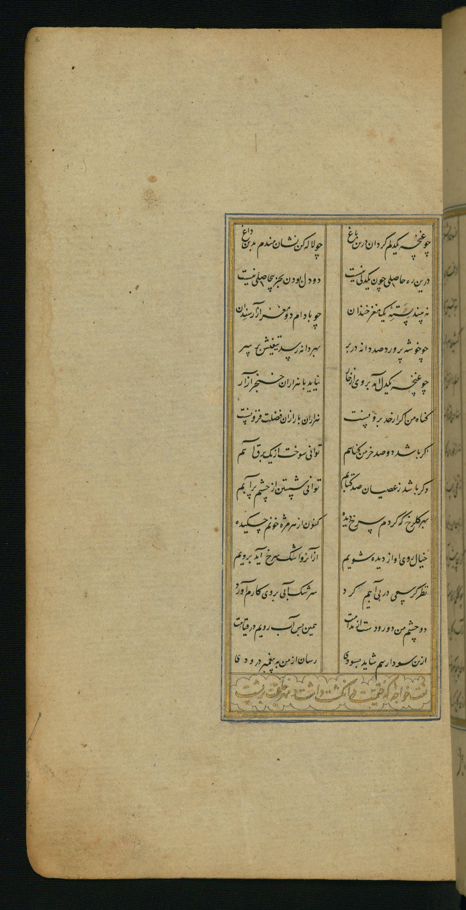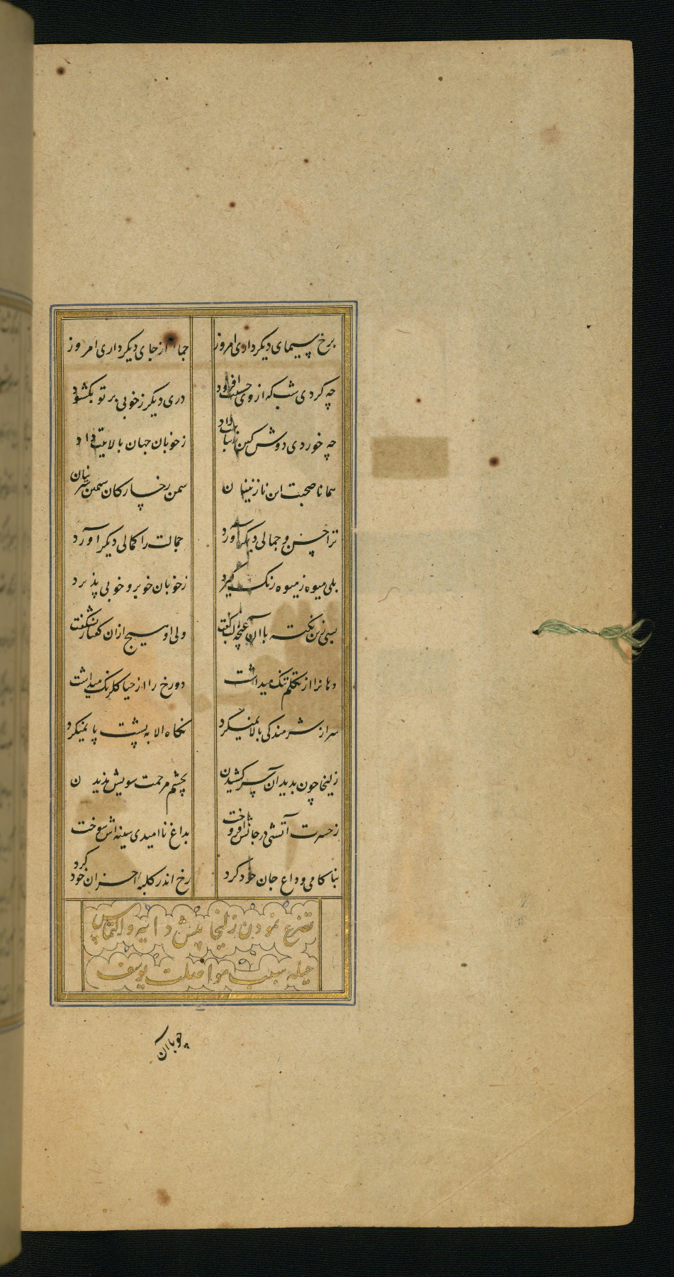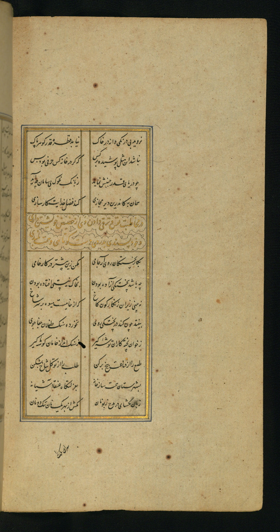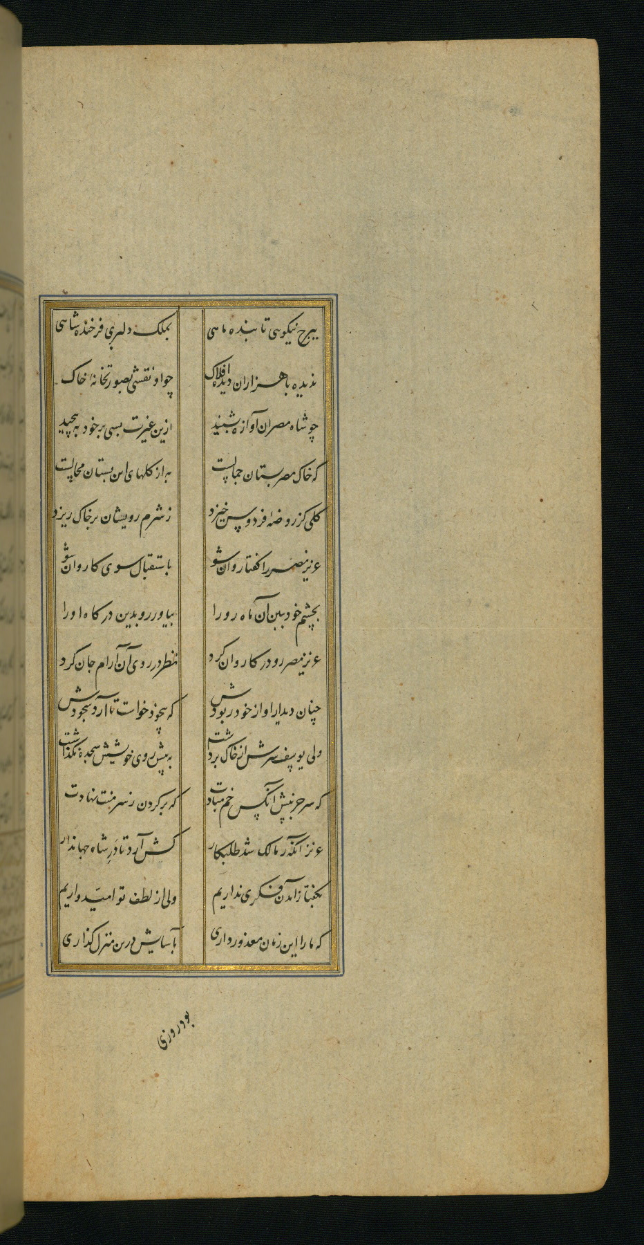 This is an illustrated and illuminated Safavid copy of Joseph (Yūsuf) and Zulaykhā by Nūr al-Dīn Jāmī (d. 898 AH / 1492 CE), executed in Iran in the early tenth century AH / sixteenth CE. The codex opens with a double-page illuminated incipit (fols. 1b-2a) containing the first verses of the work, the title, and the author's name. There are eight paintings illustrating the text. The binding is slightly later than the manuscript.
