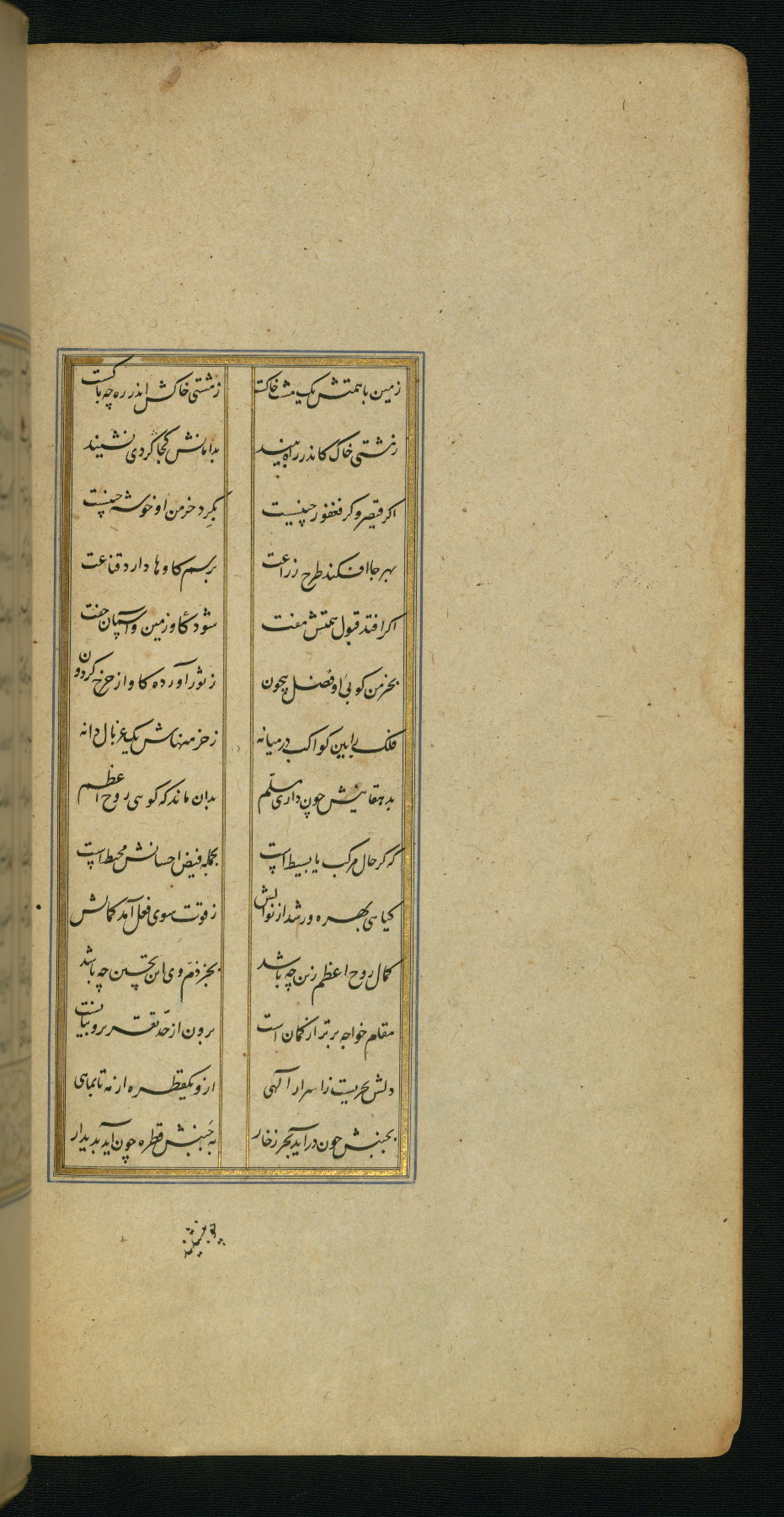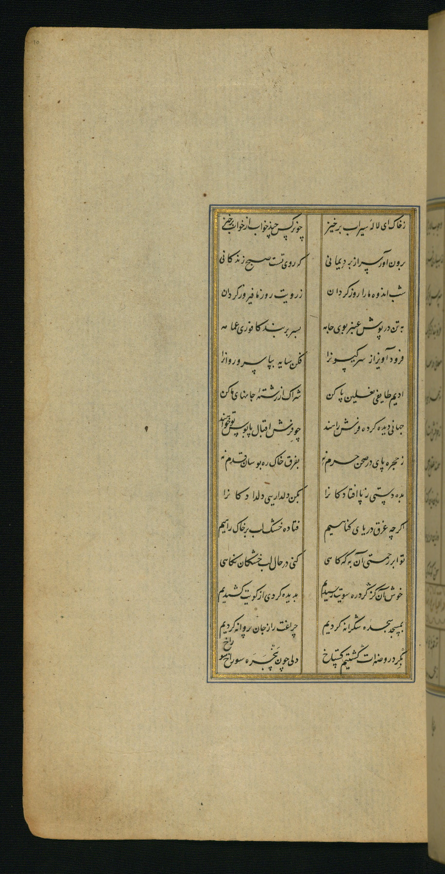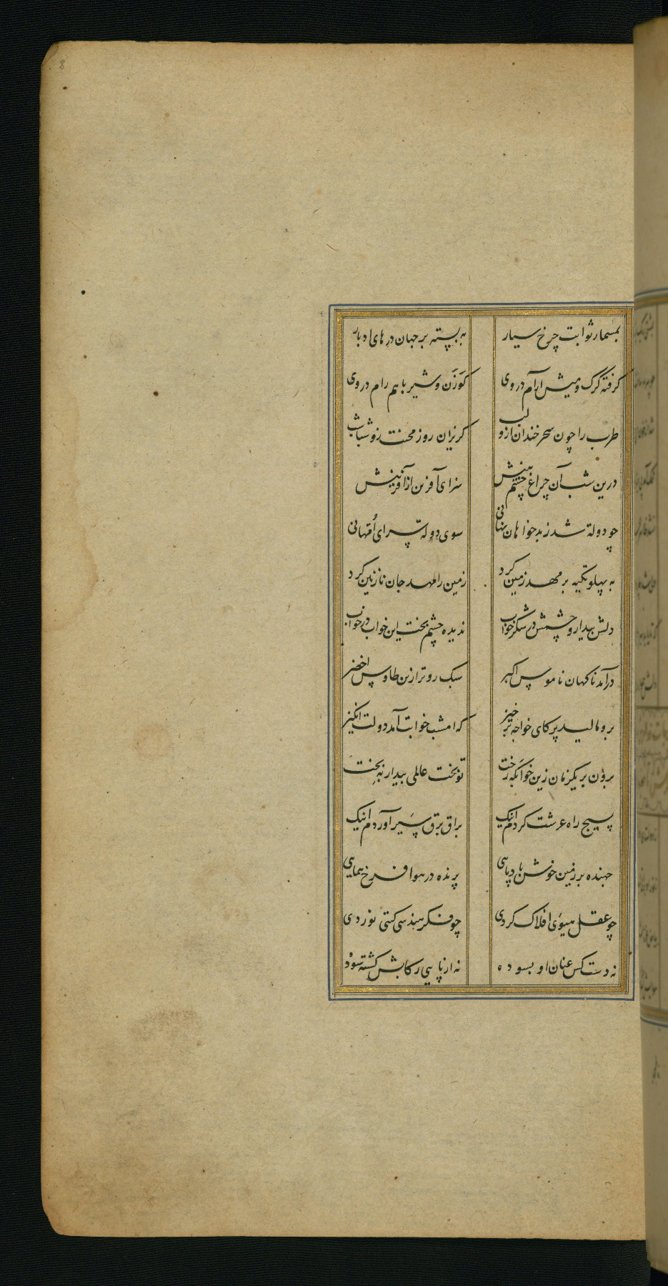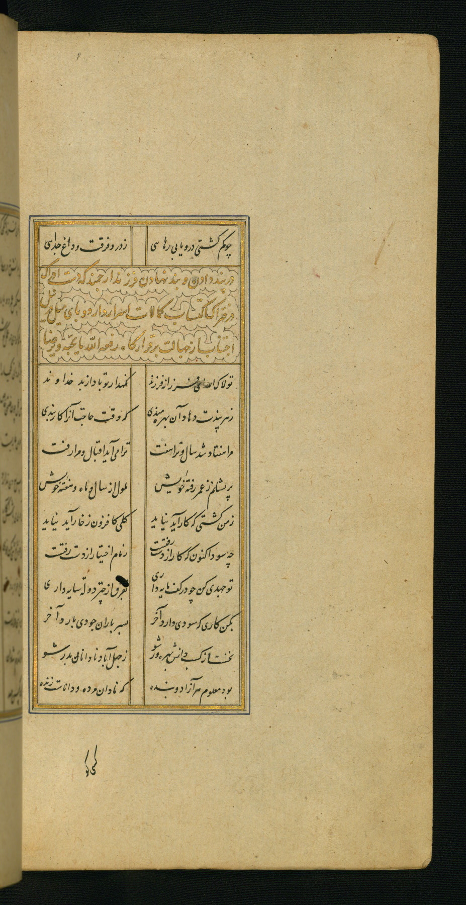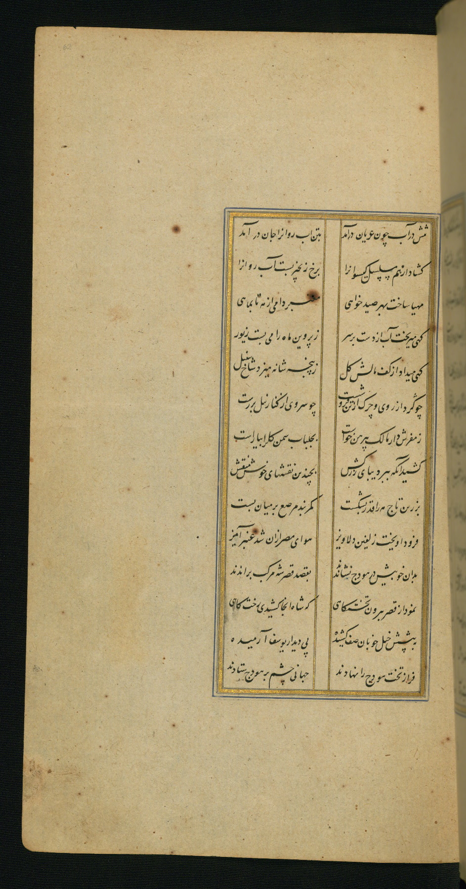 This is an illustrated and illuminated Safavid copy of Joseph (Yūsuf) and Zulaykhā by Nūr al-Dīn Jāmī (d. 898 AH / 1492 CE), executed in Iran in the early tenth century AH / sixteenth CE. The codex opens with a double-page illuminated incipit (fols. 1b-2a) containing the first verses of the work, the title, and the author's name. There are eight paintings illustrating the text. The binding is slightly later than the manuscript.