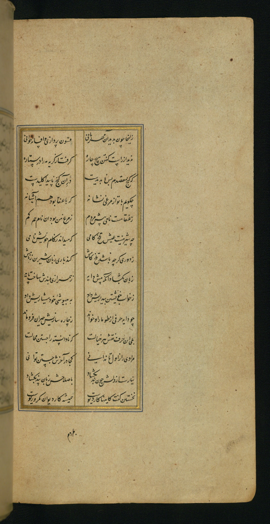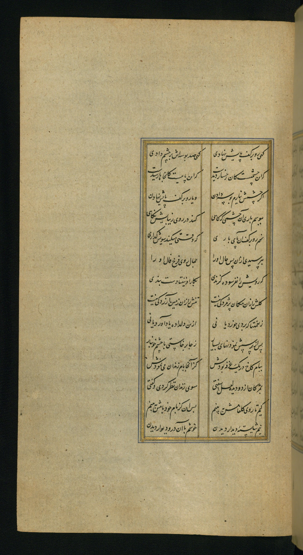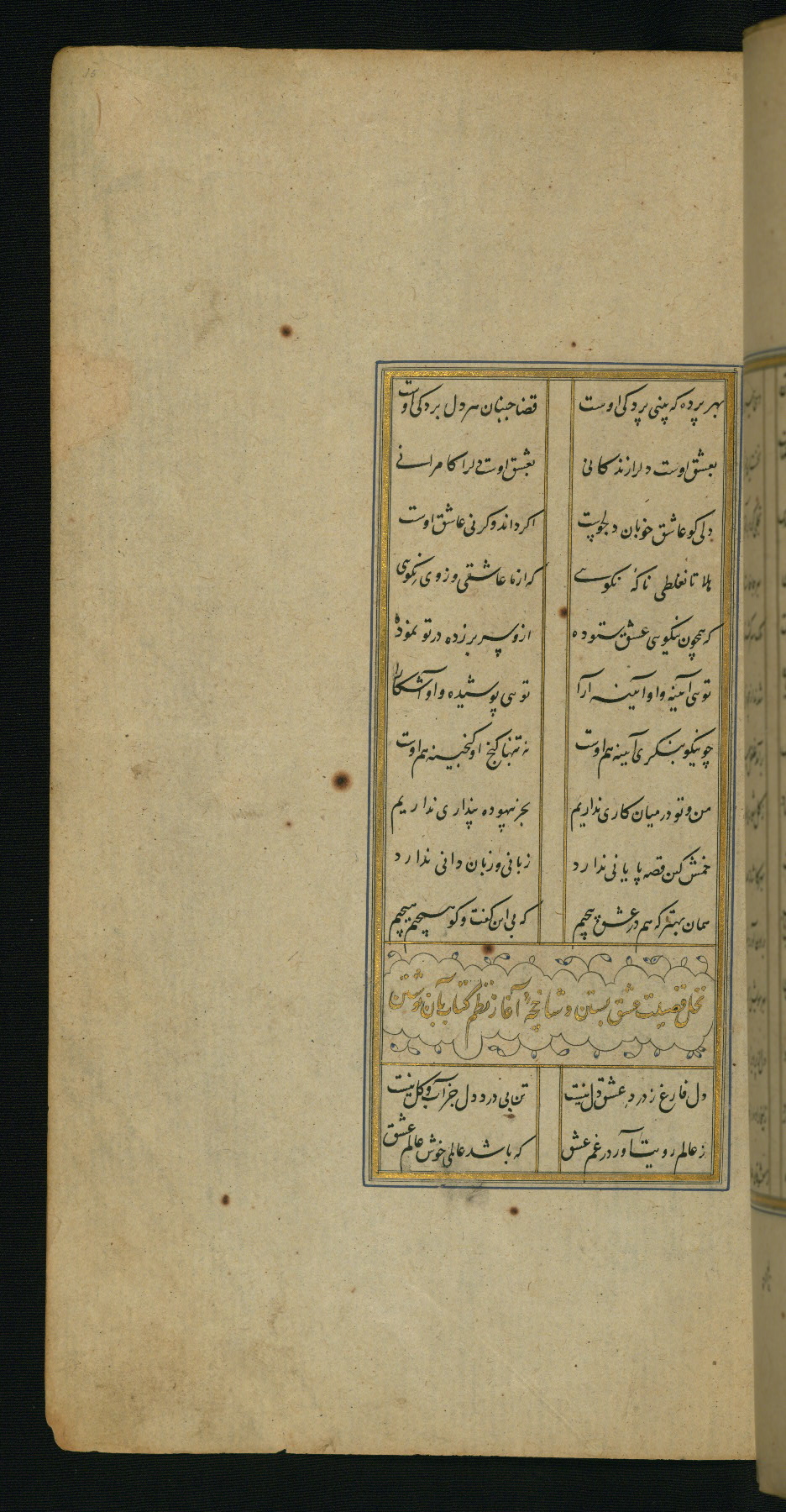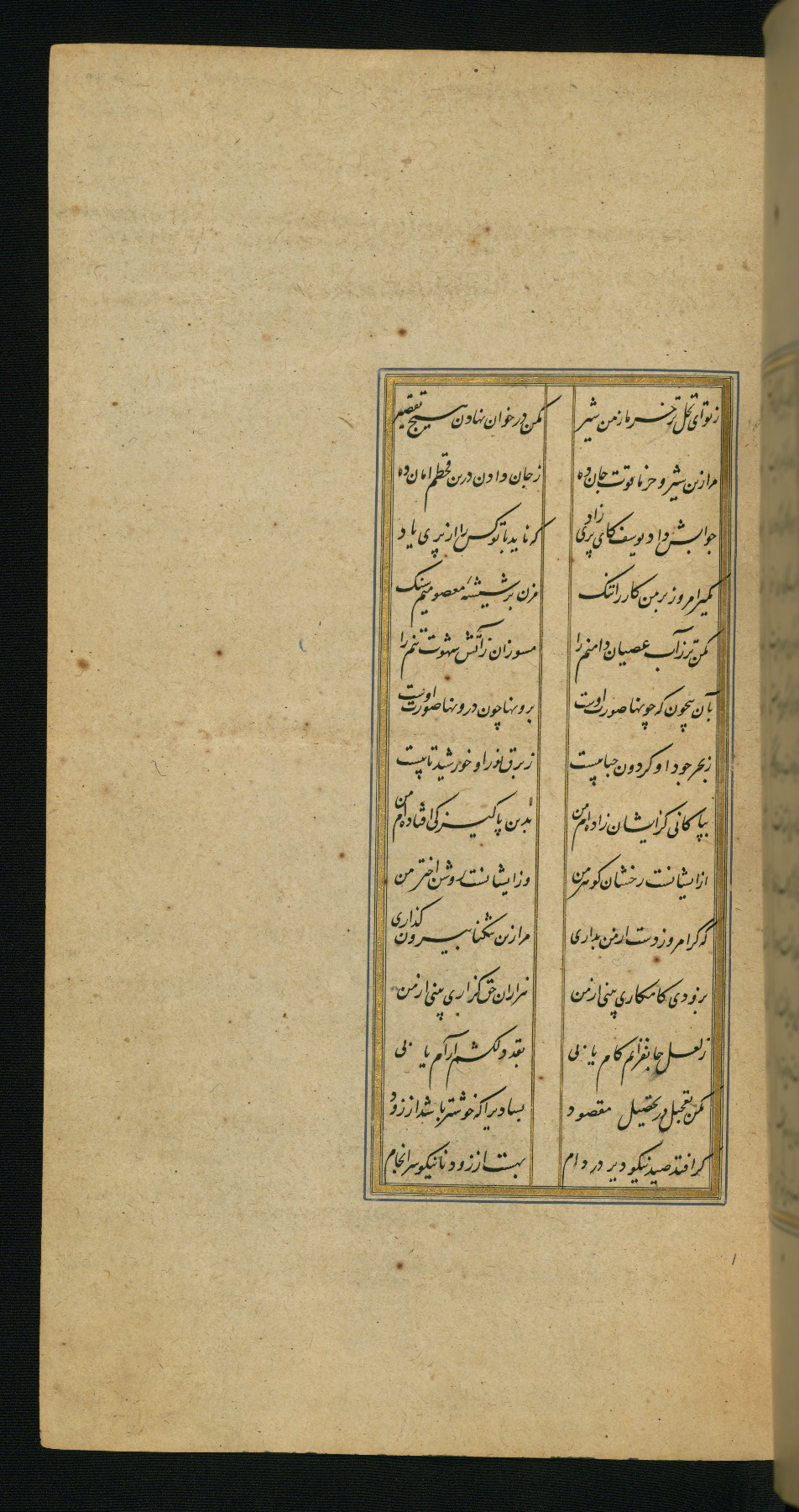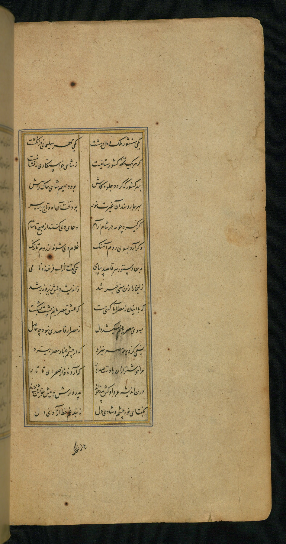 This is an illustrated and illuminated Safavid copy of Joseph (Yūsuf) and Zulaykhā by Nūr al-Dīn Jāmī (d. 898 AH / 1492 CE), executed in Iran in the early tenth century AH / sixteenth CE. The codex opens with a double-page illuminated incipit (fols. 1b-2a) containing the first verses of the work, the title, and the author's name. There are eight paintings illustrating the text. The binding is slightly later than the manuscript.