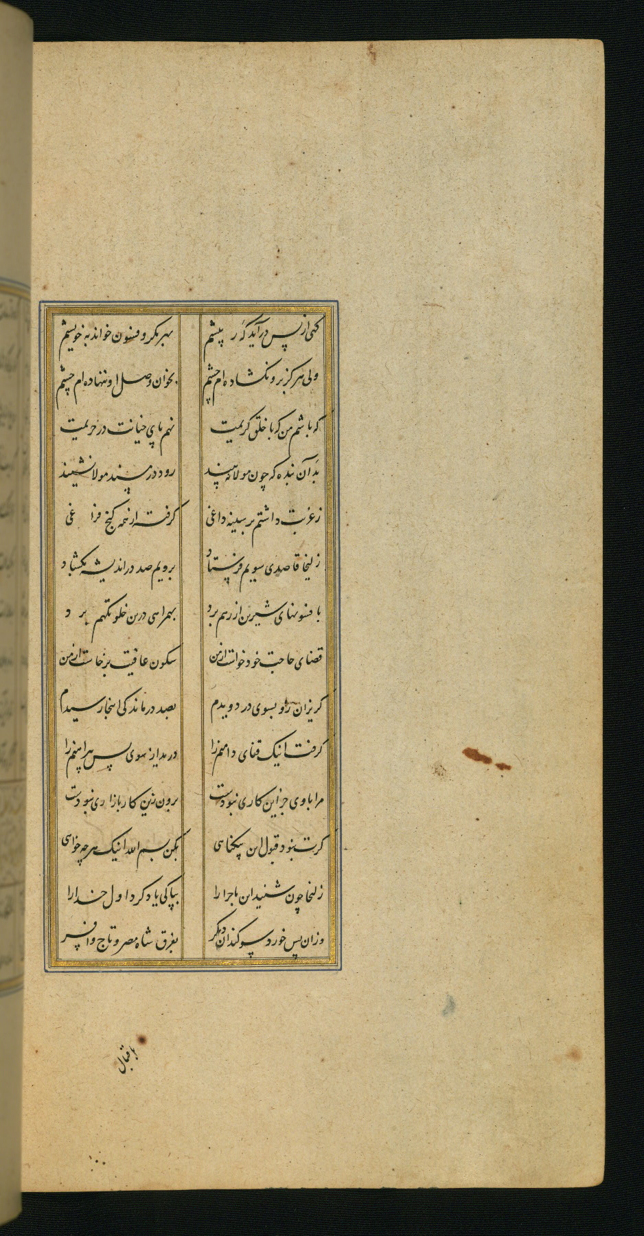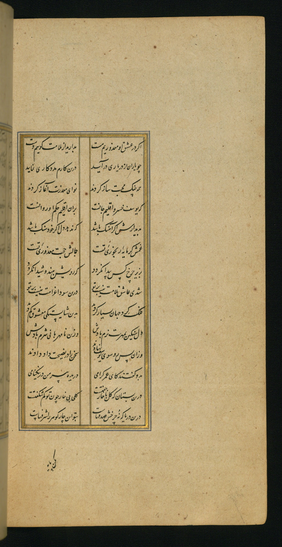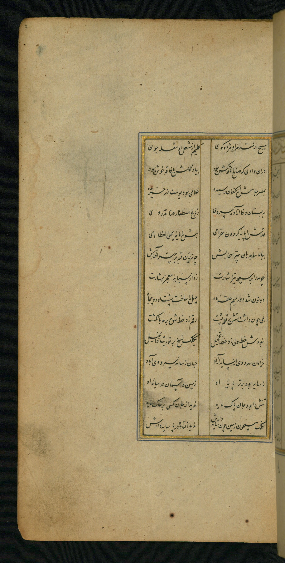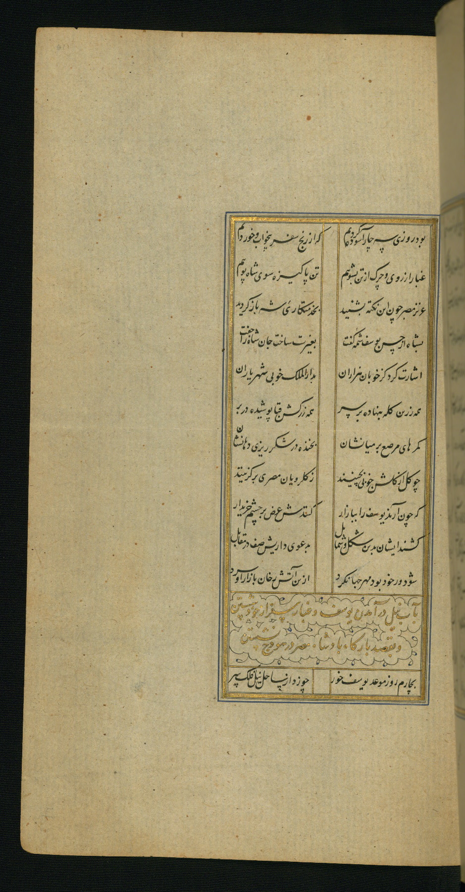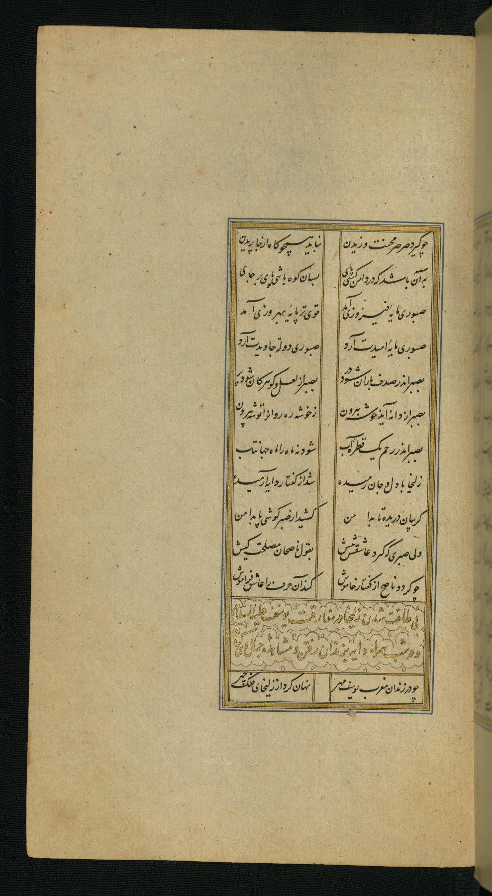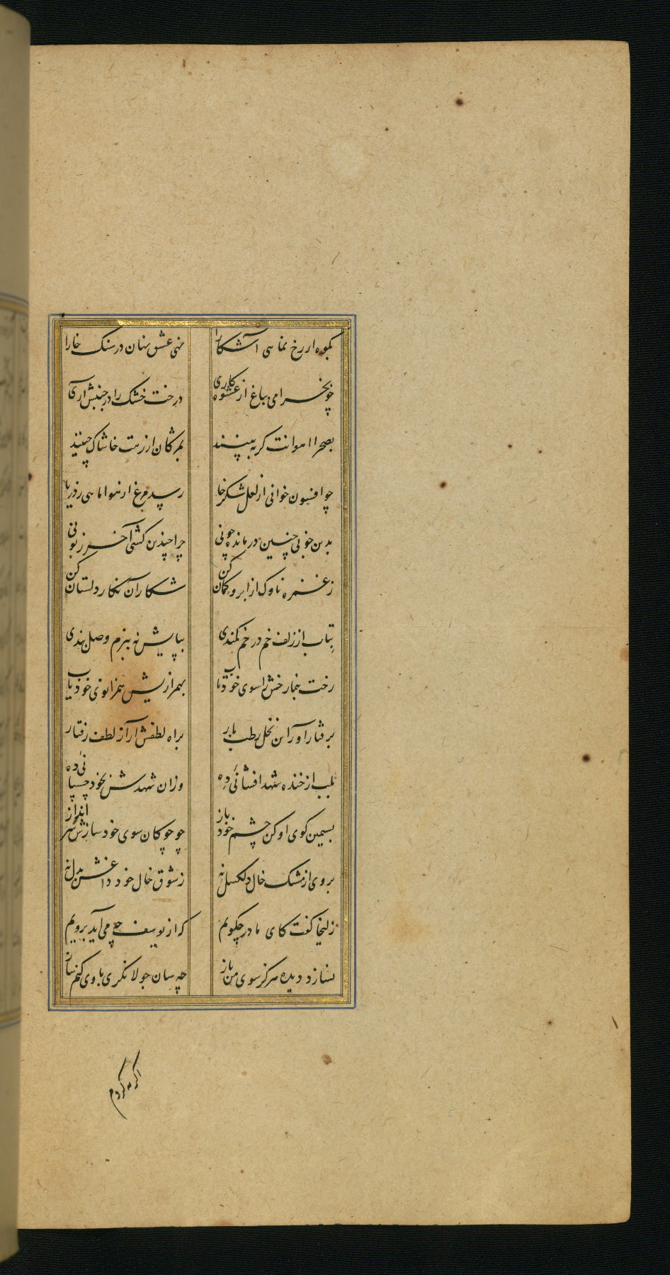 This is an illustrated and illuminated Safavid copy of Joseph (Yūsuf) and Zulaykhā by Nūr al-Dīn Jāmī (d. 898 AH / 1492 CE), executed in Iran in the early tenth century AH / sixteenth CE. The codex opens with a double-page illuminated incipit (fols. 1b-2a) containing the first verses of the work, the title, and the author's name. There are eight paintings illustrating the text. The binding is slightly later than the manuscript.