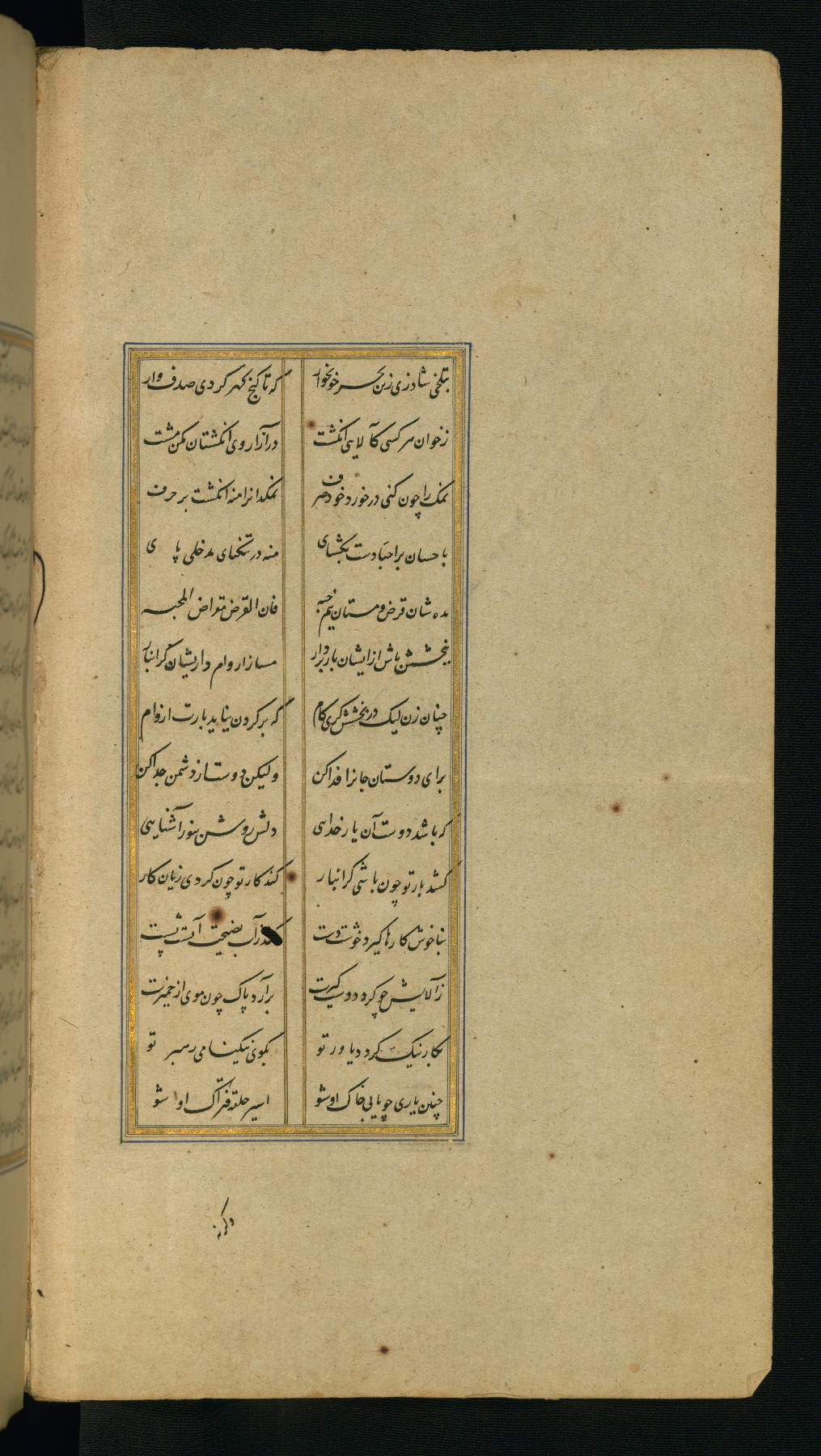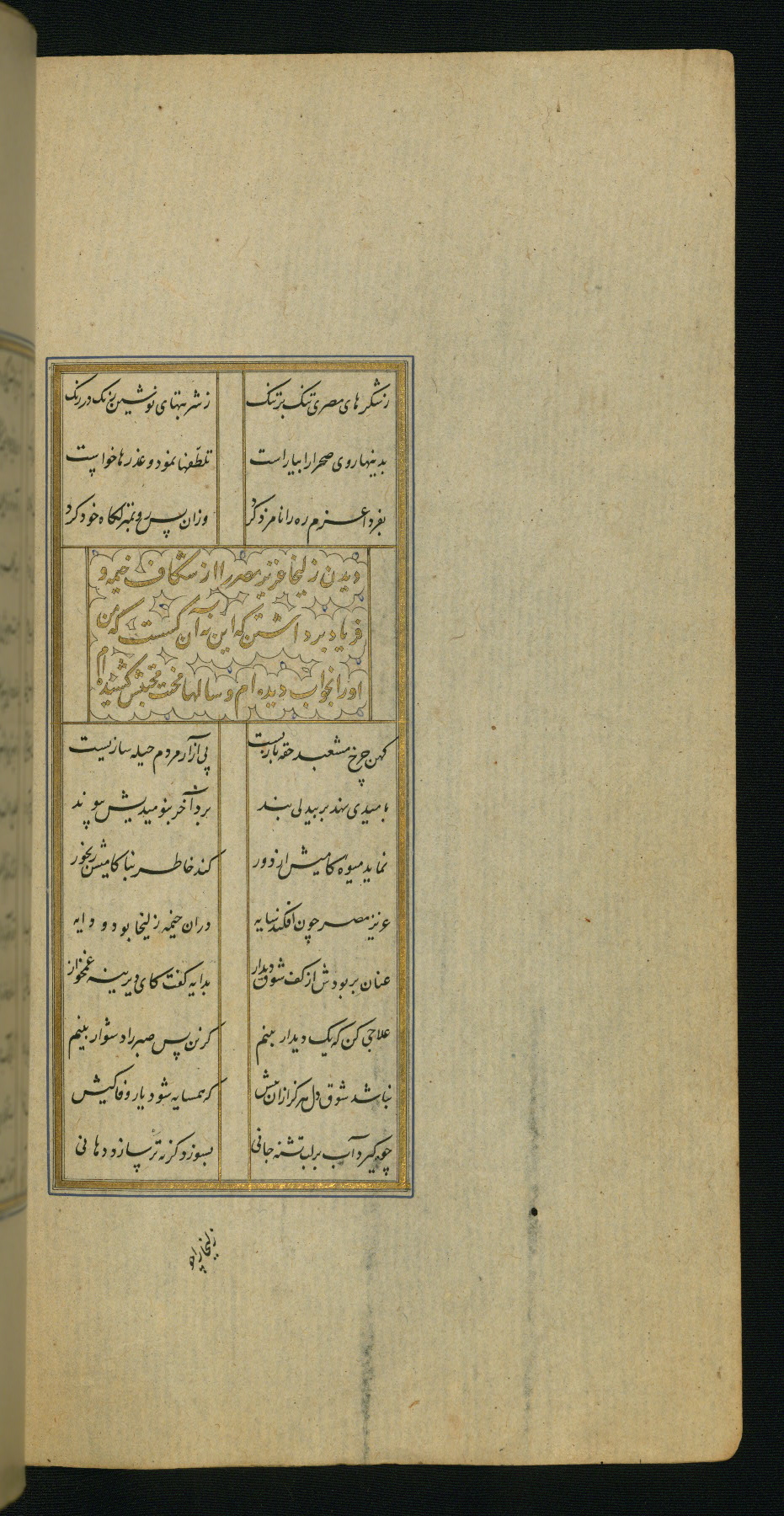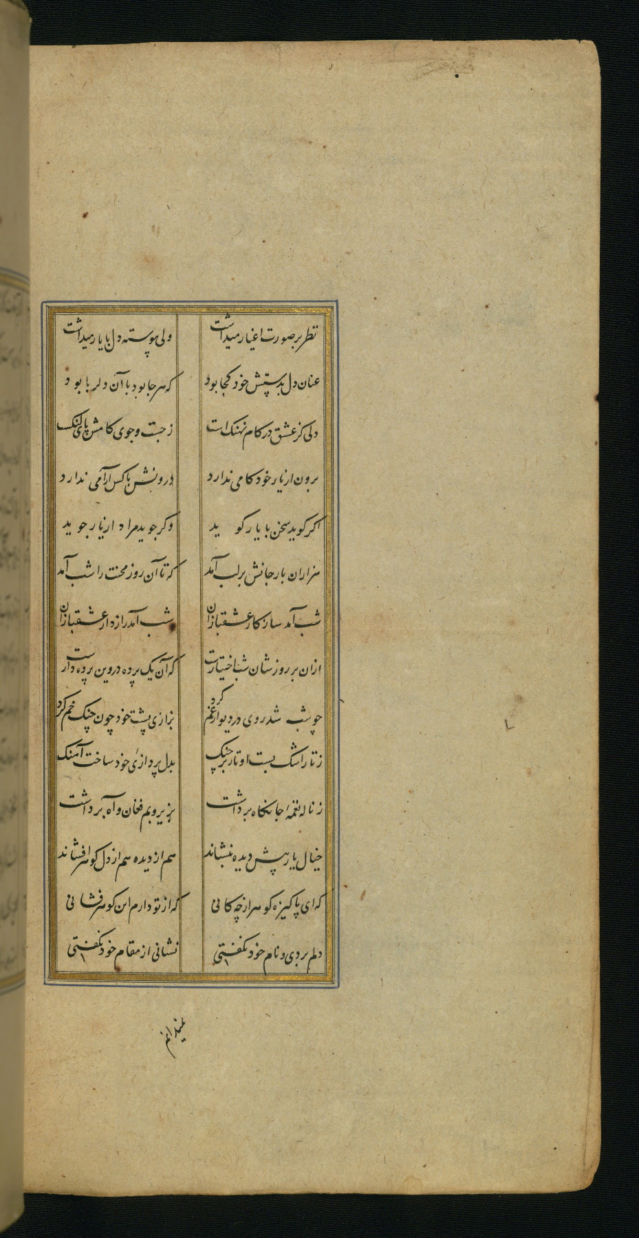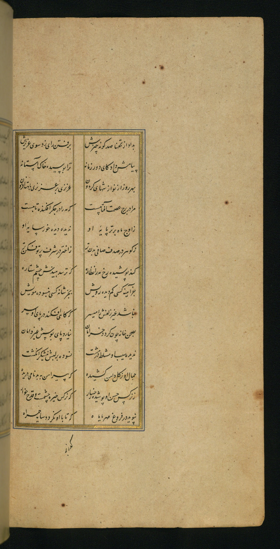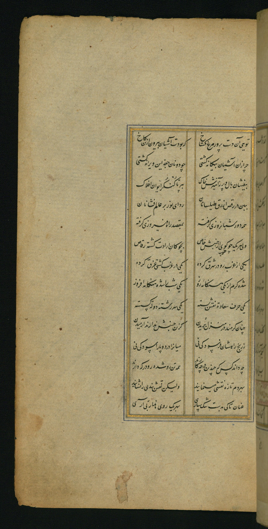 This is an illustrated and illuminated Safavid copy of Joseph (Yūsuf) and Zulaykhā by Nūr al-Dīn Jāmī (d. 898 AH / 1492 CE), executed in Iran in the early tenth century AH / sixteenth CE. The codex opens with a double-page illuminated incipit (fols. 1b-2a) containing the first verses of the work, the title, and the author's name. There are eight paintings illustrating the text. The binding is slightly later than the manuscript.
