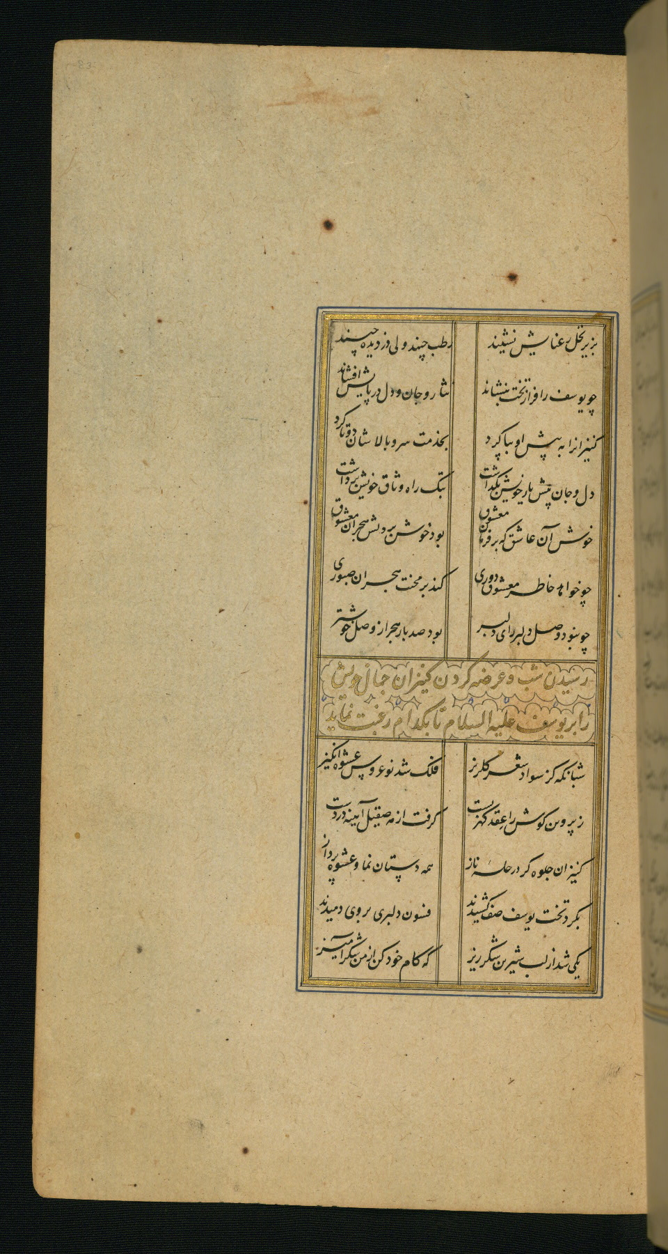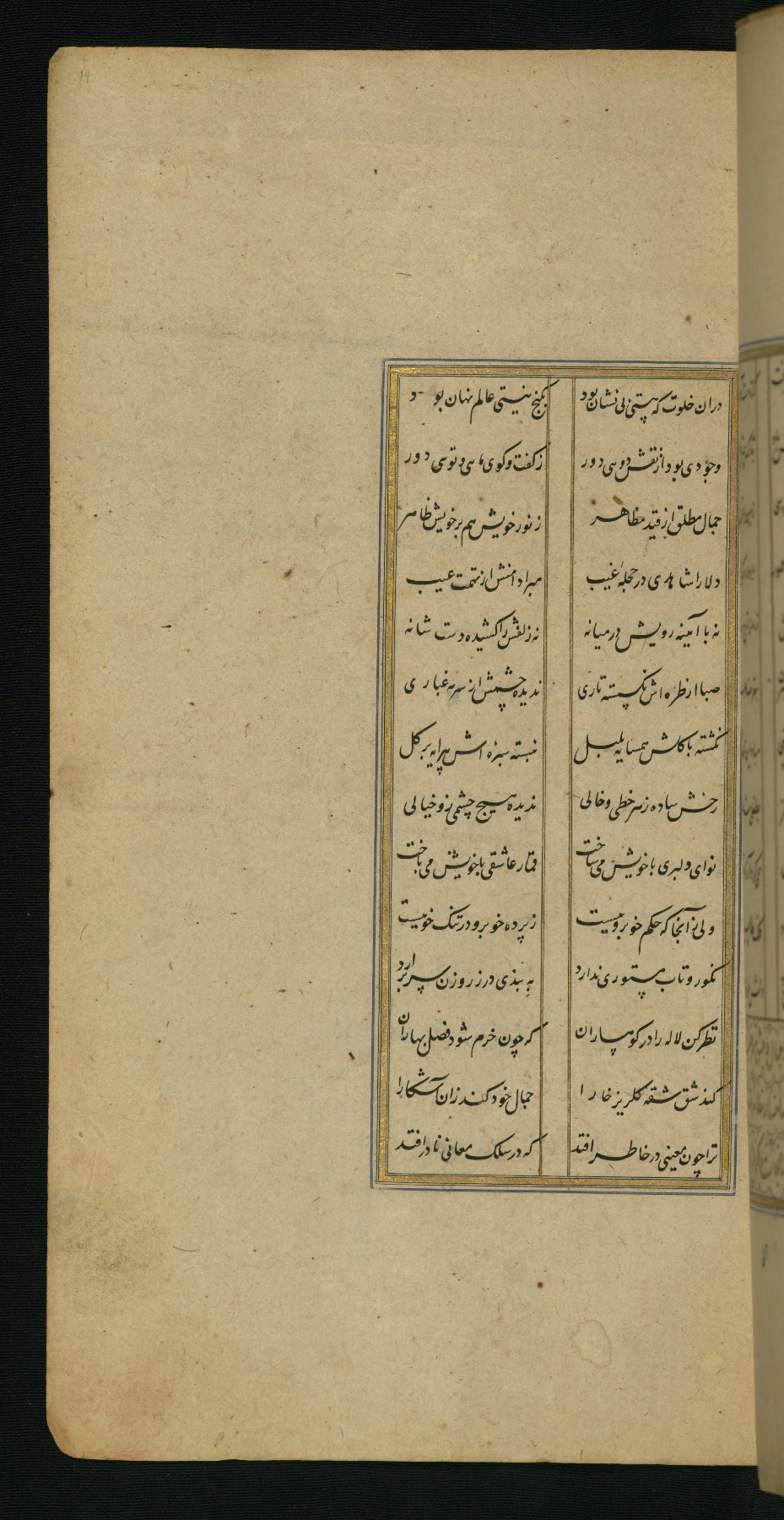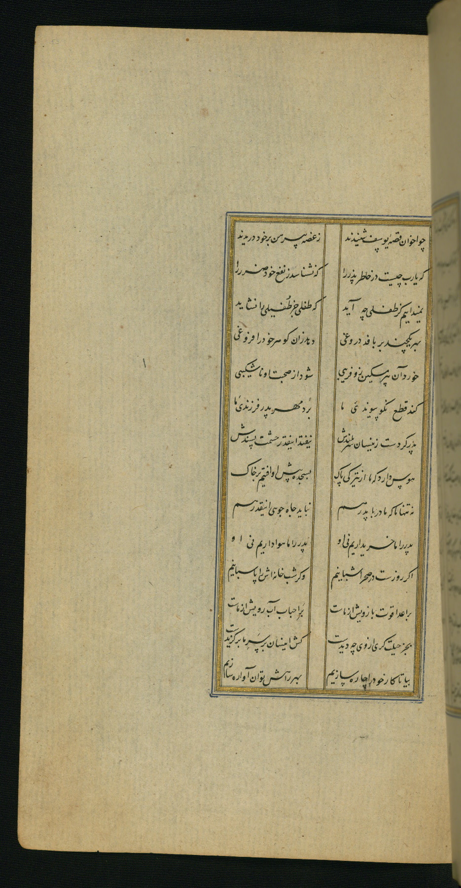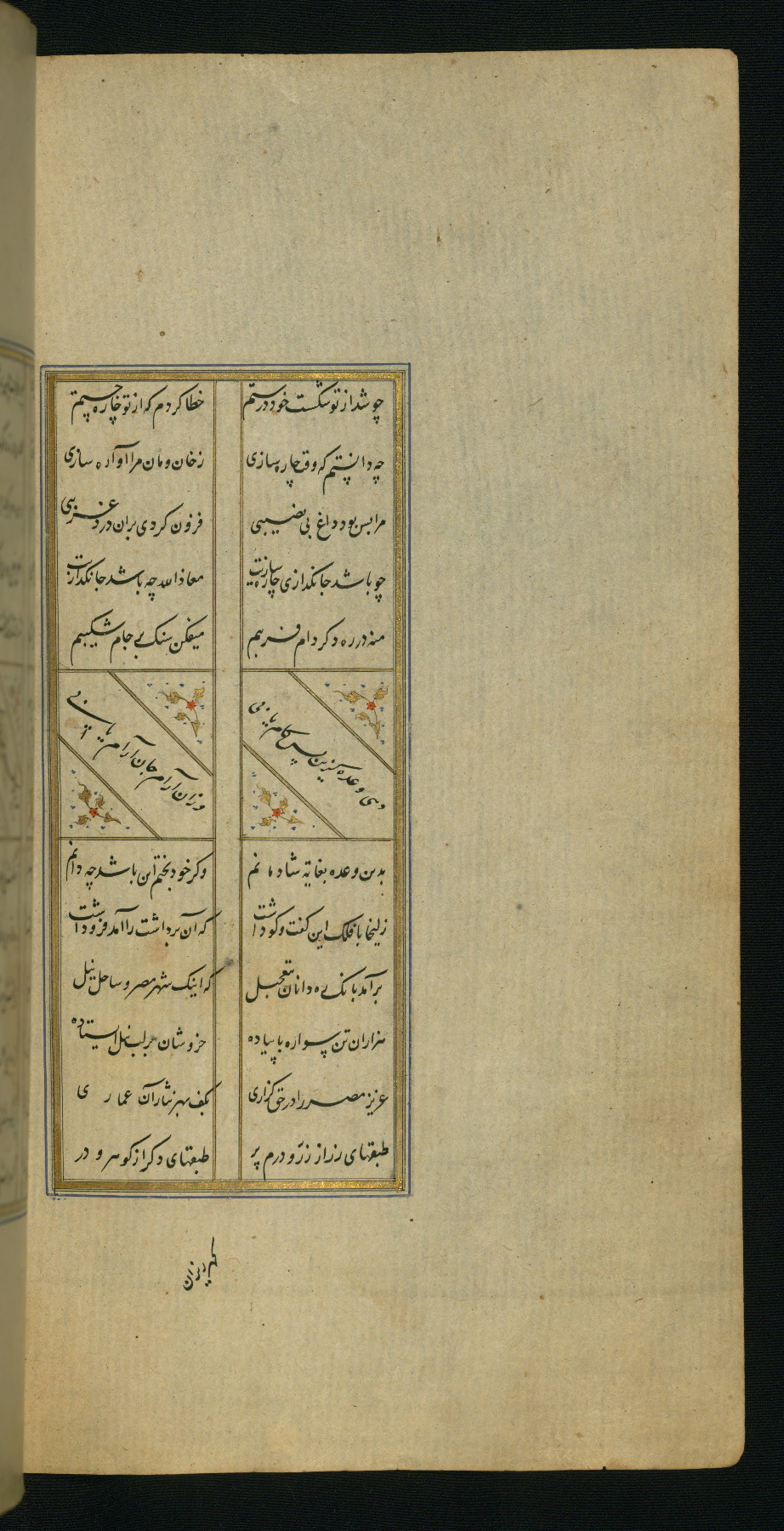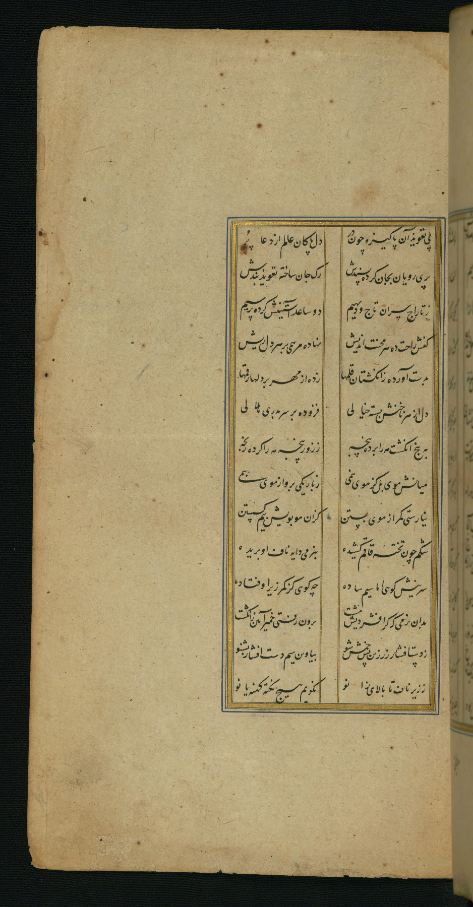 This is an illustrated and illuminated Safavid copy of Joseph (Yūsuf) and Zulaykhā by Nūr al-Dīn Jāmī (d. 898 AH / 1492 CE), executed in Iran in the early tenth century AH / sixteenth CE. The codex opens with a double-page illuminated incipit (fols. 1b-2a) containing the first verses of the work, the title, and the author's name. There are eight paintings illustrating the text. The binding is slightly later than the manuscript.