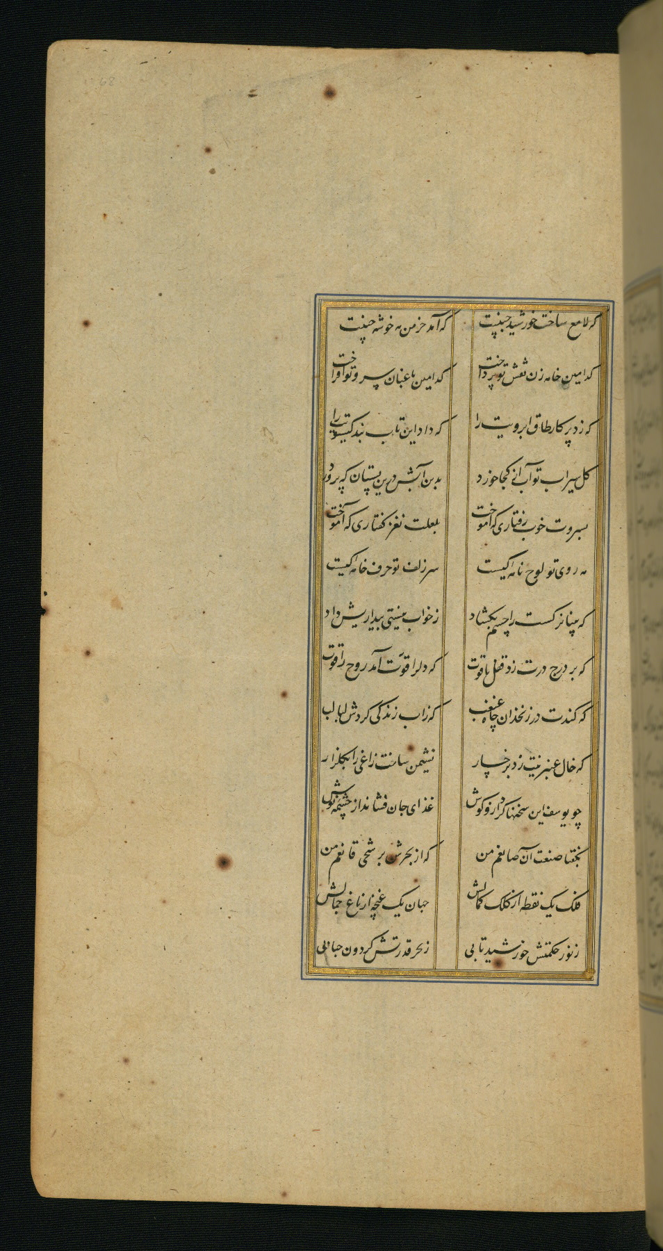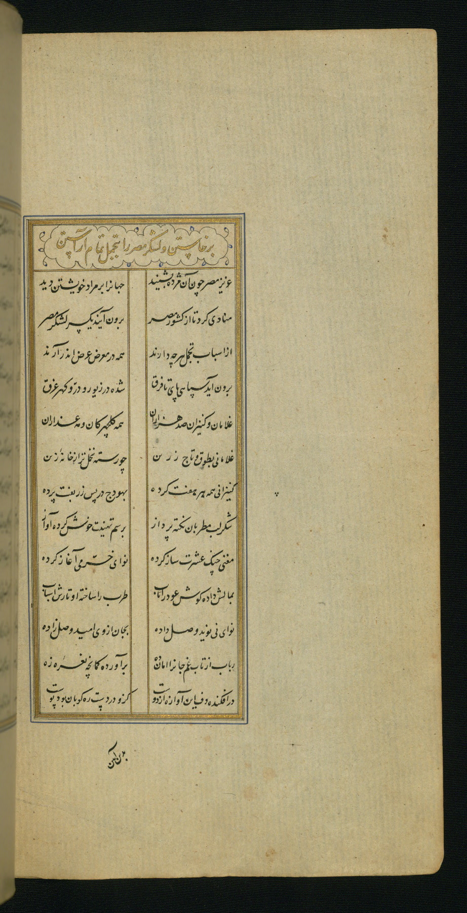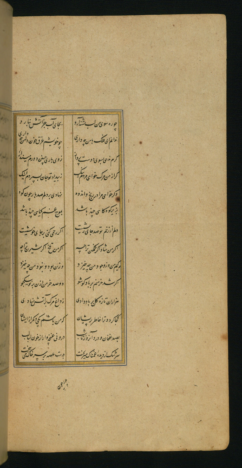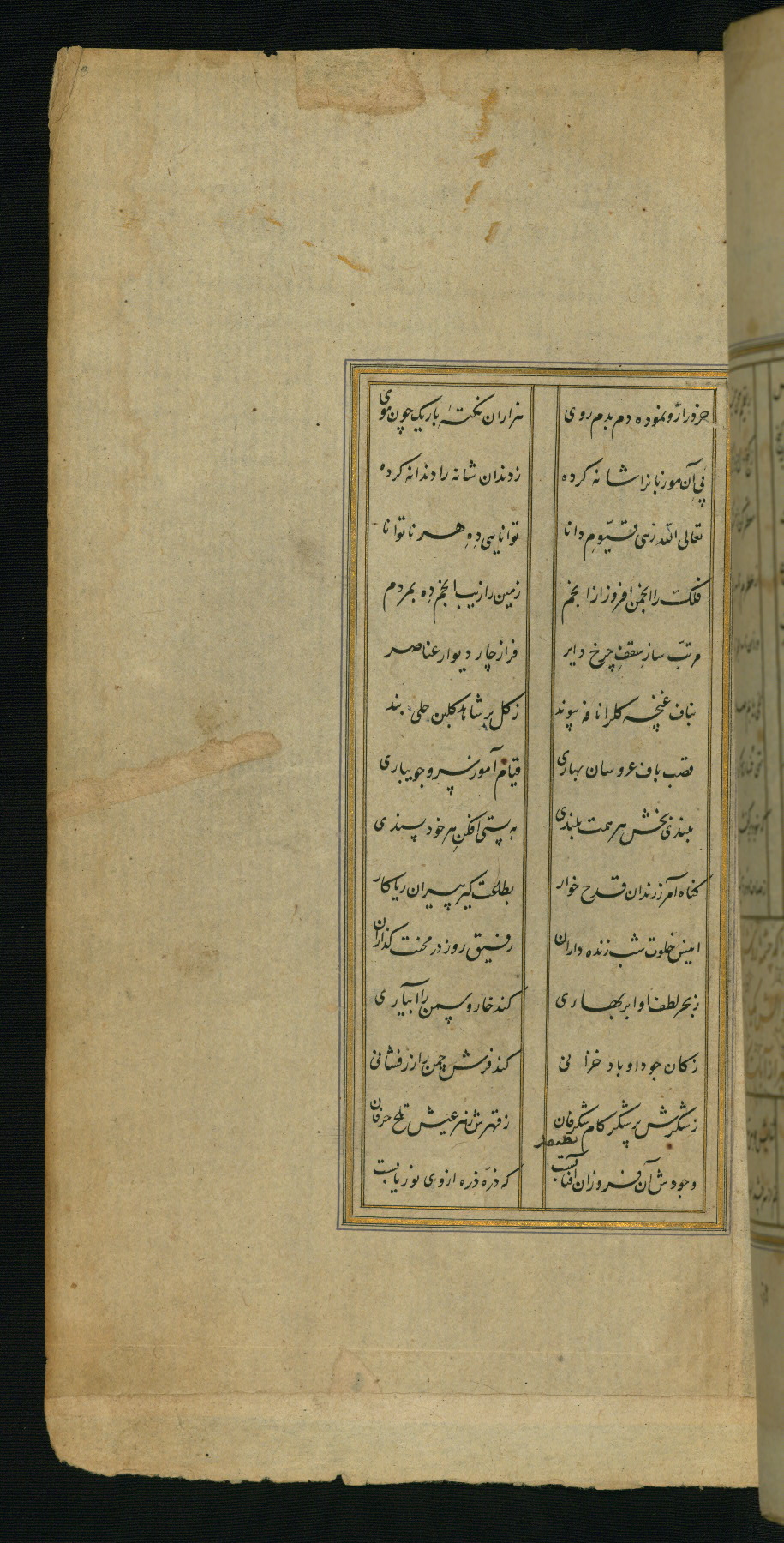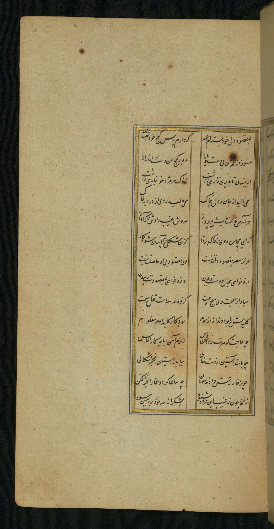 This is an illustrated and illuminated Safavid copy of Joseph (Yūsuf) and Zulaykhā by Nūr al-Dīn Jāmī (d. 898 AH / 1492 CE), executed in Iran in the early tenth century AH / sixteenth CE. The codex opens with a double-page illuminated incipit (fols. 1b-2a) containing the first verses of the work, the title, and the author's name. There are eight paintings illustrating the text. The binding is slightly later than the manuscript.