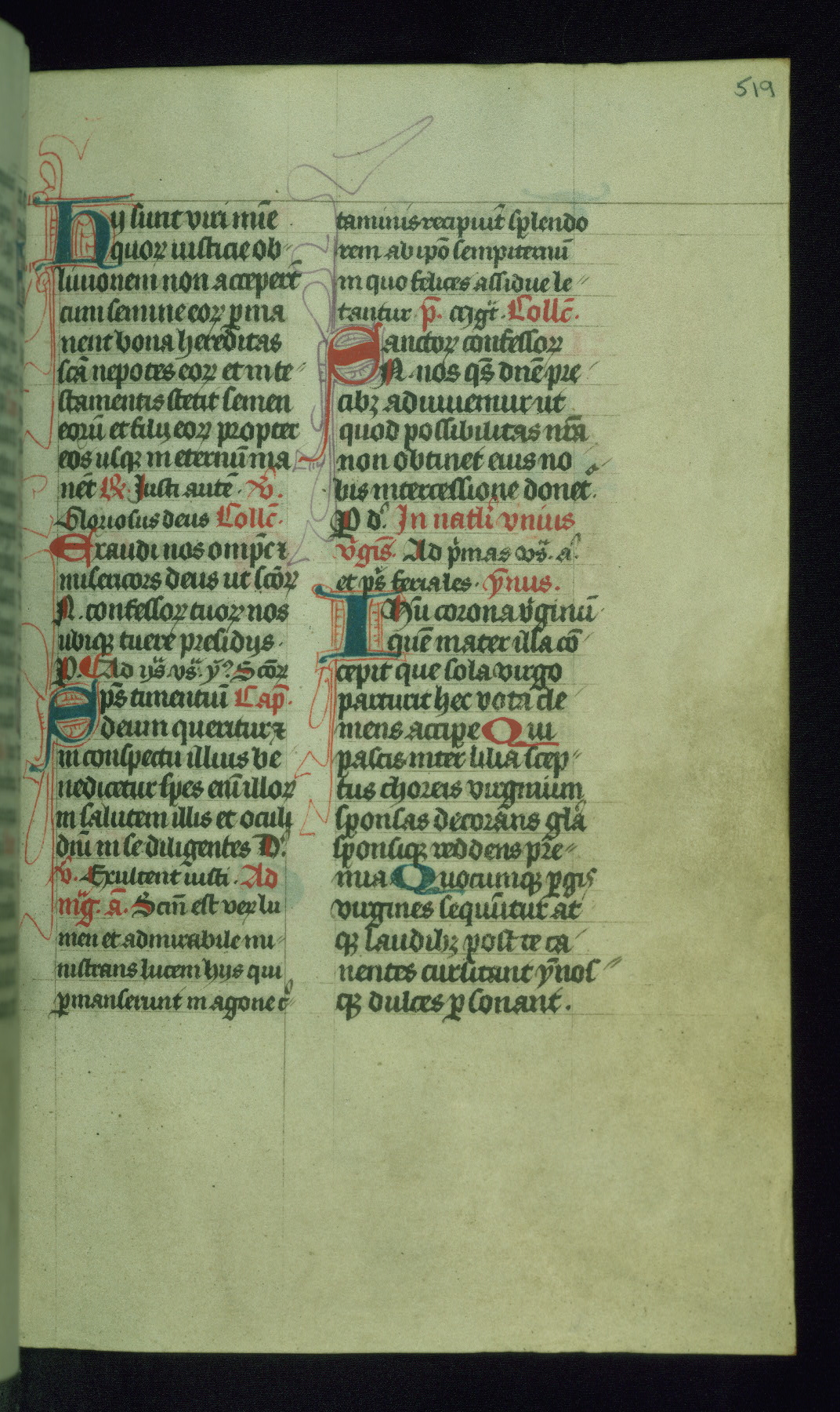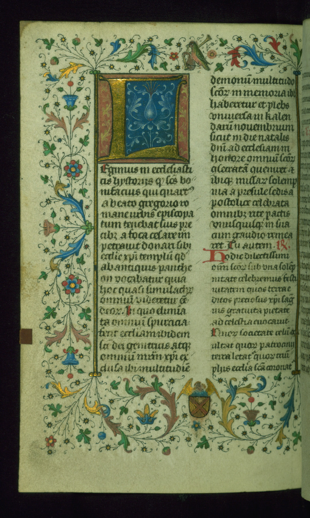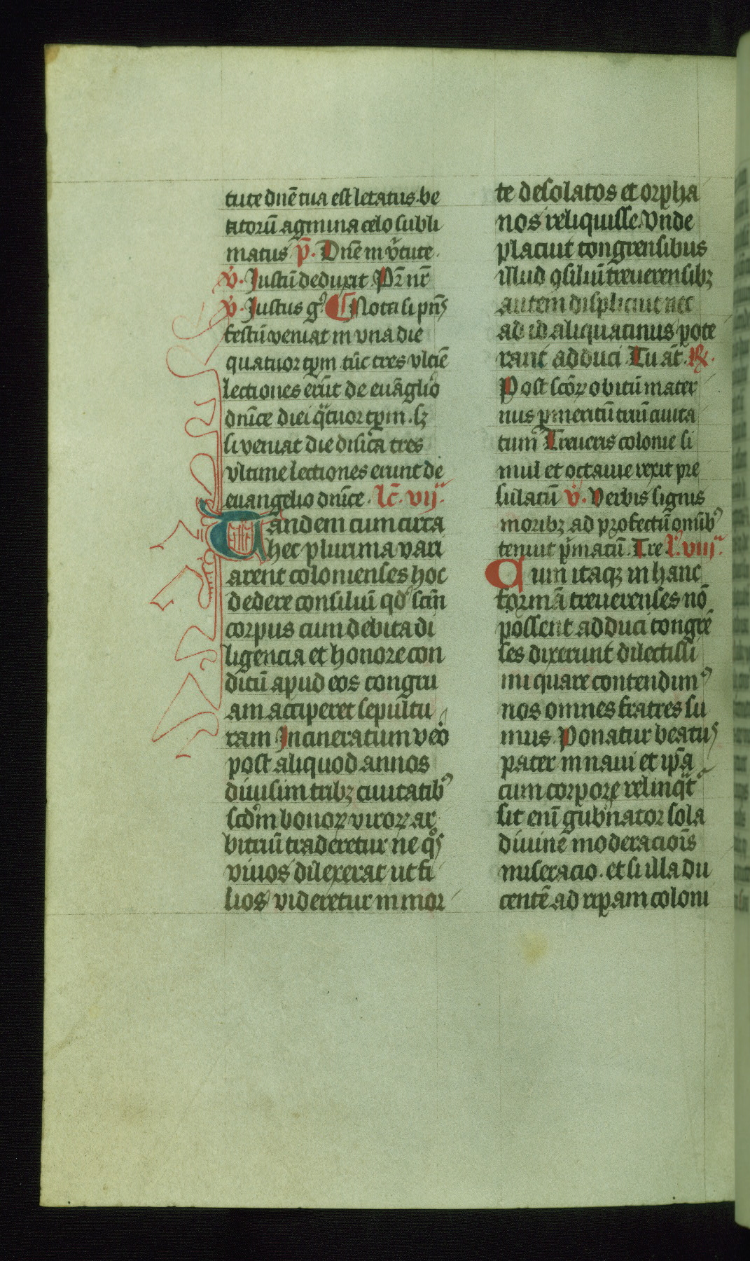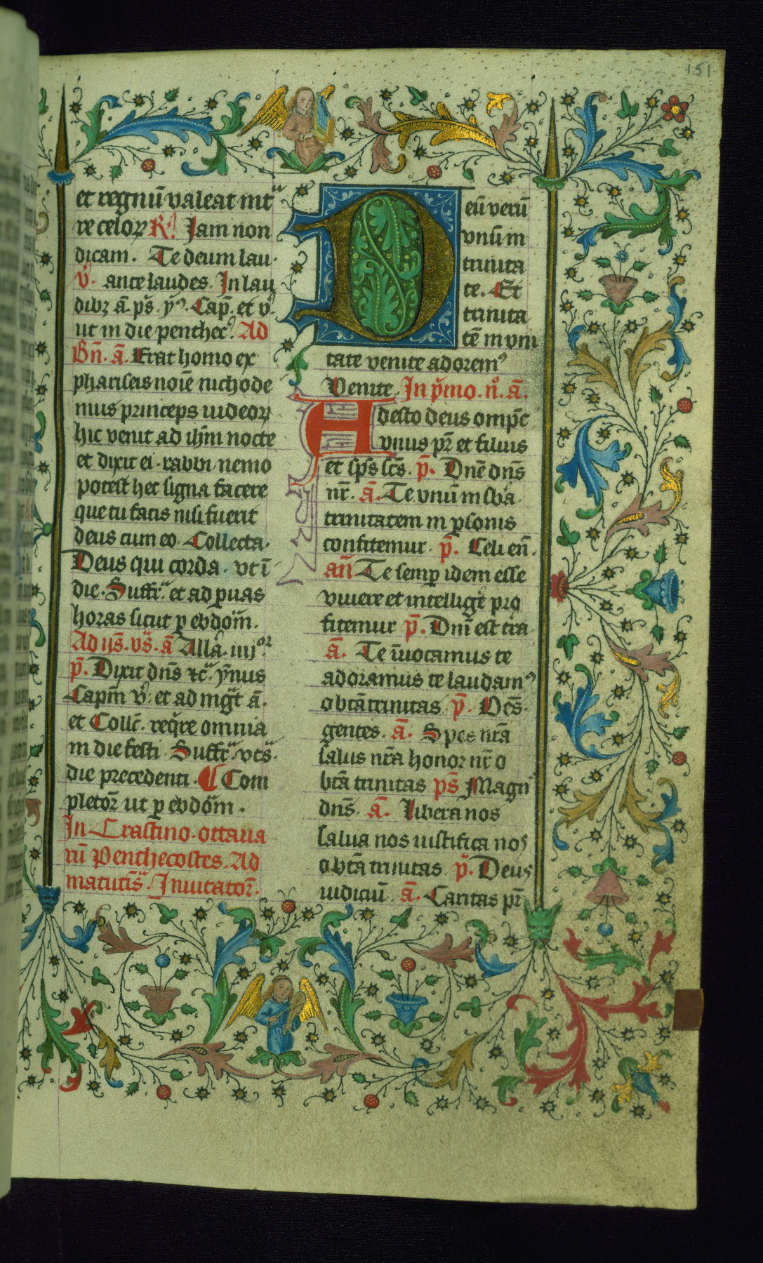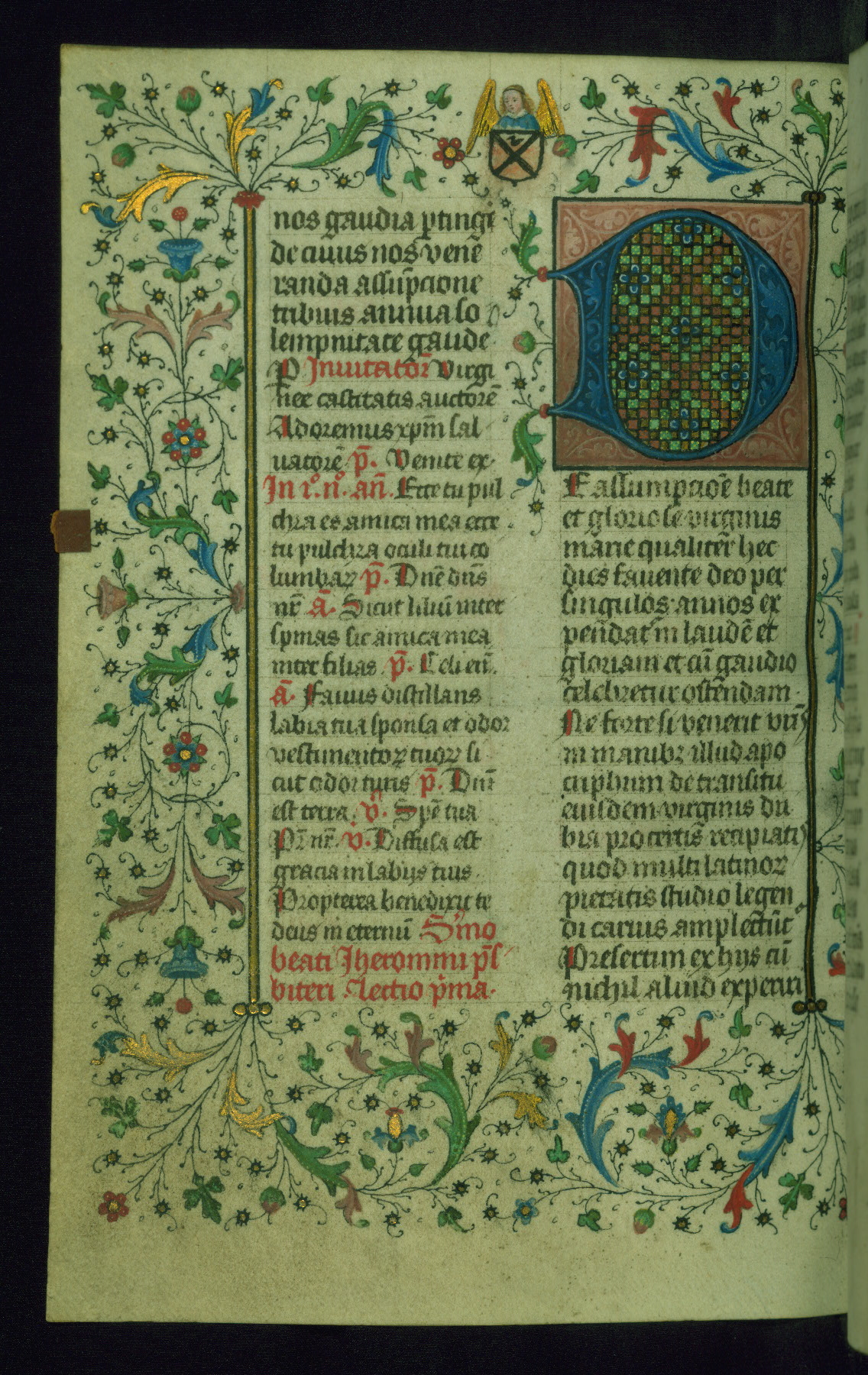 This small breviary, composed of more than 500 folios, is extraordinary for its length, considering it is the summer portion of a two-volume breviary for the use of Liège. The manuscript was completed for ecclesiastical use at the Cathedral of Notre-Dame and St.-Lambert in Liège ca. 1420. This attribution is suggested, for instance, by the petitions to the congregation of this cathedral (fols. 114v-117v), as well as the armorial shield of the family of Surlet de Chokier of Liège represented at the opening of the Psalms. The manuscript has modest, but interesting, decoration with historiated and decorated initials marking the liturgical texts, and occasional angels playing instruments in the margins. The most notable pictorial effect is found in the initials inhabited by transparent figures on rich blue ground. The technique is found, for instance, on fol. 156r with the gold monstrance held by translucent angels for the feast of the Corpus Christi.