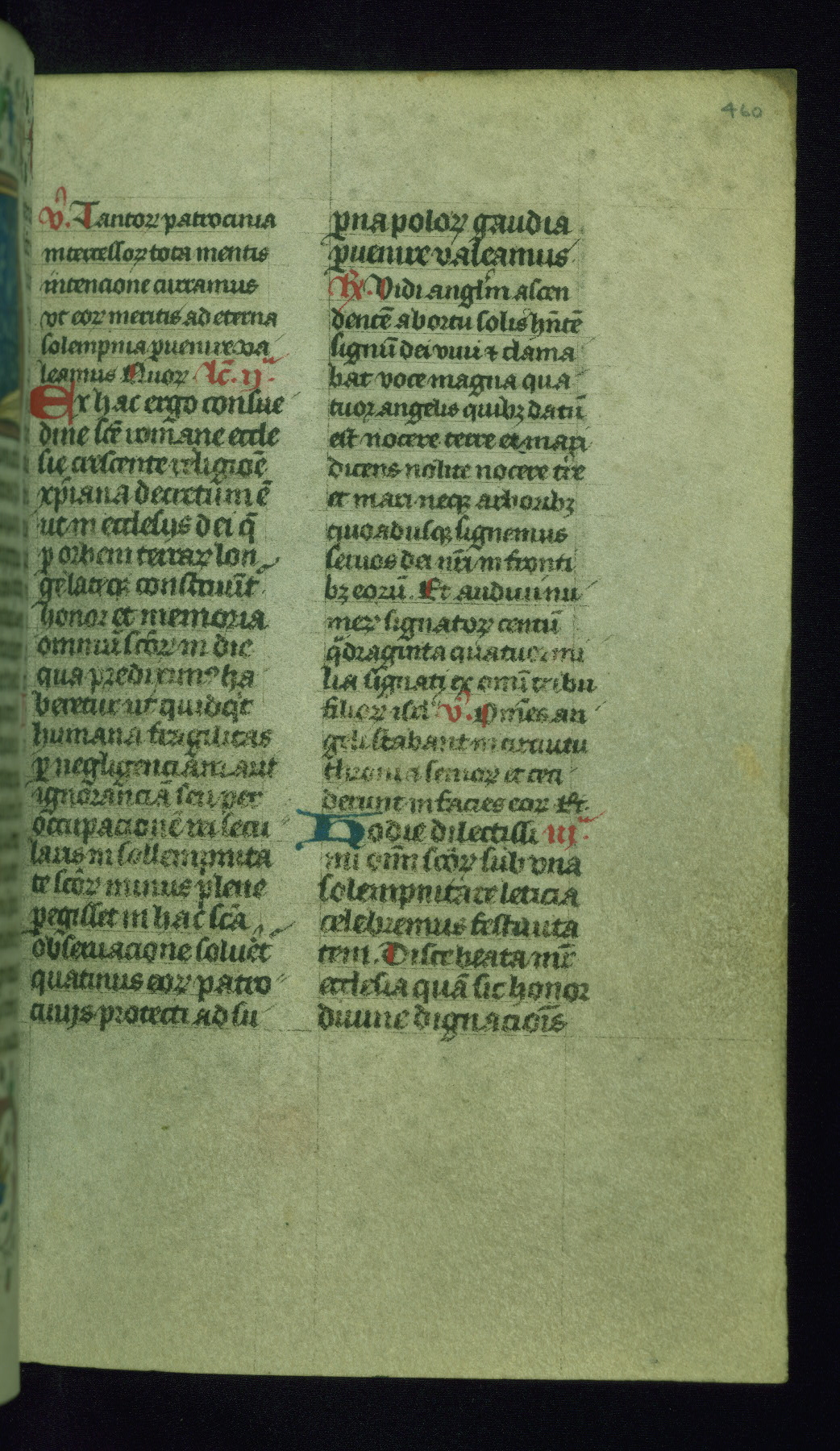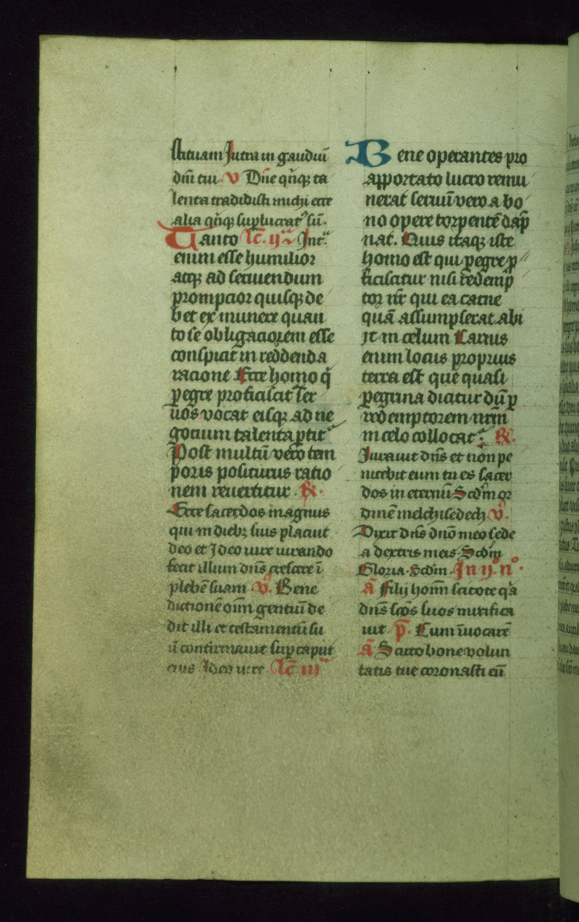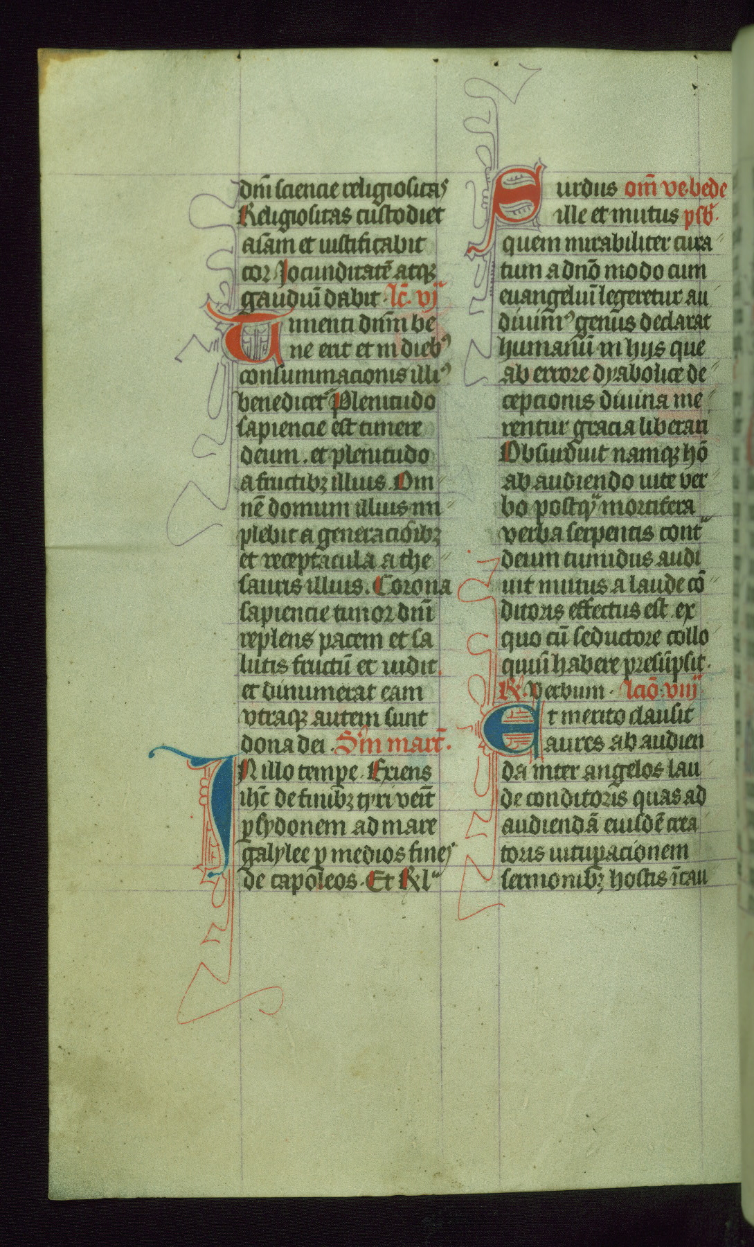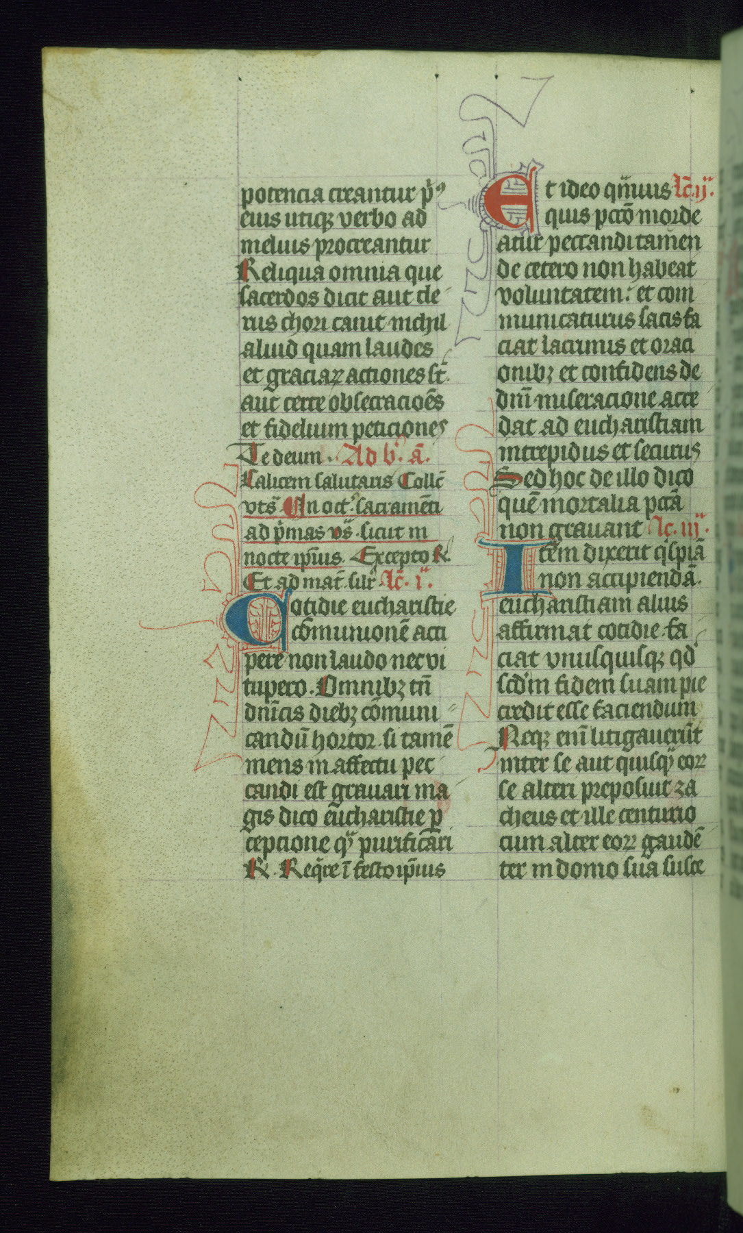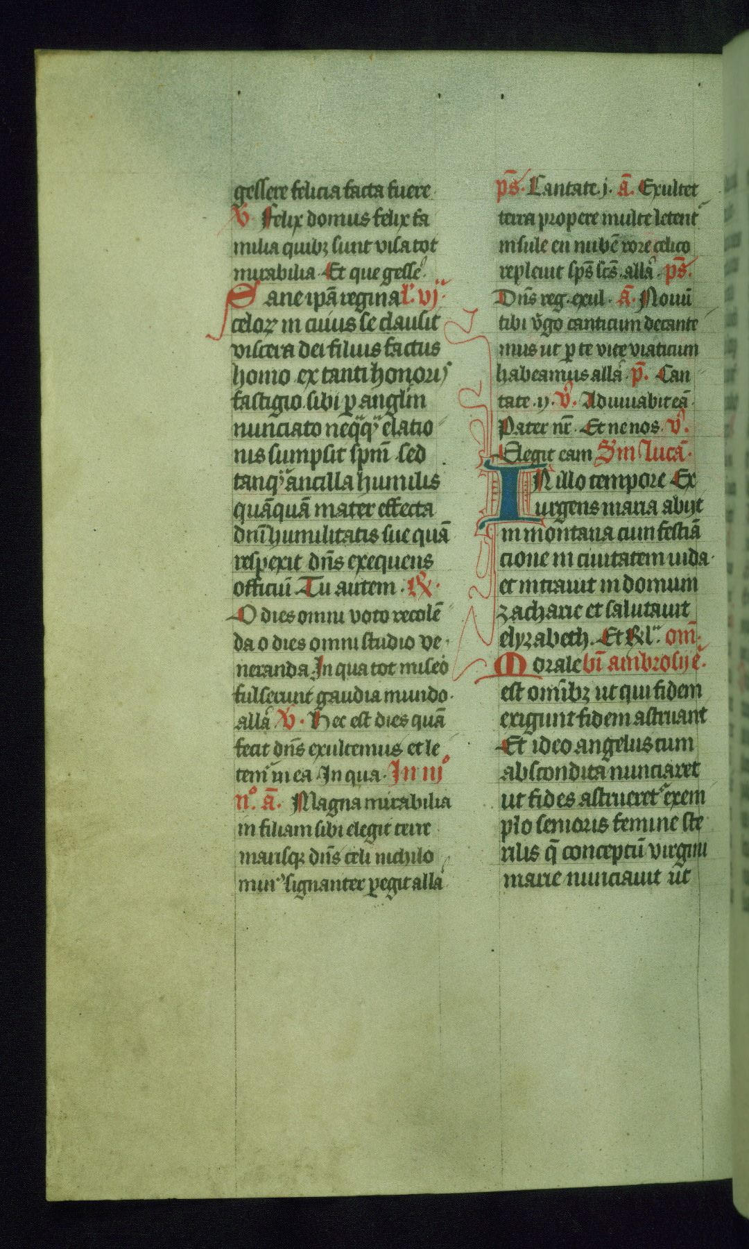 This small breviary, composed of more than 500 folios, is extraordinary for its length, considering it is the summer portion of a two-volume breviary for the use of Liège. The manuscript was completed for ecclesiastical use at the Cathedral of Notre-Dame and St.-Lambert in Liège ca. 1420. This attribution is suggested, for instance, by the petitions to the congregation of this cathedral (fols. 114v-117v), as well as the armorial shield of the family of Surlet de Chokier of Liège represented at the opening of the Psalms. The manuscript has modest, but interesting, decoration with historiated and decorated initials marking the liturgical texts, and occasional angels playing instruments in the margins. The most notable pictorial effect is found in the initials inhabited by transparent figures on rich blue ground. The technique is found, for instance, on fol. 156r with the gold monstrance held by translucent angels for the feast of the Corpus Christi.