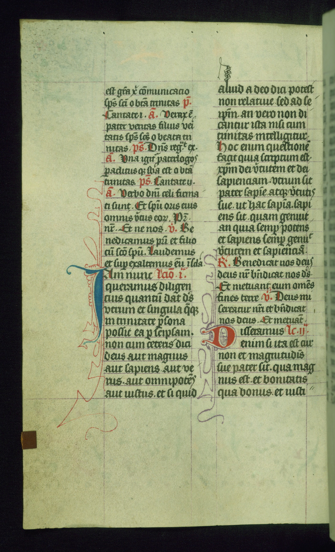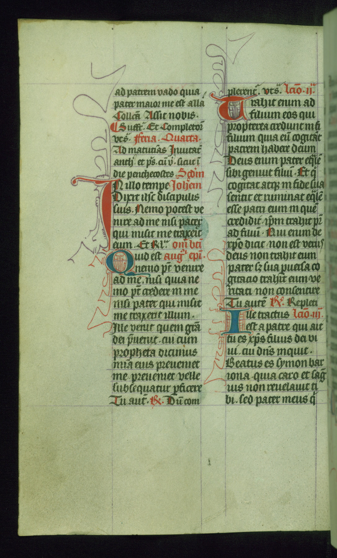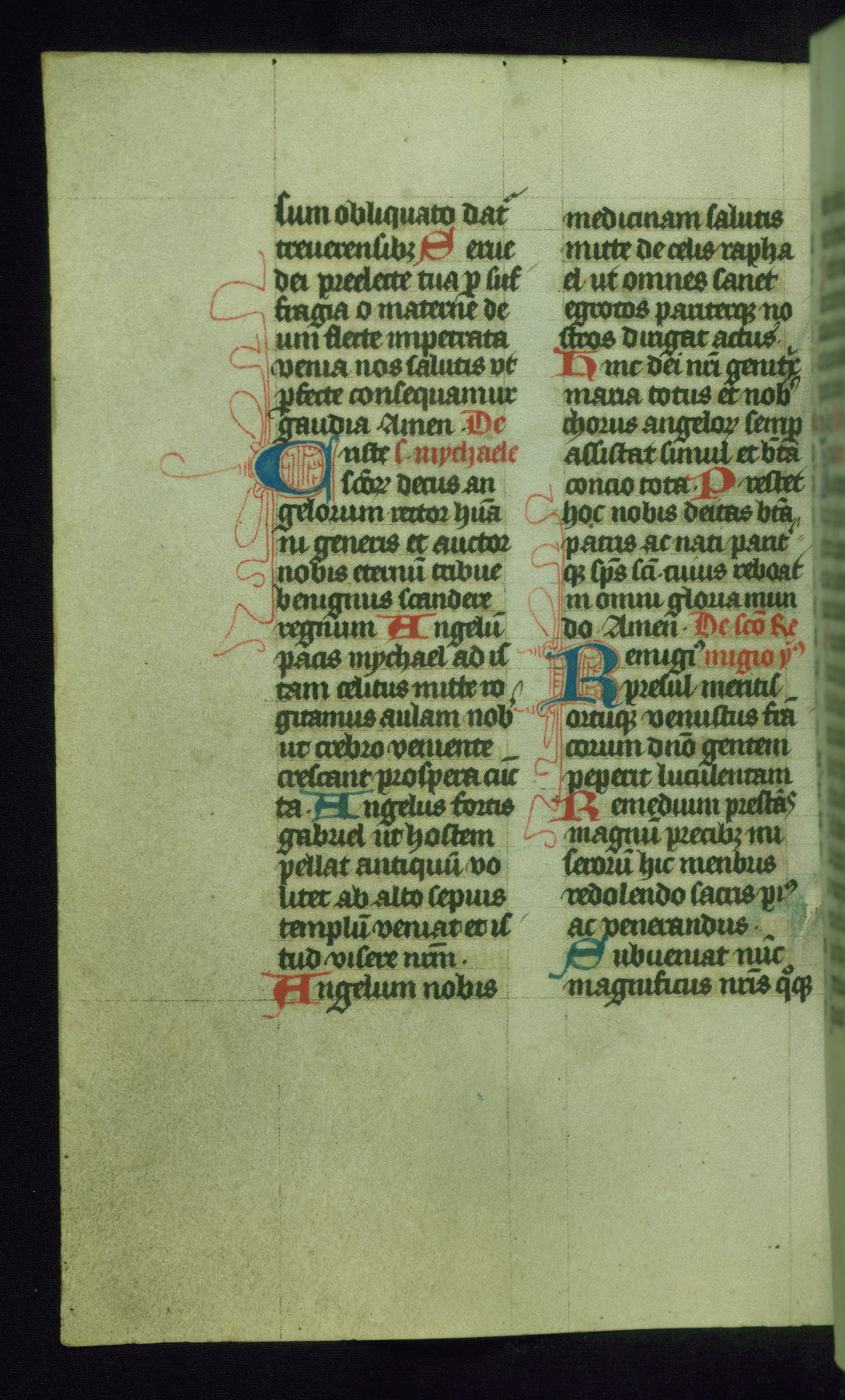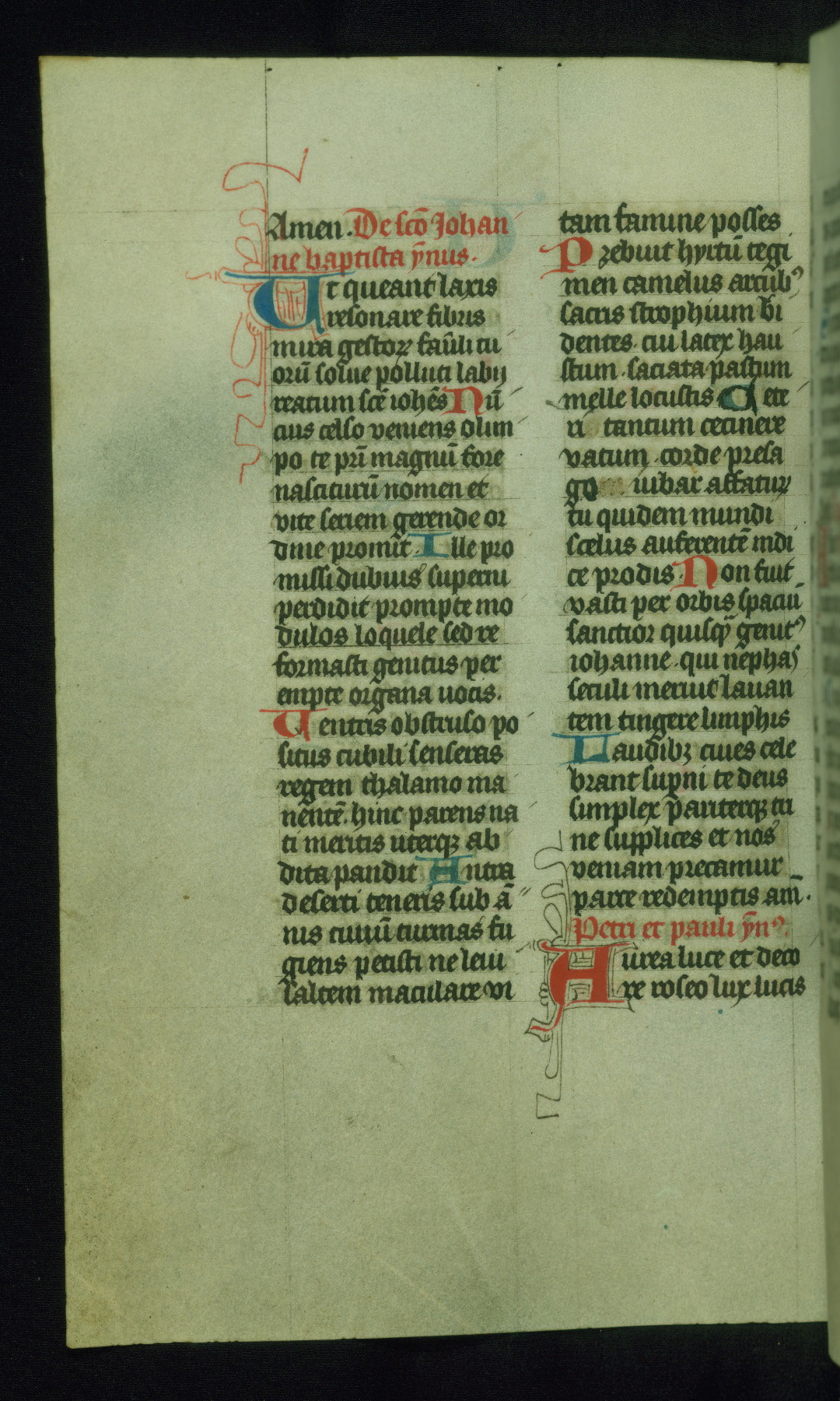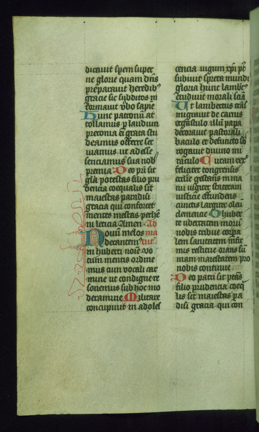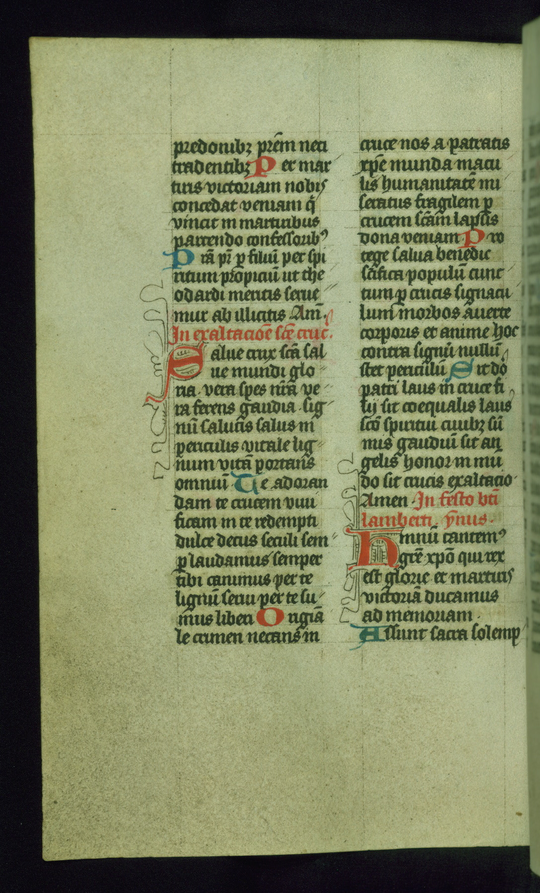 This small breviary, composed of more than 500 folios, is extraordinary for its length, considering it is the summer portion of a two-volume breviary for the use of Liège. The manuscript was completed for ecclesiastical use at the Cathedral of Notre-Dame and St.-Lambert in Liège ca. 1420. This attribution is suggested, for instance, by the petitions to the congregation of this cathedral (fols. 114v-117v), as well as the armorial shield of the family of Surlet de Chokier of Liège represented at the opening of the Psalms. The manuscript has modest, but interesting, decoration with historiated and decorated initials marking the liturgical texts, and occasional angels playing instruments in the margins. The most notable pictorial effect is found in the initials inhabited by transparent figures on rich blue ground. The technique is found, for instance, on fol. 156r with the gold monstrance held by translucent angels for the feast of the Corpus Christi.