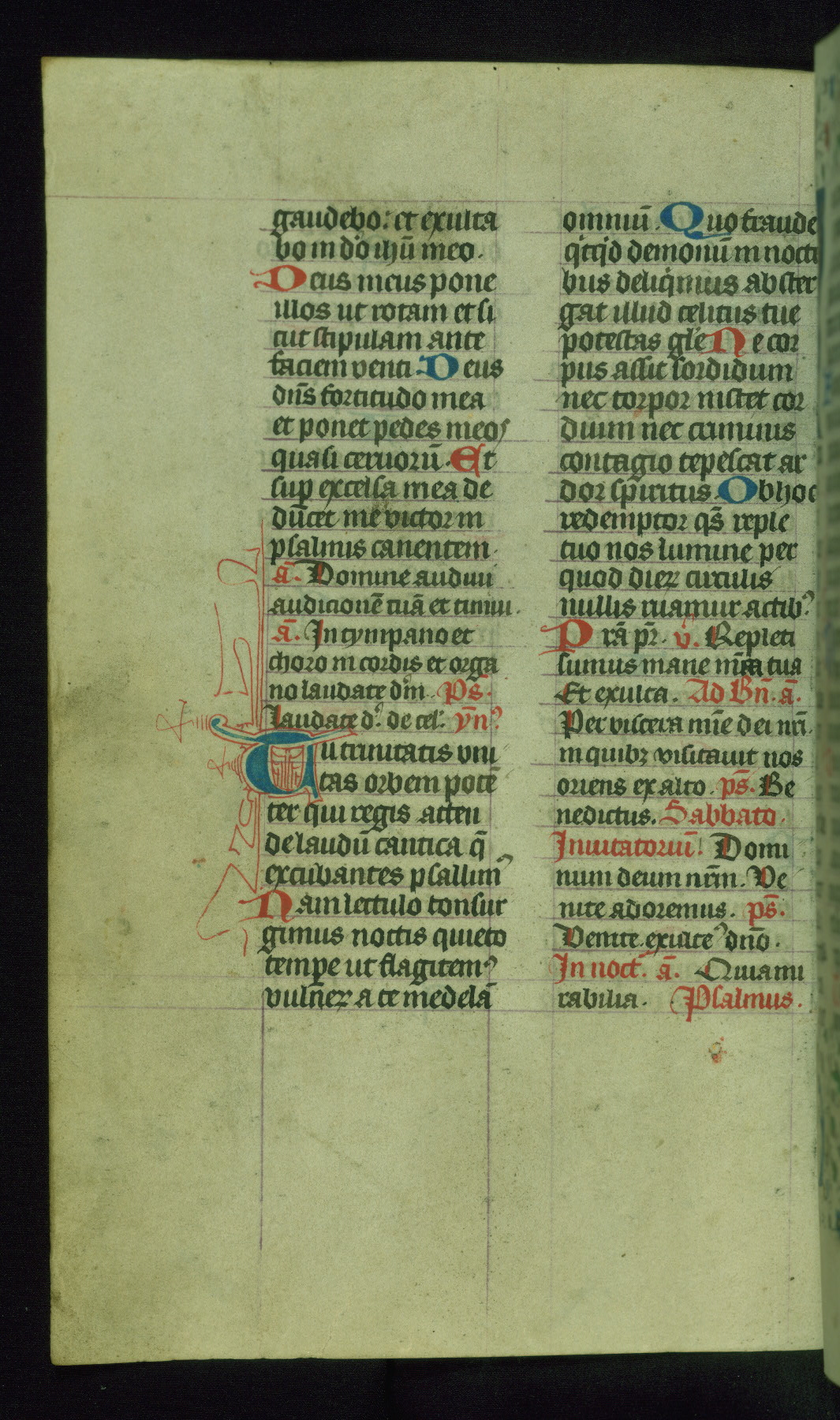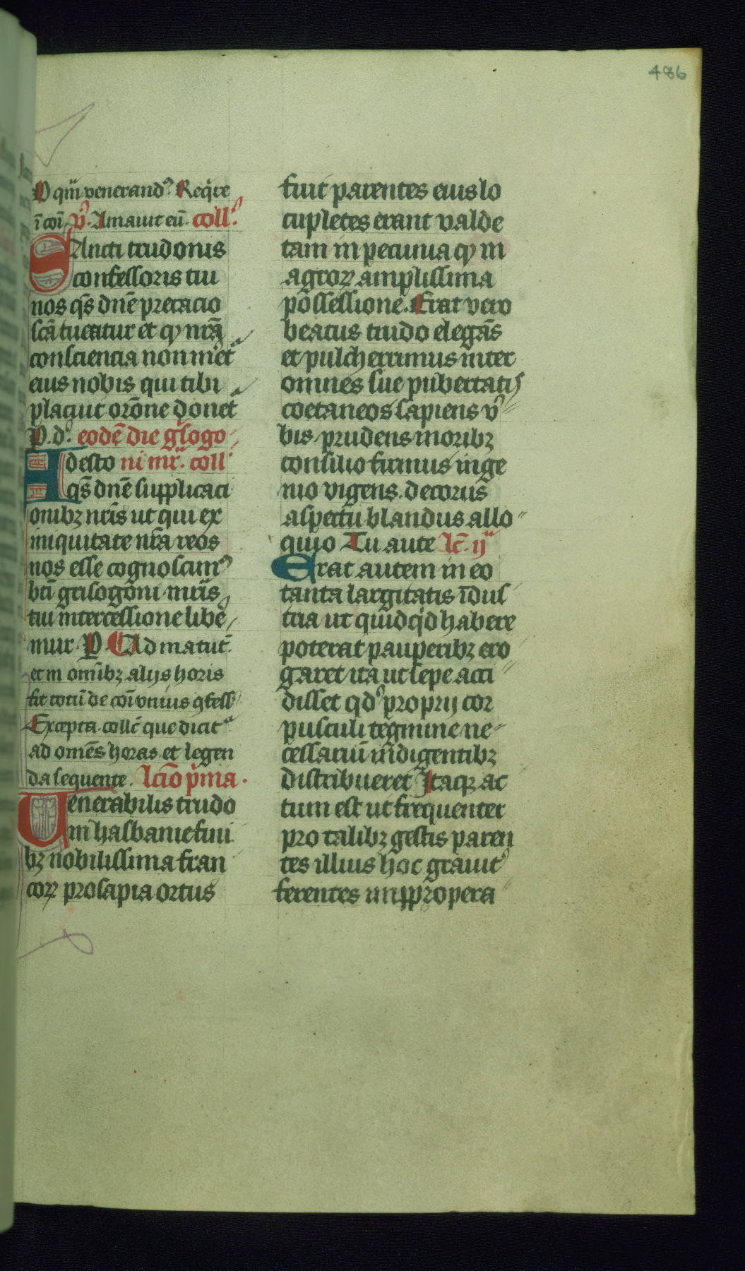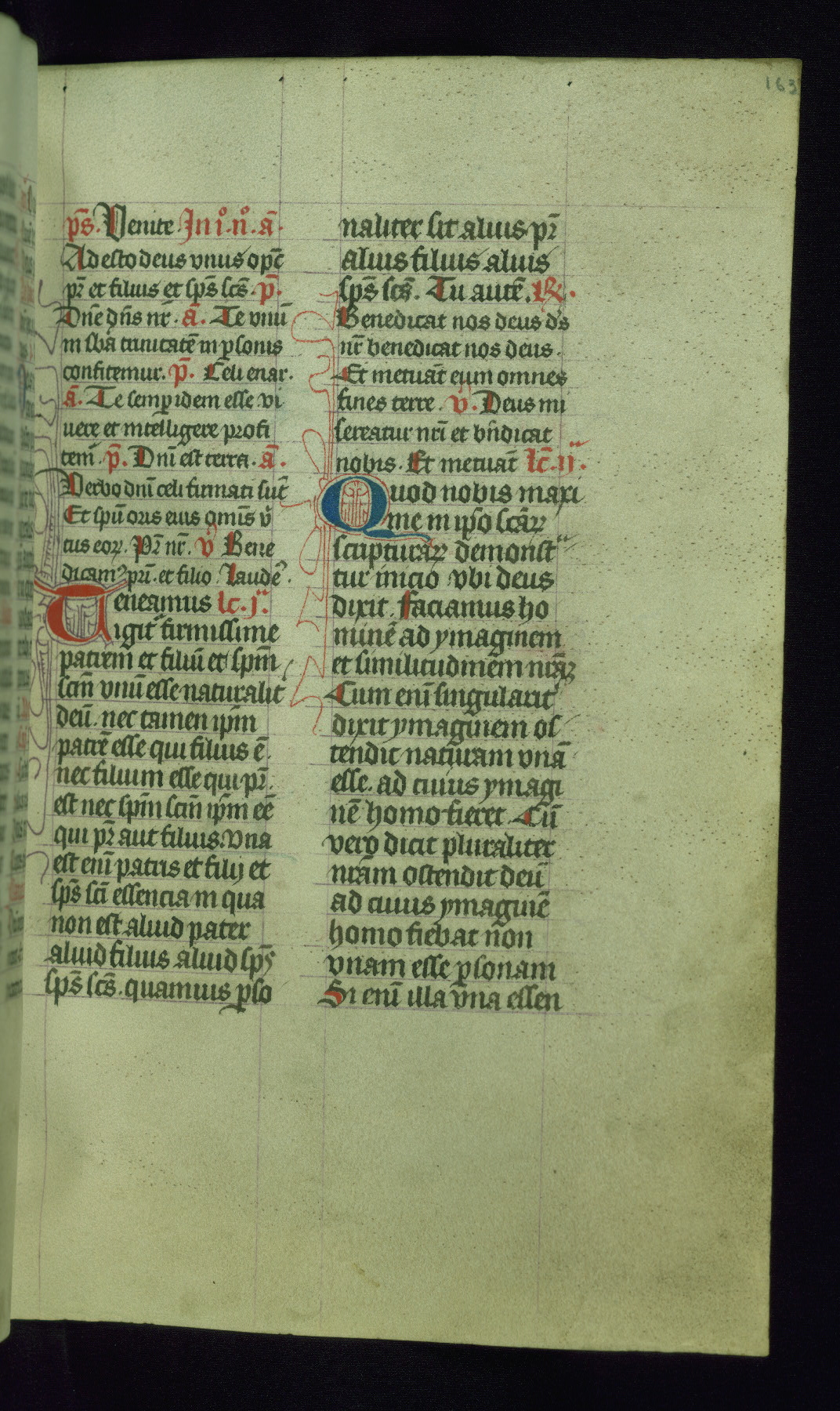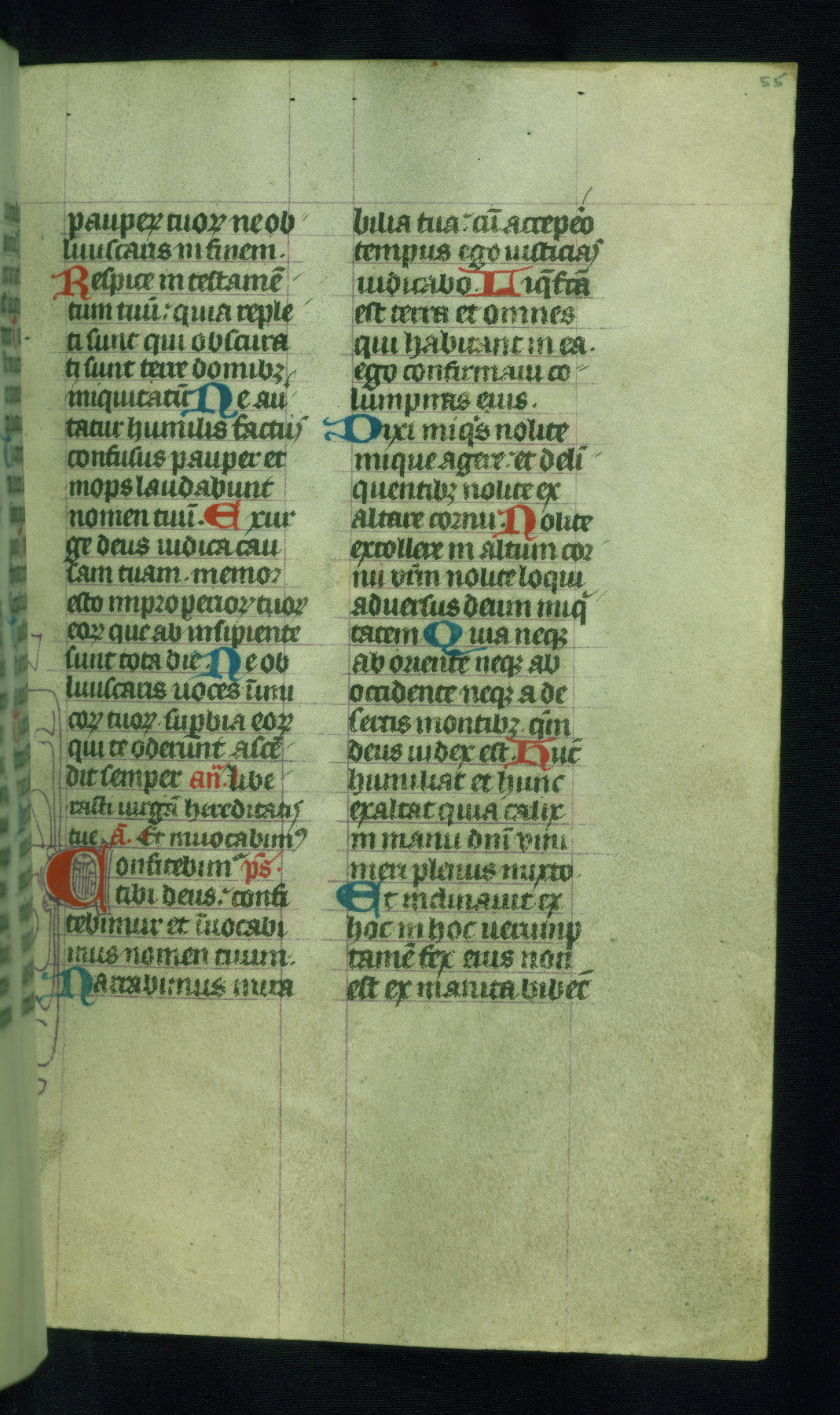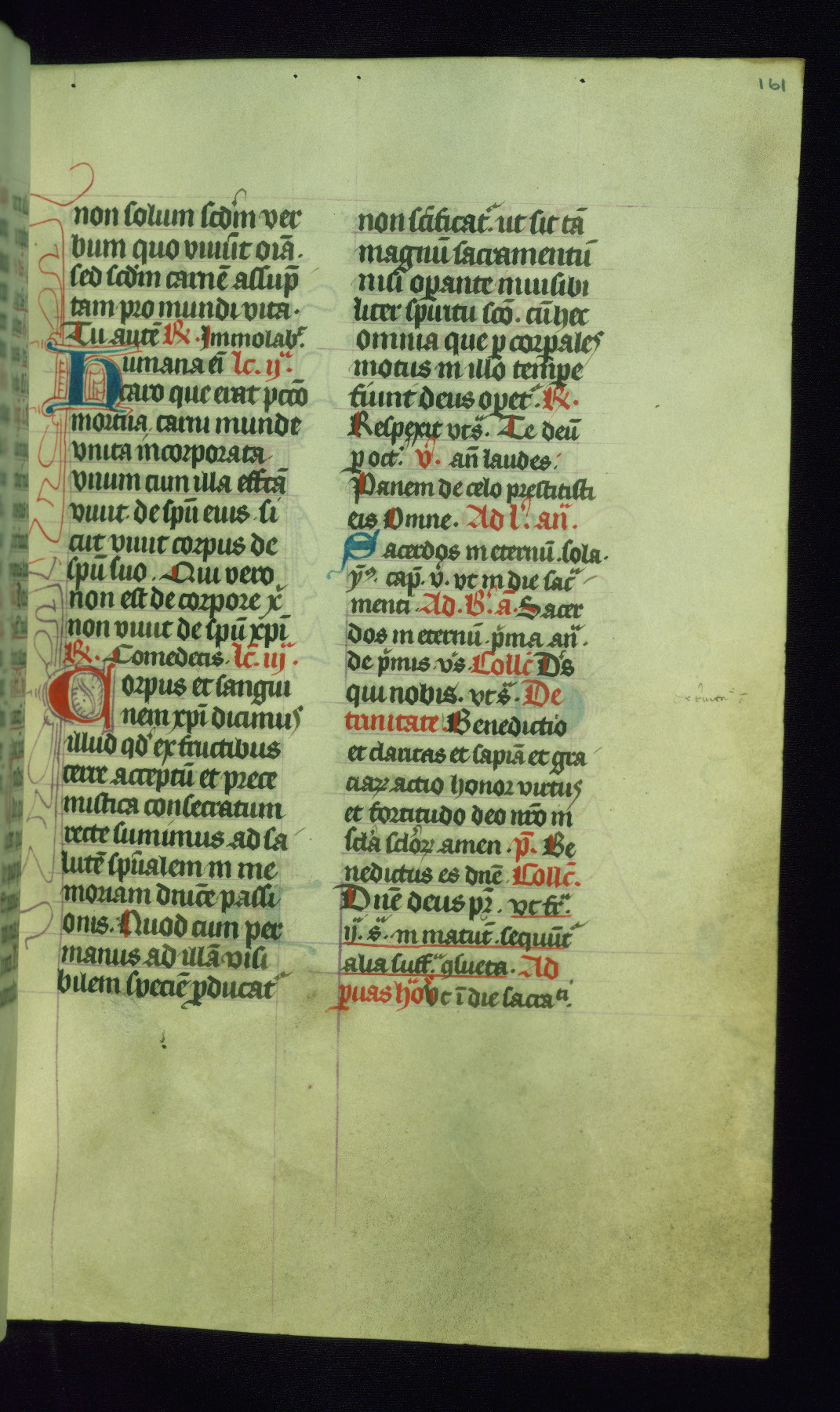 This small breviary, composed of more than 500 folios, is extraordinary for its length, considering it is the summer portion of a two-volume breviary for the use of Liège. The manuscript was completed for ecclesiastical use at the Cathedral of Notre-Dame and St.-Lambert in Liège ca. 1420. This attribution is suggested, for instance, by the petitions to the congregation of this cathedral (fols. 114v-117v), as well as the armorial shield of the family of Surlet de Chokier of Liège represented at the opening of the Psalms. The manuscript has modest, but interesting, decoration with historiated and decorated initials marking the liturgical texts, and occasional angels playing instruments in the margins. The most notable pictorial effect is found in the initials inhabited by transparent figures on rich blue ground. The technique is found, for instance, on fol. 156r with the gold monstrance held by translucent angels for the feast of the Corpus Christi.