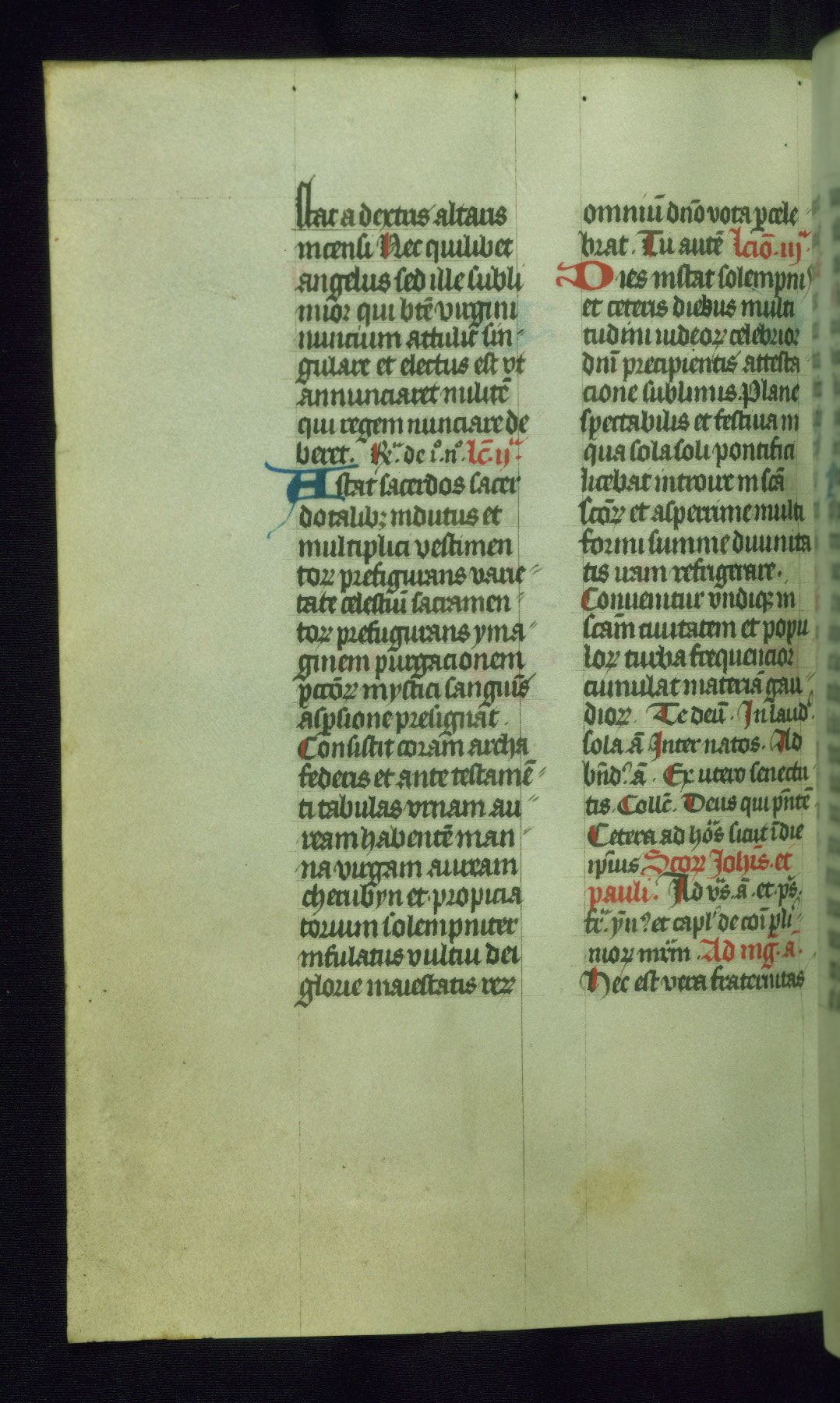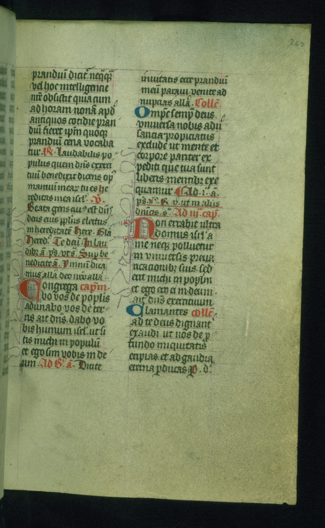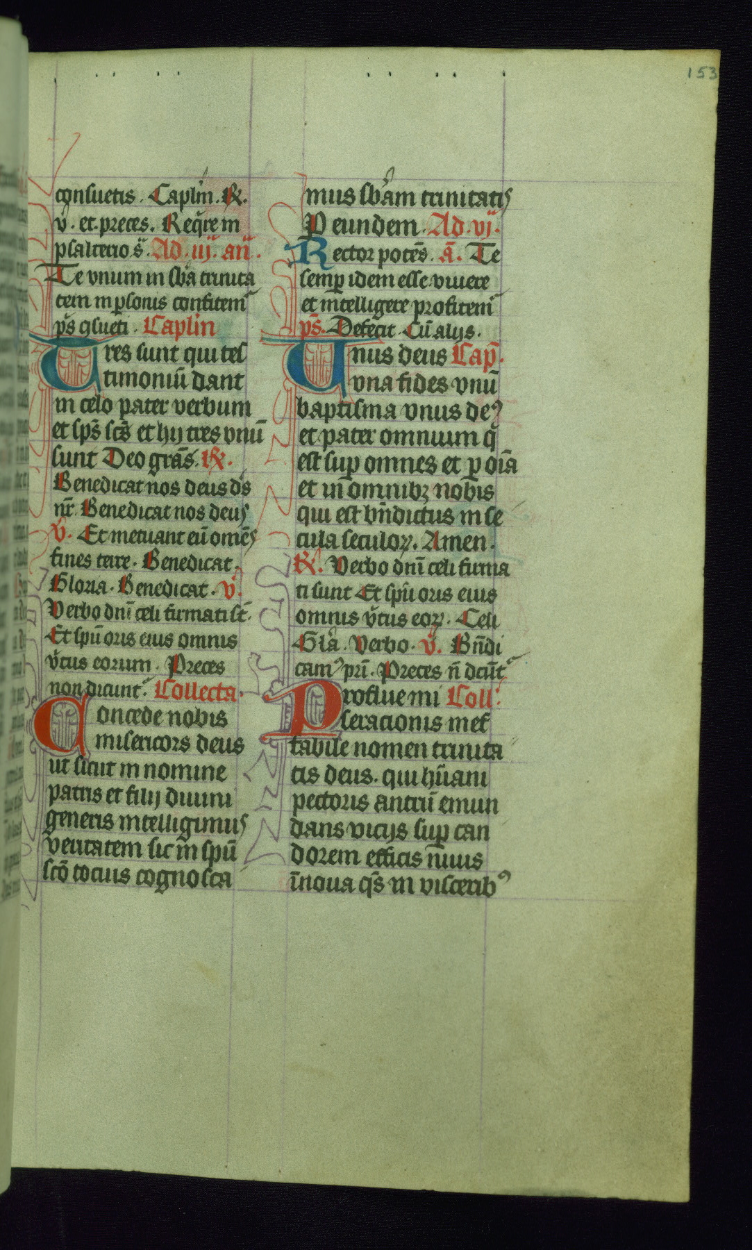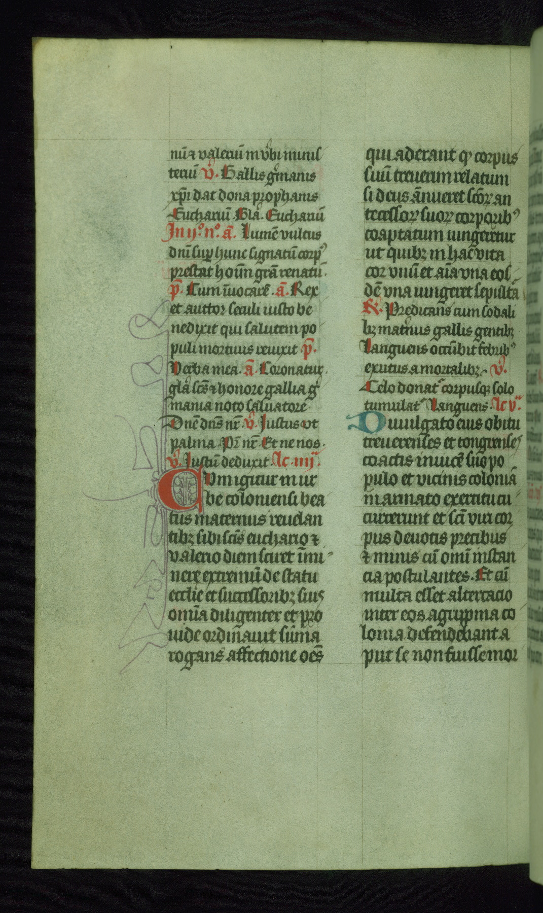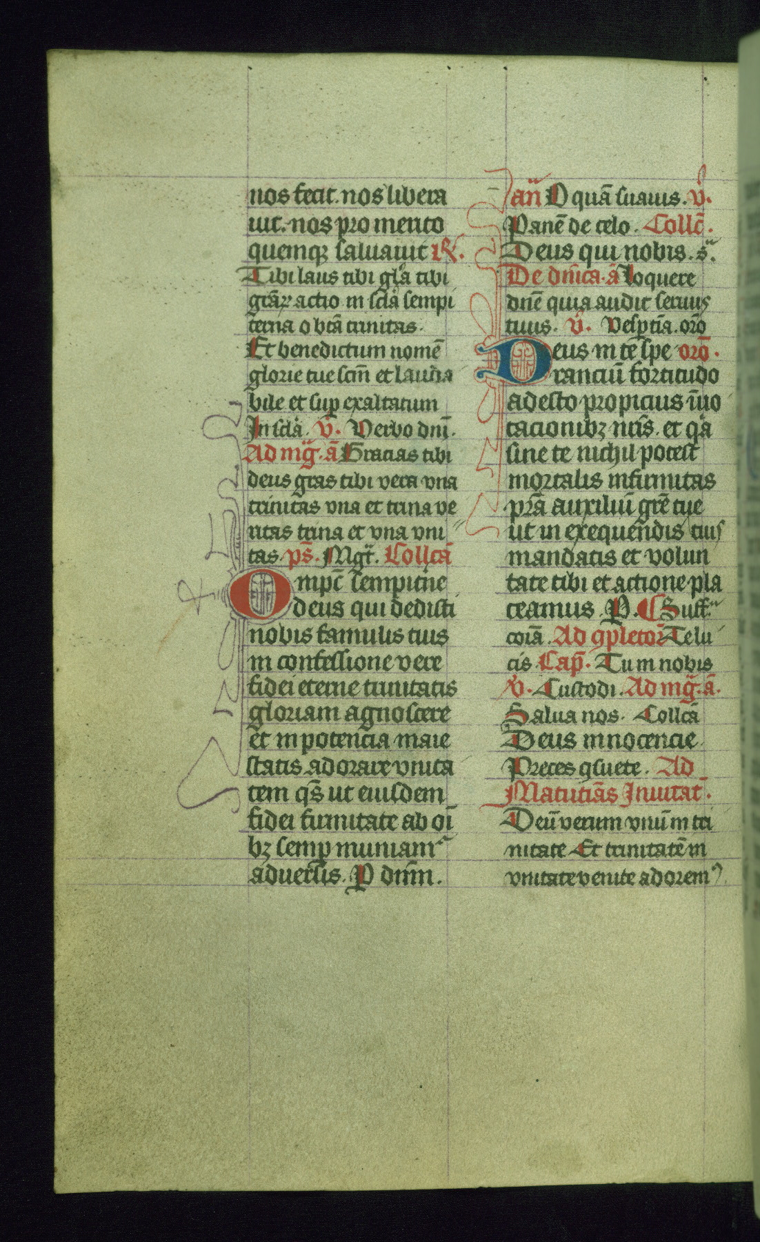 This small breviary, composed of more than 500 folios, is extraordinary for its length, considering it is the summer portion of a two-volume breviary for the use of Liège. The manuscript was completed for ecclesiastical use at the Cathedral of Notre-Dame and St.-Lambert in Liège ca. 1420. This attribution is suggested, for instance, by the petitions to the congregation of this cathedral (fols. 114v-117v), as well as the armorial shield of the family of Surlet de Chokier of Liège represented at the opening of the Psalms. The manuscript has modest, but interesting, decoration with historiated and decorated initials marking the liturgical texts, and occasional angels playing instruments in the margins. The most notable pictorial effect is found in the initials inhabited by transparent figures on rich blue ground. The technique is found, for instance, on fol. 156r with the gold monstrance held by translucent angels for the feast of the Corpus Christi.