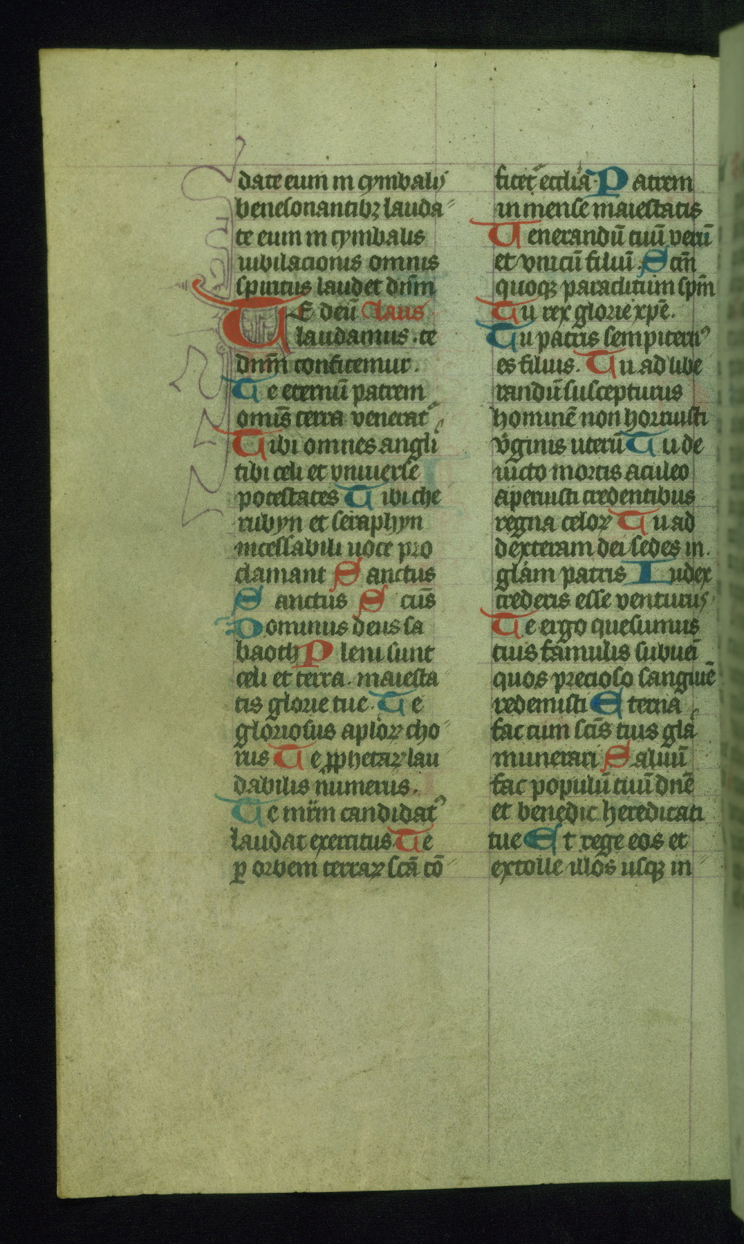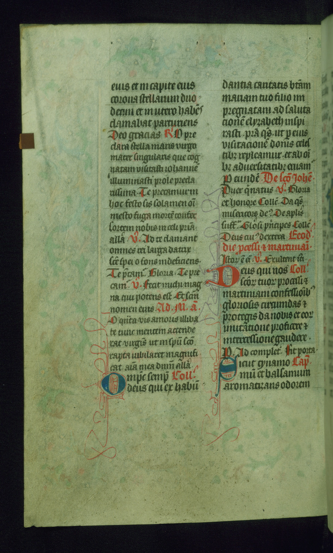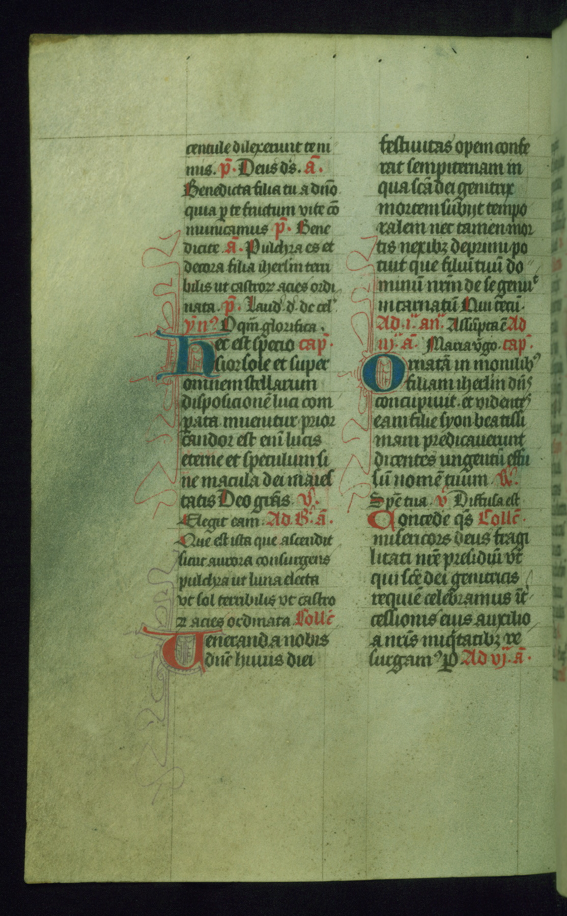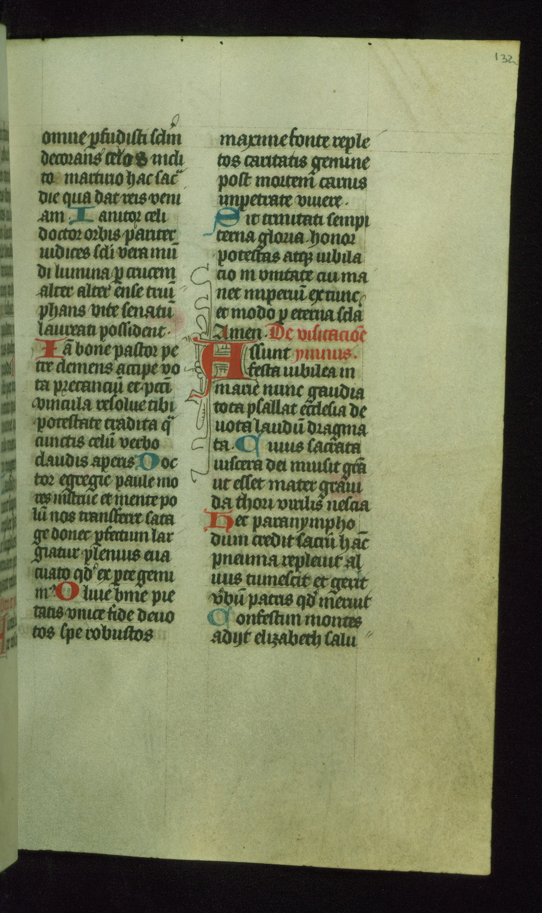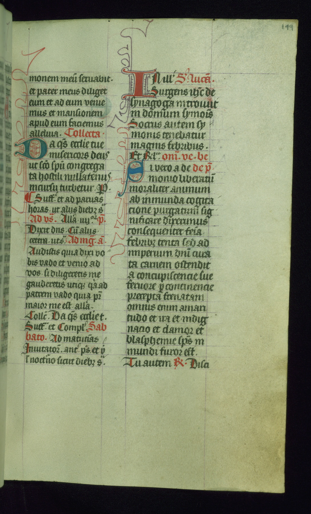 This small breviary, composed of more than 500 folios, is extraordinary for its length, considering it is the summer portion of a two-volume breviary for the use of Liège. The manuscript was completed for ecclesiastical use at the Cathedral of Notre-Dame and St.-Lambert in Liège ca. 1420. This attribution is suggested, for instance, by the petitions to the congregation of this cathedral (fols. 114v-117v), as well as the armorial shield of the family of Surlet de Chokier of Liège represented at the opening of the Psalms. The manuscript has modest, but interesting, decoration with historiated and decorated initials marking the liturgical texts, and occasional angels playing instruments in the margins. The most notable pictorial effect is found in the initials inhabited by transparent figures on rich blue ground. The technique is found, for instance, on fol. 156r with the gold monstrance held by translucent angels for the feast of the Corpus Christi.