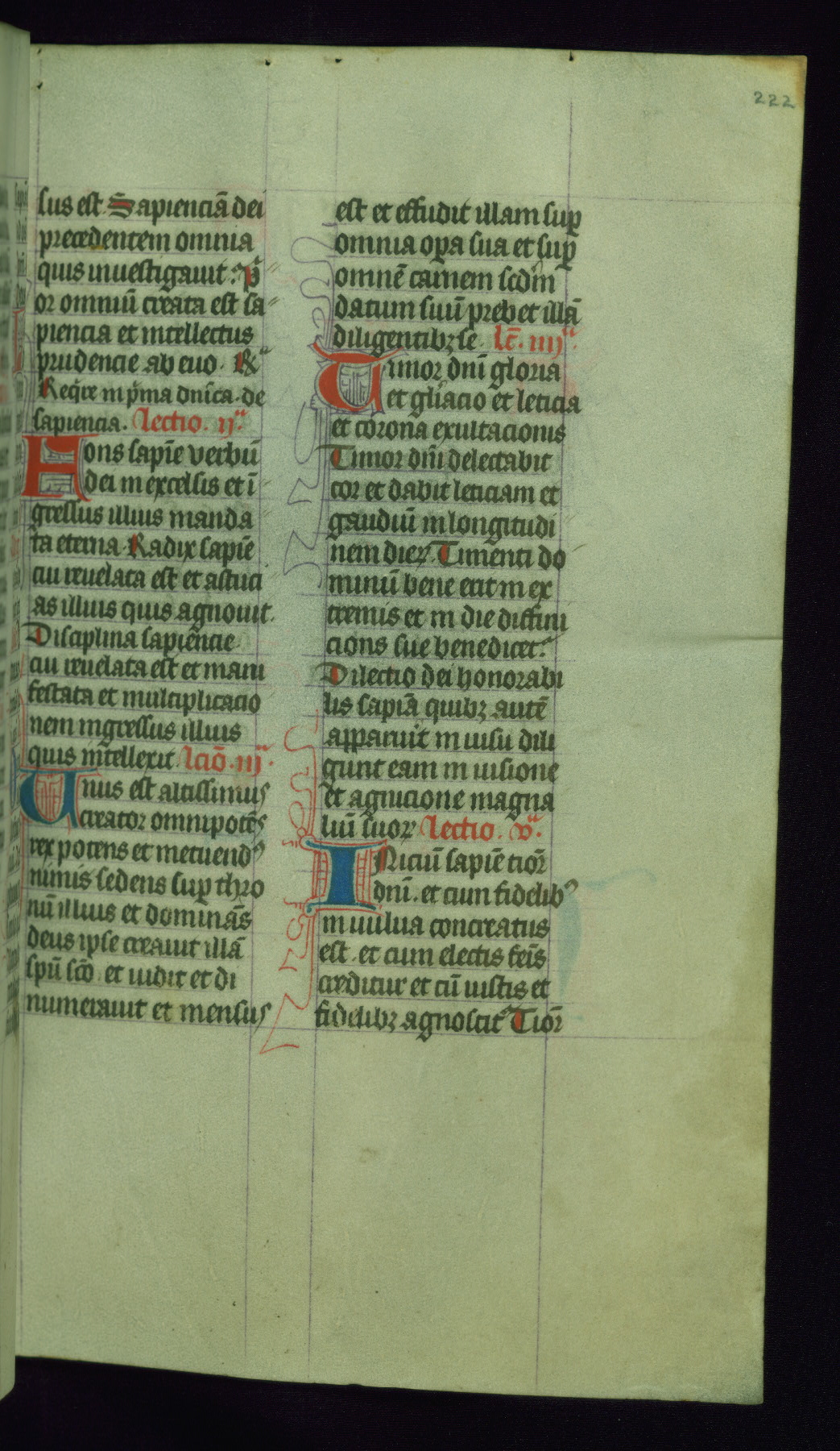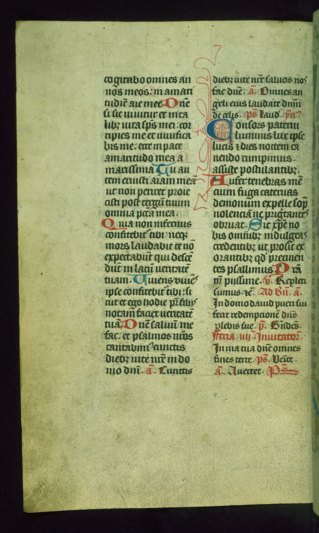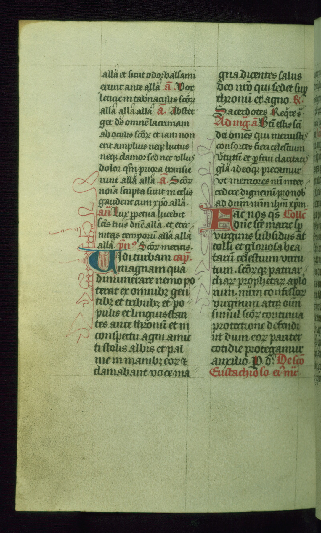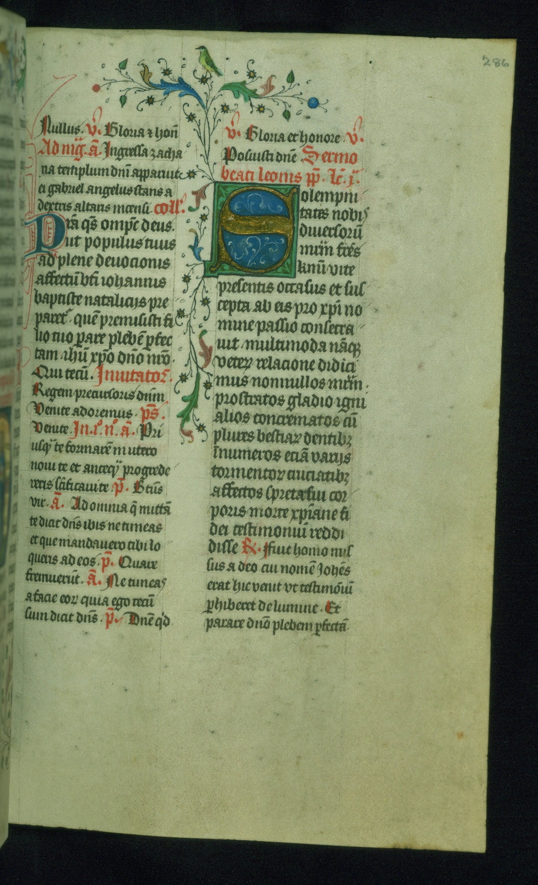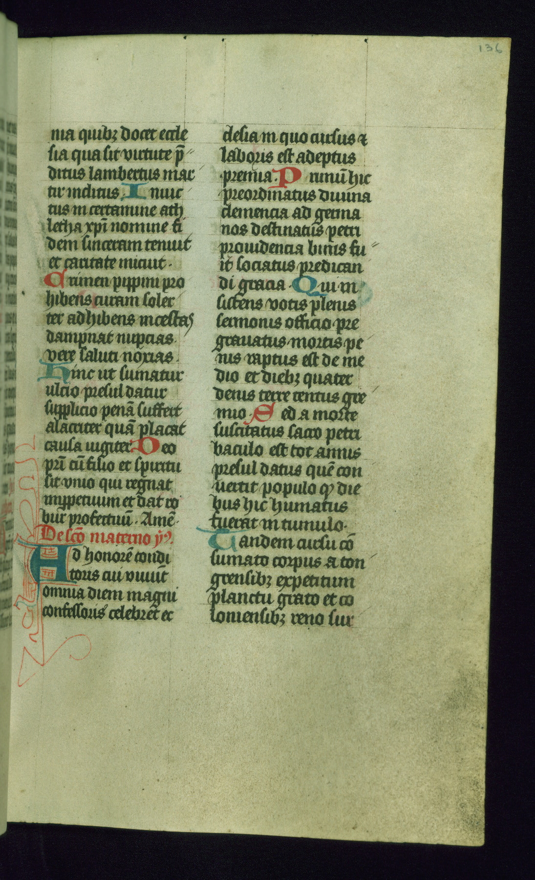 This small breviary, composed of more than 500 folios, is extraordinary for its length, considering it is the summer portion of a two-volume breviary for the use of Liège. The manuscript was completed for ecclesiastical use at the Cathedral of Notre-Dame and St.-Lambert in Liège ca. 1420. This attribution is suggested, for instance, by the petitions to the congregation of this cathedral (fols. 114v-117v), as well as the armorial shield of the family of Surlet de Chokier of Liège represented at the opening of the Psalms. The manuscript has modest, but interesting, decoration with historiated and decorated initials marking the liturgical texts, and occasional angels playing instruments in the margins. The most notable pictorial effect is found in the initials inhabited by transparent figures on rich blue ground. The technique is found, for instance, on fol. 156r with the gold monstrance held by translucent angels for the feast of the Corpus Christi.