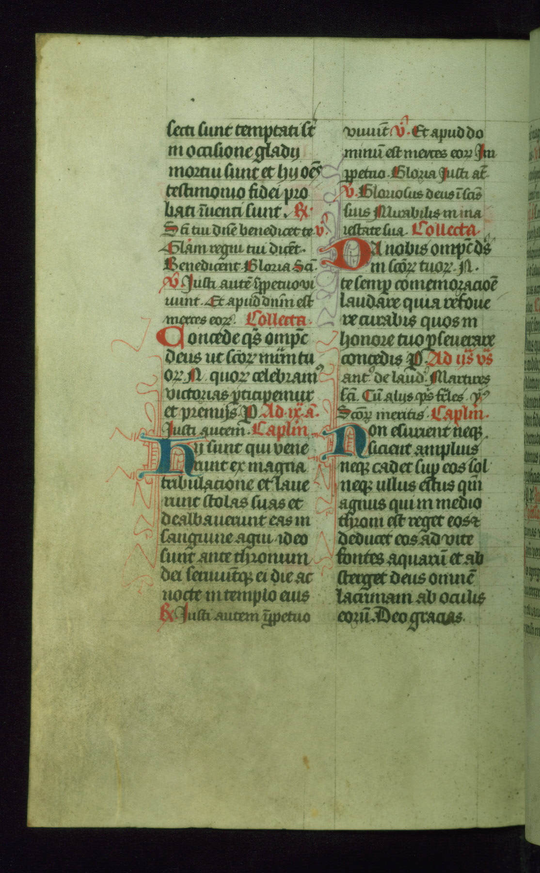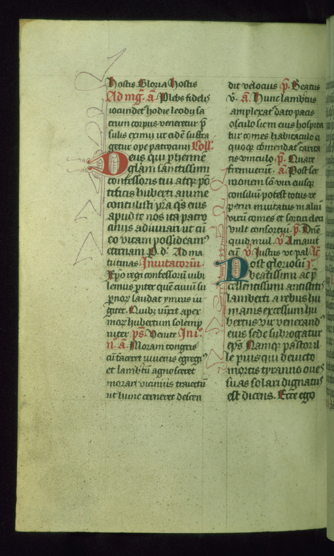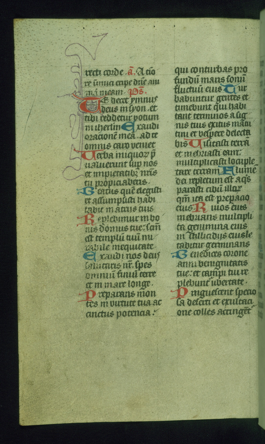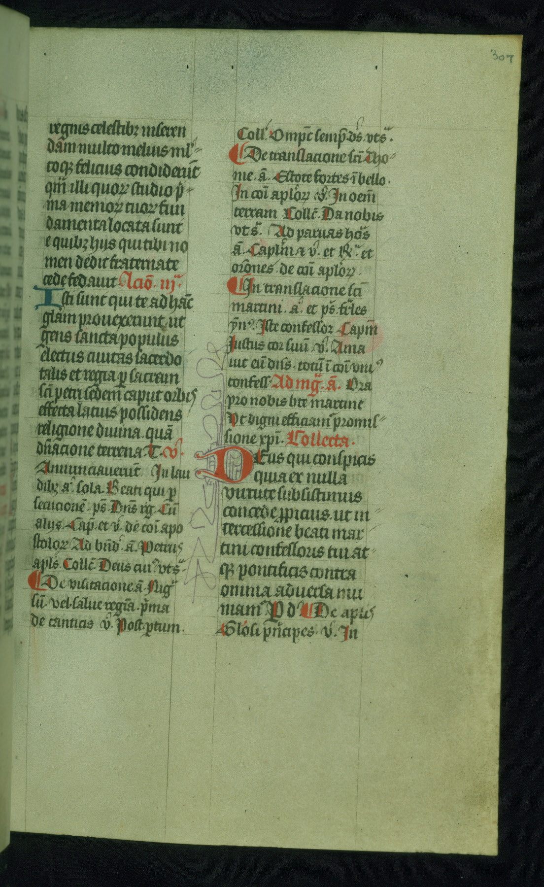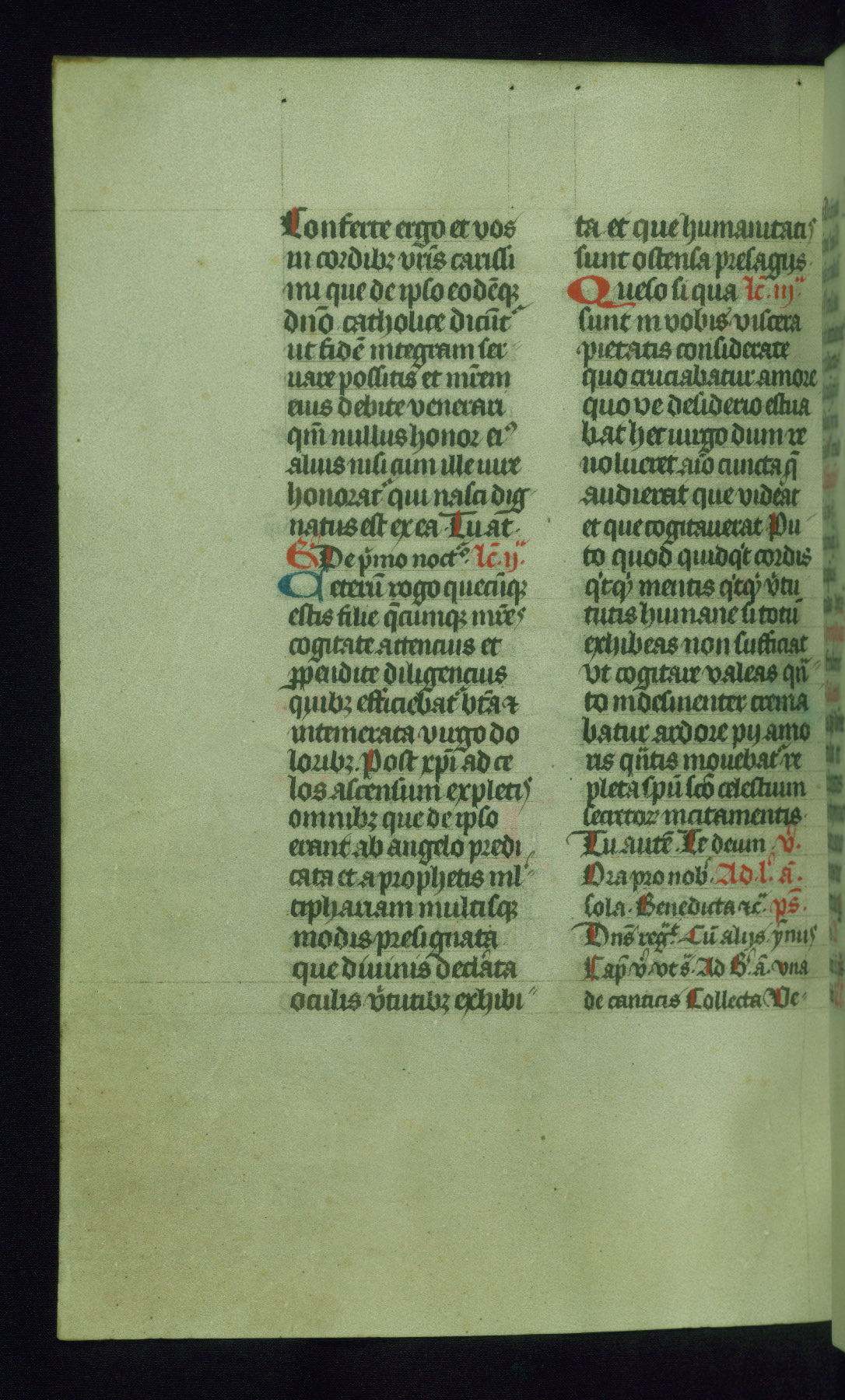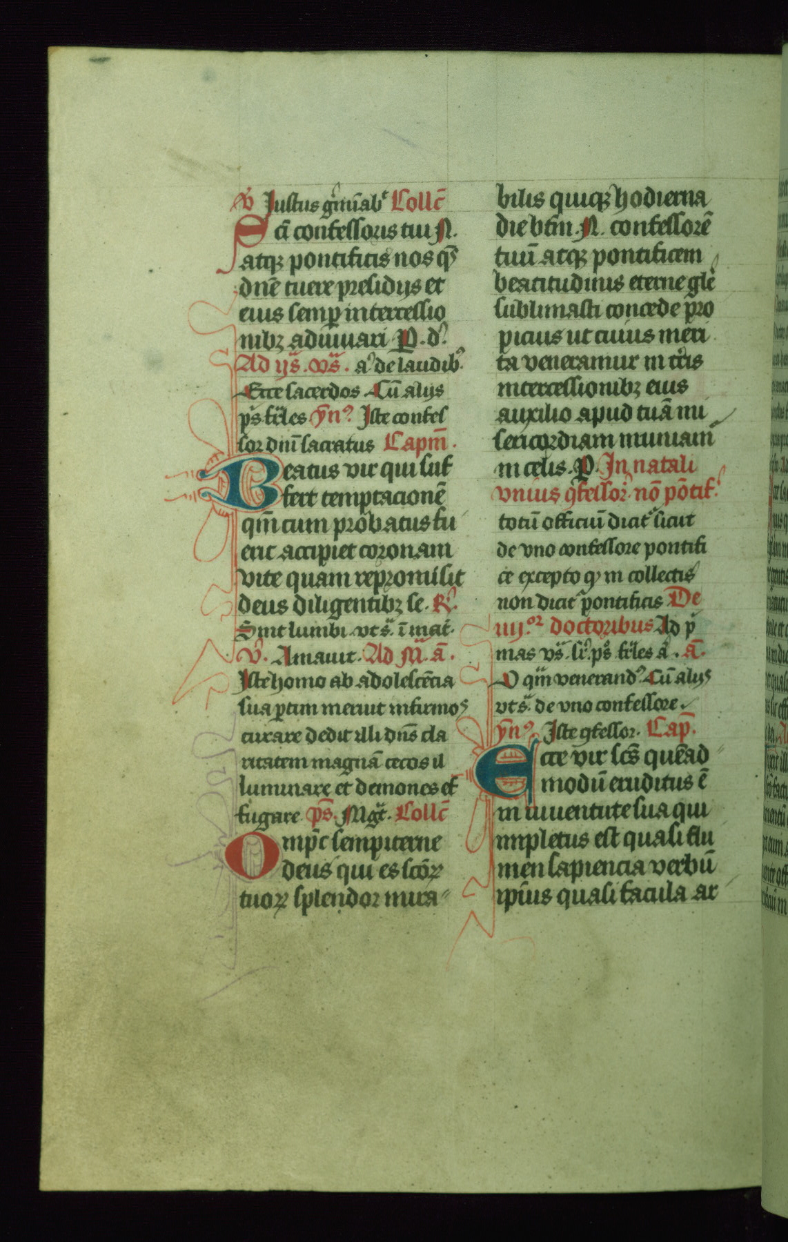 This small breviary, composed of more than 500 folios, is extraordinary for its length, considering it is the summer portion of a two-volume breviary for the use of Liège. The manuscript was completed for ecclesiastical use at the Cathedral of Notre-Dame and St.-Lambert in Liège ca. 1420. This attribution is suggested, for instance, by the petitions to the congregation of this cathedral (fols. 114v-117v), as well as the armorial shield of the family of Surlet de Chokier of Liège represented at the opening of the Psalms. The manuscript has modest, but interesting, decoration with historiated and decorated initials marking the liturgical texts, and occasional angels playing instruments in the margins. The most notable pictorial effect is found in the initials inhabited by transparent figures on rich blue ground. The technique is found, for instance, on fol. 156r with the gold monstrance held by translucent angels for the feast of the Corpus Christi.