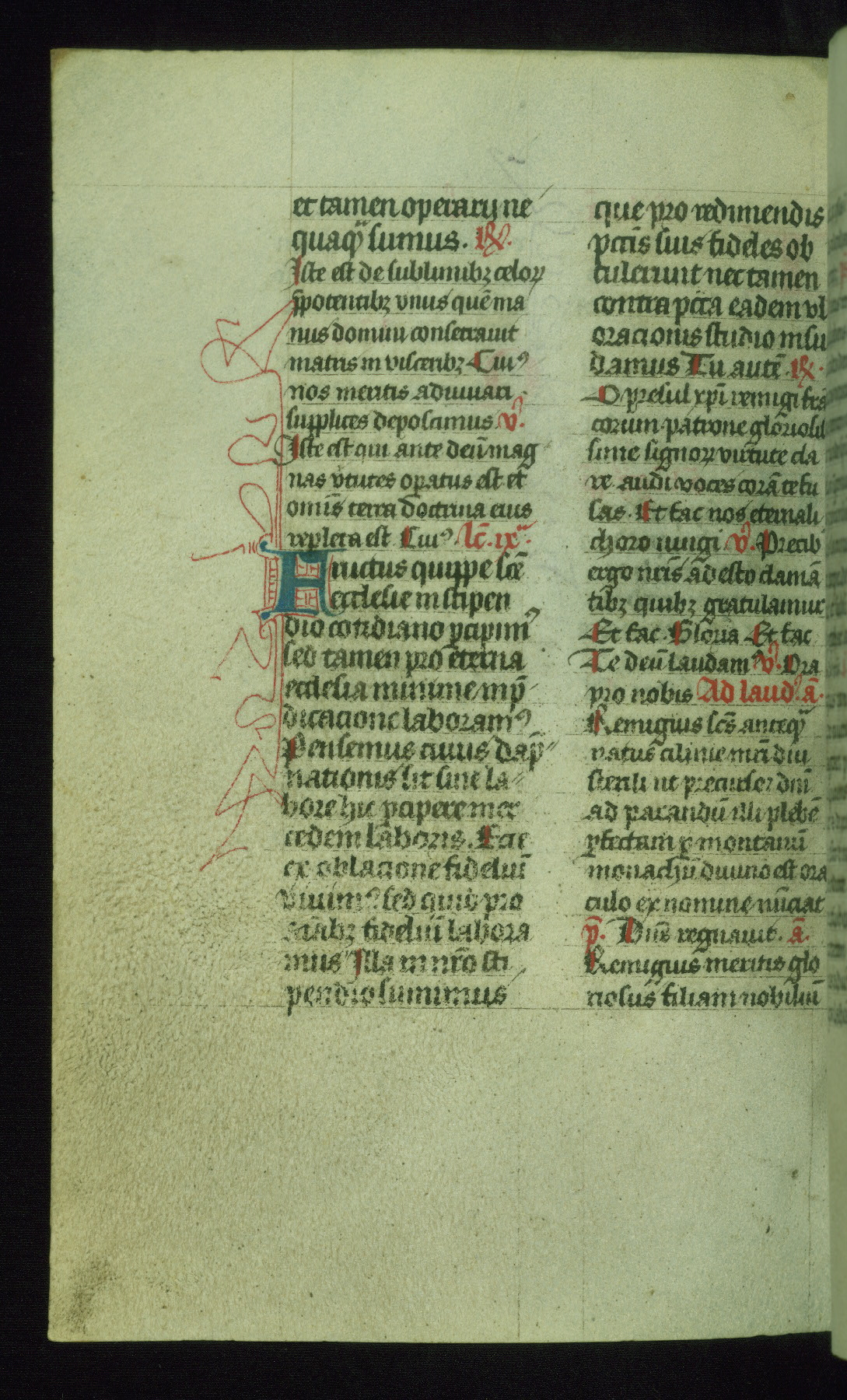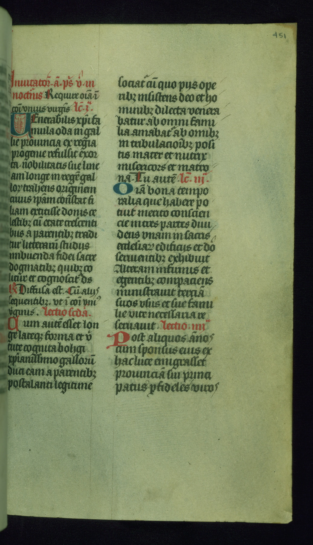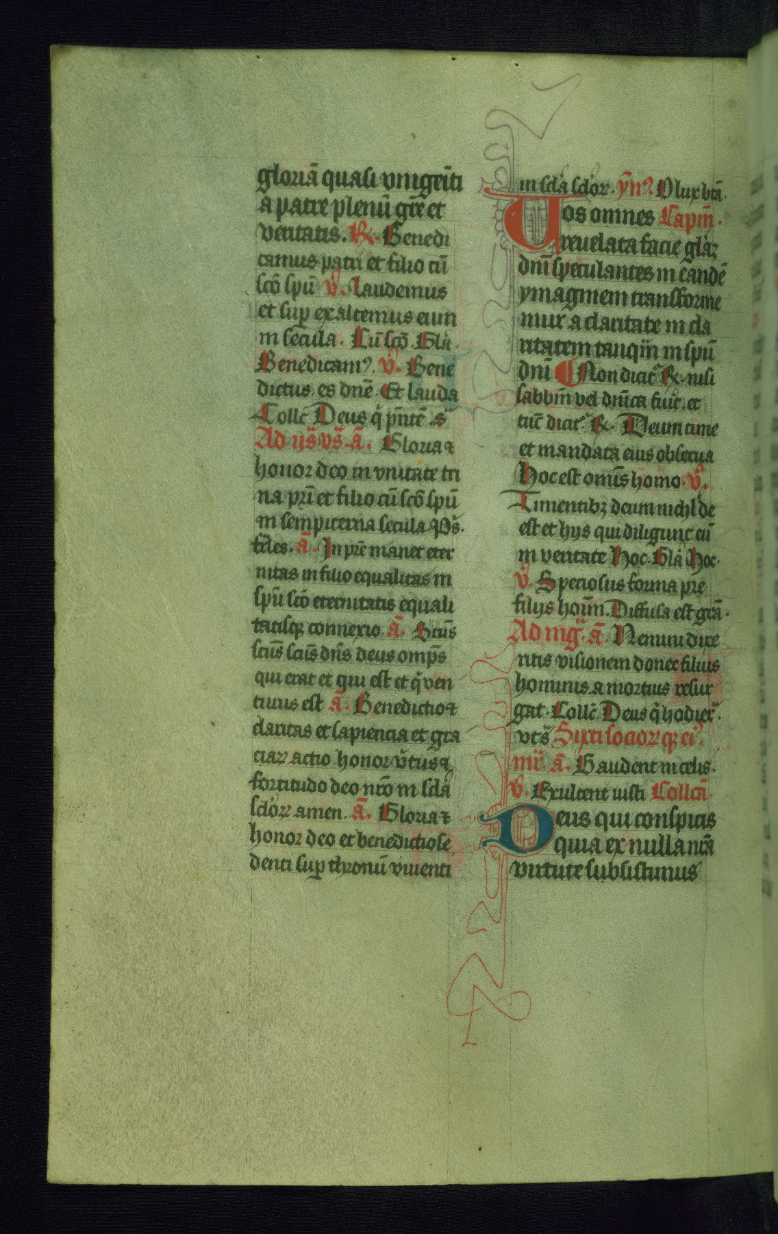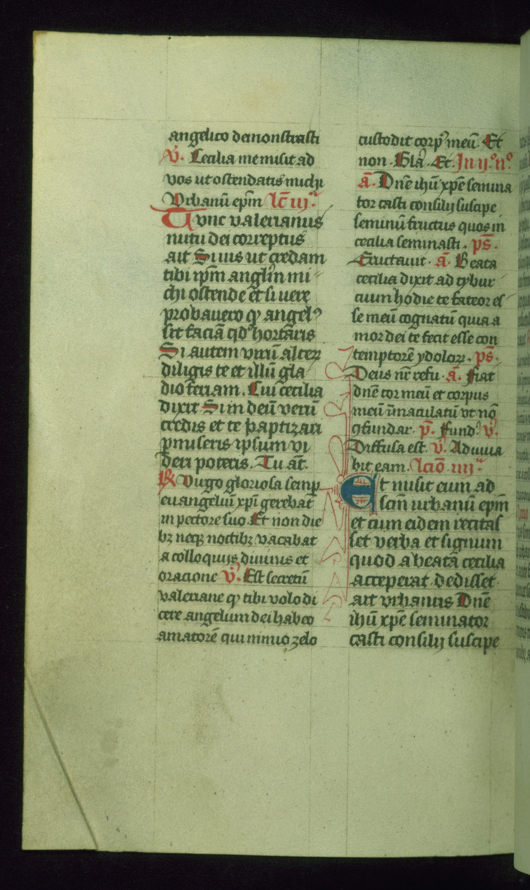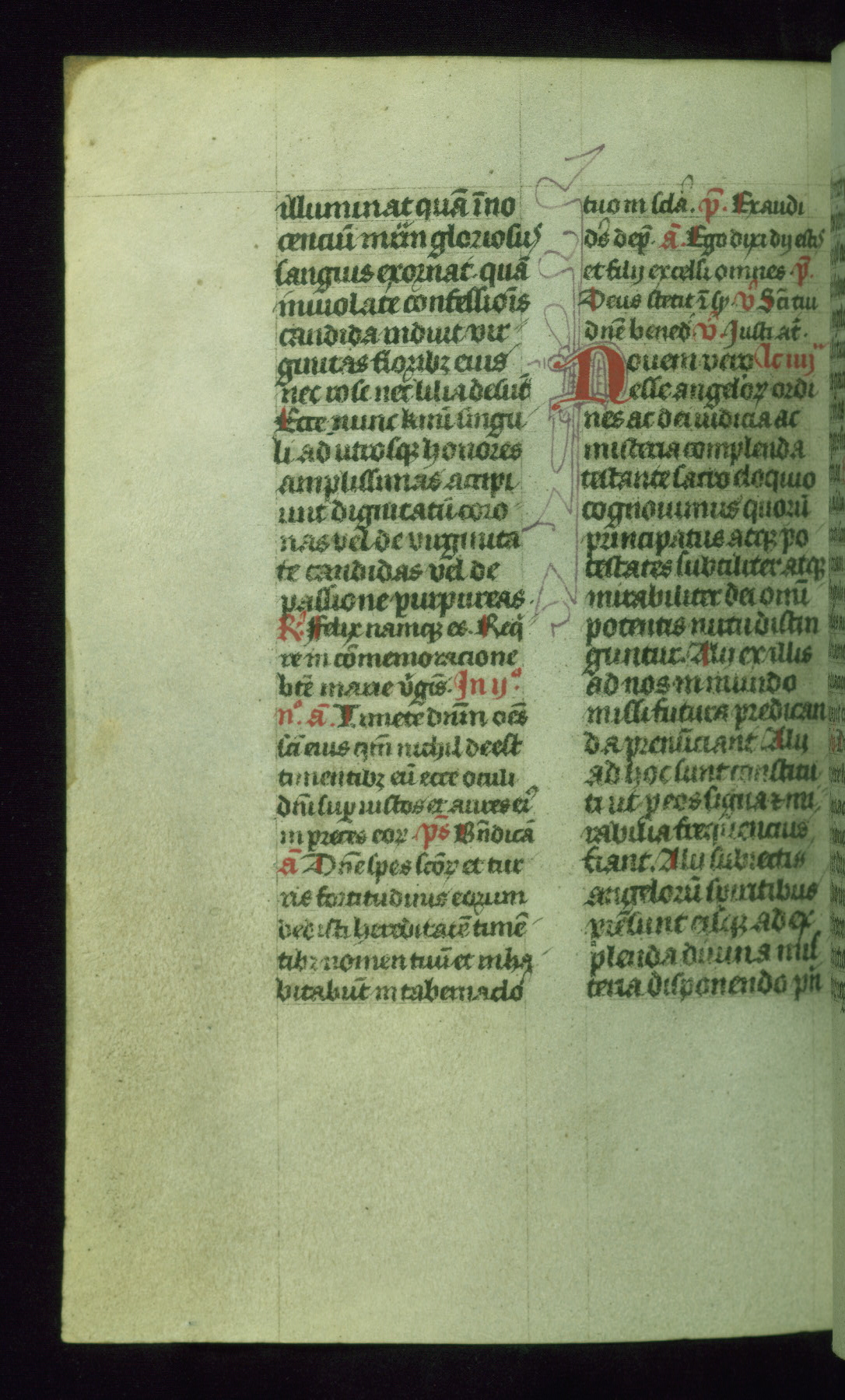 This small breviary, composed of more than 500 folios, is extraordinary for its length, considering it is the summer portion of a two-volume breviary for the use of Liège. The manuscript was completed for ecclesiastical use at the Cathedral of Notre-Dame and St.-Lambert in Liège ca. 1420. This attribution is suggested, for instance, by the petitions to the congregation of this cathedral (fols. 114v-117v), as well as the armorial shield of the family of Surlet de Chokier of Liège represented at the opening of the Psalms. The manuscript has modest, but interesting, decoration with historiated and decorated initials marking the liturgical texts, and occasional angels playing instruments in the margins. The most notable pictorial effect is found in the initials inhabited by transparent figures on rich blue ground. The technique is found, for instance, on fol. 156r with the gold monstrance held by translucent angels for the feast of the Corpus Christi.