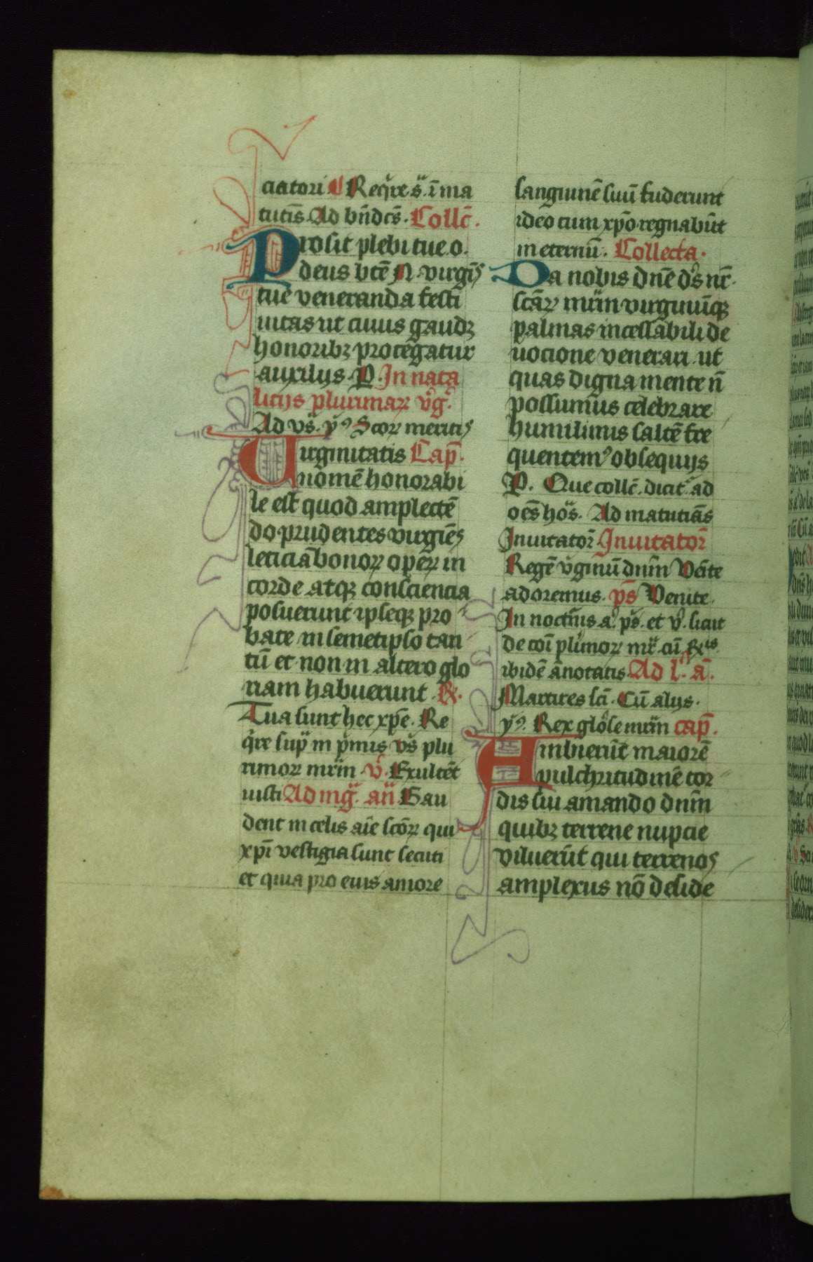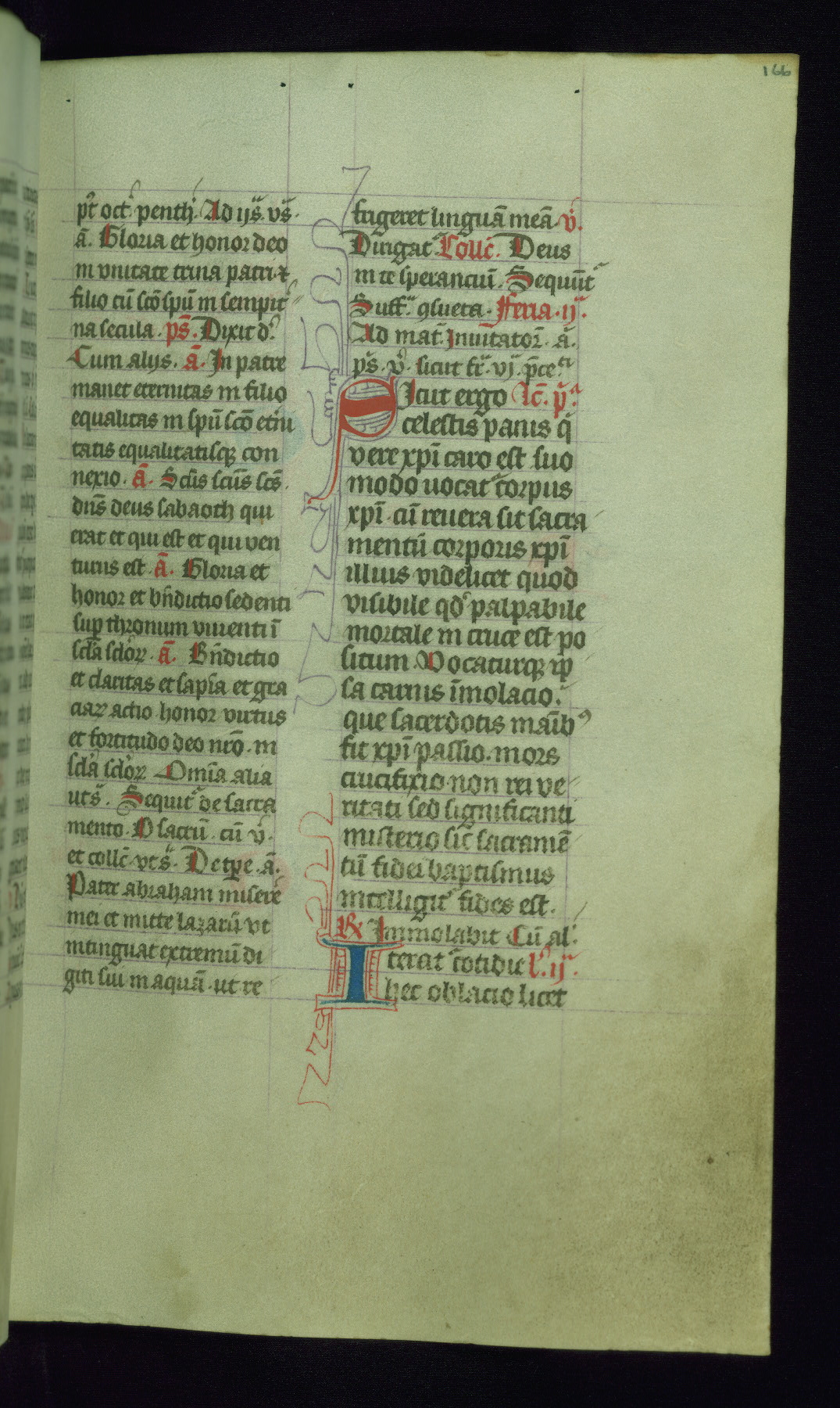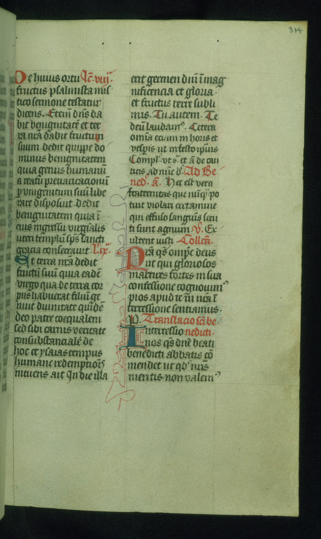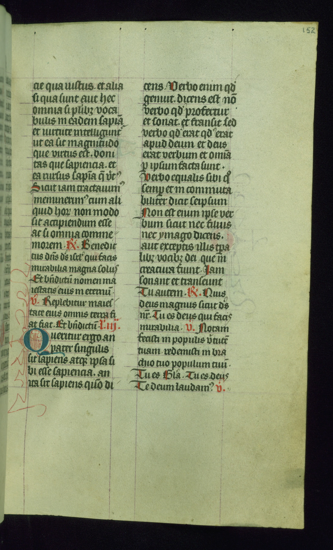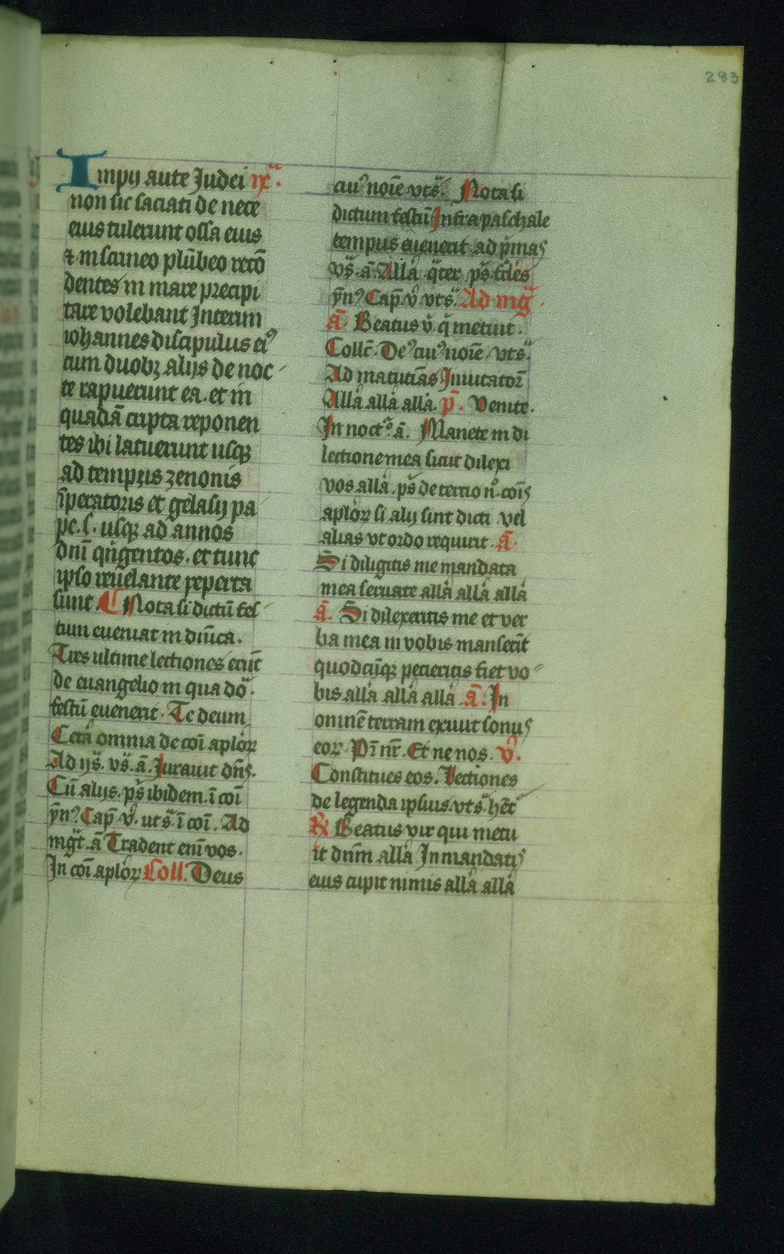 This small breviary, composed of more than 500 folios, is extraordinary for its length, considering it is the summer portion of a two-volume breviary for the use of Liège. The manuscript was completed for ecclesiastical use at the Cathedral of Notre-Dame and St.-Lambert in Liège ca. 1420. This attribution is suggested, for instance, by the petitions to the congregation of this cathedral (fols. 114v-117v), as well as the armorial shield of the family of Surlet de Chokier of Liège represented at the opening of the Psalms. The manuscript has modest, but interesting, decoration with historiated and decorated initials marking the liturgical texts, and occasional angels playing instruments in the margins. The most notable pictorial effect is found in the initials inhabited by transparent figures on rich blue ground. The technique is found, for instance, on fol. 156r with the gold monstrance held by translucent angels for the feast of the Corpus Christi.