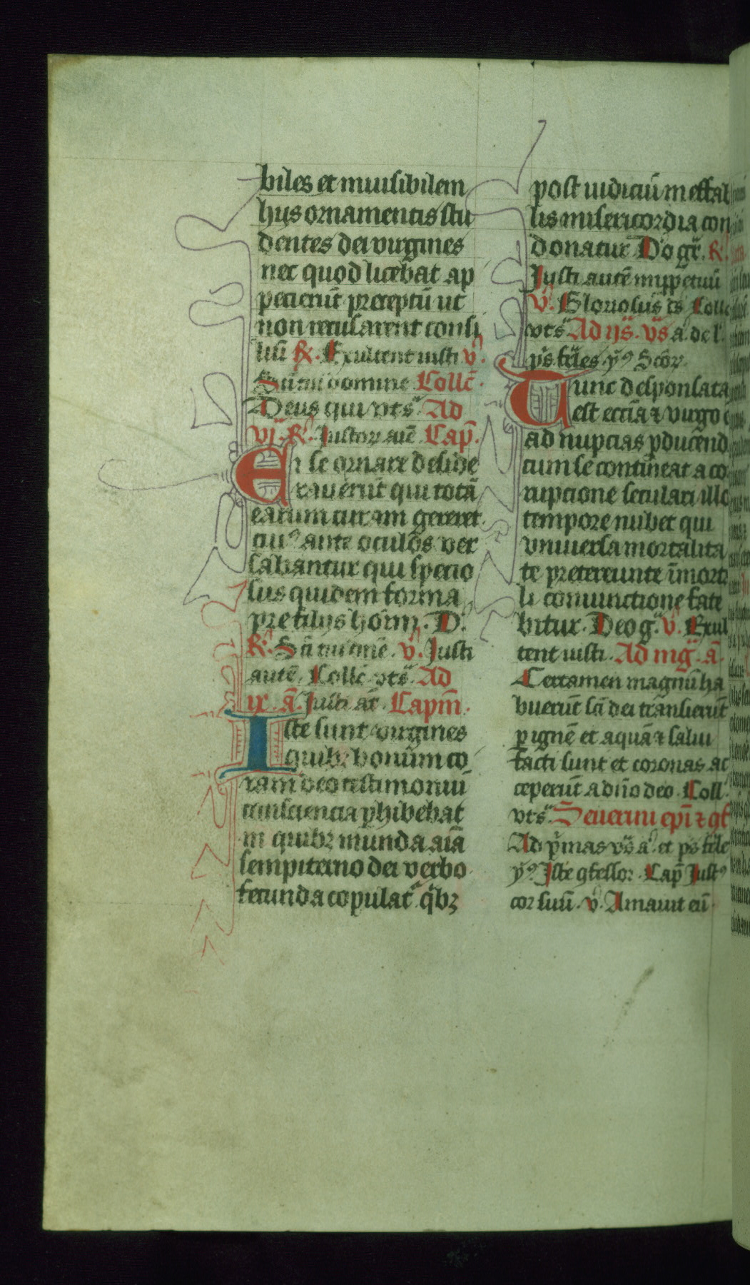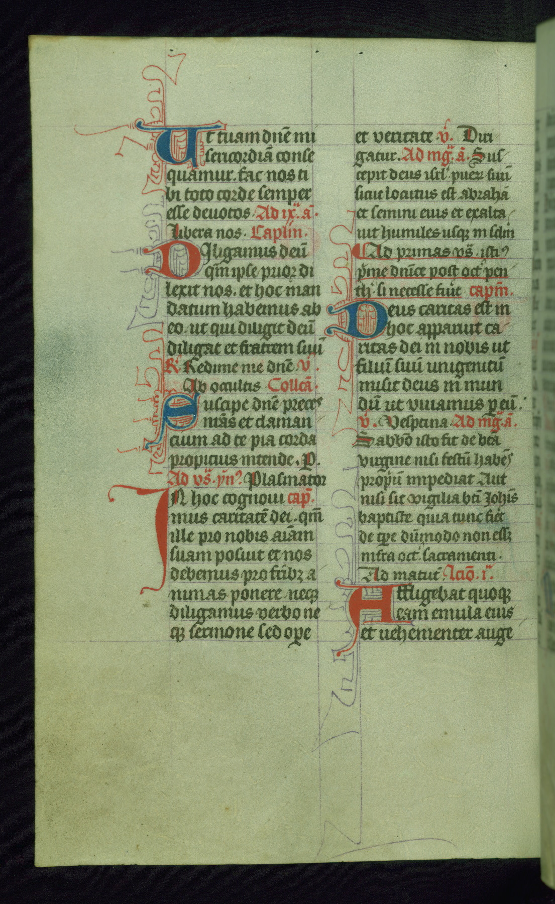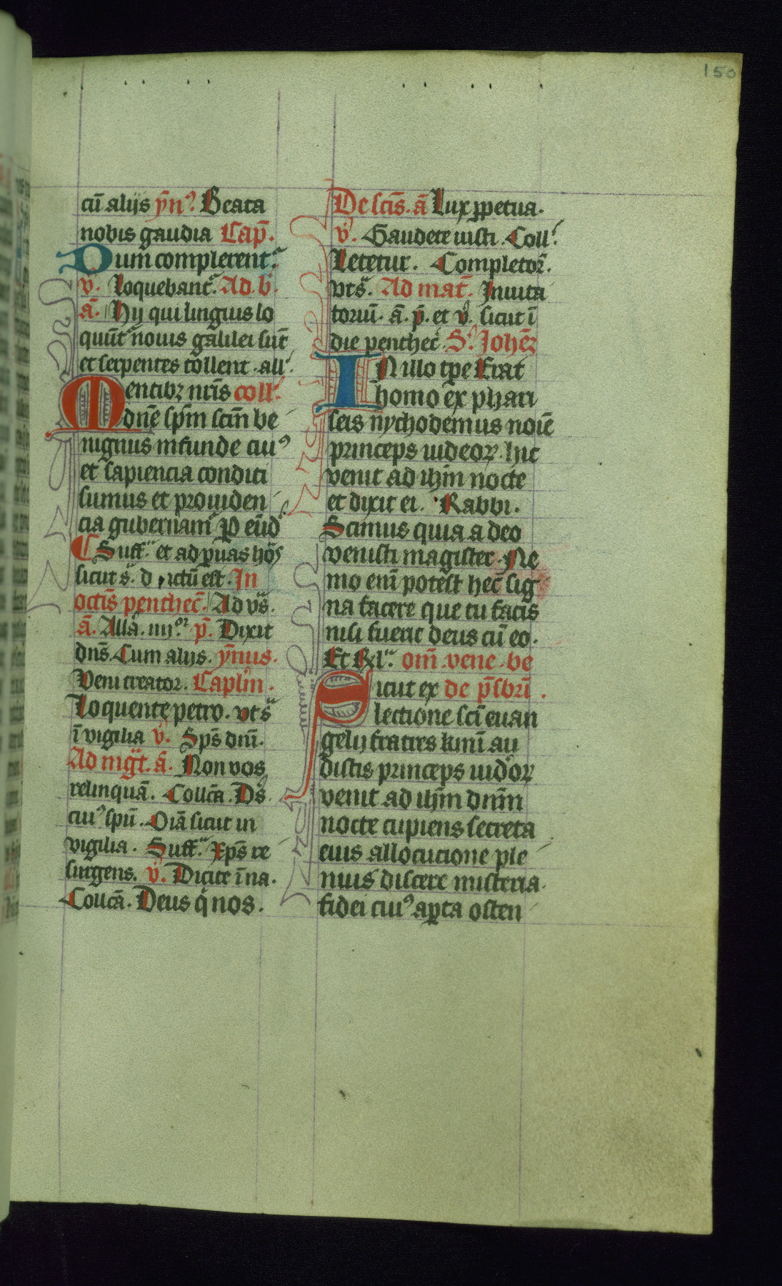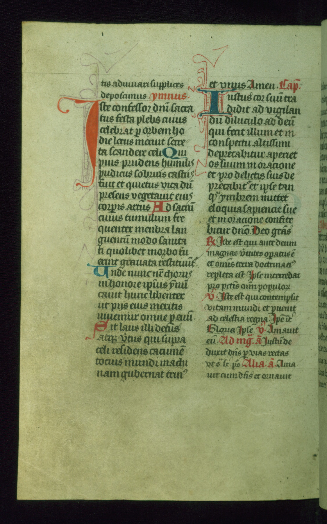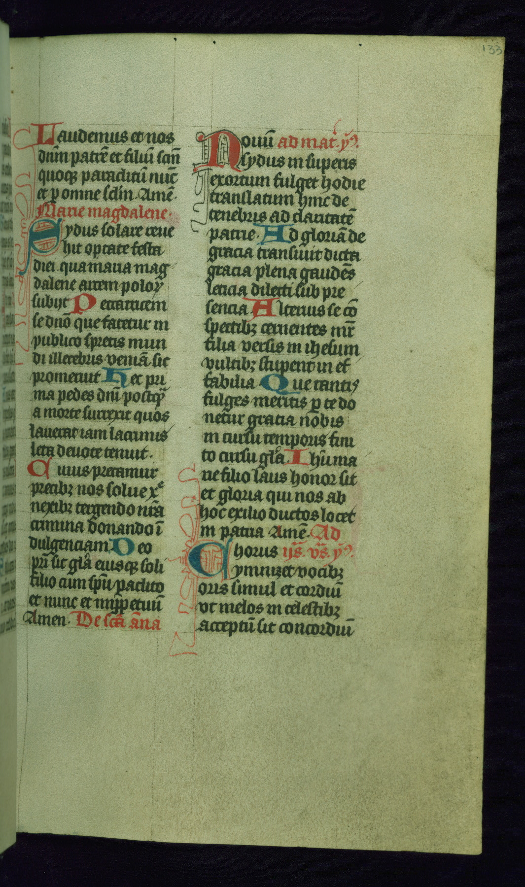 This small breviary, composed of more than 500 folios, is extraordinary for its length, considering it is the summer portion of a two-volume breviary for the use of Liège. The manuscript was completed for ecclesiastical use at the Cathedral of Notre-Dame and St.-Lambert in Liège ca. 1420. This attribution is suggested, for instance, by the petitions to the congregation of this cathedral (fols. 114v-117v), as well as the armorial shield of the family of Surlet de Chokier of Liège represented at the opening of the Psalms. The manuscript has modest, but interesting, decoration with historiated and decorated initials marking the liturgical texts, and occasional angels playing instruments in the margins. The most notable pictorial effect is found in the initials inhabited by transparent figures on rich blue ground. The technique is found, for instance, on fol. 156r with the gold monstrance held by translucent angels for the feast of the Corpus Christi.