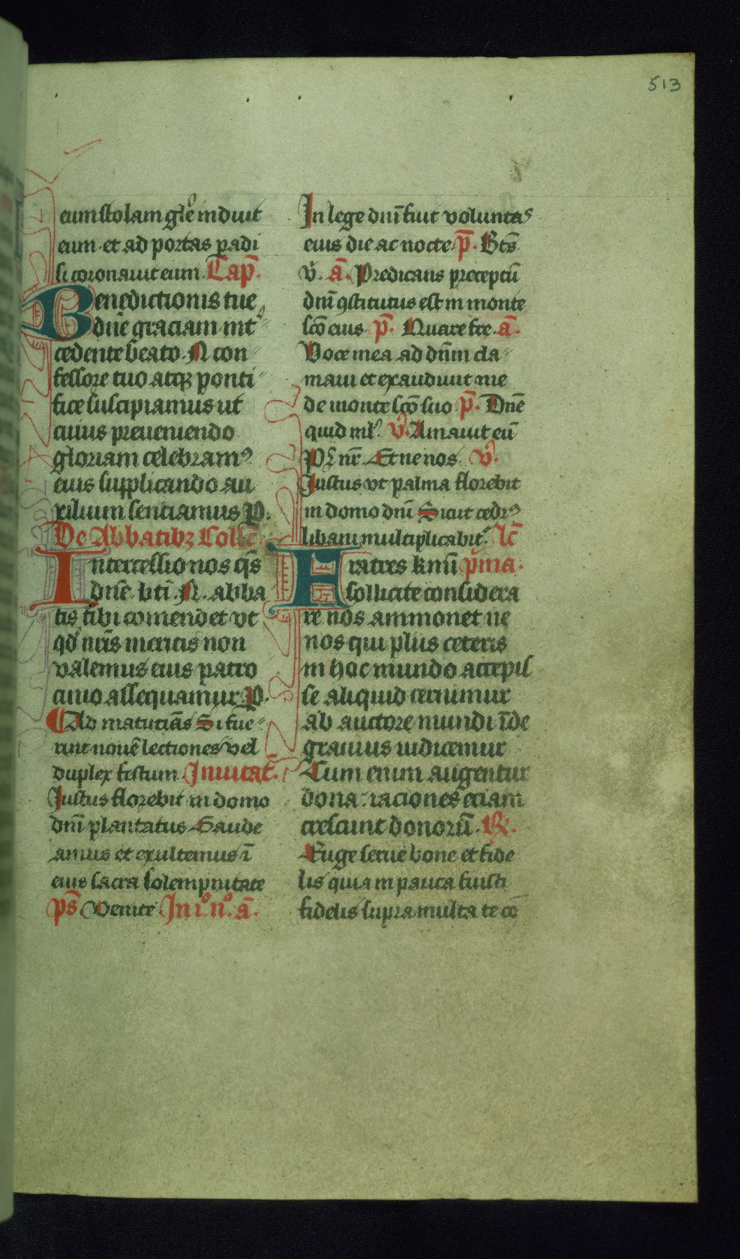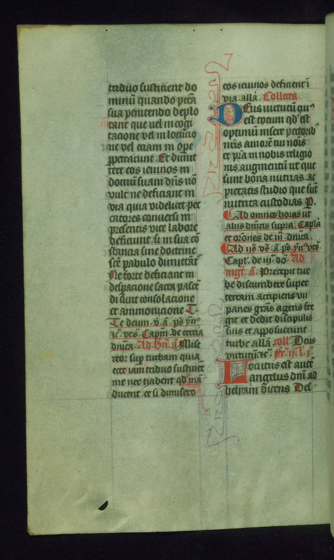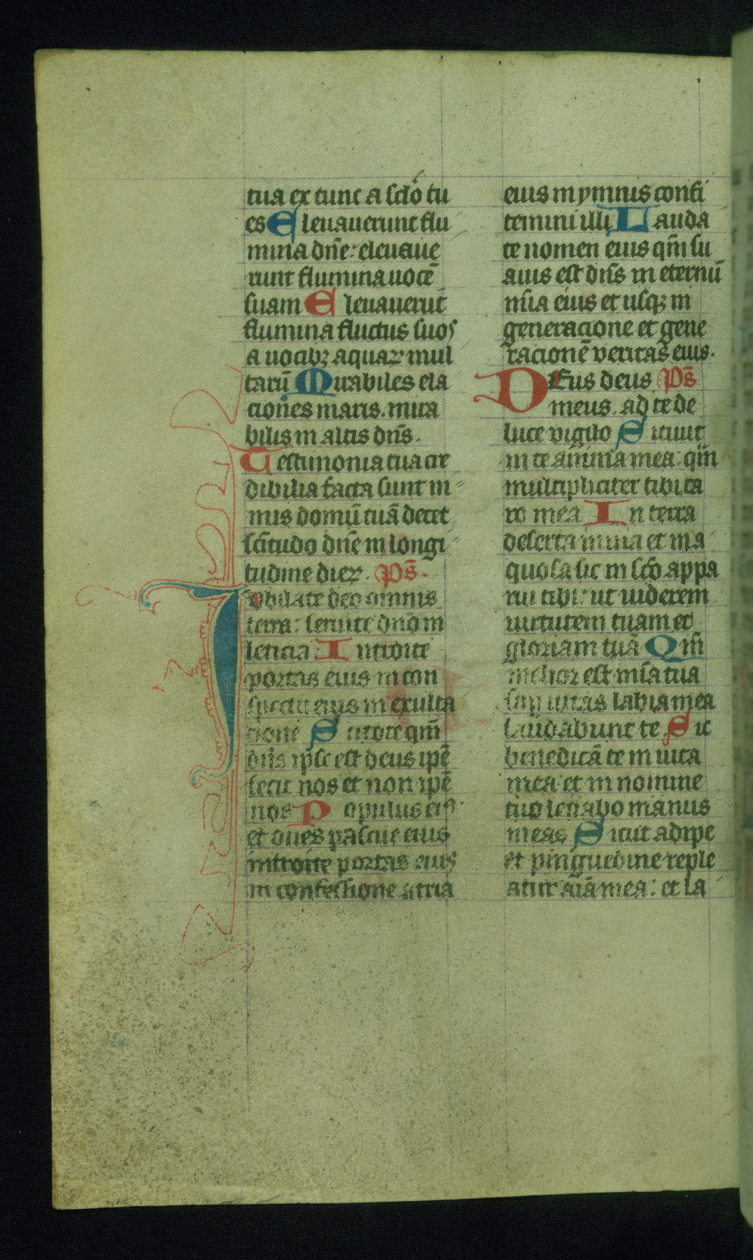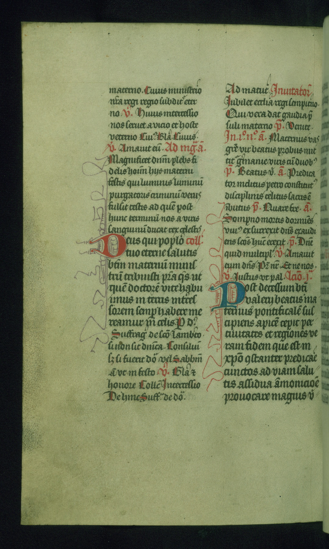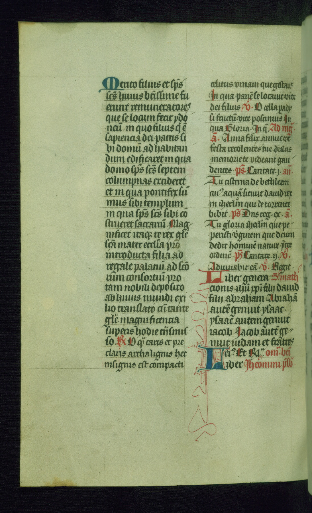 This small breviary, composed of more than 500 folios, is extraordinary for its length, considering it is the summer portion of a two-volume breviary for the use of Liège. The manuscript was completed for ecclesiastical use at the Cathedral of Notre-Dame and St.-Lambert in Liège ca. 1420. This attribution is suggested, for instance, by the petitions to the congregation of this cathedral (fols. 114v-117v), as well as the armorial shield of the family of Surlet de Chokier of Liège represented at the opening of the Psalms. The manuscript has modest, but interesting, decoration with historiated and decorated initials marking the liturgical texts, and occasional angels playing instruments in the margins. The most notable pictorial effect is found in the initials inhabited by transparent figures on rich blue ground. The technique is found, for instance, on fol. 156r with the gold monstrance held by translucent angels for the feast of the Corpus Christi.