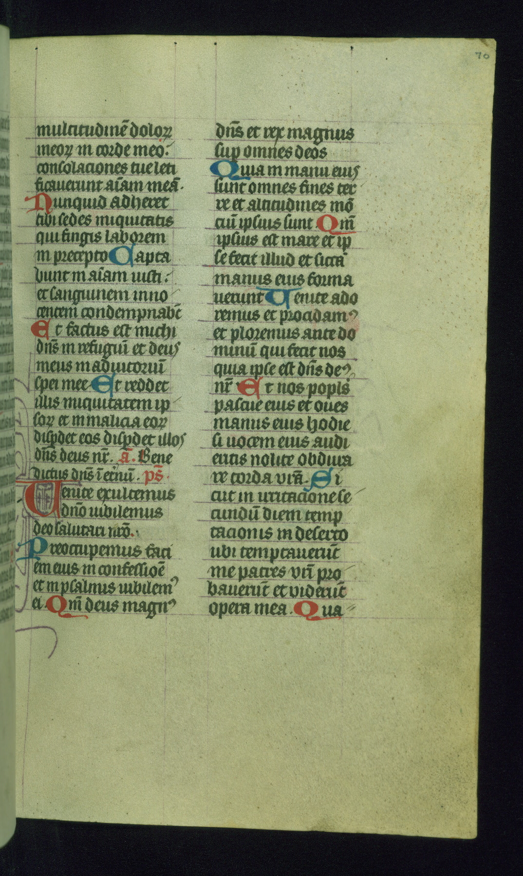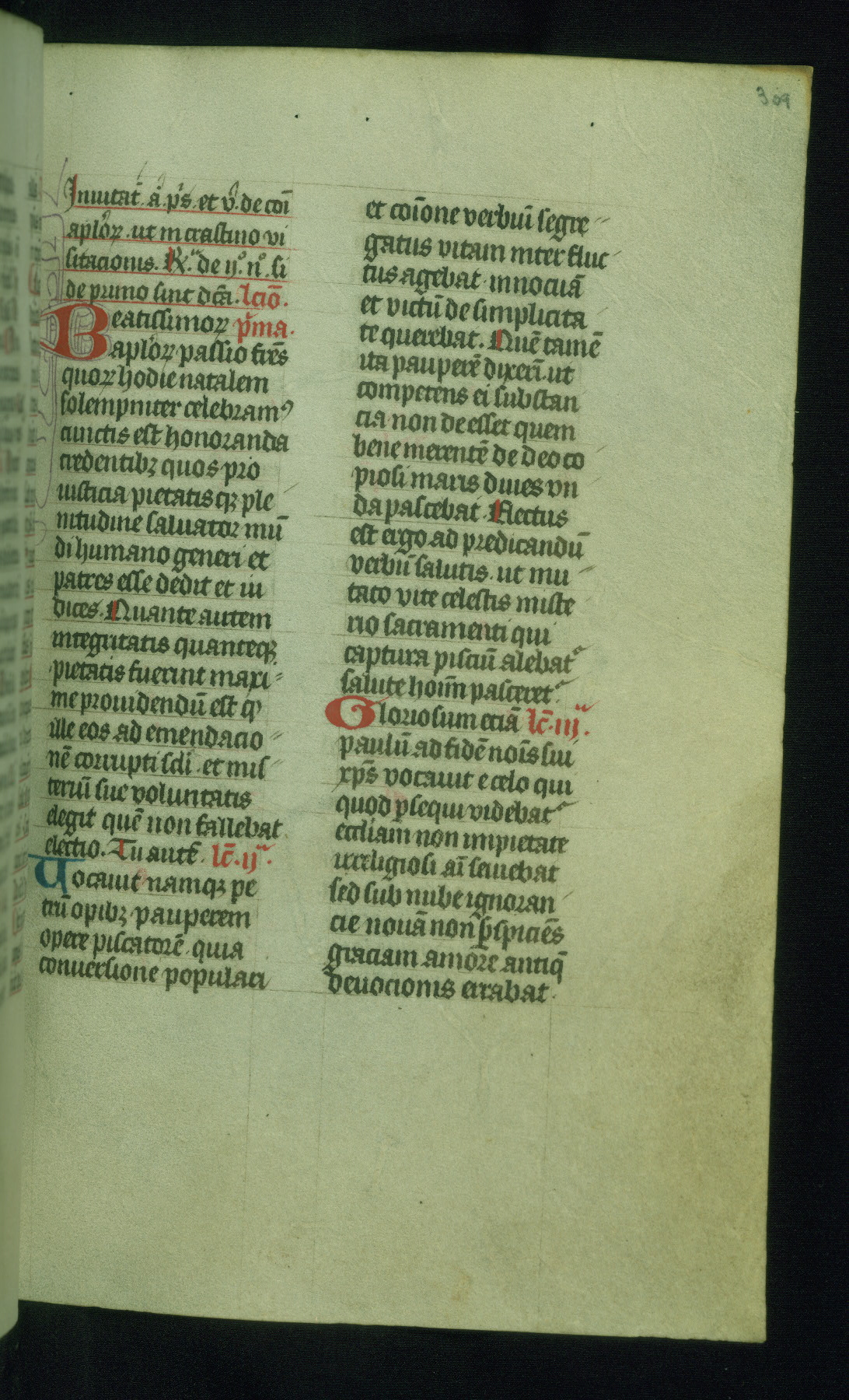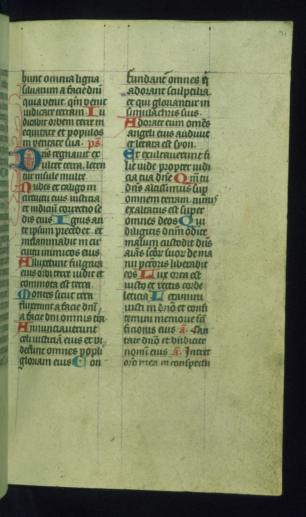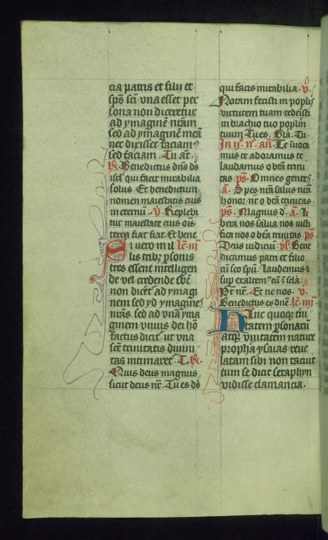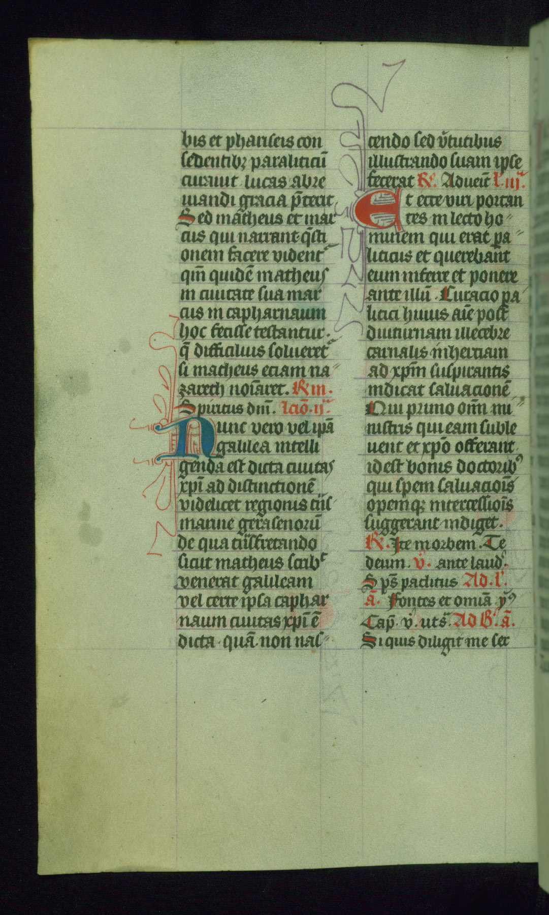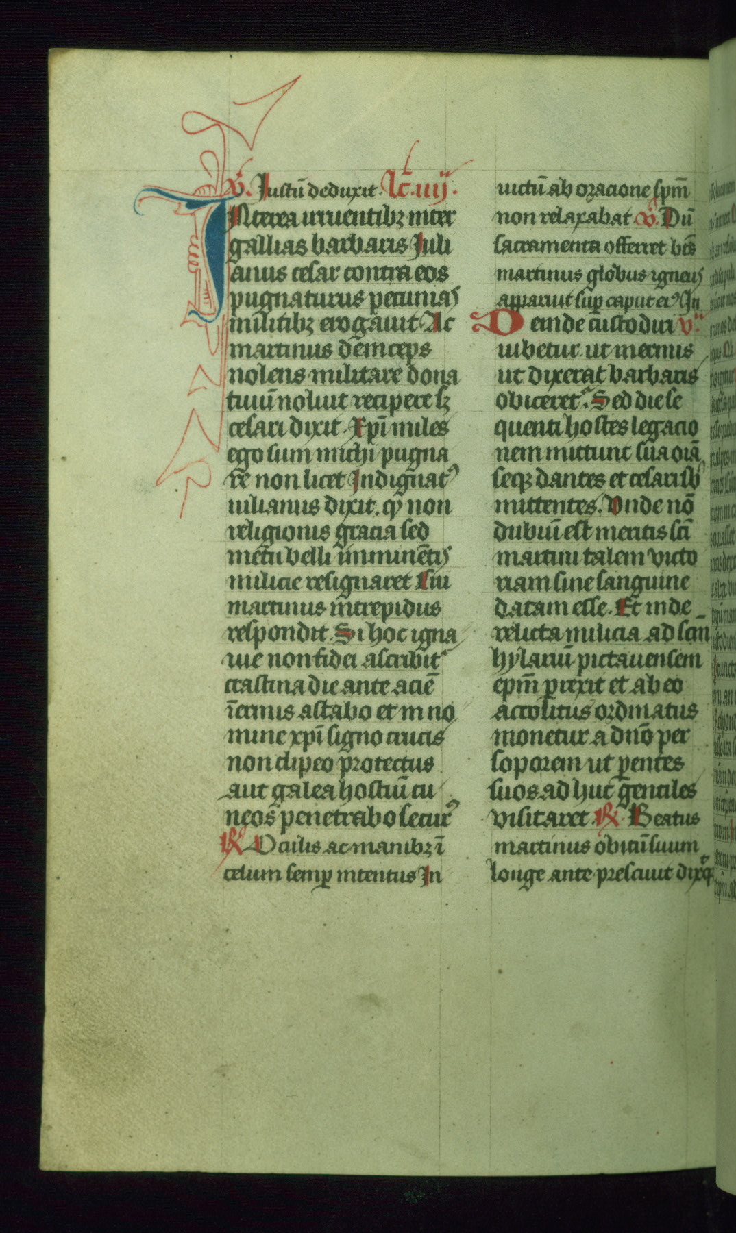 This small breviary, composed of more than 500 folios, is extraordinary for its length, considering it is the summer portion of a two-volume breviary for the use of Liège. The manuscript was completed for ecclesiastical use at the Cathedral of Notre-Dame and St.-Lambert in Liège ca. 1420. This attribution is suggested, for instance, by the petitions to the congregation of this cathedral (fols. 114v-117v), as well as the armorial shield of the family of Surlet de Chokier of Liège represented at the opening of the Psalms. The manuscript has modest, but interesting, decoration with historiated and decorated initials marking the liturgical texts, and occasional angels playing instruments in the margins. The most notable pictorial effect is found in the initials inhabited by transparent figures on rich blue ground. The technique is found, for instance, on fol. 156r with the gold monstrance held by translucent angels for the feast of the Corpus Christi.